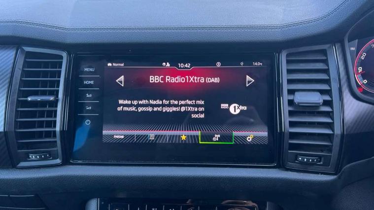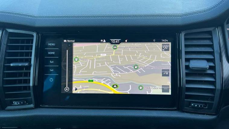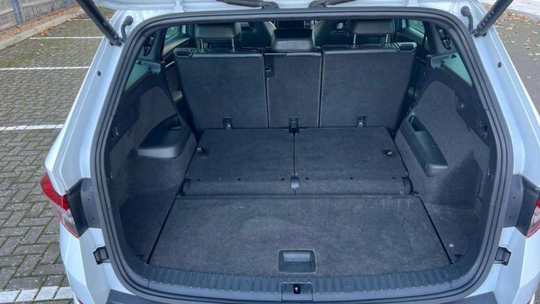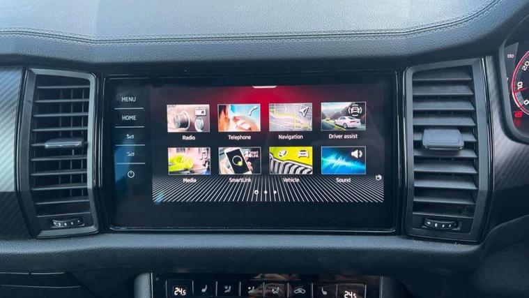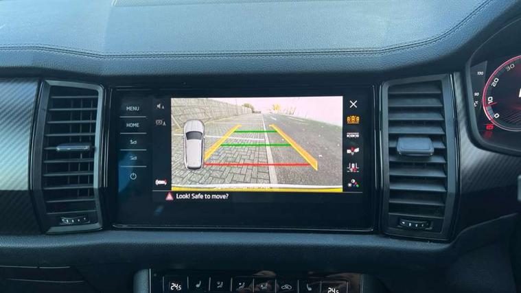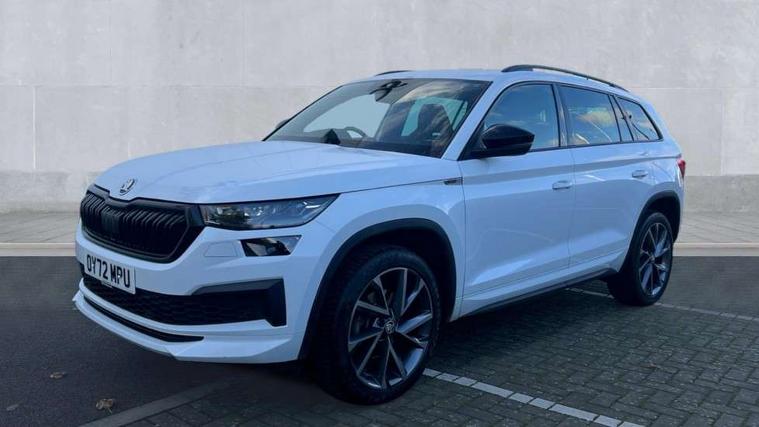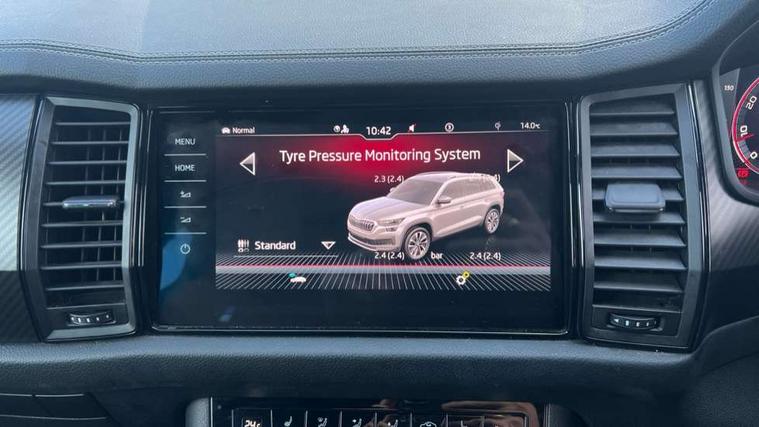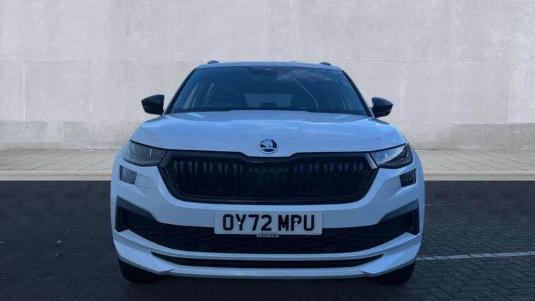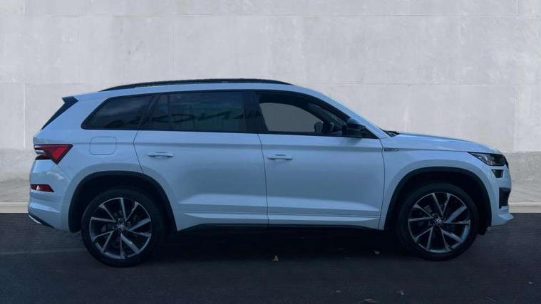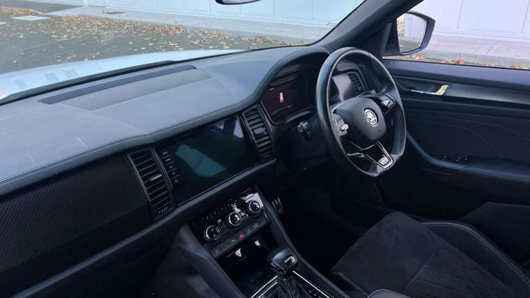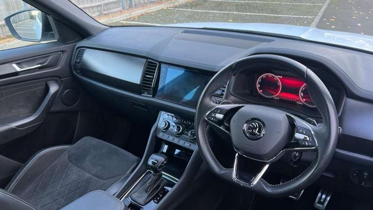 Bluetooth system, Columbus satellite navigation with 9.2" touchscreen, integrated Wi-Fi, web radio, Digital voice enhancement, e call+, ECO Stop/start function, Exterior temperature indicator, Progressive steering, Rear view camera, Smartlink wireless for apple carplay and wired for android auto, Speed limiter, Tailgate unlocking from outside, USB C Port x 2 in front centre console, Wireless charging, 8 Speakers, DAB Digital radio, Aero front windscreen wipers with intermittent function, Aero rear window wiper, Auto dimming rear view mirror, Black roof rails, Black sports styling including front grille and window surrounds, Black wheel arch surrounds, Body colour bumpers, Body colour door handles, Electric adjustable/heated/folding door mirrors, driver side auto dimming with boarding sports and memory function, Electric front and rear windows, Extended rear spoiler with finlets in gloss black, Front fog lights, Full LED matrix headlights with AFS (adaptive front light system), cornering function and AWL (all weather lighting system), Gloss black door mirrors, Headlight washers, Heated rear window, Invisible tailpipe, LED daytime running lights, LED rear fog light, LED third brake light in rear spoiler, Light assistant (coming/leaving home/tunnel light), Off-road style lower front bumper element, Privacy glass, Rain and light sensors, Rear diffuser, Rear LED lights (high functionality) with welcome effect and dynamic indicators, Rear side wing doors, Safety reflectors on front and rear doors, Sportline badge on front fender, Sports front and rear bumpers including lower rear chrome strip, Tailgate lettering in Black, Window control switches with black trim, 12V socket in boot, 2 rails with 2 hooks, 2 seat bench in 3rd row, 3 seat bench in 2nd row, 4 foldable roof handles with rear coat hooks, 60:40 foldable rear seat with sliding adjustment and backrest angle adjustment, Aluminium pedals, Black roof headlining, Bottle holders in door panel in the 1.5 litre front and 1 litre rear, Cargo storage compartments, Chrome headlight control button, Chrome interior door handles, Coat hooks on B pillar, Covered storage compartment on driver side, Decorative door sill covers, Front centre armrest with storage compartment, cup holder and 12V socket, Front courtesy lights, Gear shift lever with chrome frame and black gloss insert, Grey stitching in front and rear armrests and door armrests + door inserts, Height adjustable front headrests, Illuminated and cooled glovebox, Illuminated luggage compartment, Isofix child seat fittings in outer rear seats with top tether, Manually adjustable steering column, Microsuede door panels, Net programme in boot (1x horizontal Net, 2x vertical Nets), Overhead glasses storage compartment, Pollen filter, Rear centre armrest with cupholders, Single front passenger seat, Sliding trunk cover, Small Bags on the inner sides of the front backrests, Sports seats, Sunvisors with illuminated vanity mirrors, Three rear height adjustable headrests, Ticket holder on A Pillar, Umbrella in door panel, Variable boot floor, LED Interior light pack - Kodiaq, Auto door release and activation of warning lights in the event of an accident, Child locks on rear doors, Driver and front passenger airbag with knee airbag and front passenger airbag deactivation, Electronic parking brake with hill start assist, Emergency rear braking signal, ESC (incl. ABS+MSR+ASR+EDS+HBA+DSR+RBS+MKB), Front assist with autonomous emergency braking, Front side airbags with curtain airbags, Fuel cut off safety device, Height adjustable front 3 point seatbelts + pretensioners, Hill hold control, Rear disc brakes, Safety vest holder in door, Seat belt reminder for all seats, Three point rear seat belts, Two tone horn, Tyre pressure monitor, Alarm with interior monitoring and tilt sensor with safe function, Anti-theft wheel bolts, Immobiliser, Keyless entry and start system (KESSY), Remote central locking with 2 keys, Black air vent surround, Carbon finish dashboard and door inserts, Grey stitching in dashboard, 20" Vega Anthracite alloy wheels, Temporary spare wheel (space saver),