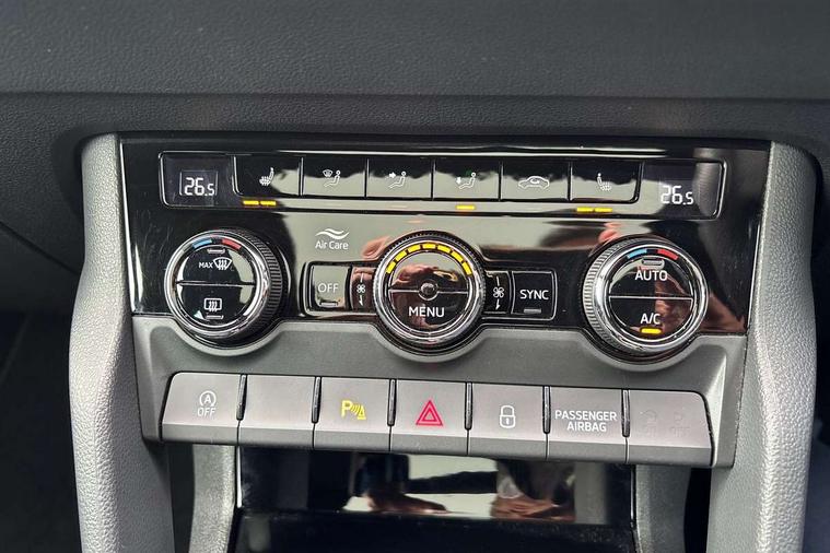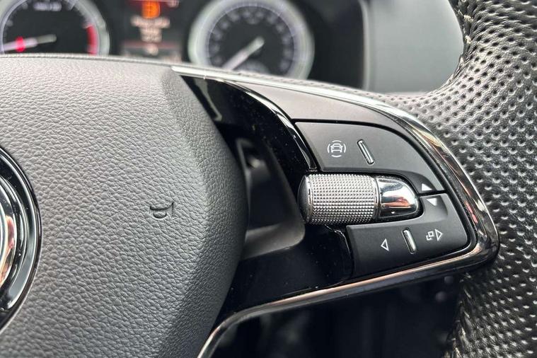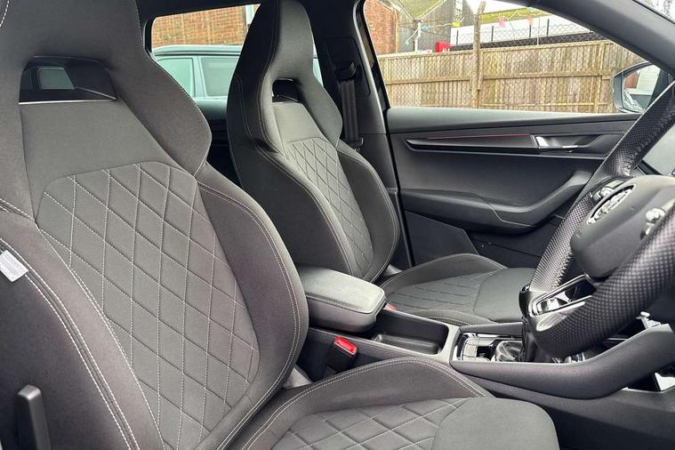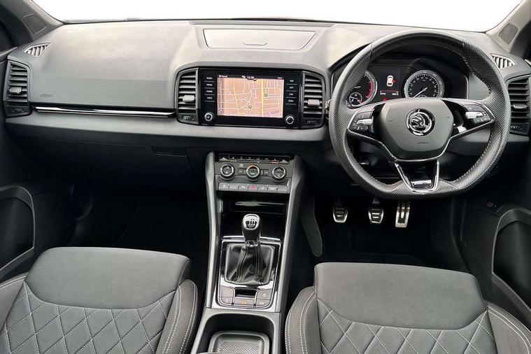Care connect, Drive mode selector, Driver fatigue sensor, Multifunction colour trip computer, Outside temperature gauge, Service interval indicator, SmartLink wireless for Apple and wired for Android, Start/stop system with regenerative braking, USB C Port x 2 in front centre console, DAB radio with Bluetooth, USB connection, Wireless charging without wireless aerial connection, Acoustic glass, Aero front windscreen wipers with intermittent function, Automatic headlight control system, Black door mirrors, Black electric window control buttons, Black radiator grille, Black roof rails, Body colour door handles, Body coloured bumpers, Electric front and rear windows with child proof lock, Front door steps with SportLine logo, Full LED headlights + adaptive front light system + LED daytime running lights and front cornering fog lights, Headlight washers, Heated rear windscreen, LED rear lights with high functionality, Light assistant (coming/leaving home/tunnel light), Panoramic sliding sunroof, Privacy glass, Protective door side sills in body colour, Rear diffuser, Safety reflectors on front doors, Skoda lettering on tailgate in black, Sportline badge on front fender, Sportline decorative inserts with badging, Sports front and rear bumpers, Third brake light, 1.5 litre bottle holders in driver and front passenger door panels, 12V socket in boot, 12v socket in front centre armrest with storage compartment and rear air vents, 2 Folding hooks and nets in boot, 2 Front readings lights for driver and passenger, 3 rear height adjustable headrests, 4 foldable roof handles with rear coat hooks, Aluminium pedals, Black roof headlining, Cargo elements in boot, Chrome inner door handles, Door sill scuff plates, Driver and passenger seats height adjust, Front head restraints, Height adjustable front three point seats belts with tensioners, Height/reach adjust steering wheel, Ice scraper, Illuminated and cooled glovebox, Illuminated luggage compartment, Isofix child seat preparation outer rear, Manual lumbar support for front seats, Net programme in boot, Pen holder, Pollen filter, Rear reading lights, Rear seats fixed folding and divided 60:40, Retractable parcel shelf attachable to tailgate, Safety vest holder, Solid rear boot cover, Storage box in upper central dashboard closed, Storage compartment below the passenger seat, Sunvisors with illuminated vanity mirrors, Textile floor mats, Umbrella under passenger seat, Welcome animation with sportline logo, LED Interior lighting pack with Skoda welcome logo - Karoq, Airbags - Front side, head, knee and curtain, Automatic door unlocking in case of crash, Automatic fuel cut off in case of crash, Driver airbag, Electronic parking brake with auto hold function, Emergency rear braking signal, ESC including ABS, MSR, ASR, EDS, HBA, DSR, RBS, MKB and traction control, Front assist radar scanning of the space in front of the car with automatic braking, Hill hold control, Passenger airbag with switch-off function, Pedestrian monitor, Seatbelt reminder signalisation and pretensioner for all seats, Three point seatbelts rear, Two tone horn, Tyre pressure display, Tyre pressure monitor, Alarm with interior monitoring, back up horn and tilt sensor with safe function, Electronic engine immobiliser, Keyless entry and keyless start with safe system, Remote central locking with 2 remote folding keys, Black air vent surround, 19" Vega anthracite alloy wheels, Anti-theft wheel bolts protection, Storage on wheel cover,