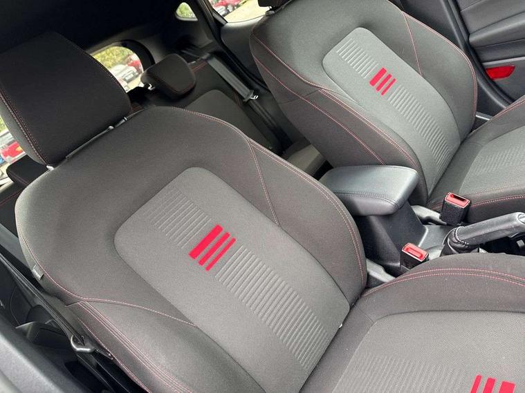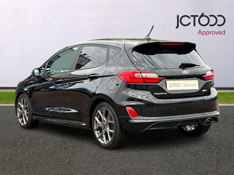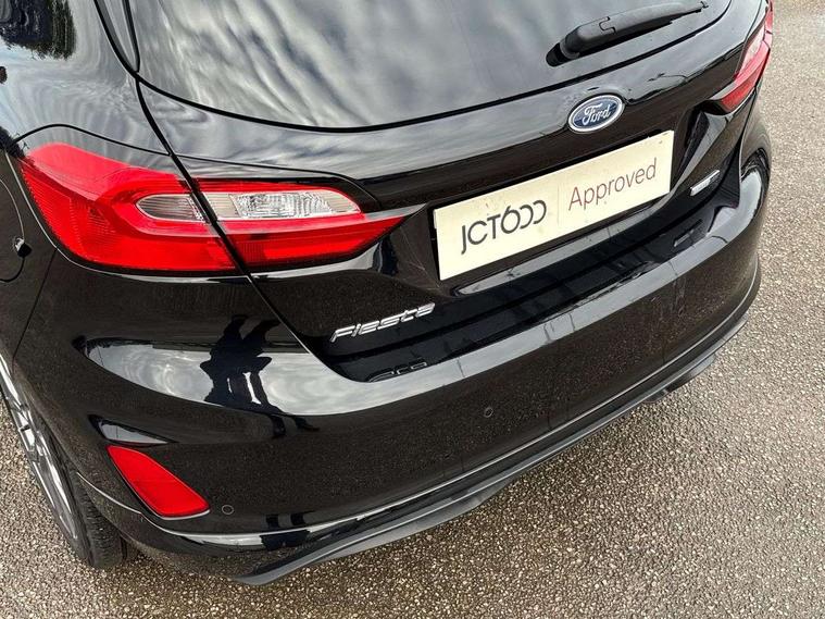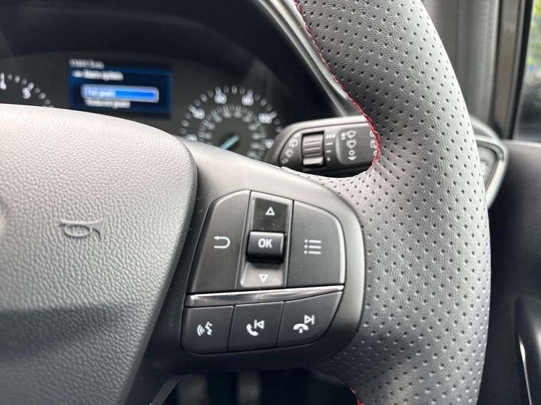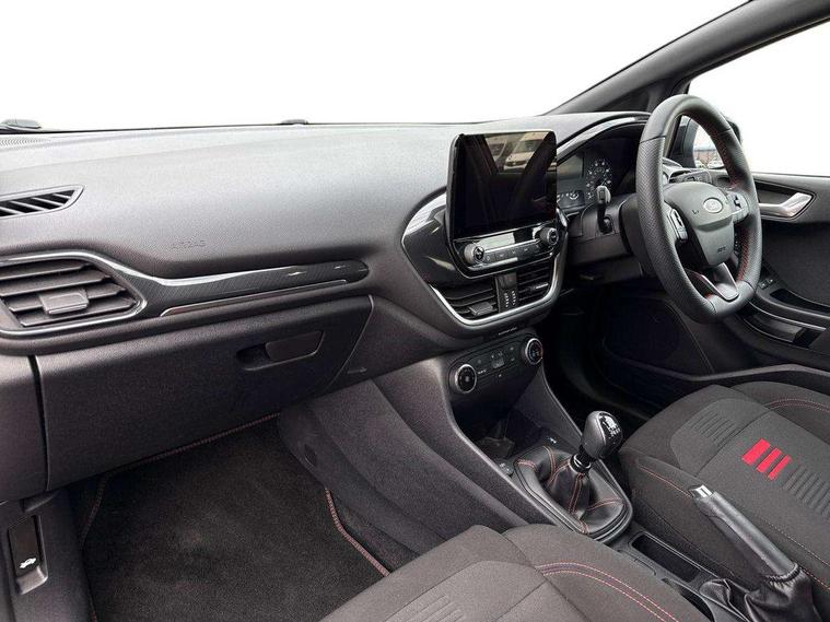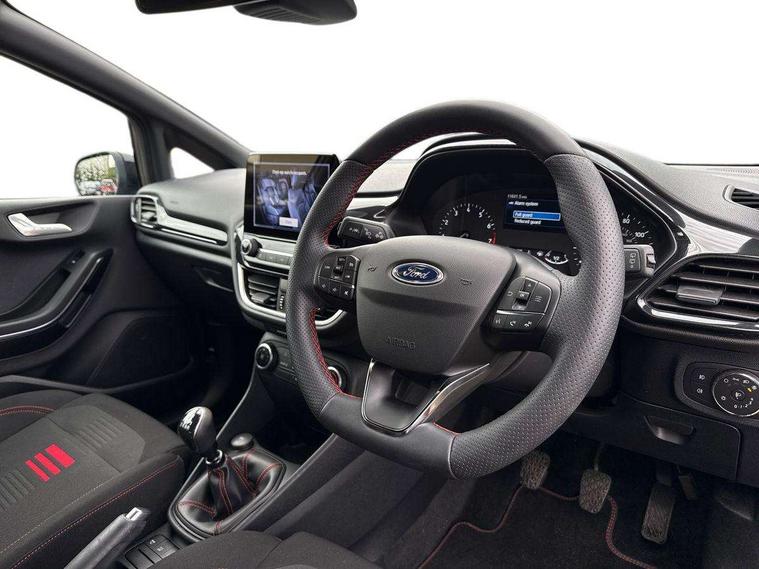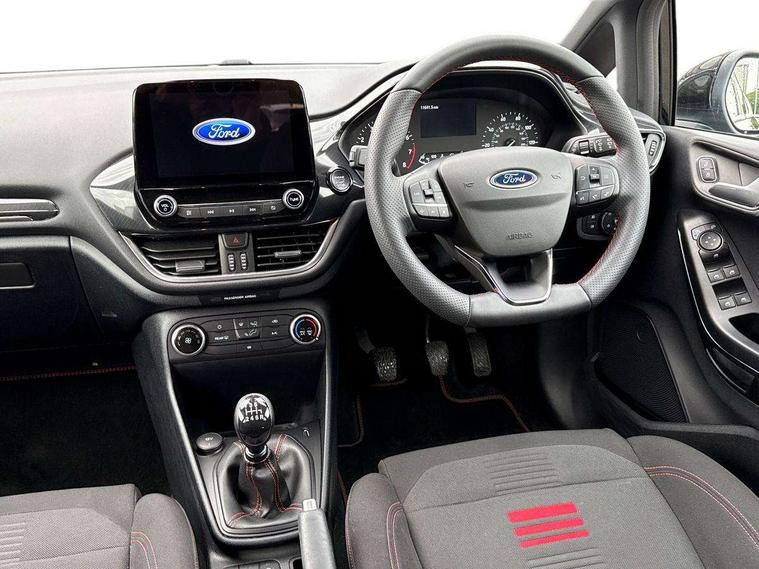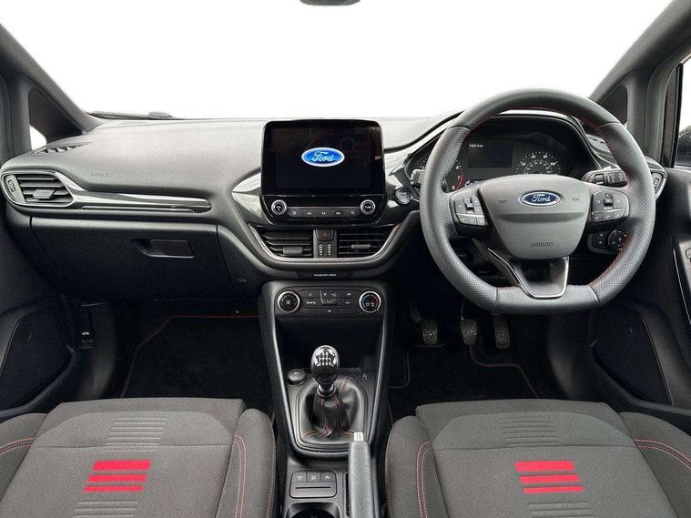 Bluetooth system, Electric power steering, Ford easy fuel, Ford SYNC 3 Navigation system incl 8" touchscreen, 7 speakers, FordPass connect, Apple carplay, android auto, voice control and emergency assistance, Rear parking distance sensors, Selectable drive modes (Normal, Sport, Track), Trip computer, Sports suspension, 2 USB ports, Auxiliary input socket, DAB Digital radio, Steering wheel mounted controls, Body colour bumpers, Body colour door handles, Body colour large rear spoiler, Body coloured electrically operated and heated door mirrors with side indicators, Cornering front fog lights, Electric front windows/one touch facility, Electric rear windows, LED Night signature to rear lights, Quickclear heated windscreen, Rain sensing wipers and auto dimming rear view mirror, Rear privacy glass, Rear wiper, Unique ST-Line upper grille & full bodystyling kit with ST-Line wing badges, 3 spoke flat bottomed leather steering wheel, 60/40 split folding rear seat, Adjustable head restraints, Black headlining, Boot carpet, Centre console with opening armrest, 2x cupholders, 12v and USB, Chrome inner door handles, Cloth upholstery, Footwell illumination, Front floor mats in velour, Front map reading lights, Front seat and rear pockets, Illuminated glovebox, Leather gaiter, Load area light, Manual 2 way passenger seat adjust, Manual 4-way driver seat adjust, Manual air conditioning, Overhead console with sunglasses holder, Pollen filter, Rake/reach adjustable steering wheel, Sensico wrapped steering wheel, Sports front seats, NCAP Pack - Fiesta, 3 point seatbelts on all rear seats, ABS+EBA, Curtain airbags, Driver and passenger airbags, Drivers knee airbag, Electronic stability control with hill start assist, Front passenger airbag deactivation, Front side airbags, Seatbelt warning, Two tone horn, Tyre pressure monitoring system, Keyless start with 'Ford Power' starter button, MyKey system, Remote central locking & engine immobiliser, Thatcham Cat.1 alarm, 17" 5 spoke alloy wheels with rock metallic finish,