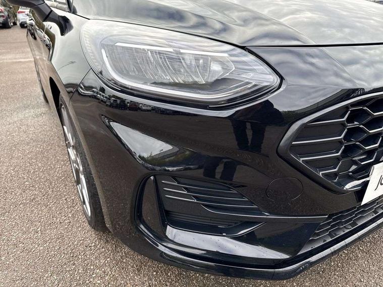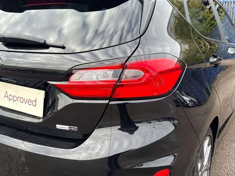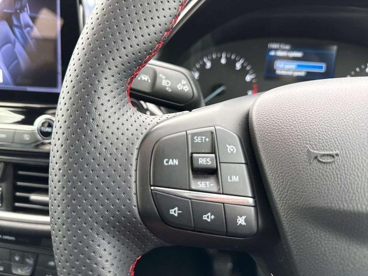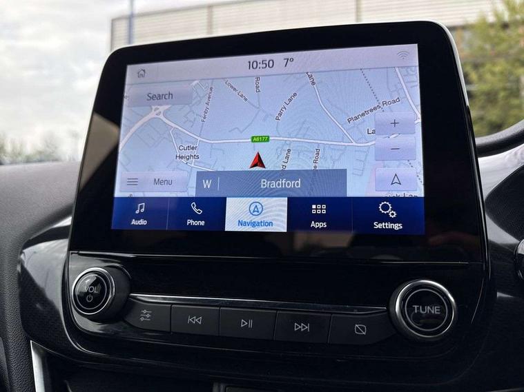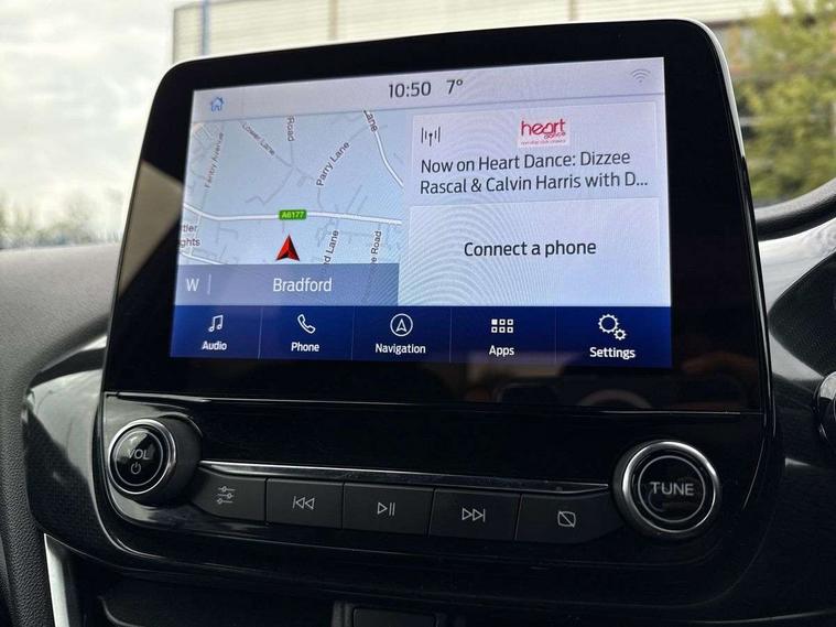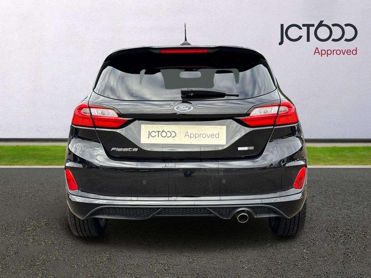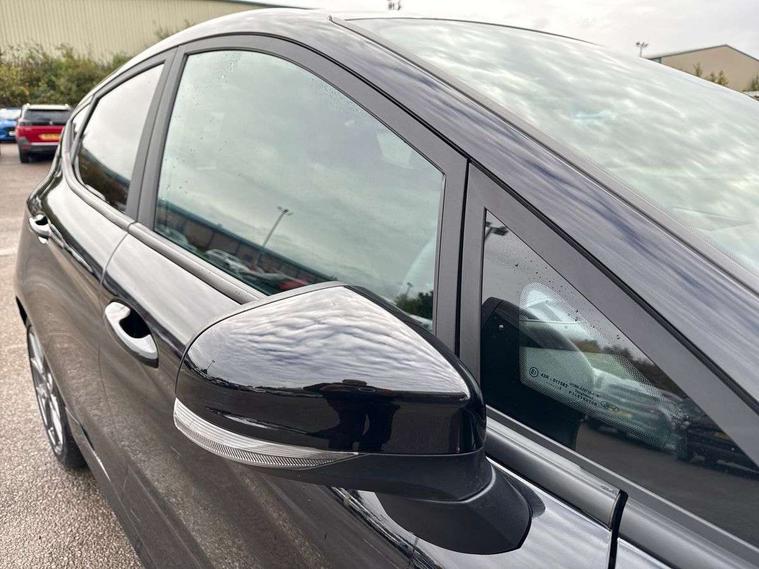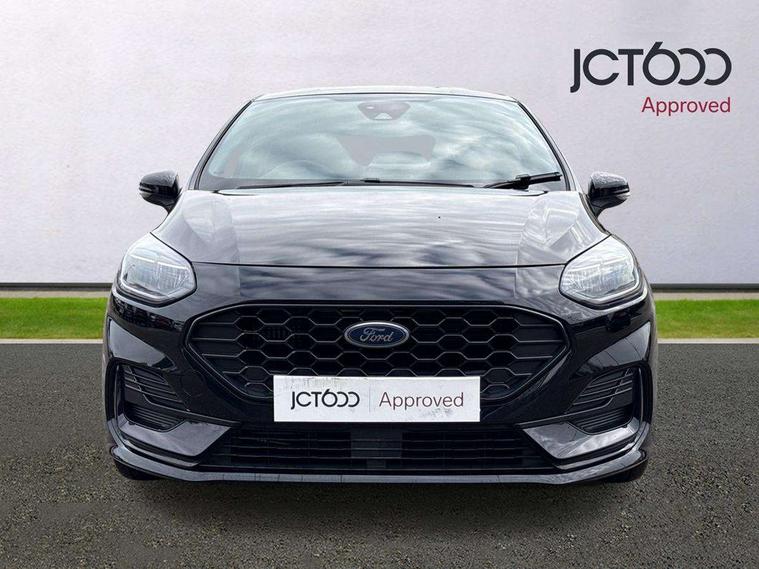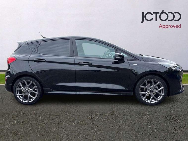 Bluetooth system, Electric power steering, Ford easy fuel, Ford SYNC 3 Navigation system incl 8" touchscreen, 7 speakers, FordPass connect, Apple carplay, android auto, voice control and emergency assistance, Rear parking distance sensors, Selectable drive modes (Normal, Sport, Track), Trip computer, Sports suspension, 2 USB ports, Auxiliary input socket, DAB Digital radio, Steering wheel mounted controls, Body colour bumpers, Body colour door handles, Body colour large rear spoiler, Body coloured electrically operated and heated door mirrors with side indicators, Cornering front fog lights, Electric front windows/one touch facility, Electric rear windows, LED Night signature to rear lights, Quickclear heated windscreen, Rain sensing wipers and auto dimming rear view mirror, Rear privacy glass, Rear wiper, Unique ST-Line upper grille & full bodystyling kit with ST-Line wing badges, 3 spoke flat bottomed leather steering wheel, 60/40 split folding rear seat, Adjustable head restraints, Black headlining, Boot carpet, Centre console with opening armrest, 2x cupholders, 12v and USB, Chrome inner door handles, Cloth upholstery, Footwell illumination, Front floor mats in velour, Front map reading lights, Front seat and rear pockets, Illuminated glovebox, Leather gaiter, Load area light, Manual 2 way passenger seat adjust, Manual 4-way driver seat adjust, Manual air conditioning, Overhead console with sunglasses holder, Pollen filter, Rake/reach adjustable steering wheel, Sensico wrapped steering wheel, Sports front seats, NCAP Pack - Fiesta, 3 point seatbelts on all rear seats, ABS+EBA, Curtain airbags, Driver and passenger airbags, Drivers knee airbag, Electronic stability control with hill start assist, Front passenger airbag deactivation, Front side airbags, Seatbelt warning, Two tone horn, Tyre pressure monitoring system, Keyless start with 'Ford Power' starter button, MyKey system, Remote central locking & engine immobiliser, Thatcham Cat.1 alarm, 17" 5 spoke alloy wheels with rock metallic finish,