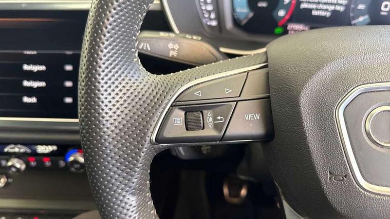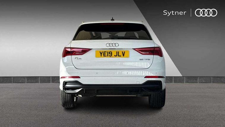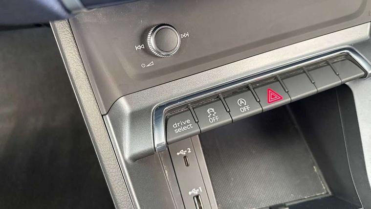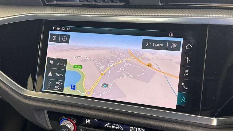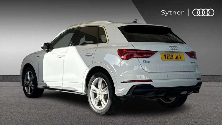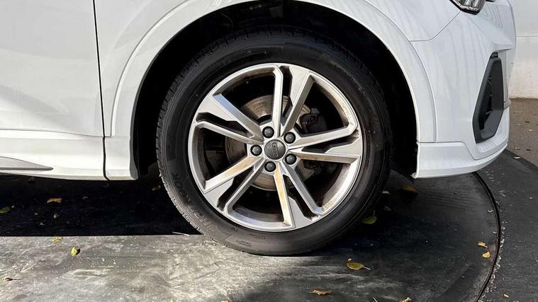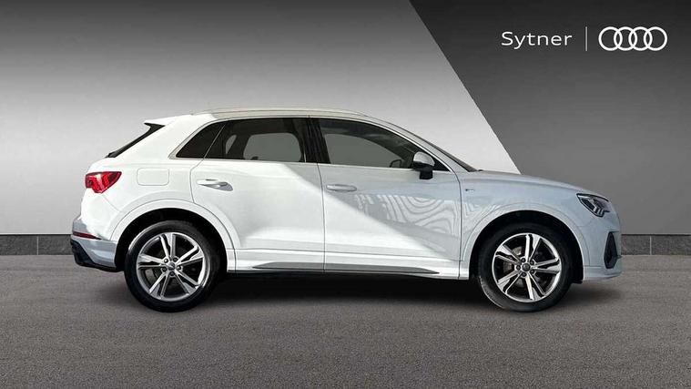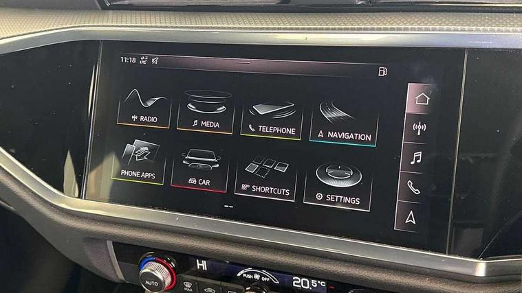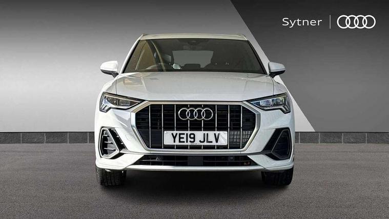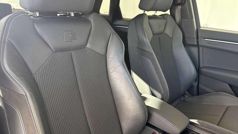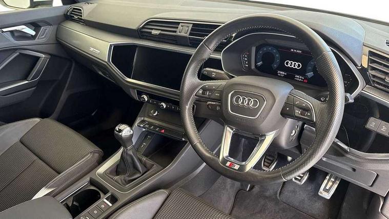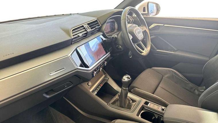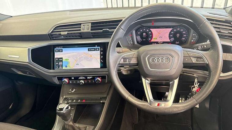 Audi connect safety and service (e-call), Audi drive select, Audi lane departure warning, Audi side assist, Audi smartphone interface, Audi Virtual Cockpit - 10.25" display, Bluetooth interface, MMI navigation plus with MMI touch, Power opening/closing tailgate, Progressive steering, Service interval indicator, Stop/start system, Voice control system, DAB digital radio module, Acoustic windscreen, Aluminium roof rails, Aluminium window trim, Auto dimming rear view mirror, Body colour door mirrors, Body coloured bumpers, Diffuser in matt Platinum grey, Electrically adjustable and heated door mirrors with integrated LED side indicators, Front and rear electric windows, Front fog lights, Front side air inlets in matt platinum grey, Front spoiler blade in matt platinum grey, Grille vertical bars in aluminium silver/Matt, High gloss black finish B and C pillars, Privacy glass, Rain and light sensors, Rear diffuser strip in selenite silver, S Line badge on wings, S Line front and rear bumpers, Side skirt insert in matt Platinium grey, Titanium black radiator grille, 12V socket in rear centre console, 40:20:40 split folding rear bench seat, Adjustable rear seat bench/backrest with centre armrest and cupholder, Aluminium door sill trims, Black cloth headlining, Dual zone climate control, Front and rear black floor mats with contrast stitching in rock grey, Front and rear headrests, Front centre armrest with storage compartment and angle adjustment, Illuminated door sill trims with S logo, ISOFIX child seat mounting and Top Tether with front passenger airbag deactivation, Perforated leather gearknob, Stainless steel luggage compartment sill finisher, Stainless steel pedals, Non smoking pack - Q3, 3x3 point rear seatbelts, 6 airbags - Driver, front passenger, curtain and side windows, Audi pre-sense front with pedestrain and cyclist recognition, Electronic stabilisation control including ABS, ASR and EDL, Hill hold assist, Pre sense basic, Seatbelt monitoring, Tyre pressure warning, Warning triangle and first aid kit, Anti theft alarm, Anti theft wheel bolts, Remote central locking, Dark matt brushed aluminium inlay, MMI touch colour display in gloss black with aluminium surround,
