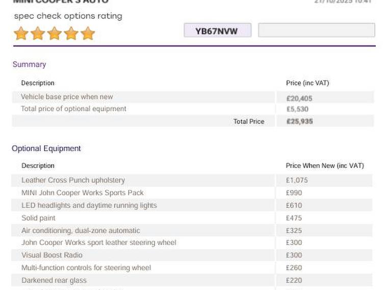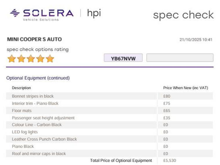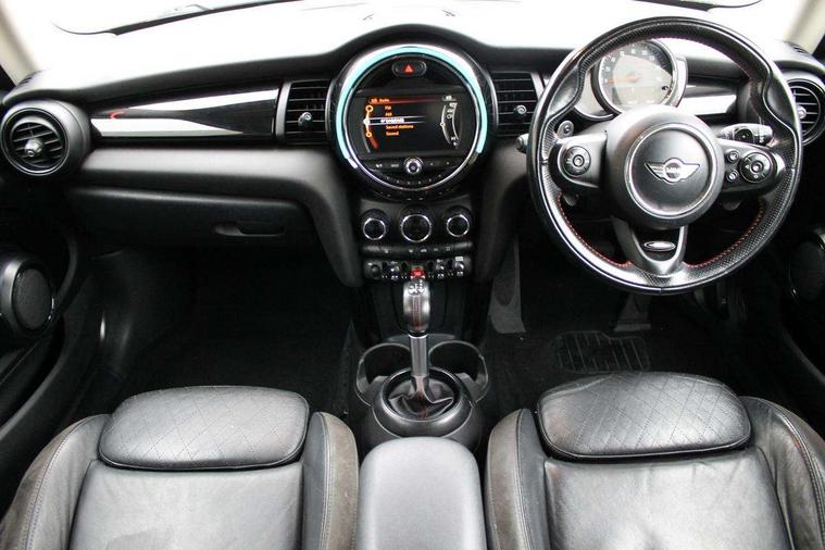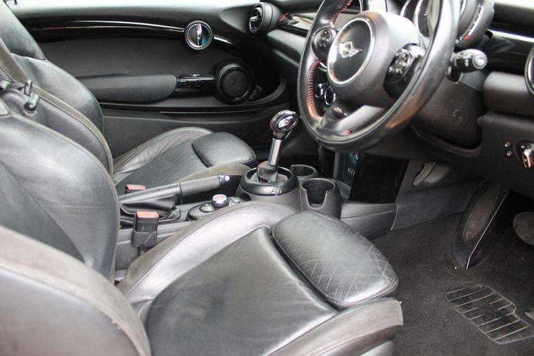 Acoustic seat-belt warning, Brake fluid level warning light, Brake pad wear indicator warning light, DTC - Dynamic traction control, Exterior temperature gauge, Intelligent emergency call, MINI TeleServices, Oil level indicator, On board computer, Push button starter, Service interval indicator, Servotronic PAS, Electronic differential lock, Performance Control, Auxiliary input socket, DAB digital radio module, 2 speed wipers+intermittent wipe, Anti dazzle mirror, Anti trapping/one touch open close front windows, Body colour scoop integrated into engine- compartment lid, Body coloured bumpers, Chrome bezels around rear lights and headlights, Chrome door handles, Chrome plated fuel cap, Chrome plated trim on bottom edge of window, Chrome strip on lower grille, Electric front windows, Electrically adjustable door mirrors, Flared wheel arches, Follow me home headlights, Green tinted heat insulating glass, Heated door mirrors/heated windscreen washers, Heated rear window with auto timer, High gloss black tailgate, Honeycomb radiator grille, Rear wiper, Twin chromed exhaust pipes, White indicator lights, 2 rear head restraints, 4 boot load lashing points, 4 way manually adjustable passenger seat with height, reach, tilt, backrest and headrest, 6-way manually adjustable driver's seat, Active carbon filter, Air recirculation system, Auxiliary socket in centre console storage compartment, Centre console storage, Driver's seat height adjuster, Driver/passenger sunvisors, Easy entry seats, Front and rear cupholders, Front head restraints, Front interior light, Front passenger grab handle, Front seat backrest storage nets, Front sports seats, Gear/selector and handbrake in artificial leather, Internal chrome door handles, Isofix child seat preparation, Luggage compartment lighting, Multifunction steering wheel, Reach + rake adjustable steering column, Rear grab handles, Rear storage trays, Split folding rear seats, Storage compartments in doors, Toolkit in luggage compartment, 3 point seatbelts, ABS/EBD, ASC+T, Cornering brake control (CBC), Crash Sensor - activates hazard/interior lighting + unlocks doors, Driver and passenger airbags, Driver/front passenger side airbags, DSC - Dynamic Stability Control, Fuel cut off safety device, Head airbags, Hill start assist, Passenger airbag deactivation system, Seatbelt pretensioners, Tyre pressure warning, Ventilated front disc brakes, Drive away door locking, Locking wheel bolts, Remote central locking/doors+fuel cap+tailgate, Second remote key, Thatcham category 1 alarm + immobiliser,