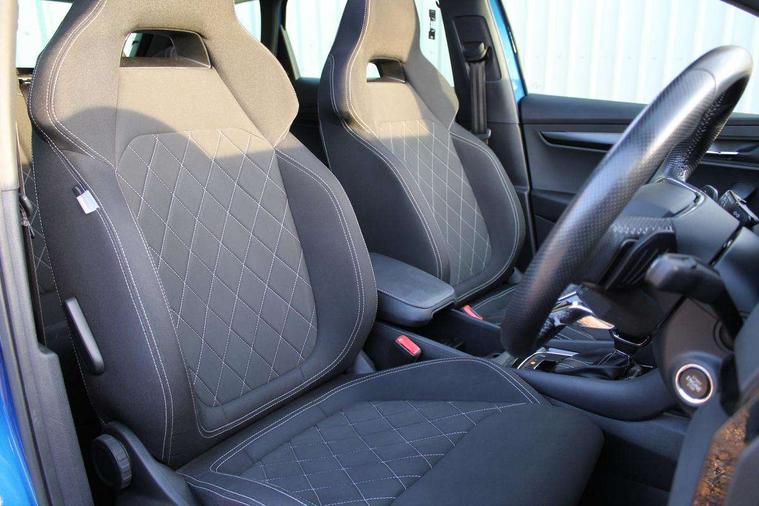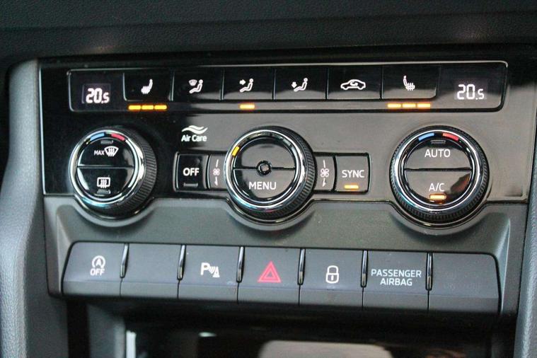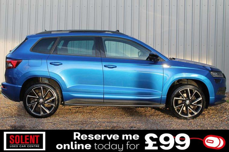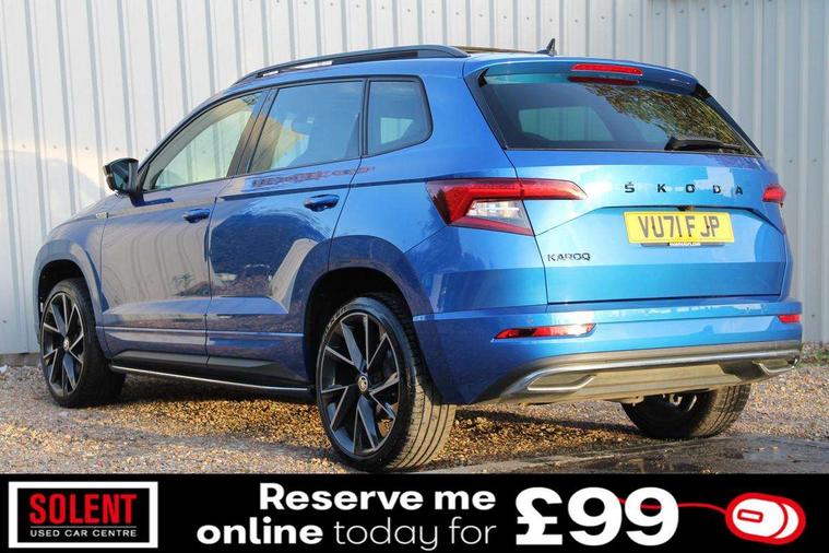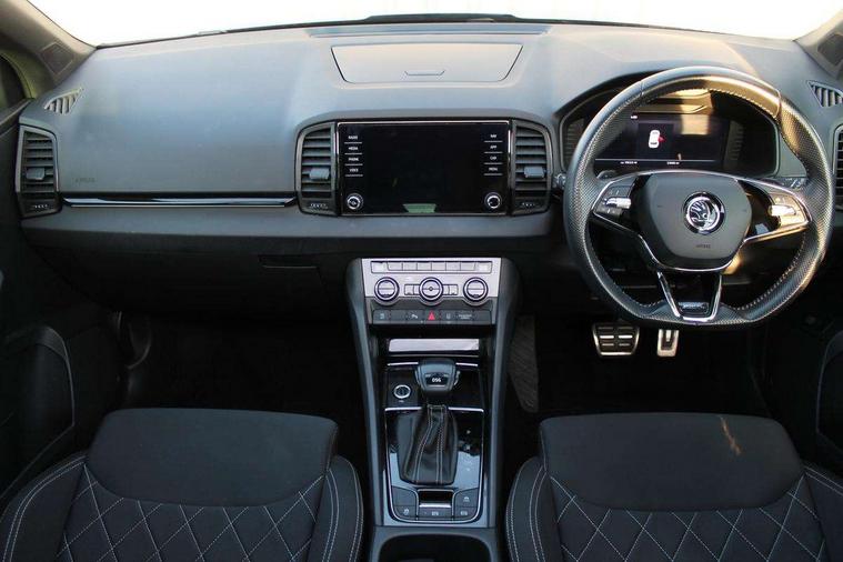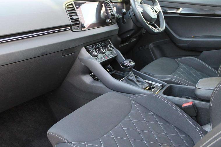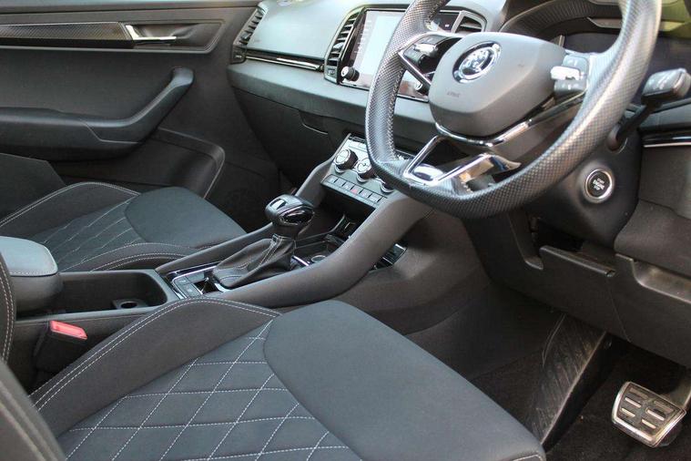 Care connect, Drive mode selector, Driver fatigue sensor, Multifunction colour trip computer, Outside temperature gauge, Service interval indicator, SmartLink wireless for Apple and wired for Android, Start/stop system with regenerative braking, USB C Port x 2 in front centre console, DAB radio with Bluetooth, USB connection, Wireless charging without wireless aerial connection, Acoustic glass, Aero front windscreen wipers with intermittent function, Automatic headlight control system, Black door mirrors, Black electric window control buttons, Black radiator grille, Black roof rails, Body colour door handles, Body coloured bumpers, Electric front and rear windows with child proof lock, Front door steps with SportLine logo, Full LED headlights + adaptive front light system + LED daytime running lights and front cornering fog lights, Headlight washers, Heated rear windscreen, LED rear lights with high functionality, Light assistant (coming/leaving home/tunnel light), Panoramic sliding sunroof, Privacy glass, Protective door side sills in body colour, Rear diffuser, Safety reflectors on front doors, Skoda lettering on tailgate in black, Sportline badge on front fender, Sportline decorative inserts with badging, Sports front and rear bumpers, Third brake light, 1.5 litre bottle holders in driver and front passenger door panels, 12V socket in boot, 12v socket in front centre armrest with storage compartment and rear air vents, 2 Folding hooks and nets in boot, 2 Front readings lights for driver and passenger, 3 rear height adjustable headrests, 4 foldable roof handles with rear coat hooks, Aluminium pedals, Black roof headlining, Cargo elements in boot, Chrome inner door handles, Door sill scuff plates, Driver and passenger seats height adjust, Front head restraints, Height adjustable front three point seats belts with tensioners, Height/reach adjust steering wheel, Ice scraper, Illuminated and cooled glovebox, Illuminated luggage compartment, Isofix child seat preparation outer rear, Manual lumbar support for front seats, Net programme in boot, Pen holder, Pollen filter, Rear reading lights, Rear seats fixed folding and divided 60:40, Retractable parcel shelf attachable to tailgate, Safety vest holder, Solid rear boot cover, Storage box in upper central dashboard closed, Storage compartment below the passenger seat, Sunvisors with illuminated vanity mirrors, Textile floor mats, Umbrella under passenger seat, Welcome animation with sportline logo, LED Interior lighting pack with Skoda welcome logo - Karoq, Airbags - Front side, head, knee and curtain, Automatic door unlocking in case of crash, Automatic fuel cut off in case of crash, Driver airbag, Electronic parking brake with auto hold function, Emergency rear braking signal, ESC including ABS, MSR, ASR, EDS, HBA, DSR, RBS, MKB and traction control, Front assist radar scanning of the space in front of the car with automatic braking, Hill hold control, Passenger airbag with switch-off function, Pedestrian monitor, Seatbelt reminder signalisation and pretensioner for all seats, Three point seatbelts rear, Two tone horn, Tyre pressure display, Tyre pressure monitor, Alarm with interior monitoring, back up horn and tilt sensor with safe function, Electronic engine immobiliser, Keyless entry and keyless start with safe system, Remote central locking with 2 remote folding keys, Black air vent surround, 19" Vega anthracite alloy wheels, Anti-theft wheel bolts protection, Storage on wheel cover,