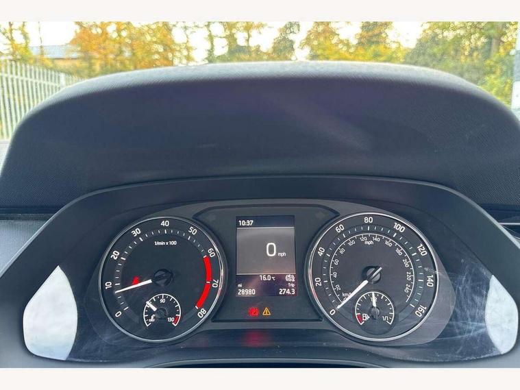 1x USB Type C port in rear view mirror (charging only), 2x USB Type C ports in rear of front centre armrest (charging only), Bluetooth system, Bolero radio with 10" touchscreen, Colour multifunction trip computer, Electro-mechanical power steering, Front assist system, Lane assist, Rear parking sensors with manoeuvre assist, Smartlink (includes android auto and mirrorlink), Speed limiter, Turn Assist, Voice control system, Wireless SmartLink for Apple Car Play, 2x USB Type C ports (for charging and data transfer), 8 speakers, DAB Digital radio, Aero front windscreen wipers with intermittent function, Auto dimming rear view mirror, Black window surrounds, Body colour door mirrors and handles, Chrome grille surround, Electric front and rear windows, Electrically adjustable and heated door mirrors, Heated rear windscreen, High level third brake light, Ice scraper in fuel cap, Rain and light sensors, Rear fog light on one side, 3 rear headrests, 4 foldable roof handles, Chrome inner door handles, Climatronic dual-zone electronic air conditioning, Cloth upholstery, Front centre armrest, Front head restraints, Height adjustable driver and passenger seat with lumbar support, Illuminated air conditioned glovebox, Leather trimmed gearshift lever, Luggage compartment lighting x1 light, Parcel shelf - folding, Satin black textured with artificial stiching in dash board pads, Sun visors with mirrors, Sunglasses storage, Ticket holder, Two-spoke leather multi function steering wheel, Umbrella in door panel, Unsplit rear bench seat and split folding backrest, 3 point front/outer rear seatbelts+pre-tensioners, Alarm with interior monitoring, tilt sensor and back up horn, Automatic door unlocking in case of crash, Automatic fuel cut off in case of crash, Automatic warning lights in case of emergency braking, Driver and passenger front and side airbags, Drivers knee airbag, Electronic parking brake, Emergency call and proactive services, ESC including ABS, EBV, MSR, ASR, EDS, HBA, DSR, Head and curtain airbags, Hill hold control, Hill start assist, ISOFIX on front passenger seat and outer rear seats, Passenger airbag deactivate switch, Rear disc brakes, Two tone horn, Tyre pressure monitor, Visual and acoustic seat belt reminder, Warning reflectors in front door, Door locks with immobiliser, Keyless start/stop, Remote central locking, Aluminium decorative inserts,