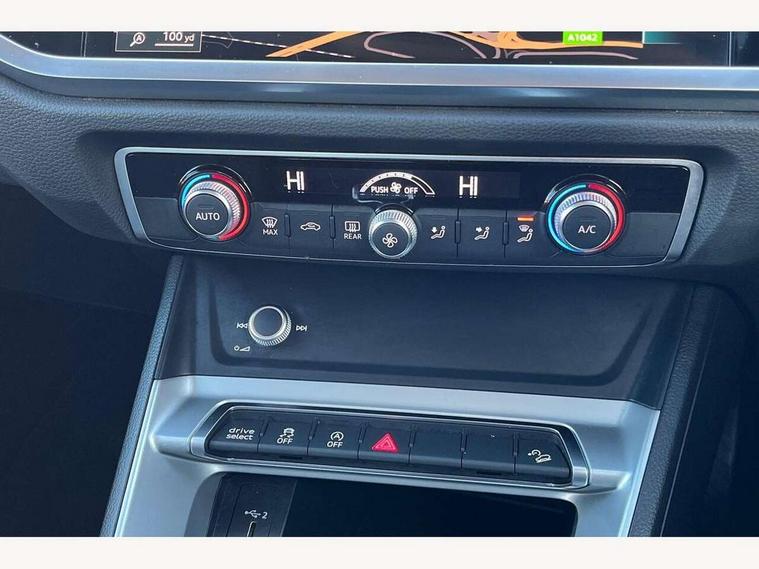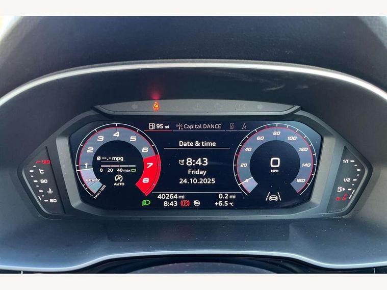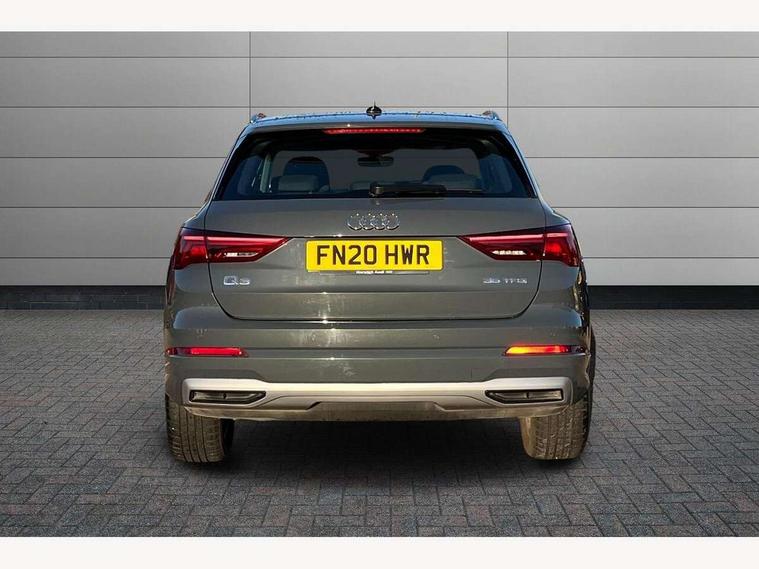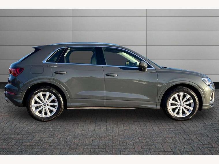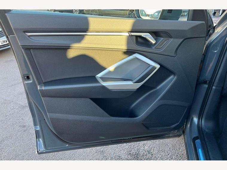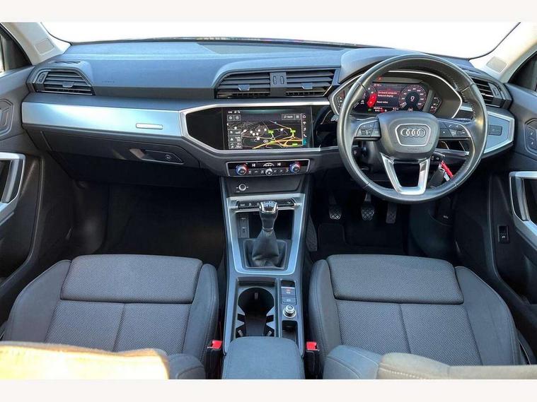 Audi connect safety and service (e-call), Audi drive select, Audi lane departure warning, Audi side assist, Audi smartphone interface, Audi Virtual Cockpit - 10.25" display, Bluetooth interface, Camera based traffic sign recognition, Cruise control + speed limiter, MMI Navigation Plus with high resolution 10.1 inch touchscreen colour display, Power operated tailgate, Progressive steering, Rear parking sensors, Service interval indicator, Start stop system with recuperation, Voice control system with natural language interaction, Sports suspension, 1 x USB type C and 1 USB type A charging points, 6 passive loudspeakers, DAB digital radio module, Acoustic windscreen, Aluminium window trim, Auto dimming frameless rear view mirror, Bumpers and underbody protection in contrasting manhattan grey paint finish, Diffuser grille in grained matt black, Diffuser trim in manhattan grey metallic, Door sill trims with illuminated aluminium inlay, Electrically folding, adjustable and heated door mirrors with integrated LED side indicators and kerb view function for passenger side, Front and rear electric windows, Front fog lights, Front side air inlets in Manhattan grey metallic, Grille surround in aluminium silver matt, High gloss black finish B and C pillars, Honeycomb design radiator grille in matt titanium black, LED headlights with LED daytime running lights and dynamic rear indicator, LED rear lights, Rain and light sensors, 12V socket in rear centre console, 40:20:40 folding with manual adjustment for 60:40 forwards/backwards position and backrest angle, Adjustable rear seat bench/backrest, Dual zone climate control, Front and rear floor mats, Front and rear headrests, Front and rear roof module including reading lights, Front centre armrest, Glove compartment lighting, ISOFIX child seat mounting and Top Tether with front passenger airbag deactivation, Luggage compartment light, Lunar silver cloth headlining, Manual front seats with height adjustment, Stainless steel luggage compartment sill finisher, Non smoking pack - Q3, 3x3 point rear seatbelts, 6 airbags - Driver, front passenger, curtain and side windows, Audi pre-sense front with pedestrain and cyclist recognition, Electrically operated child locks on rear doors, Electromechanical parking brake, Electronic stabilisation control including ABS, ASR and EDL, Hill descent control, Hill hold assist, Pre sense basic, Seatbelt monitoring, Tyre pressure warning, Warning triangle and first aid kit, Anti theft alarm, Anti theft wheel bolts, Remote central locking, Detail dashboard around MMI touch colour display in glass look, black with surround in aluminium look,