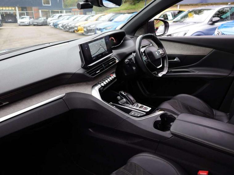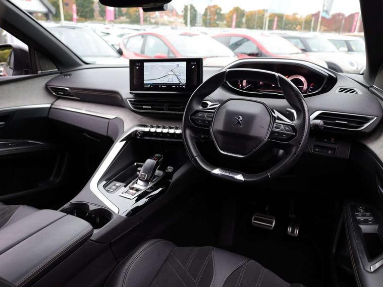 3D connected navigation with 10" HD touchscreen, Bluetooth telephone facility, Drive modes select (Eco, normal and sport), Driving Time Warning (DAA1), Emergency services call system, Extended traffic sign recognition, Exterior temperature indicator with ice warning, Front and rear parking sensors, Mirror screen with mirror link, apple carplay and android auto, Multi function trip computer, Passive blind spot monitoring without Steering correction, PEUGEOT i-Cockpit with 10" high definition capacitive touchscreen, Peugeot i-cockpit with compact multi-function sports steering wheel, PEUGEOT i-Cockpit with configurable 12.3" Head-up digital instrument panel, PEUGEOT SOS and assistance, Rear passenger USB charging sockets (x2) (type A), Speed limit recognition and recommendation, Visio park assist 360 with colour camera system + automatic parking assist, Voice recognition, Dynamic stability control and electronic anti-skid system, Stop/start function, DAB Digital radio, Focal premium HiFi sound system, USB socket, Auto self levelling headlights, Automatic hazard light activation upon heavy brake application, Automatic triggered rear windscreen wiper in reverse gear, Black with chrome detailed front wing trim, Body colour door handles, Body colour rear roof spoiler with stainless steel edging trim, Body protectors (bottom of front and rear bumpers + wheel arches + protection at bottom of doors) in black, Dark tinted rear side windows + tailgate window, Diamond Black door mirror shells, Door mirror mounted LED courtesy floor lighting, Electric folding door mirrors with exterior courtesy LED lighting, Electric operated/heated door mirrors, Fog Mode, Front windscreen wiper with magic wash cleaning system, Full LED headlights with LED fog lights with static cornering function, Gloss black B and C pillar and aerodynamic deflector trim, Gloss black front bumper air scoops, Gloss black rear cluster connecting strip, Gloss black windscreen trim, GT emblem in satin copper (front wings and tailgate), Headlights left on audible warning, Heated rear windscreen with integrated antenna, LED daytime running lights, LED front indicator, LED rear number plate lighting, LED side indicator lights integrated into door mirrors, LED third brake light, One touch electric front/rear windows with pinch protection, Rear LED Peugeot signature 'Claw Effect' lights, Rear side wing doors, Stainless steel roof arches, Twin exhaust tailpipe, 1/3 to 2/3 split folding rear seats, 12V Sockets in dashboard, rear cabin and load area, 2 cupholders in front centre console, 2 cupholders in rear armrest, 2 x Rear reading spotlights, 2x Rear coat hooks, 3x Isofix child seat fittings in the front passenger and outer rear seats, 4 Grab handles retractable and damped, Aikinite stitching in armrest, gear lever and dashboard facia, Aluminium pedals, Blue ambient lighting for connecting zone, Blue ambient lighting to front door panels, central storage and cupholders, Blue ambient lighting to headup instrument panel, Centre front armrest with butterfly wing opening and illuminated storage compartment, Dual zone automatic climate control, Electric power steering with reach and rake adjustable steering column, Flocked front door pocket interior with blue ambient lighting, Flocked glovebox interior, Focal tweeter speaker grilles in Belem bronze metal effect finish, Foldable front passenger seat with picnic table, Footwell illumination, Front interior light with 2 reading spotlights and rear interior light with timer, Front passenger seat manual adjustment (longitudinal and back rest angle), Front seat back map pockets, Gear shift indicator, Illuminated glovebox, Individual left and right controls in boot for seat folding, LED interior lighting in storage spaces and load area, LED roof interior lighting, Mistral floor mats with Aikinite contrast stitching, Mistral full grain perforated leather steering wheel with aikinite stitch detail and satin chrome 'GT' emblem, Rear bench seat with central armrest and ski hatch, Rear centre console ventilation system, Roof lining - Mistral black, Satin chrome dashboard trim, Satin chrome digital instrument panel and touchscreen trim, Satin chrome front door panel recess trim, Satin chrome interior door handles, Satin chrome scorpion's tail and toggle switch trim, Seatbelt not fastened audible and visual alert for front seats, Seatbelt unfastened on the move audible and visual alert for front and rear seats, Sunvisors with illuminated vanity mirrors, Two position boot floor, Drive assist plus pack - 3008, Driver sport pack - 3008 Auto, Safety plus pack with high beam assist - 3008, Visibility pack - 3008, 3x Rear three-point retractable seatbelts with force limiters in the outer rear seats, ABS (Anti-lock Braking System) with EBD (Electronic Brakeforce Distribution) and EBA (Emergency Braking Assistance), Adaptive driver and front passenger airbags with passenger airbag deactivation function, Driver and front passenger side airbags, Electric child locking functionality on rear windows and doors, Electric parking brake, Front and rear curtain airbags, Front optimised safety headrests and 3 x rear retractable headrests with height adjustable, Front three point retractable seatbelts with pre tensioners and force limiters, Front ventilated disc brakes and rear disc brakes, Hill start assist, Two tone horn, Automatic door locking when moving off, Electronic immobiliser, key operated exterior door lock from the left hand door, Perimetric and volumetric alarm with lift and tilt sensor, Peugeot Open and Go System, Remote control central locking with two plip keys, Puncture repair kit including compressor, sealant cartridge and towing eye,