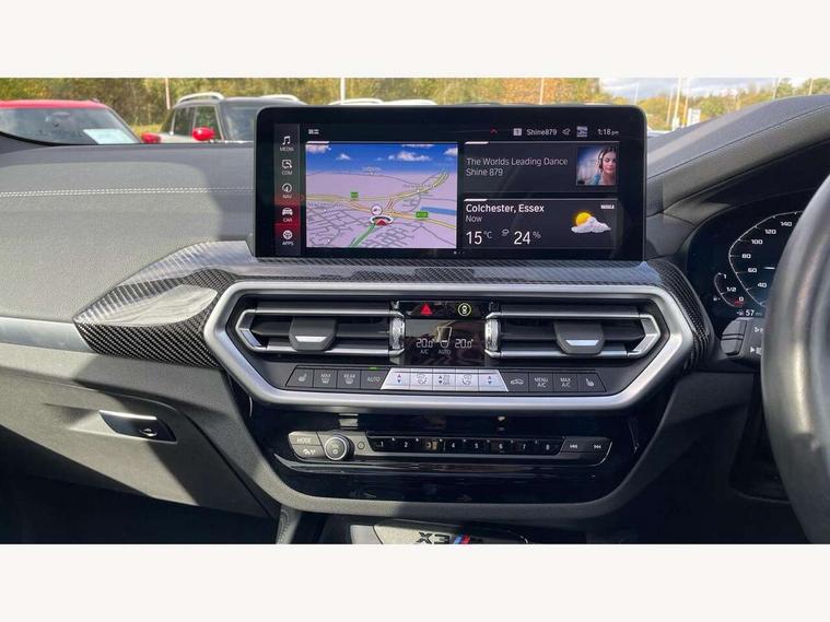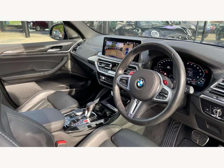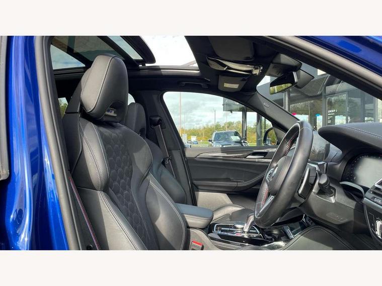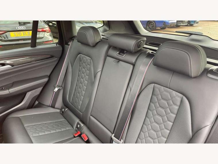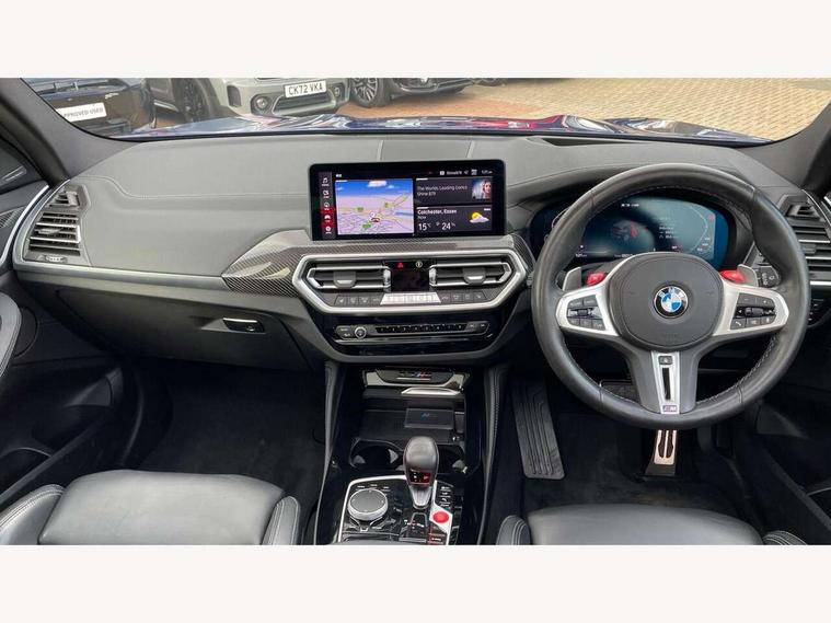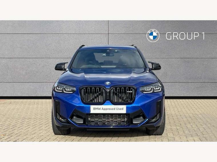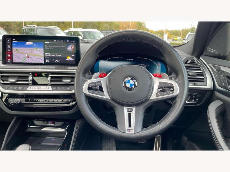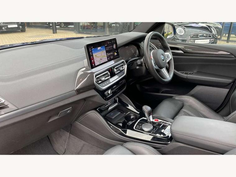 Active Guard Plus incl front collision warning with brake intervention, Attentiveness assist, Auto start-stop, Automatic tailgate operation, BMW ConnectedDrive online services, BMW gesture control, BMW Live Cockpit Professional Nav with 12.3" instrument display + 12.3" control display, Intelligent Voice Assist, BMW OS 7, HDD, 2USB, 4G LTE connect, BMW service history, BMW Teleservices, Brake pad wear indicator in front and rear, Check Control warning system for monitoring of lights and door/luggage compartment open warning, Condition based service, Cruise control with brake function + speed limiter, Electronic Power Steering (EPS), Enhanced bluetooth with wireless charging, Front/rear park distance control (PDC), Head up Display, iDrive touch controller with 8 favourite buttons, Integrated owner's handbook, Language version English, Lights on warning by audio warning signal when ignition is switched off, M drive buttons, Oil sensor for level and grade, warning by check control system, On board computer - average speed+fuel consumption, service interval, clock/date, odometer/trip meter, outside temperature display and ice warning, Personal Profile - automatic lock when driving away selectable, Shifting point display, Variable sport steering, Wifi hotspot preparation, Activation of safety battery terminal clamp, Active M differential, Adaptive M suspension, Double joint spring strut front axle, Drive experience mode switch - Comfort mode, ECO PRO mode and SPORT mode, Electronic differential lock, EU6 emissions management, Incorrect fuelling protection, M Sport differential, Performance Control, Sport automatic transmission with steering-wheel mounted gearshift paddles and launch control, 2 USB ports for charging in rear of centre console, 2x USB Type C ports in front centre console for charging and data transfer, DAB tuner, Electronic service booklet, Harman Kardon loudspeaker system, Acoustic glazing, Automatic headlight beam throw control with load dependent regulating reaction, dynamic compensation of braking dive and acceleration squat, Body colour door handles, Body colour front and rear bumpers, Body colour spoiler, Direction indicator, side repeaters, integrated in exterior mirrors, Dynamic brake lights, Electric front and rear windows with fingertip open/close + anti-trap facility and comfort closing function, Electrically adjustable and heated door mirrors, Follow me home headlight function, Front and rear bumper system with replaceable deformation elements, Green tinted heat protection glazing, Heated windscreen washer jets, High beam assistant, High gloss black shadow line roof rails, High gloss shadowline exterior trim in decorative moulding side frame/recess cover/guide rail/B, C pillars/mirror frame and triangle with mirror base, High level 3rd brake light incorporating LED Technology, LED tail lights, Lightweight engineering, M competition bodystyling, M door entry sills, M Double slat kidney grilles in High Gloss Black with black slats, M Exhaust tailpipes - Quad, round, split left and right with high gloss black finisher 100mm, M Sport exhaust system, Model inscription logo on right tailgate, Rain sensor including auto headlights activation, Rear side wing doors, Rear wiper, Reversing lights, Shark fin antenna, Sun protection glass, Visible VIN plate, Welcome lighting, Windscreen wipers with adjustable interval, 12V power socket in luggage compartment and front centre console, 3 zone automatic air conditioning, 40/20/40 split folding rear seats with backrest, Anthracite headlining, Battery in luggage compartment, Electric seat adjustment with memory, Floor mats in velour - Front and rear colour co-ordinated with all standard carpet colours and front with M stripes, Foldable boot floor with storage compartment, Four grab handles integrated in roof lining, Four-way electrically adjustable front lumbar support, Front and rear bottle holders integrated into door trim storage compartments, Front and rear side armrests integrated into door trim, Front centre armrest with storage compartment, Front cupholders x 2, Front head restraints, Front M sport seats with electrically adjustable headrests and illuminated M logo in headrests, Glove compartment with illumination, Heated front and rear seats, High gloss black front door sill finishers with X3 M competition designation, Luggage compartment lighting, M Gear knob, M sport leather steering wheel, Microfilter and active carbon filter, Multifunction steering wheel, Parcel shelf removeable and storable under boot floor, Reach and rake adjustable steering column, Rear seat centre armrest with two cupholders, Seat backrest adjustment for rear seat, Single front passenger seat, Steering wheel heating, Storage compartment in rear centre console, front and rear door trims and under luggage compartment, Sunvisors with illuminated vanity mirrors and ticket pocket, Three rear headrests, Through loading system with 40/20/40 split folding rear seat, Toolkit located in luggage compartment, Ambient light pack - X3/X4 M, Connected package professional - X3 M/X4 M, Extended storage pack with Stainless steel door sills- X3 M, Interior and exterior mirror pack - X3/X4 M, Interior lighting pack -X3/X4 M, Active protection, ADB - Automatic Differential Brake, Airbags - Front driver/passenger, front and rear curtain head protection, front side, manual deactivation of front passenger airbag, Anti lock braking system (ABS) with brake assist, Automatic Stability Control (ASC), BMW emergency call, Brake drying, Brake energy regeneration, Braking pre-tensioning, Child proof locking system in rear door, Child seat ISOFIX attachment rear outer seats, Compound structure brake discs, Cornering brake control (CBC), Crash Sensor - activation of airbags, Crash Sensor - activation of central locking release, hazard warning light and interior lighting, Deactivation of fuel pump in the event of a crash, Driver and front passenger with seat occupancy detection for dri
