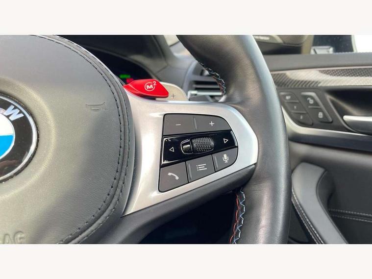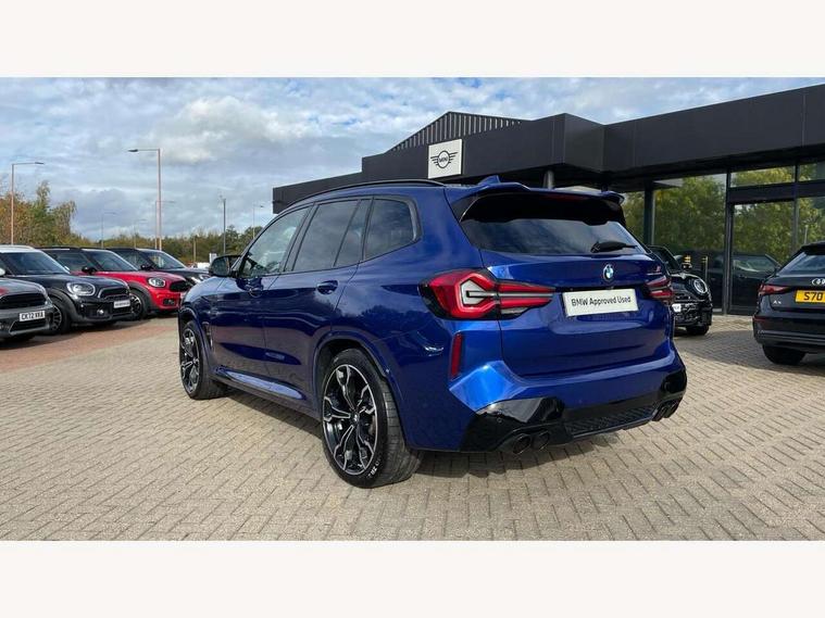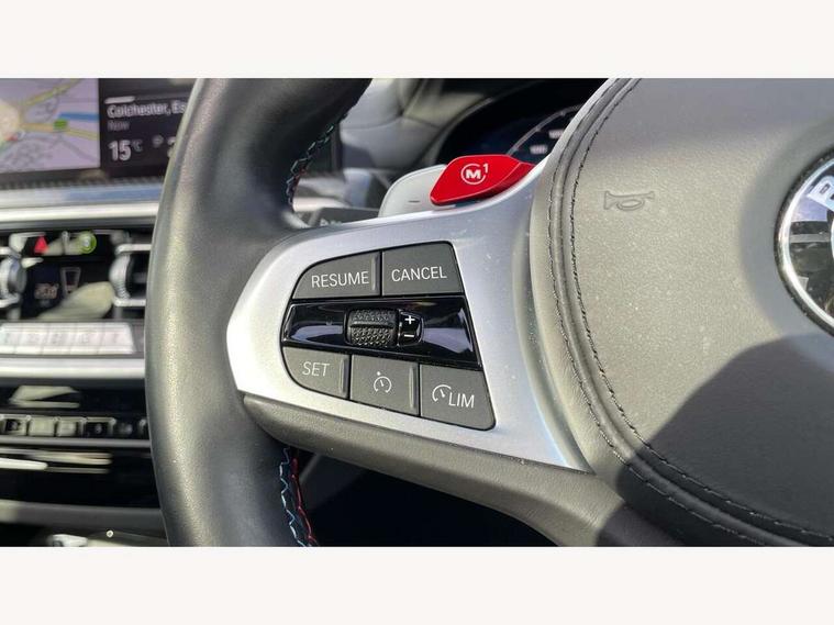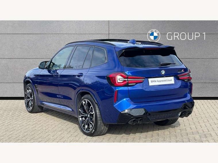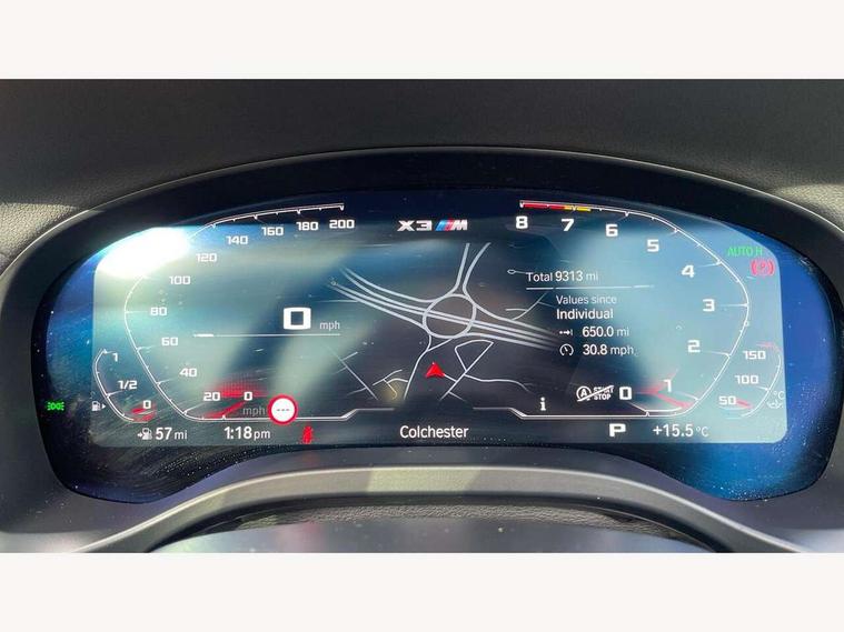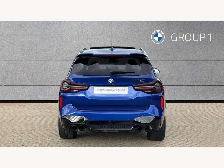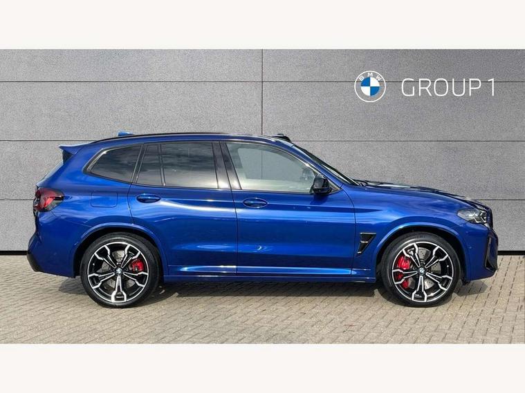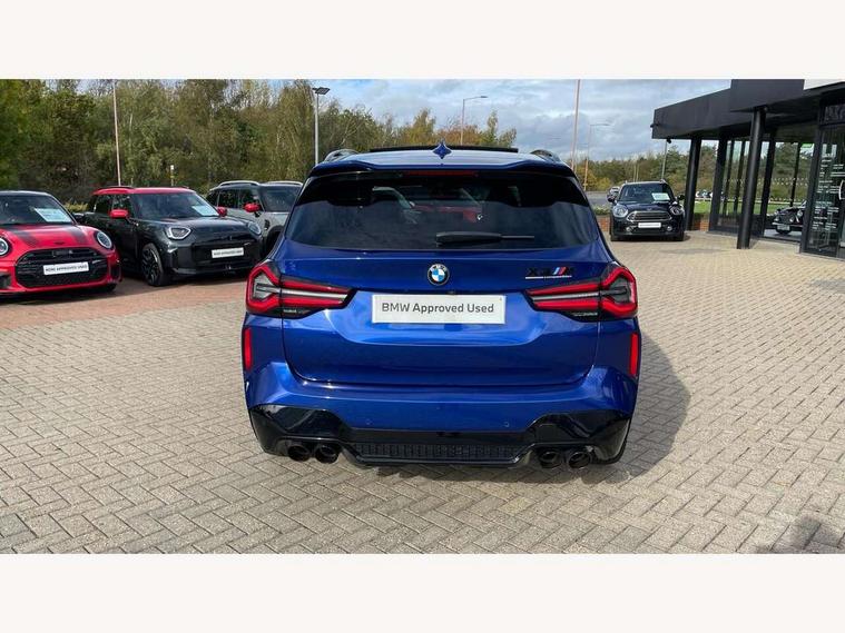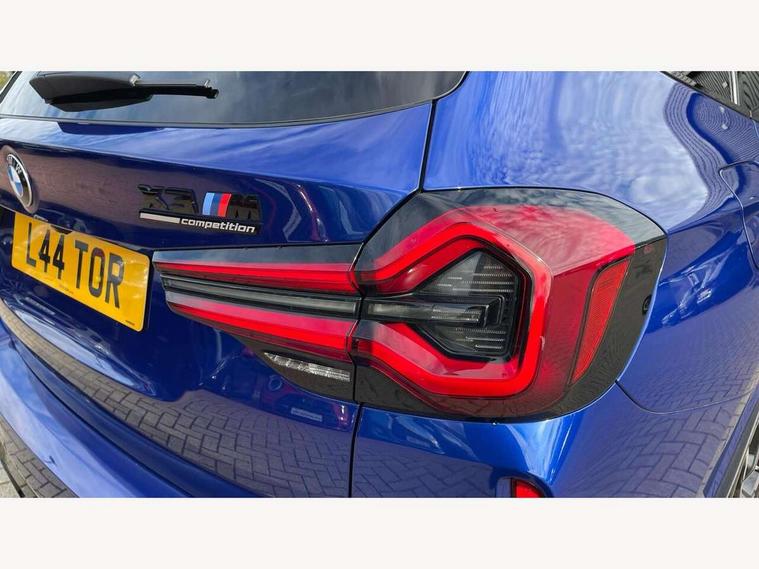 Active Guard Plus incl front collision warning with brake intervention, Attentiveness assist, Auto start-stop, Automatic tailgate operation, BMW ConnectedDrive online services, BMW gesture control, BMW Live Cockpit Professional Nav with 12.3" instrument display + 12.3" control display, Intelligent Voice Assist, BMW OS 7, HDD, 2USB, 4G LTE connect, BMW service history, BMW Teleservices, Brake pad wear indicator in front and rear, Check Control warning system for monitoring of lights and door/luggage compartment open warning, Condition based service, Cruise control with brake function + speed limiter, Electronic Power Steering (EPS), Enhanced bluetooth with wireless charging, Front/rear park distance control (PDC), Head up Display, iDrive touch controller with 8 favourite buttons, Integrated owner's handbook, Language version English, Lights on warning by audio warning signal when ignition is switched off, M drive buttons, Oil sensor for level and grade, warning by check control system, On board computer - average speed+fuel consumption, service interval, clock/date, odometer/trip meter, outside temperature display and ice warning, Personal Profile - automatic lock when driving away selectable, Shifting point display, Variable sport steering, Wifi hotspot preparation, Activation of safety battery terminal clamp, Active M differential, Adaptive M suspension, Double joint spring strut front axle, Drive experience mode switch - Comfort mode, ECO PRO mode and SPORT mode, Electronic differential lock, EU6 emissions management, Incorrect fuelling protection, M Sport differential, Performance Control, Sport automatic transmission with steering-wheel mounted gearshift paddles and launch control, 2 USB ports for charging in rear of centre console, 2x USB Type C ports in front centre console for charging and data transfer, DAB tuner, Electronic service booklet, Harman Kardon loudspeaker system, Acoustic glazing, Automatic headlight beam throw control with load dependent regulating reaction, dynamic compensation of braking dive and acceleration squat, Body colour door handles, Body colour front and rear bumpers, Body colour spoiler, Direction indicator, side repeaters, integrated in exterior mirrors, Dynamic brake lights, Electric front and rear windows with fingertip open/close + anti-trap facility and comfort closing function, Electrically adjustable and heated door mirrors, Follow me home headlight function, Front and rear bumper system with replaceable deformation elements, Green tinted heat protection glazing, Heated windscreen washer jets, High beam assistant, High gloss black shadow line roof rails, High gloss shadowline exterior trim in decorative moulding side frame/recess cover/guide rail/B, C pillars/mirror frame and triangle with mirror base, High level 3rd brake light incorporating LED Technology, LED tail lights, Lightweight engineering, M competition bodystyling, M door entry sills, M Double slat kidney grilles in High Gloss Black with black slats, M Exhaust tailpipes - Quad, round, split left and right with high gloss black finisher 100mm, M Sport exhaust system, Model inscription logo on right tailgate, Rain sensor including auto headlights activation, Rear side wing doors, Rear wiper, Reversing lights, Shark fin antenna, Sun protection glass, Visible VIN plate, Welcome lighting, Windscreen wipers with adjustable interval, 12V power socket in luggage compartment and front centre console, 3 zone automatic air conditioning, 40/20/40 split folding rear seats with backrest, Anthracite headlining, Battery in luggage compartment, Electric seat adjustment with memory, Floor mats in velour - Front and rear colour co-ordinated with all standard carpet colours and front with M stripes, Foldable boot floor with storage compartment, Four grab handles integrated in roof lining, Four-way electrically adjustable front lumbar support, Front and rear bottle holders integrated into door trim storage compartments, Front and rear side armrests integrated into door trim, Front centre armrest with storage compartment, Front cupholders x 2, Front head restraints, Front M sport seats with electrically adjustable headrests and illuminated M logo in headrests, Glove compartment with illumination, Heated front and rear seats, High gloss black front door sill finishers with X3 M competition designation, Luggage compartment lighting, M Gear knob, M sport leather steering wheel, Microfilter and active carbon filter, Multifunction steering wheel, Parcel shelf removeable and storable under boot floor, Reach and rake adjustable steering column, Rear seat centre armrest with two cupholders, Seat backrest adjustment for rear seat, Single front passenger seat, Steering wheel heating, Storage compartment in rear centre console, front and rear door trims and under luggage compartment, Sunvisors with illuminated vanity mirrors and ticket pocket, Three rear headrests, Through loading system with 40/20/40 split folding rear seat, Toolkit located in luggage compartment, Ambient light pack - X3/X4 M, Connected package professional - X3 M/X4 M, Extended storage pack with Stainless steel door sills- X3 M, Interior and exterior mirror pack - X3/X4 M, Interior lighting pack -X3/X4 M, Active protection, ADB - Automatic Differential Brake, Airbags - Front driver/passenger, front and rear curtain head protection, front side, manual deactivation of front passenger airbag, Anti lock braking system (ABS) with brake assist, Automatic Stability Control (ASC), BMW emergency call, Brake drying, Brake energy regeneration, Braking pre-tensioning, Child proof locking system in rear door, Child seat ISOFIX attachment rear outer seats, Compound structure brake discs, Cornering brake control (CBC), Crash Sensor - activation of airbags, Crash Sensor - activation of central locking release, hazard warning light and interior lighting, Deactivation of fuel pump in the event of a crash, Driver and front passenger with seat occupancy detection for dri