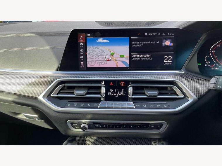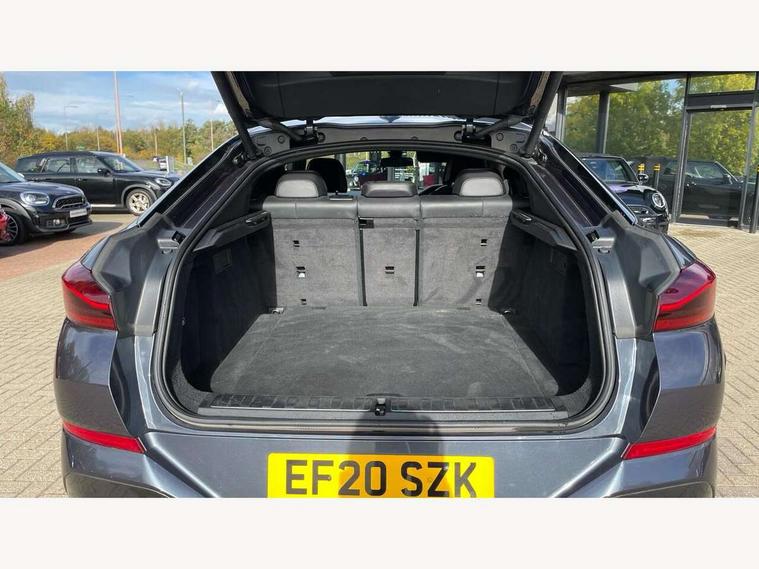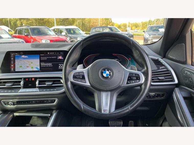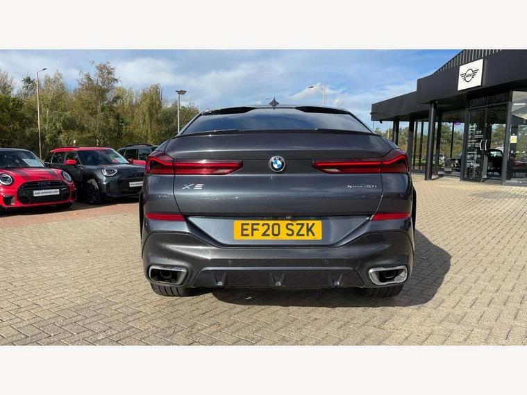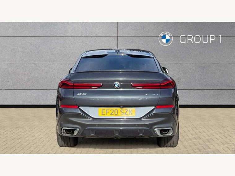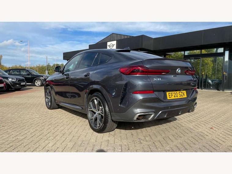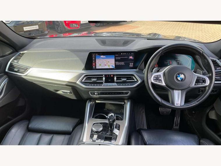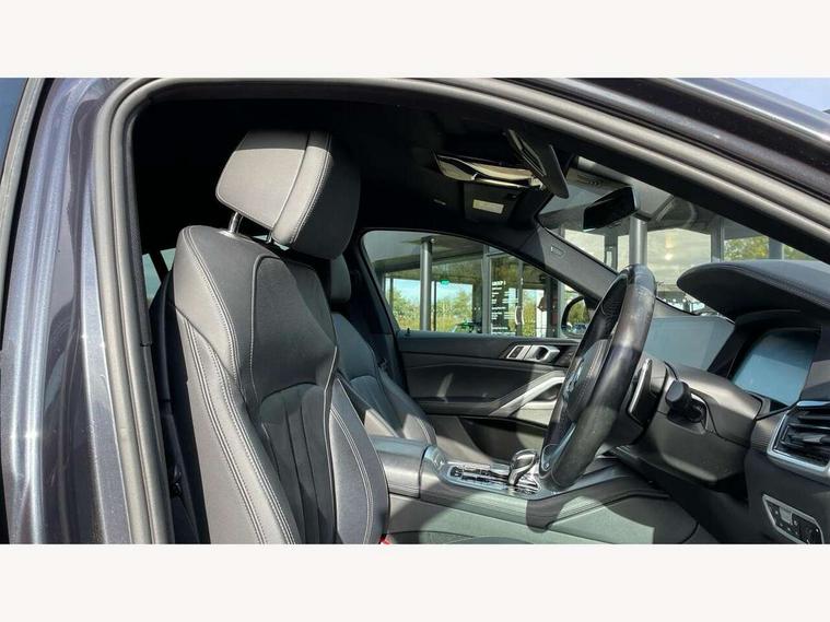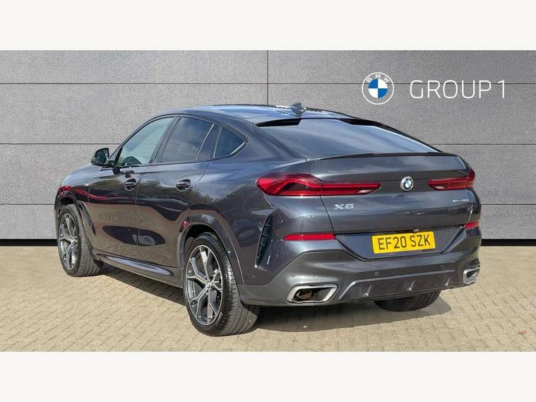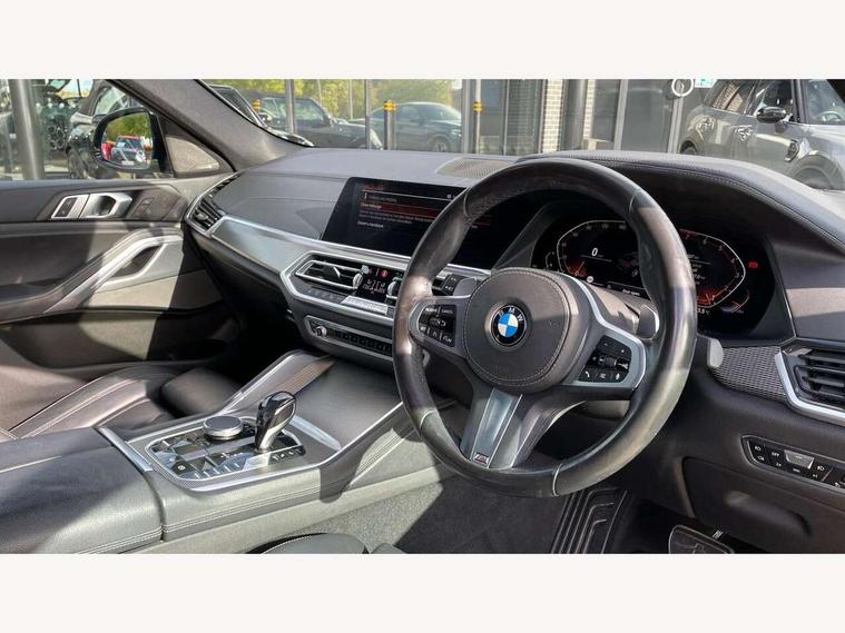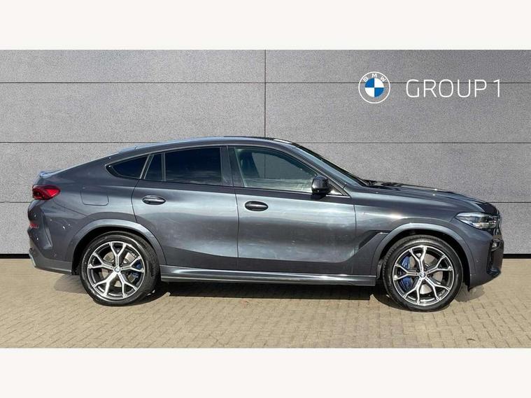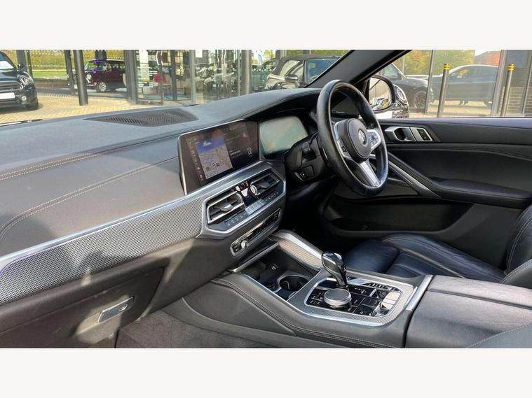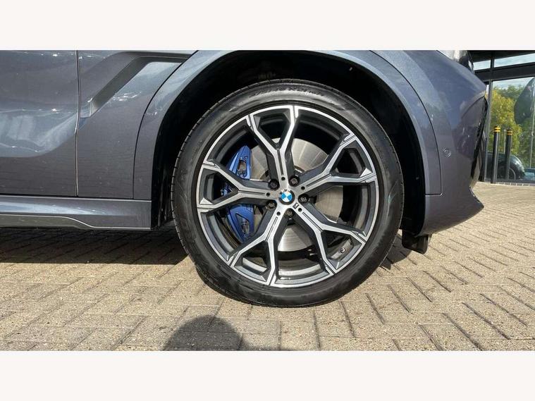 50GB hard disc drive (HDD) memory, Active guard plus, Attentiveness assist, Automatic tailgate with top hinged section open and manual bottom hinged section, BMW ConnectedDrive online services, BMW digital live cockpit professional - 12.3" digital instrument panel and 12.3" CID, with touch/voice command, BMW legal emergency call, BMW Teleservices, Brake force display, Brake pad wear indicator warning light, Enhanced bluetooth hands free facility with Telephony wireless charging, Front/rear park distance control, iDrive touch controller with shortcut buttons, Lights on warning, Oil sensor for level and grade, On board computer inc. average speed, fuel consumption, liquid crystal Info display, journey computer, outside temperature display, personal profile, Parking assistant with ultrasound based assistance system, reversing assistant, lateral parking aid and rear view camera, Service interval indicator, Speed limit info display, Wi-Fi hotspot, Double VANOS, Double wishbone front axle, Drive performance control with ECO PRO comfort + sport mode, Eight speed steptronic sport automatic transmission and gearshift paddles on the steering wheel, High precision injection, Petrol Particulate Filter, Safety battery terminal clamp, Twin scroll turbocharger with Valvetronic, DAB Tuner enables digital radio reception, Favourite buttons, Gesture control for infotainment system, Hi-Fi loudspeaker system, USB connection, USB type A 1.5A in cupholder, USB Type C 3A in centre armrest, Active Air Stream kidney grille with high-gloss chrome, Adaptive air flap control bar in high-gloss black, Automatically dimming rear view mirror, Body colour bumpers, Body colour door handles, Dynamic brake lights with LED technology, Exhaust tailpipes - single, left and right with Chrome finisher, Follow me home headlight function, Front and rear electric windows with open and close fingertip control, anti trap facility and comfort closing, Heated windscreen washer jets, High beam assistant, High gloss black outer and central air intakes on front bumper with pearlescent chrome finish, High gloss black Side elements, LED daytime running lights, LED fog lights, LED rear lights, M aerodynamic body styling, M designation on left and right front side panels, M Sport exhaust system, Rain sensor with automatic headlight activation and windscreen wiper control, Satin aluminium side window graphic, Third brake light in rear spoiler, Welcome light carpet, X6 on left tailgate, xDrive designation on right tailgate, 12V - Power sockets with 2x centre console and 1x luggage compartment, 40:20:40 split folding rear seats, Ambient interior lighting with 6 pre-designed selectable lights including dynamic function, Centre and rear interior light, Child seat ISOFIX attachment with rear outer seats includes top tether, Compartment in front of cupholder, Electrical steering column with adjustable height and length with activation and control on the steering column, Foldable rear centre armrest with 2 cupholders and storage compartment, Front and rear cupholders x 2, Front and rear door pockets, Front and rear door sill inlays with illuminated BMW M designation, Front and rear side armrest integrated into door trim, Front footwell lights, Front reading lights, Light inside glove compartment, Lockable glove compartment, Luggage compartment floor panel with integral storage tray, Luggage compartment lighting, M leather steering wheel, M specific key, M specific steering wheel, M specific velour floor mats, Make-up mirror lights, Multifunction controls for leather steering wheel, Multifunctional hooks, Seat back with flap pocket, Storage tray and compartment with cover in centre console, Sunvisors with illuminated vanity mirrors, Toolkit located in luggage compartment, Connected Package Professional - X6, Expanded exterior mirror pack - X6/X6 M, Non-smokers pack - X6, 3 rear seatbelts, Airbags - driver/front passenger, rear and side, first and second row seats head airbags, front passenger seat airbag deactivation + knee airbag, Anti-lock braking system (ABS), Automatic Stability Control (ASC), Brake drying, Brake energy regeneration, Brake fade compensation, Braking pre-tensioning, Cornering brake control (CBC), Crash sensor activating central locking release, hazard warning lights, fuel cut off, interior lighting + activation of safety battery terminal clamp, Deformation zones - front and rear with door reinforcements and bumpers up to 2.5 mph, DSC - Dynamic Stability Control, Dynamic brake control, Dynamic Traction Control - DTC, Electromechanical parking brake with automatic drive away release and auto hold function, Electronic brake force distribution, Front and rear seatbelts with seatbelt stopper, seatbelt tensioner for front and outer rear seats and belt force limiter, Front head restraints with anti-whiplash, Hill start assistant, Integrated brake system, M Sport braking system in blue high gloss + blue painted brake calipers with M designation, Mechanical child proof lock on rear doors, Passive protection for pedestrians, Seat occupancy detection for driver and passenger side, Side impact protection, Two tone horn, Tyre pressure monitoring system, Ventilated front and rear disc brakes, Warning triangle and first aid kit, Closing system with central locking, Driver and front passenger door centre lock switch, Locking wheel bolts, Thatcham 1 alarm system with remote control and engine immobiliser, Start/stop toggle diamond shaped trim finisher in pearl chrome,
