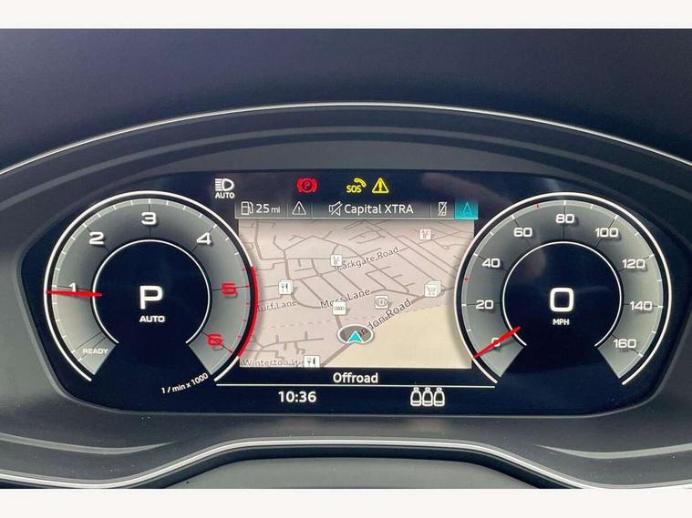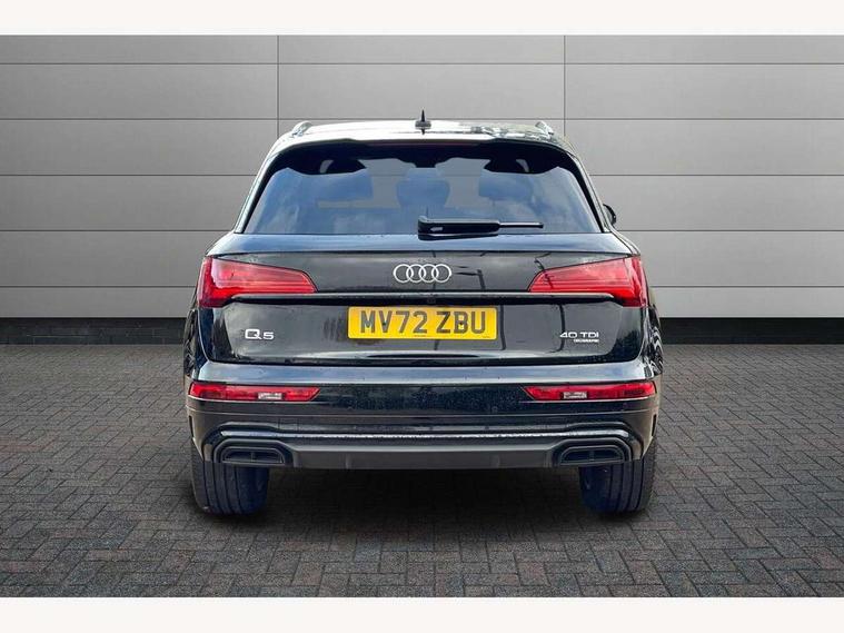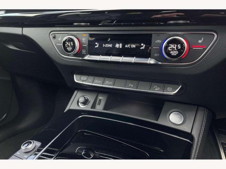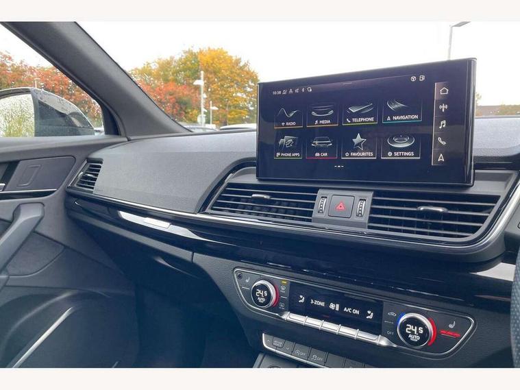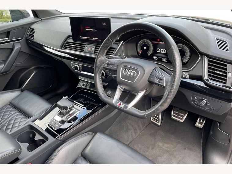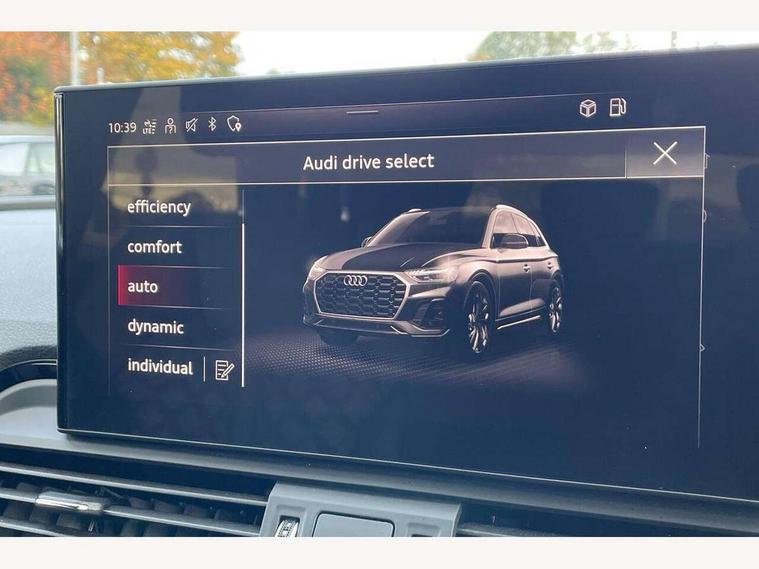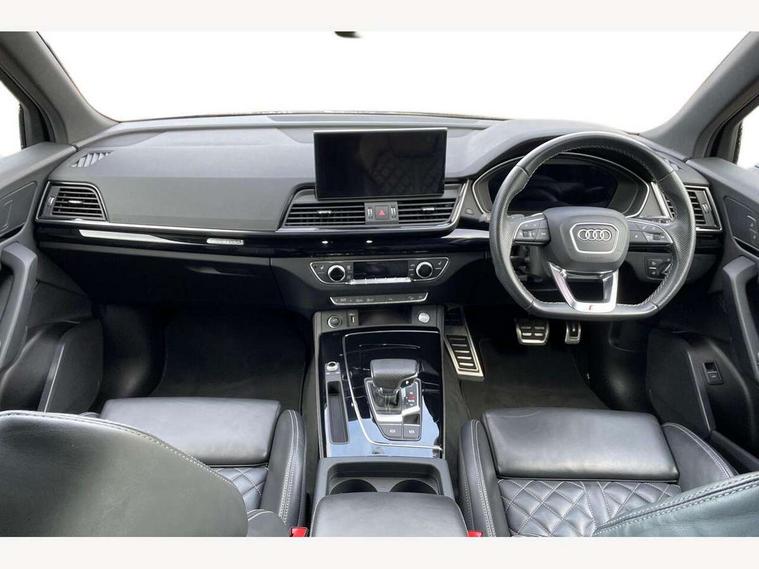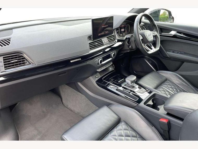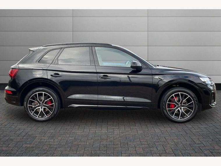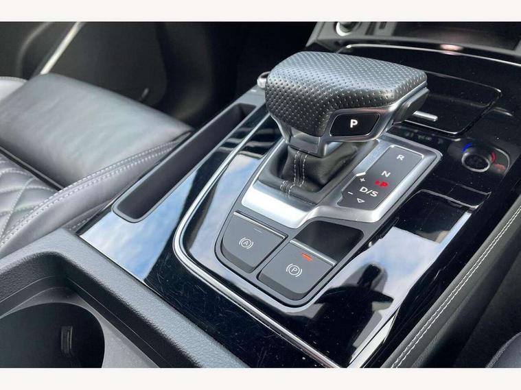 Audi connect safety and service (e-call), Audi connect with Amazon Alexa Integration, Audi drive select, Audi virtual cockpit plus with 12.3" screen and three different layout designs, Audi wireless smartphone interface, Automatic start-stop system with coasting functionality and efficiency programme, Bluetooth interface, Electro - mechanical power assisted steering, MMI navigation plus with 10.1" touch screen, Power tailgate, Reversing camera, Service interval indicator, Voice control system with Audi hotword activation "Hey Audi", Diesel particulate filter, Quattro on demand, S line sports suspension, 2 x USB charging port with aux input socket, DAB Digital radio, Acoustic windscreen, Audi matrix LED headlights with dynamic front and rear indicators, Audi rings at front and rear in black, Audi rings decal on rear doors, Auto dimming door mirrors, Auto dimming rear view mirror, Automatic headlights and windscreen wipers, Black door mirrors, Black roof rails, Body colour bumpers, Body colour underbody protection, Chrome plated exhaust trims, Daytime running lights, Door sills in Selenite silver, Electric adjustable/heated/folding door mirrors, Front air inlet surrounds in titanium black, Front and rear electric windows, Headlight washers, High gloss black B pillar trims and triangular rear door trim, High level LED brake light, Rear chrome trim strip below lights, Rear privacy glass and rear side windows, Rear side wing doors, Rear wiper, Roof bars, S Line rear spoiler, 3 rear headrests, 4 way electric lumbar support for driver and front passenger, 40:20:40 split folding 3 rear bench seat in 2nd row with rear centre armrest, Black cloth headlining, Comfort front centre armrest, Contrast stitching on seats, steering wheel and gear lever gaiter, Deluxe 3 zone electronic climate control, Electrically adjustable front seats, Fine Nappa leather upholstery with diamond pattern contrast stitching + front sport seats with S embossed logo, Front/rear floor mats, Gear lever in black leather, Heated front seats, Height adjustable front head restraints, Height/reach adjustable steering column, Illuminated door sill trims with S logo, ISOFIX child seat mounting and top tether, Rear seat bench plus, Removable luggage compartment floor, Single front passenger seat, Stainless steel pedals, Sunvisors with vanity mirrors, Black styling package - Q5 Edition 1, Extended interior upholstery pack - Q5, Extended LED Interior multi coloured Lighting Pack - Q5, 3 point seatbelts on all seats, 6 airbags - Driver, front passenger, curtain and side airbags, Electrically operated child locks on rear doors, Electromechanical parking brake, Electronic stabilisation control including ABS, ASR and EDL, Front and rear brake calipers painted in red, Front passenger airbag deactivation, Hill descent control, Hill hold assist, Multi collision brake assist, Pop-up bonnet for pedestrian protection, Pre sense city, Seat belt force limiter, Seatbelt monitoring, Tyre pressure warning, Warning triangle and first aid kit, Anti theft alarm, Anti-theft wheel bolts, Keyless Go access/ignition system, Remote central locking, Piano black finish inlay,