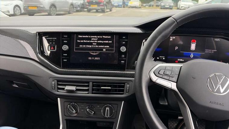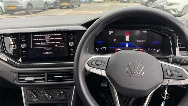 Advanced driver attention and drowsiness monitor, Bluetooth mobile phone interface, Dynamic road sign display, Emergency call service, Multifunction front facing camera for distance control, Park distance control, Power assisted speed sensitive steering, Predictive adaptive cruise control without follow-to-stop and speed limiter, Preparation for navigation system with media and internet package, Preparation for We connect and We connect plus, Rear view camera, Speedo and rev counter, electronic odometer, trip, service interval display and exterior temperature gauge, Standard rear axle, Travel Assist - Lane keeping system and traffic jam assist, Travel assist including emergency assist, Trip computer, Warning signal and warning light for front and rear seatbelts not fastened, Washer fluid level indicator, Wireless app connect, Front wheel drive, Rear shock absorpion, Start-stop system with battery regeneration (recuperation - energy recovery during braking), DAB Digital radio, Diversity antenna for FM reception, Front and rear 6 speakers, Automatic dimming interior rear view mirror, Automatic headlight control with LED separate daytime running lights with coming/leaving home function, Body colour bumpers with chrome inserts, Body colour door handles, Body colour door mirrors, Electric front windows, Engine badge deletion, Headlight range adjustment, Heat insulating and laminated safety glass windshield, LED Headlights, LED rear combination lamps, Power folding adjustable/heated exterior mirrors and front passenger exterior mirror lowering function, Rain sensor, Rear electric windows, Rear fog light, Rear side wing doors, Rear tinted glass from B-pillar backwards approx 65% tinted, Rear windscreen washer and wiper with interval delay, Third brake light, 12V power socket in centre console, 2 front and 2 rear reading lights with switch off delay and dimmer, 2 USB-C ports in the front, 2 USB-C charging sockets on the center console in the rear, 3 rear head restraints, 60/40 split folding rear seat and rear seat bench not split, Ceramique roof lining, Chrome plated radiator grille inserts, air vent surrounds and light switch surrounds, Door and side trim panel, Driver and front passenger seat height adjustment, Driver/passenger sunvisors with illuminated vanity mirrors, Front centre armrest, Front seat backrest storage pockets, Front standard seats, Handbrake lever handle in leather, Hartley/Thomas cloth upholstery, Headliner in recycled material, Isofix child seat preparation easy-fit (for two outer rear seats, and front passenger seat) compatible with I-size, Leather trimmed gear knob, Luggage compartment cover, Luggage compartment lighting, Removable luggage compartment floor, Single front passenger seat, Standard climatic zones, Standard pedal cluster, Three spoke leather wrapped multifunction steering wheel with shifting paddles, Light and vision pack - Polo, 3 point height adj front seatbelts + pretensioners, 3 point seat belt for centre rear seat, 3 point seatbelts, outer rear with ECE lable, ABS, Driver and front passenger airbag with front passenger airbag deactivation, Drivers and front passengers safety optimised head restraints, ESC (Electronic stability control) + EDL (Electronic Differntial lock) and ASR (Traction control), Extended and predictive pedestrian/ cyclist protection, Front assist with autonomous emergency braking (for Adaptive Cruise Control ACC up to 130 mph), Front curtain and side airbags with center airbag, Front disc brakes, Hill hold control, Manual child lock in rear doors, Rear drum brakes, Single tone horn, Tyre pressure loss indicator, Alarm with interior protection, Anti-theft alarm system with interior monitoring, backup horn, and towing protection, Anti-theft wheel bolts, Electronic engine immobiliser, Lava stone black gloss/matt decorative inserts in dash and front door panels, 16" Torsby alloy wheels, Low rolling resistance tyres,