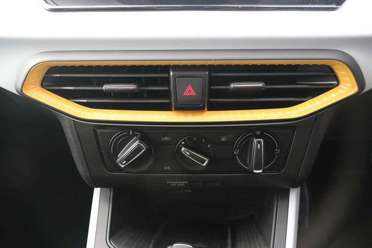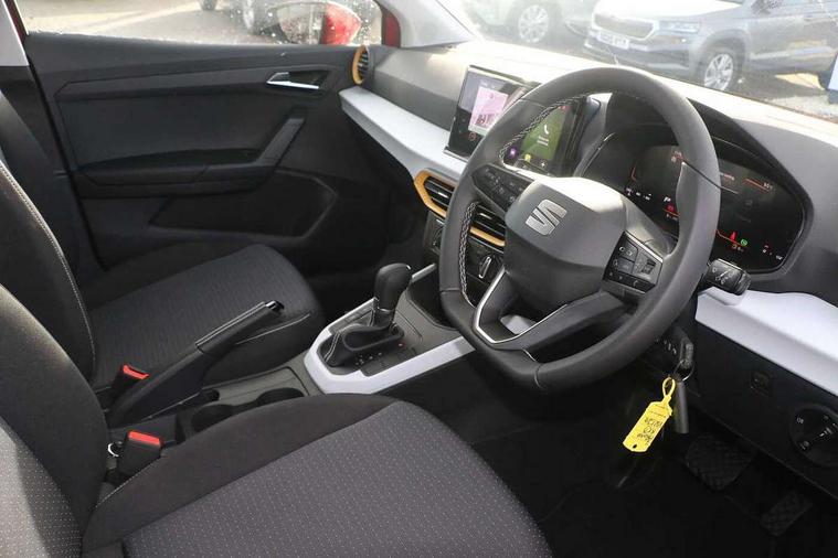 'Lights On' Reminder warning buzzer, 8" Digital cockpit, Cruise control and speed limiter, Digital clock, E-call, Electric speed sensitive power steering, Full link smartphone integration with mirror link, wireless apple carplay, Google android auto + USB Type C cable for apple and android devices, Lane keeping system, Low fuel warning light, Outside temperature display, RPM counter, Trip computer, Wireless phone charger, 6 speakers, 9.2" colour touchscreen with navigation system, voice control and USB port (type c), Bluetooth interface for hands free and audio streaming, DAB digital radio and AM/FM radio, Steering wheel mounted audio controls, Anti theft roof antenna, Automatic activation of hazard warning lights, Black roof rails and window surrounds, Body coloured bumpers, Body coloured door handle inserts, Body coloured door mirrors, Dimming rear view mirror, ECO LED automatic headlights and LED daytime running lights, Electric adjustable door mirrors, Electric front/rear windows, Hidden exhaust pipe, Licence plate lights, Protective side mouldings, Rain sensing wipers, Rear fog lights, Rear side wing doors, Rear spoiler, Rear window wash/wipe, Third brake light, Visible VIN plate, 2 cupholders, 3 seat bench in 2nd row, 60/40 split folding rear seat, Air conditioning, Cloth upholstery, Double boot floor, Driver sunvisor with covered mirror + card holder, Dust/pollen filter, Gear shift indicator, Grey interior roof, Height adjustable front seats, Height/reach adjustable steering column, Illuminated boot, Instrument lighting with brightness control, ISOFIX points in outer rear seats with top tether anchorage points, Leather steering wheel/gear knob/handbrake, Passenger sunvisor with vanity mirror, Potentiometer, Single front passenger seat, Two front and three rear height adjustable headrests, Interior chrome pack - Arona, Safe and driving pack (S) - Arona, 3 point seatbelts on all rear seats, ABS, Active front headrests, Child locks on rear doors, Driver and front passenger airbags with front passenger airbag de activation, front side and curtain airbags, Emergency Brake Assist (EBA) and front assist, Forward collision warning and autonomous emergency braking, Front and rear seatbelt reminder, Hill hold control, Multi-Collision braking, Tiredness recognition system, Traction control, Tyre pressure monitoring system, Deadlock, Electronic engine immobiliser, Locking wheel bolts, Remote central locking, Titan black dashboard, 17" Dynamic machined alloy wheels,