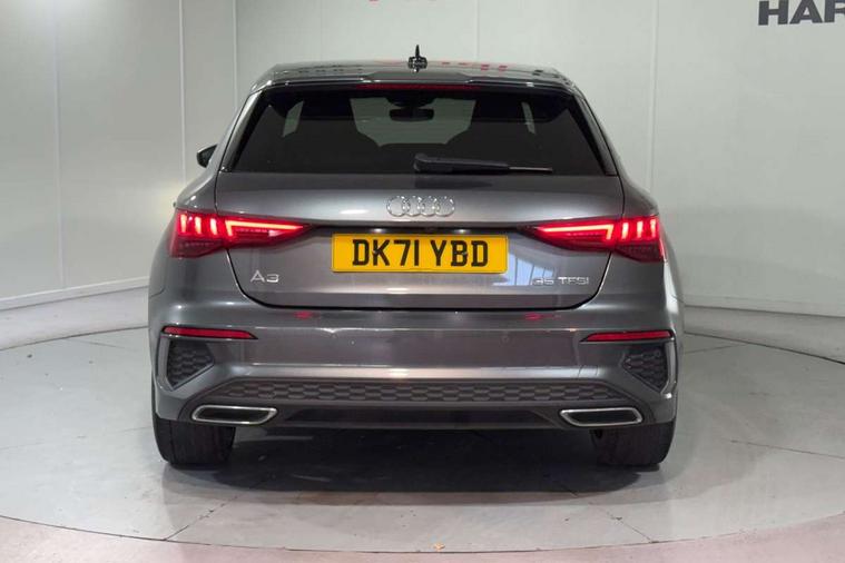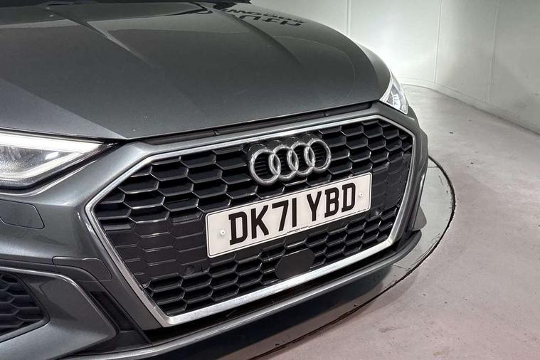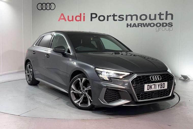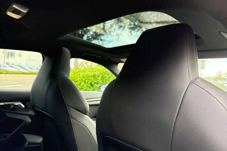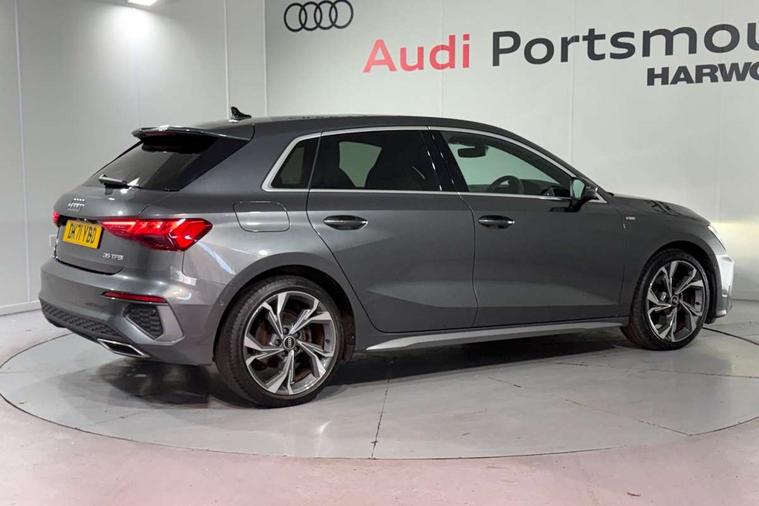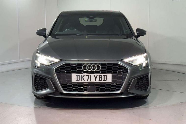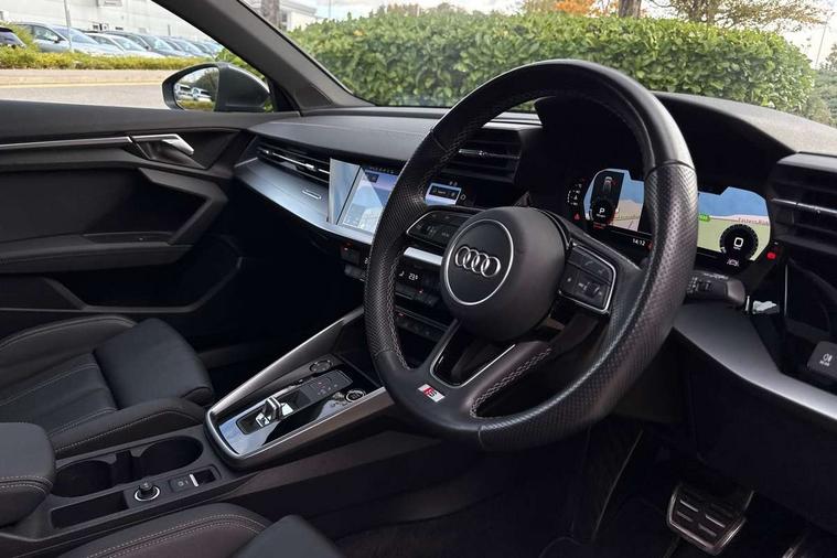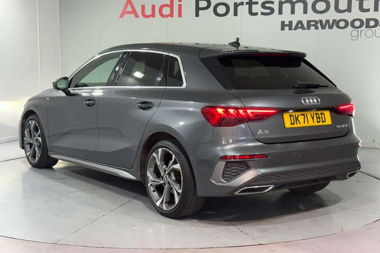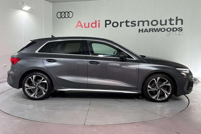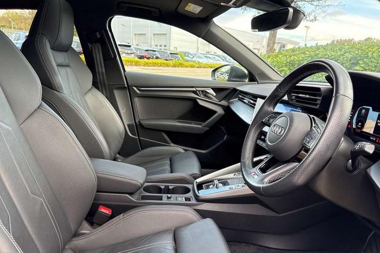 Audi connect emergency call and service, Audi drive select (Auto, Comfort, Dynamic, Efficiency and Individual), Audi smartphone interface, Audi Virtual Cockpit - 10.25" digital and colour instrument cluster, Automatic start/stop system with recuperation, Bluetooth interface, Collision avoidance assistant, Electromechanical power speed sensitive steering, Lane departure warning system, MMI Navigation Plus with high resolution 10.1" colour touch screen display, Service indicator, Trip computer, Voice control system with natural language interaction, 2xUSB-C connection with data and charging functions, 6 passive loudspeakers, DAB Digital radio, 3rd brake light, Acoustic glass windscreen, Aluminium window trim, Auto dimming frameless rear view mirror, Electrically adjustable/heated/folding/auto dimming door mirrors with integrated LED indications + kerb view function for passenger side, Front electric windows, Illuminated aluminium inserts front door sills with S logo, LED daytime running lights, LED headlights with LED rear lights and dynamic rear indicators, Light and rain sensors, Privacy glass - dark tinted rear window, rear door and side windows, Rear electric windows, Rear side air outlets in grained matt black, Rear wiper, S line bumpers, S roof spoiler, 12V socket and storage compartment in front centre console, 40/20/40 split folding rear seat bench with cupholder, Black cloth headlining, Dual zone electronic climate control, Front and rear centre armrest in leather, Front and rear headrests, Front/rear floor mats, Height and reach adjustable steering wheel, Interior lighting - glove compartment light and right hand side, Luggage compartment floor covering, Manual boot compartment lid, Manually adjustable front seats, Seat side bolsters, Stainless steel pedals and front footrest, Twin leather upholstery with front sports seats S embossed logo, Aluminium interior elements pack - A3 Sportback, S line styling pack - A3 Sportback, 3x3 point rear seat belts, Driver and front passenger airbag with passenger airbag deactivation, Electronic Stabilisation Control (ESC) including ABS, ASR and EDL, First aid kit with warning triangle and 2 safety vests, Front side airbags with head airbags and interaction airbag, Hill hold assist, Pre-sense front with pedestrian and cyclist detection, Seatbelt monitoring, Tyre pressure loss indicator, Anti theft alarm, Anti-theft wheel bolts, Electronically operated child lock, Immobiliser, Remote control central locking, Accent surfaces in the dashboard and centre console in platinum grey silk effect paint finish, Dark spectrum aluminium inlays,