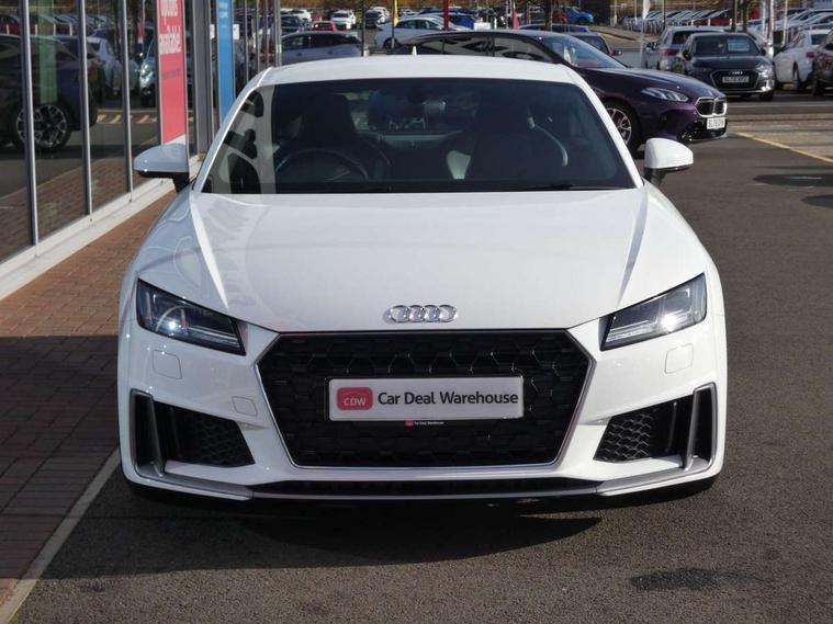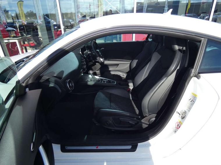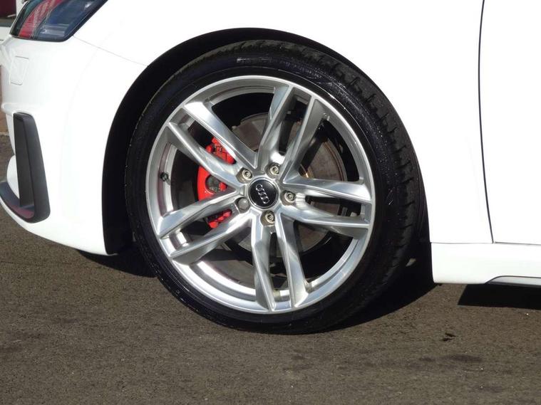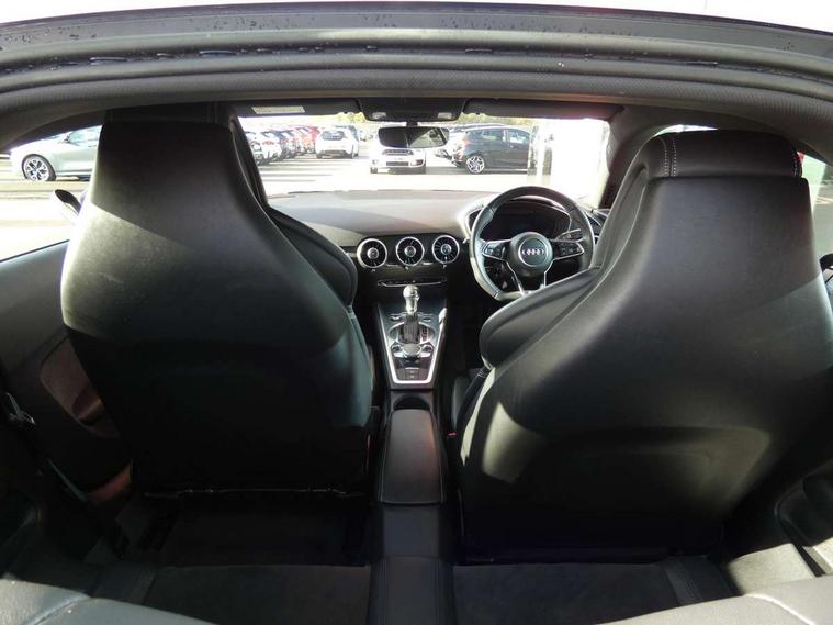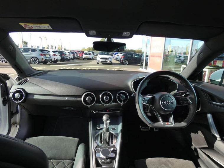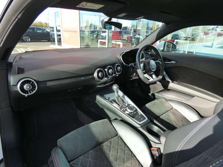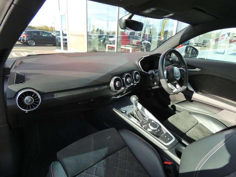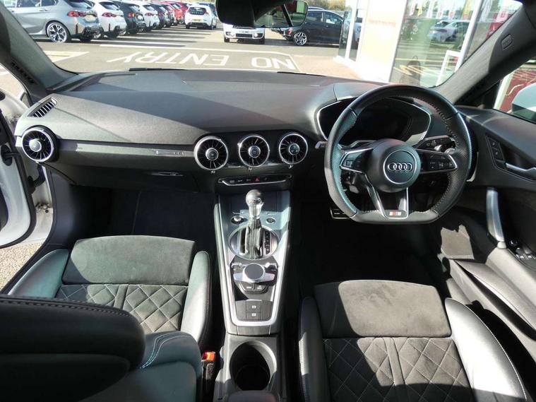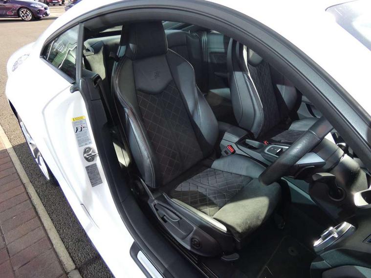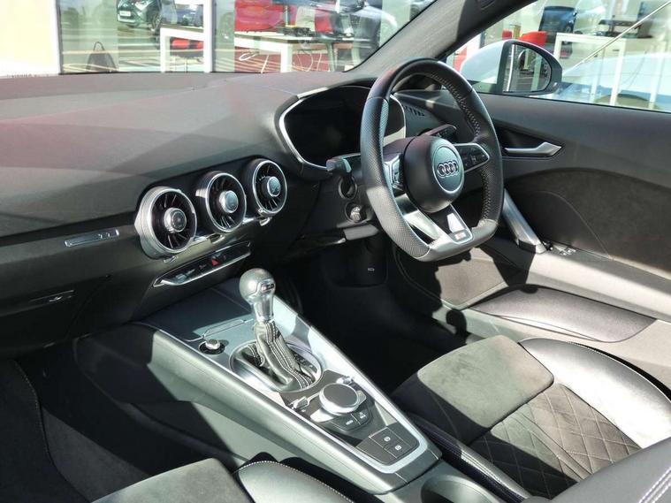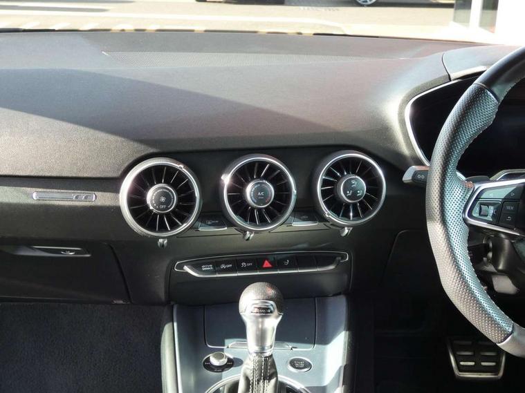 Audi drive select with 4 Pre configured modes, Audi smartphone interface, Audi virtual cockpit - 12.3" high-resolution LCD display with fully customisable instrument cluster, Cruise control + speed limiter, MMI touch panel, Mobile phone preparation with bluetooth interface, Progressive power assisted steering, Service interval indicator, Start/Stop system with energy recuperation, TP memo, S line sports suspension, AM/FM radio, Bluetooth audio streaming, DAB Digital radio, MMI Radio with CD player and SD/XC card slot, Auto dimming rear view mirror, Auto headlight range control, Body colour bumpers, Body colour electrically adjustable and heated door mirrors with built in LED side indicators, Dynamic rear indicators, Electric folding door mirrors, Electric front windows, Front fog lights, Green tinted heat insulating glass, Headlight wash system, High gloss black radiator grille, LED daytime running lights, LED headlights with LED rear lights + dynamic rear indicators, Light and rain sensors, Retractable rear spoiler, S line badges on front wings, S Line front and rear bumpers, S line rear diffuser with platinum grey insert, S line side sills, Sunband for windscreen, 12V socket, 3 spoke flat bottomed high multi-function leather sport steering wheel with gearshift paddles, 4 way electric lumbar support for driver and front passenger, Black headlining, Door sill trims with S line logo, Extended aluminium look with stainless steel pedals, Front centre armrest, Front super sports seats, Heated front seats, Height adjustable driver's seat, Height adjustable front head restraints, Height/reach adjust steering wheel, ISOFIX child seat mounting for front passenger seat with airbag deactivation, Perforated leather gearknob in black, Rear head restraints, Rear top tether child seat ISOFIX attachment, S Line badge on steering wheel, Split folding rear seat, Tool kit, Non smoking pack - TT/TT RS, 3 point front seat belts, ABS, ASR traction control, Brake energy regeneration, Curtain airbags, Driver and front passenger airbag with front passenger airbag deactivation, EDL traction control, Electromechanical parking brake, ESP, First aid kit, Front side airbags, Head airbags, Hill hold assist, Seatbelt warning, Tyre pressure warning, Warning triangle, Anti theft alarm, Anti theft wheel bolts, Immobiliser, Keyless Go, Remote central locking, Matt brushed aluminium inlays, Tyre repair kit,