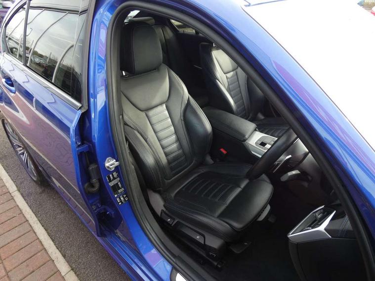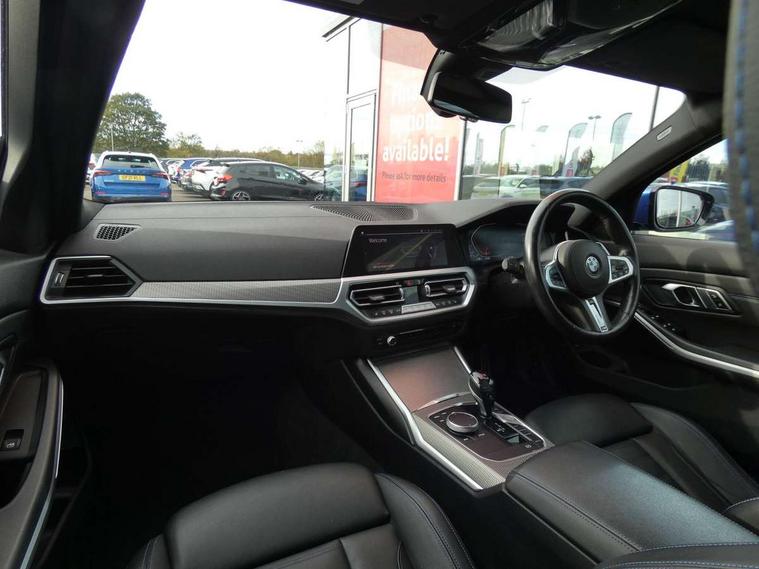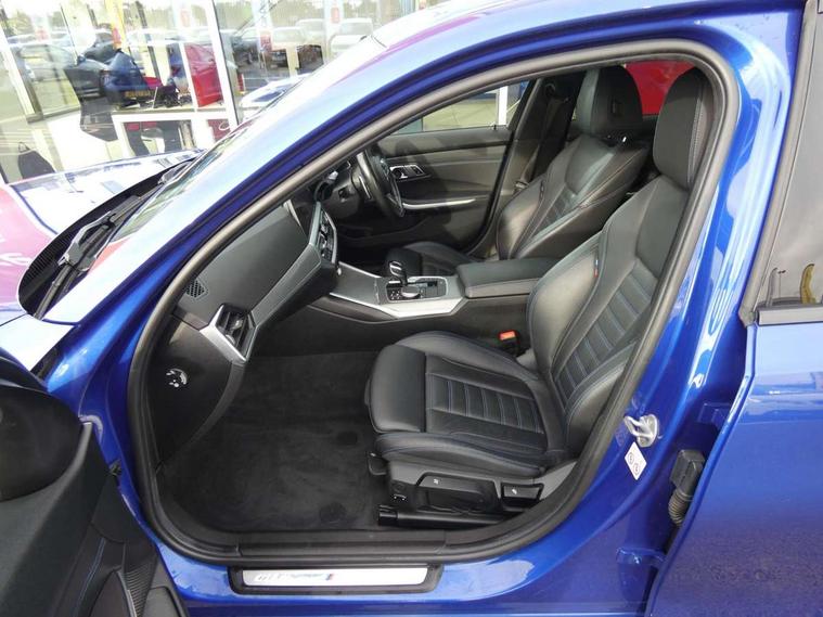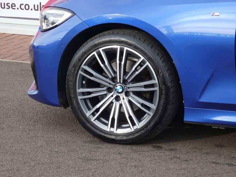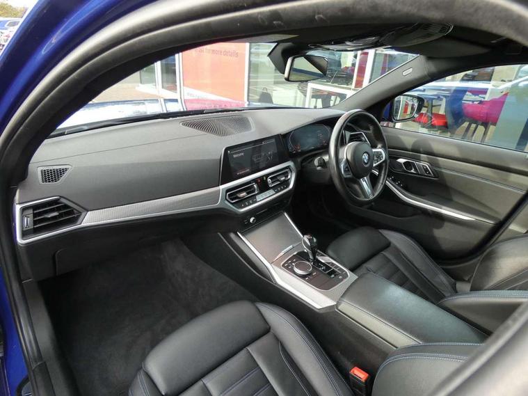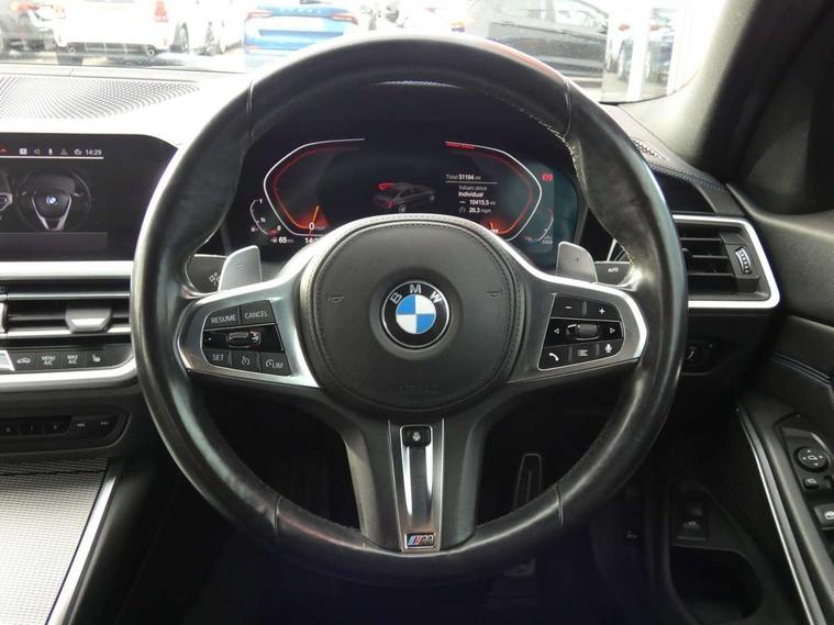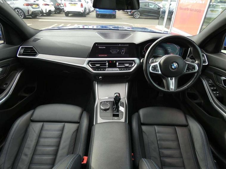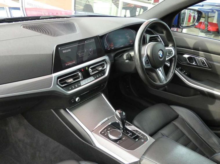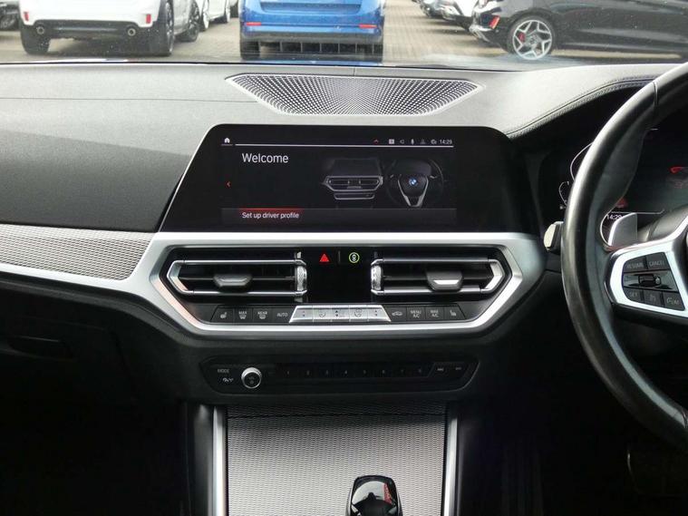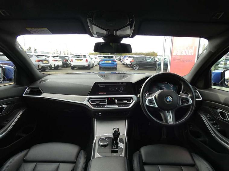 Active guard plus, Attentiveness assist, Auto start-stop, BMW Live Cockpit Professional sat nav system including 10.25" high resolution display and Intelligent Voice Assistant, BMW Online services, BMW Teleservices, Brake pad wear indicator in front and rear, Check Control warning system for monitoring of lights and door/luggage compartment open warning, Condition based service, iDrive controller on centre console, Instrument cluster with speedometer with mph readout, tachometer, fuel gauge and oil temperature gauge, Oil sensor for level and grade, On board computer - average speed+fuel consumption, service interval, clock/date, odometer/trip meter, outside temperature display and ice warning, Optimum shift indicator, Personal Profile, Variable sport steering, Battery cut-out switch, Electronic differential lock, Larger capacity fuel tank, M sport suspension, Sport automatic transmission with steering-wheel mounted gearshift paddles and launch control, Stroke dependent dampers, DAB tuner, Acoustic glazing, Active airstream chrome frame kidney grille with 8 high gloss black vertical slats, Automatic headlight beam throw control with load dependent regulating reaction, dynamic compensation of braking dive and acceleration squat, Black roof mouldings, Body colour - fuel filler flap, front and rear bumpers, door handles and mirror caps with integrated turn indicator + bottom segment in matt black, Dynamic brake lights, Extended LED headlights, Exterior mirrors - electrically folding with anti-dazzle, Front and rear bumper system with replaceable deformation elements, Front and rear electric windows with open and close fingertip control, anti trap facility and comfort closing, Front black door sill finishers with BMW designation, Green tinted heat protection glazing, High gloss shadow line exterior trim, Interior rear view electrochromatic mirror with automatic anti dazzle function, LED front fog lights, Left and right split exhaust tailpipes, Lightweight engineering, M aerodynamic body styling, M designation on left and right front side panels, M designation side badges, Matt black exterior B pillar, Model designation on right side of tailgate, Rain sensor with automatic headlight activation, Shark fin antenna, Two part LED tailights in L-shape with components in smoked glass, brake light, LED turn indicator and rear fog light, Visible VIN plate, Welcome lights in interior and door handle area, Windscreen wipers with integrated washing jets, 12V power socket in front storage compartment, 2 front cupholder in centre console with clamping elements and matt black inlay, 3 rear seats with non folding headrests with 3 point seat belts, 3 spoke M leather steering wheel, 4 pieces lashing eyelets in luggage compartment, 40:20:40 split folding rear bench seat, Ambient lighting, Anthracite headlining, Armrest integrated in front and rear door trim + front centre console armrest, Centred top Luggage compartment lights, Four grab handles integrated in roof lining, Front and rear door pockets, Front and rear velour floor mats, Front head restraints, Front sport seats, Heated driver and front passenger seats, Height adjustable mechanically and infinitely variable steering column, Illuminated glove compartment with separate small compartment, Interior lighting - front centre over interior mirror with soft light, rear centre and front and rear footwell lighting, Rear centre armrest with 2 cupholders, Rear centre console with storage compartment and ventilation grille, Steering column length adjustment lever, Sunvisors with vanity mirrors and ticket pocket, Three zone automatic air conditioning, Through loading system with 40/20/40 split folding rear seat, Toolkit located in luggage compartment, Connected pack professional - 3 Series Saloon/Touring, M Aerodynamics pack - 3 Series Saloon/Touring, 2 tone horn, ABS, Automatic Stability Control (ASC), BMW emergency call, Brake assist function, Brake drying, Brake energy regeneration, Braking pre-tensioning, CBC - (Cornering brake control), Child proof locking system in rear door, Child seat ISOFIX attachment rear outer seats, Crash sensor activating of airbags, Unlocking doors, hazard warning lights, fuel cut off, interior lighting+activation of safety battery terminal clamp, Driver and front passenger side airbags, integrated in the door side seat backrest bolsters for all seat variants, Driver/Front Passenger airbags, Dynamic brake control, Dynamic Traction Control - DTC, Electromechanical parking brake with automatic drive away release and auto hold function, Front passenger manual airbag deactivation, Head airbags for all 4 outer seats, Hill start assist, Seat belt security check for driver and front passenger, Side impact protection, Three 3 point seat belts on all seats including front belt stopper, pyrotechnic belt tensioners and belt force limiters, Tyre pressure monitoring with three level warning strategy, Variable torque distribution, Ventilated front and rear disc brakes, Warning triangle and first aid kit, Alarm system (Thatcham 1) with remote control and electronic engine immobiliser, Central locking switch for all doors, fuel filler cap and luggage compartment, Remote control with integrated key one button open/close vehicle and windows, sole opening of the luggage compartment lid and panic mode, Selectable automatic lock when driving away, Start/stop button with Comfort Go keyless engine start and auto Start/stop deactivation button, Vehicle key with M specific designation, Reduced rolling resistance tyres,