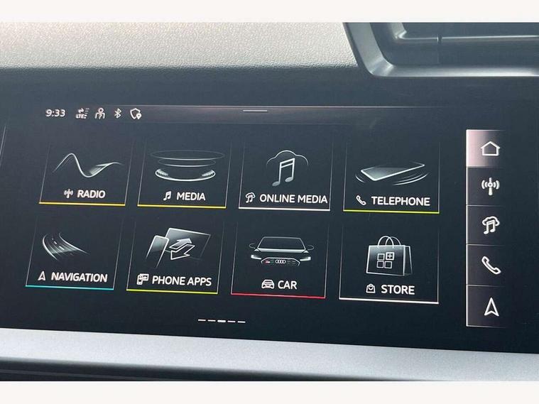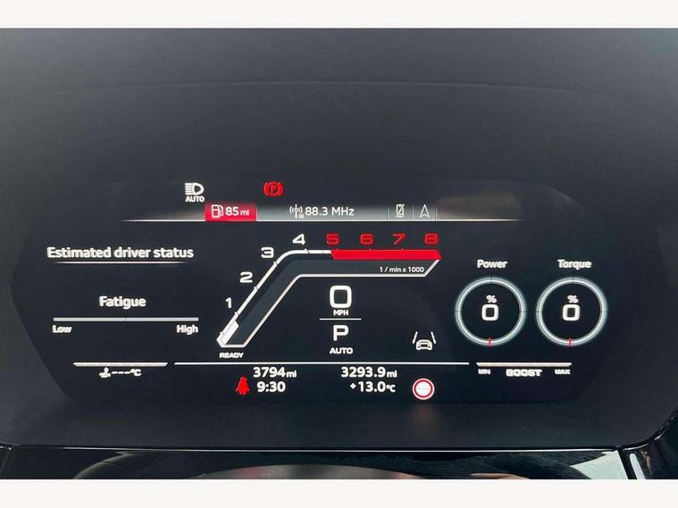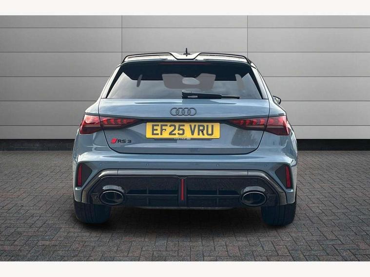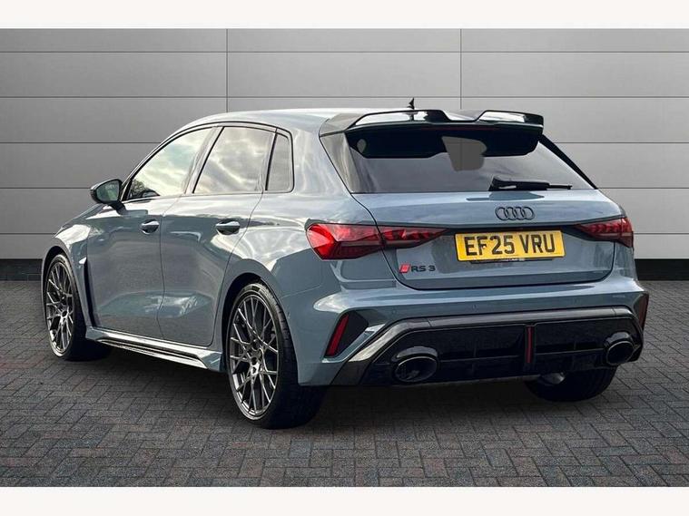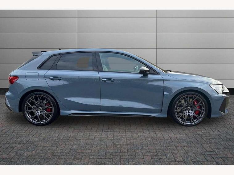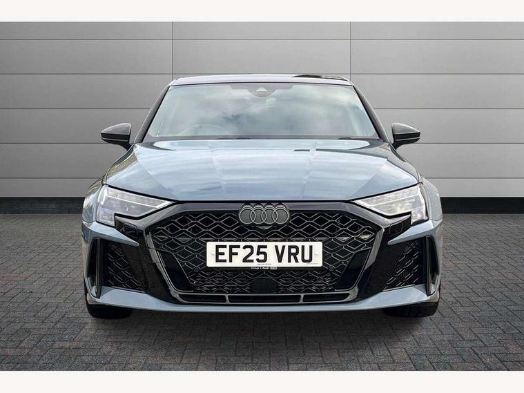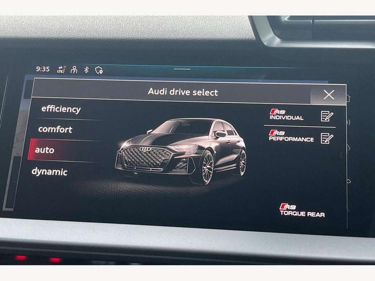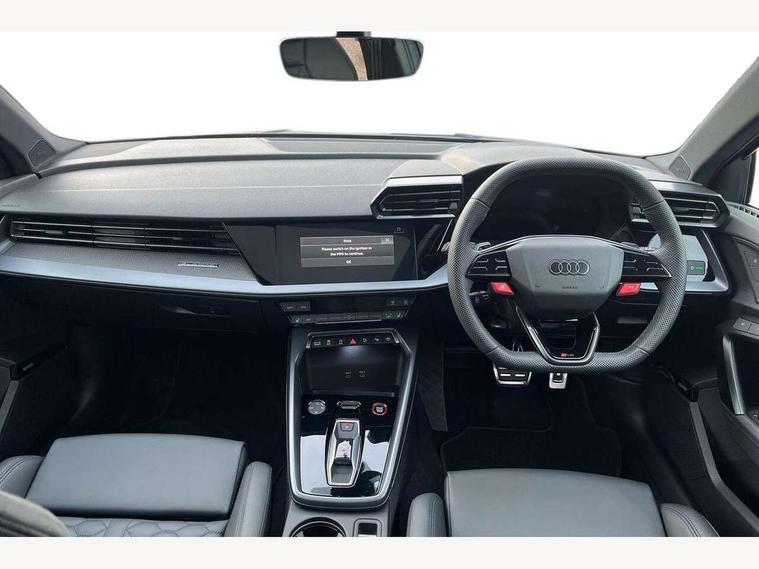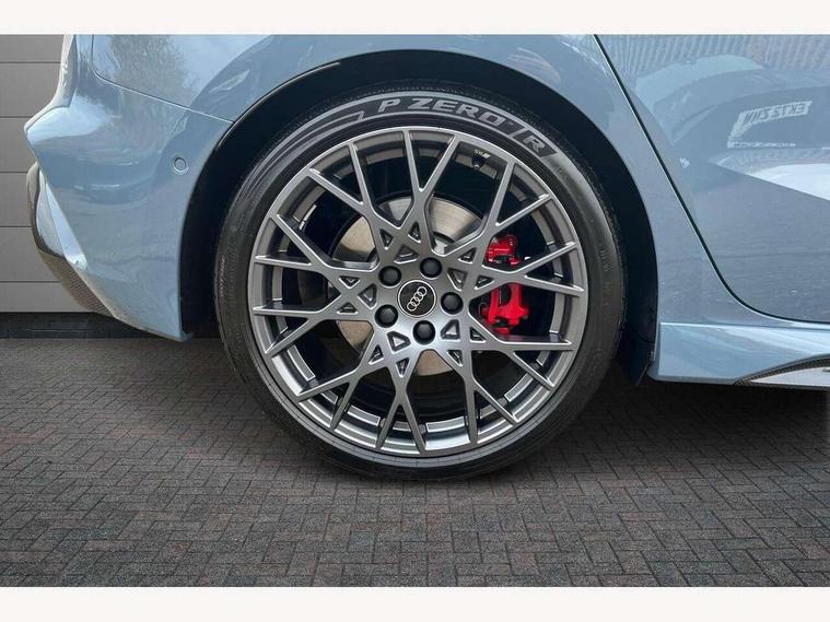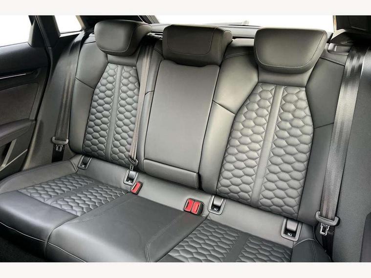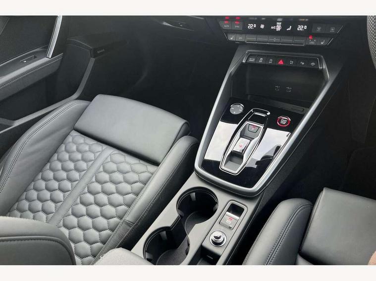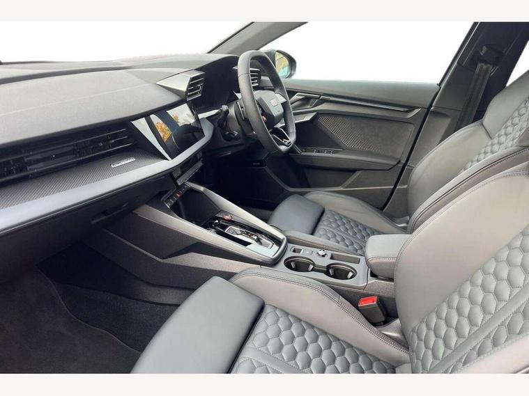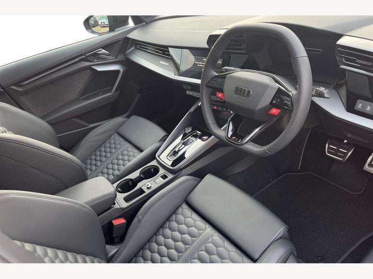 Adjustable speed limiter, Audi drive select comfort, auto, dynamic and efficiency, Audi smartphone interface with app store includes wireless Apple carplay, Android auto and Amazon alexa integration, Audi virtual cockpit plus with RS specific design and 12.3" display with additional graphic display options, Automatic start/stop system with recuperation, Bluetooth interface, Camera based traffic sign recognition, Collision avoidance assistant, Distraction and Fatigue warning, e-Call (emergency call), Lane departure warning system, MMI Navigation Plus with high resolution 10.1" colour touch screen display, Park Assist with parking system Plus, Progressive steering, RS specific driving modes - RS Individual, RS Performance and RS Torque rear, Voice control system with natural language interaction, Quattro permanent four wheel drive, Audi Phonebox light with wireless charging, DAB Digital radio, USB ports with charging function in the rear, All weather light, Audi beam LED projection of RS logo on ground as you exit, Audi darkened matrix LED headlights with dynamic light sequencing and dynamic indicator, Auto dimming frameless rear view mirror, Automatic dynamic range control, Carbon door mirror housings, Carbon fibre engine cover, Dipped beam, main beam, position light and turning light, Dynamic RS specific light sequencing of the coming home and leaving home function, Electrically adjustable/heated/folding/auto dimming door mirrors with integrated LED indications + kerb view function for passenger side, Exterior model badging, Front electric windows, Headlight cleaning system, Heat insulating glass windscreen, Intersection light, LED 3rd brake light, LED brake lights, LED rear lights with dynamic light sequencing and dynamic indicator, LED rear number plate lights, LED reverse light, LED tail lights, Light and rain sensors, Manoeuvring light, Motorway light, Privacy glass - dark tinted rear window, rear door and side windows, Rear electric windows, Rear side wing doors, Rear wiper, Roof edge spoiler in carbon, RS dual branch exhaust system with two chrome plated oval tailpipe trims, Static Cornering lights, Visually upgraded RS specific daytime running light choice of 4 digital signature in chequered flag design within the headlight, 12V socket and storage compartment in front centre console, 3 seat bench in 2nd row, 3 Spoke flat top and bottomed black leather multi function steering and gear shift paddles, 3-zone deluxe automatic air conditioning, 40/20/40 split folding rear seat bench, Black cloth headlining, Black front and rear floor mats, Front and rear headrests, Front centre armrest, Front door sill trims with RS 3 logo, Front sports seats RS embossed logo, Heated front seats, Height and reach adjustable steering wheel, Manual boot compartment lid, Manually adjustable front seats, Rear centre armrest with cupholder, Seat side bolsters, Single front passenger seat, Stainless steel pedals and front footrest in black, Vanadium look - Interior door handles, Door trim, power latching, Air vents, window controls, mirror adjust, rear door lock, Selector lever in centre console, Black Styling plus package - RS3, Extended ambient lighting package Pro with Multi-coloured contour lighting of instrument panel - RS3, RS exterior features pack in carbon and gloss black - RS3, RS sport suspension pack - RS3, Storage package - RS3 Sportback, Technology package without speed limiter - RS3, 3x3 point rear seat belts, Driver and front passenger airbag with passenger airbag deactivation, Electronic Stabilisation Control (ESC) including ABS, ASR and EDL, First aid kit with warning triangle and 2 safety vests, Hill hold assist, Pre-sense front with pedestrian and cyclist detection, RS steel brakes, Seatbelt monitoring, Tyre pressure loss indicator, Anti theft alarm, Anti-theft wheel bolts, Electronically operated child locks, Immobiliser, Remote central locking with safelock, Black dashboard, Inlays in carbon atlas structure, 19" 10 cross spoke silk matt grey alloy wheels, Tyre repair kit,