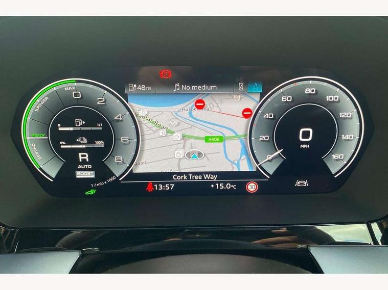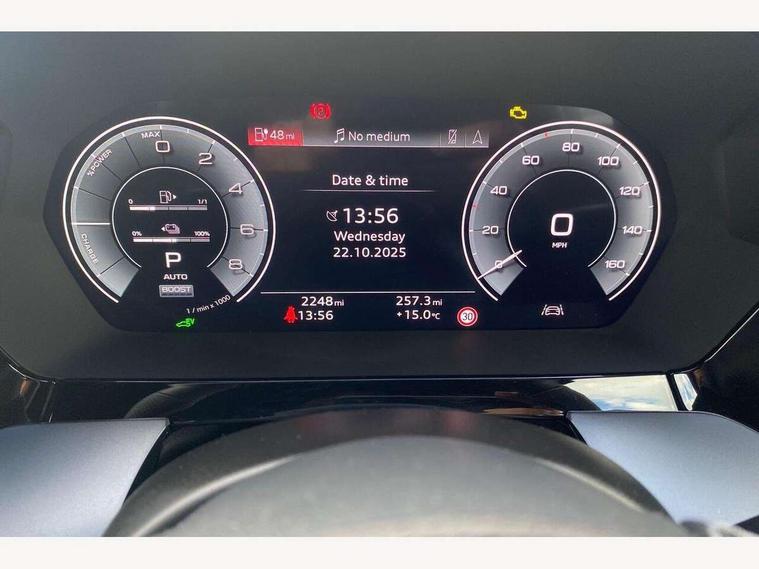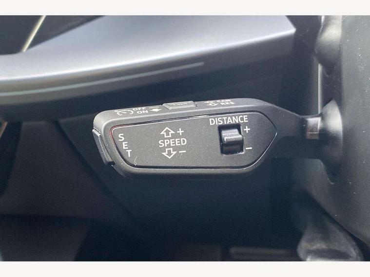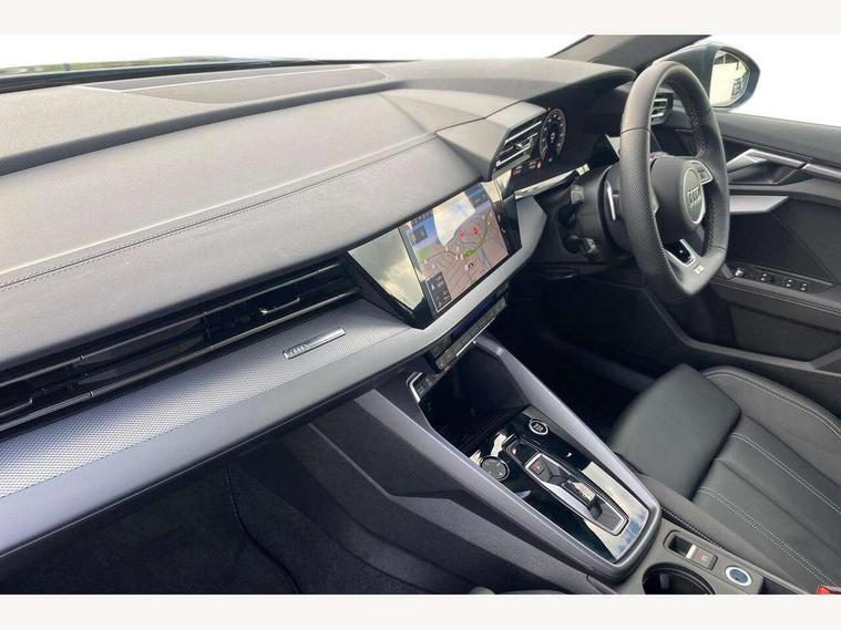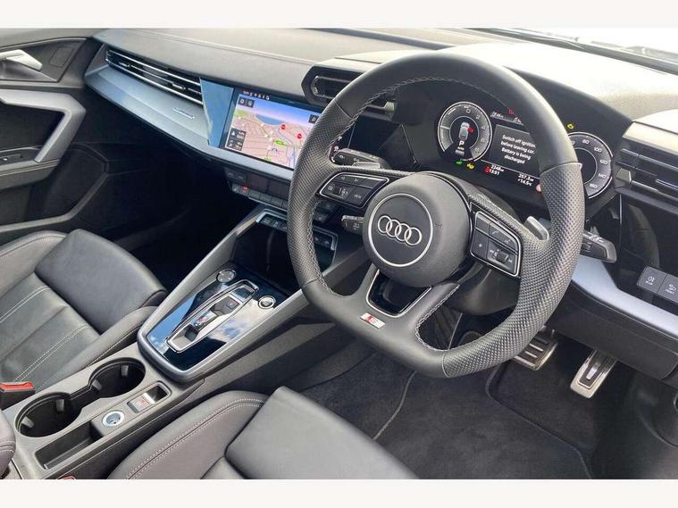 Adjustable speed limiter, Audi drive select, Audi smartphone interface with app store includes wireless Apple carplay, Android auto and Amazon alexa integration, Audi virtual cockpit plus - 12.3" full HD resolution dynamic digital instrument cluster, Automatic start/stop system with recuperation, Bluetooth interface, Camera based traffic sign recognition, Collision avoidance assistant, Cruise control, Distraction and Fatigue warning, e-Call (emergency call), Electromechanical power speed sensitive steering, Emergency assist, Lane departure warning system, MMI Navigation Plus with high resolution 10.1" colour touch screen display, Park Assist with parking system Plus, Service indicator, Trip computer, Voice control system with natural language interaction, 3 pin 10 amp domestic charging cable, CCS socket for DC charging, Charging cable for public charging, mode 3 (type 2), 32 A, Compact charging system, Industrial connector CEE 32 A, 230 V, length 1.6 m, Standard suspension, Type 2 socket for AC charging, Audi Phonebox light with wireless charging, Audi sound system - 10 loudspeakers including centre loudspeaker and subwoofer, DAB Digital radio, USB ports with charging function in the rear, Acoustic glass windscreen, All weather light, Aluminium window trim, Auto dimming frameless rear view mirror, Automatic dynamic range control, Body colour exterior mirrors, Chrome exhaust tailpipes, Dipped beam, main beam, position light and turning light, Electrically adjustable/heated/folding/auto dimming door mirrors with integrated LED indications + kerb view function for passenger side, Exterior model badging, Front and rear side air inlets in grained matt black with dark liquid chrome frame, Front electric windows, Front radiator grill in high gloss dark chrome, Heat insulating glass windscreen, Illuminated door sills with aluminium inserts at the front with S logo, Intersection light, LED 3rd brake light, LED brake lights, LED daytime running x3, LED headlights with LED rear lights and dynamic rear indicators, LED rear number plate lights, LED reverse light, LED tail lights, Light and rain sensors, Manoeuvring light, Motorway light, Privacy glass - dark tinted rear window, rear door and side windows, Rear diffuser and grill in grained matt black with inlay in dark liquid chrome, Rear electric windows, Rear side wing doors, Rear wiper, S line bumpers, S roof spoiler, Side S line emblems on front wings, Side sill trim in dark liquid chrome, Static Cornering lights, 12V socket and storage compartment in front centre console, 3 seat bench in 2nd row, 3 spoke flat bottomed leather multifunction sport steering wheel with gear shift paddles, 3-zone deluxe automatic air conditioning, 4 way electrically adjustable lumbar support for driver and front passenger, 40/20/40 split folding rear seat bench, Black cloth headlining, Black front and rear floor mats, Convenience auxiliary air conditioning, Front and rear centre armrest in artificial leather with contrasting stitching on armrests and instrument panel, Front and rear headrests, Heated front seats, Height and reach adjustable steering wheel, Manual boot compartment lid, Manually adjustable front seats, Rear centre armrest with cupholder, S badging on the steering wheel, Seat side bolsters, Single front passenger seat, Stainless steel pedals and front footrest in black, Twin leather upholstery with front sports seats S embossed logo, Aluminium interior elements pack - A3, Multi-coloured LED interior lighting package with Multi-coloured contour lighting of instrument panel - A3, 3x3 point rear seat belts, Acoustic vehicle alerting system, Driver and front passenger airbag with passenger airbag deactivation, Electronic Stabilisation Control (ESC) including ABS, ASR and EDL, First aid kit with warning triangle and 2 safety vests, Front side airbags with head airbags and interaction airbag, Hill hold assist, Pre-sense front with pedestrian and cyclist detection, Seatbelt monitoring, Tyre pressure loss indicator, Anti theft alarm, Anti-theft wheel bolts, Electronically operated child locks, Immobiliser, Remote central locking with safelock, Black dashboard, Inlay in dark aluminium spectrum, Tyre repair kit,