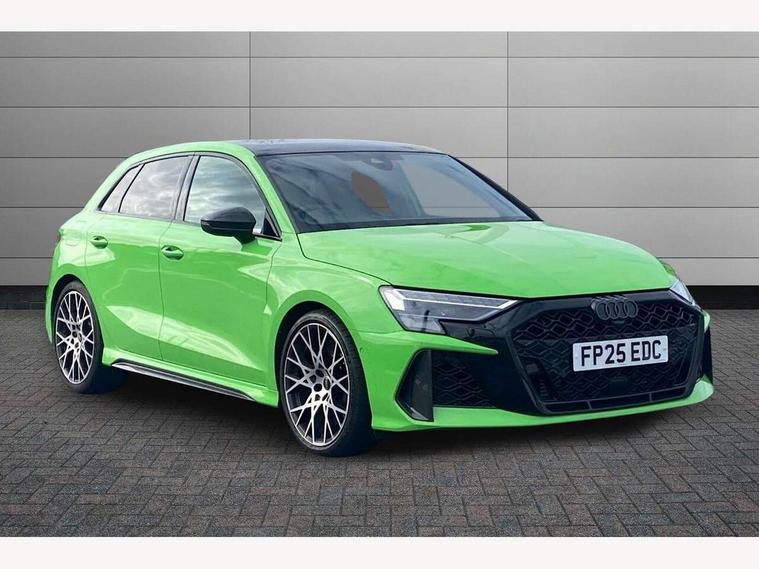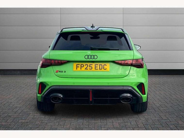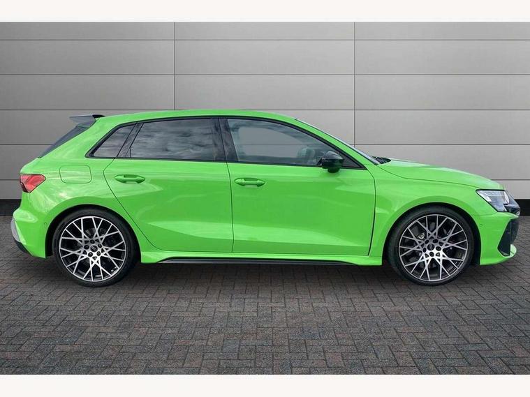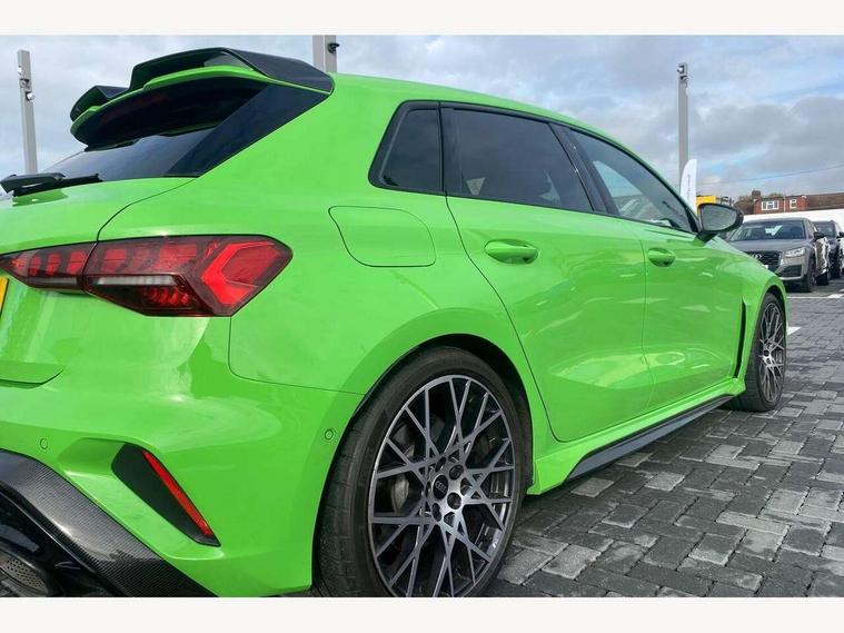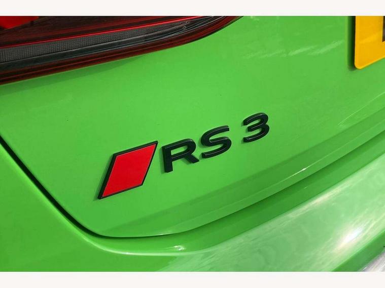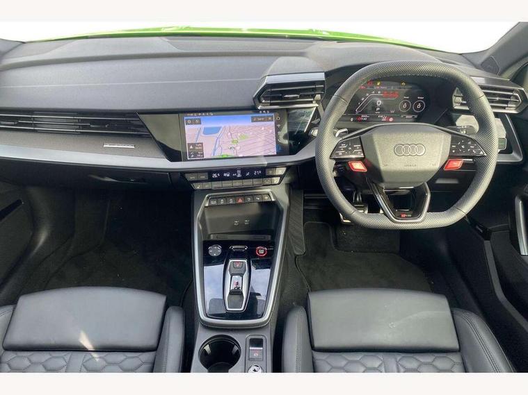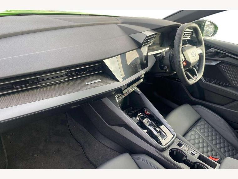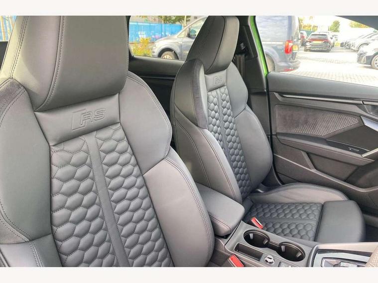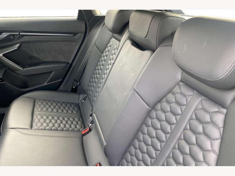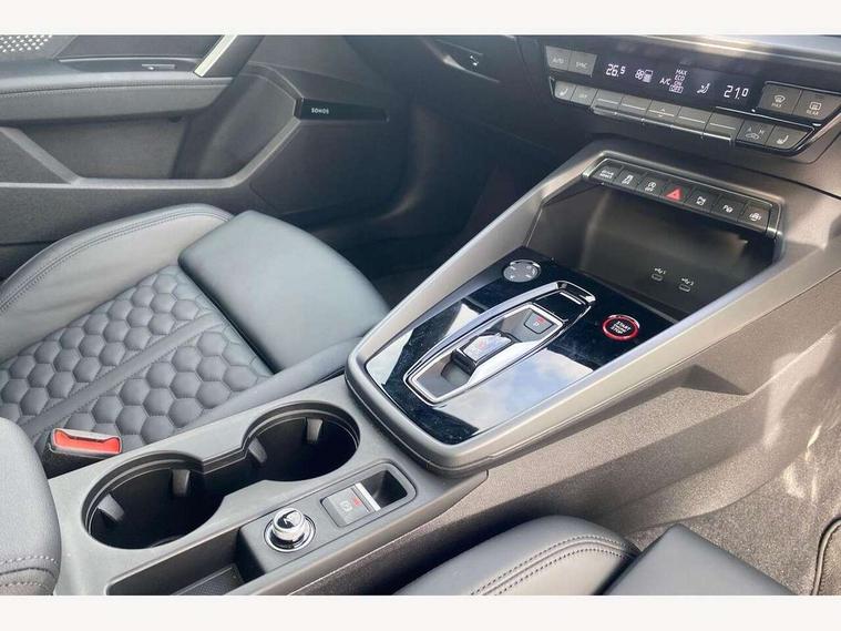 Adjustable speed limiter, Audi drive select comfort, auto, dynamic and efficiency, Audi smartphone interface with app store includes wireless Apple carplay, Android auto and Amazon alexa integration, Audi virtual cockpit plus with RS specific design and 12.3" display with additional graphic display options, Automatic start/stop system with recuperation, Bluetooth interface, Camera based traffic sign recognition, Collision avoidance assistant, Distraction and Fatigue warning, e-Call (emergency call), Lane departure warning system, MMI Navigation Plus with high resolution 10.1" colour touch screen display, Park Assist with parking system Plus, Progressive steering, RS specific driving modes - RS Individual, RS Performance and RS Torque rear, Voice control system with natural language interaction, Adaptive suspension with audi drive select, Increase of top speed to 174 mph, Quattro permanent four wheel drive, Audi Phonebox light with wireless charging, DAB Digital radio, USB ports with charging function in the rear, Audi beam LED projection of RS logo on ground as you exit, Auto dimming frameless rear view mirror, Automatic dynamic range control, Carbon door mirror housings, Carbon fibre engine cover, Dipped beam, main beam, position light and turning light, Electrically adjustable/heated/folding/auto dimming door mirrors with integrated LED indications + kerb view function for passenger side, Exterior model badging, Front electric windows, Heat insulating glass windscreen, LED 3rd brake light, LED brake lights, LED daytime running x3, LED rear number plate lights, LED reverse light, LED tail lights, Light and rain sensors, Privacy glass - dark tinted rear window, rear door and side windows, Rear electric windows, Rear side wing doors, Rear wiper, Roof edge spoiler in carbon, RS dual branch exhaust system with two chrome plated oval tailpipe trims, 12V socket and storage compartment in front centre console, 3 seat bench in 2nd row, 3 Spoke flat top and bottomed black leather multi function steering and gear shift paddles, 3-zone deluxe automatic air conditioning, 40/20/40 split folding rear seat bench, Black cloth headlining, Front and rear headrests, Front centre armrest, Front door sill trims with RS 3 logo, Front sports seats RS embossed logo, Front/rear floor mats, Heated front seats, Height and reach adjustable steering wheel, Manual boot compartment lid, Rear centre armrest with cupholder, Seat side bolsters, Single front passenger seat, Stainless steel pedals and front footrest in black, Vanadium look - Interior door handles, Door trim, power latching, Air vents, window controls, mirror adjust, rear door lock, Selector lever in centre console, Black Styling plus package - RS3, Extended ambient lighting package Pro with Multi-coloured contour lighting of instrument panel - RS3, RS exterior features pack in carbon and gloss black - RS3, RS sport suspension pack - RS3, Storage package - RS3 Sportback, 3x3 point rear seat belts, Driver and front passenger airbag with passenger airbag deactivation, Electronic Stabilisation Control (ESC) including ABS, ASR and EDL, First aid kit with warning triangle and 2 safety vests, Hill hold assist, Pre-sense front with pedestrian and cyclist detection, RS steel brakes, Seatbelt monitoring, Tyre pressure loss indicator, Anti theft alarm, Anti-theft wheel bolts, Electronically operated child locks, Inlays in carbon atlas structure, Tyre repair kit,