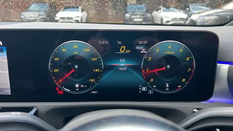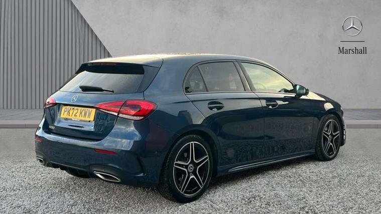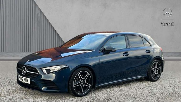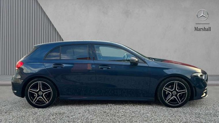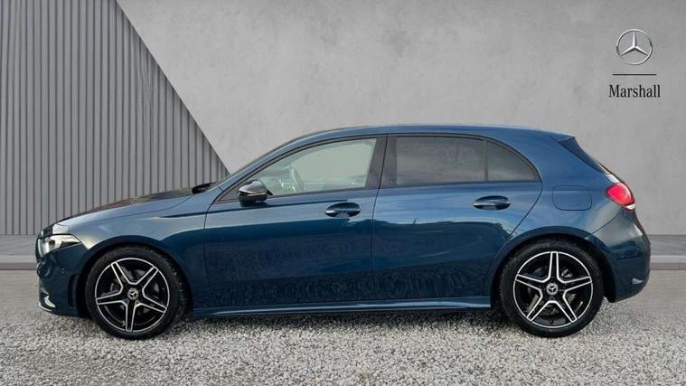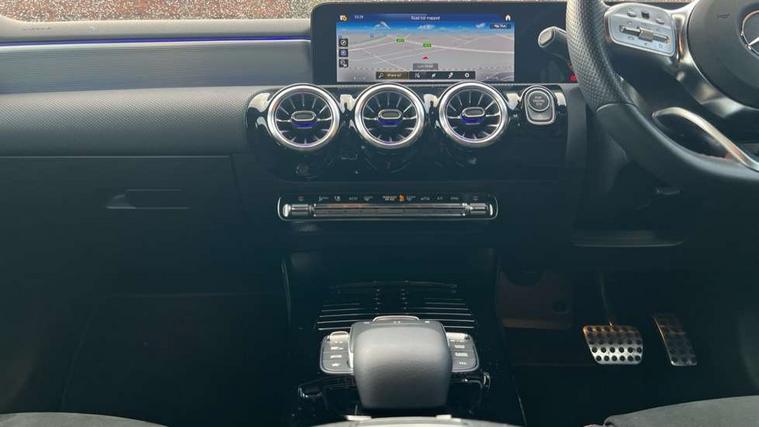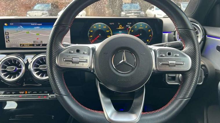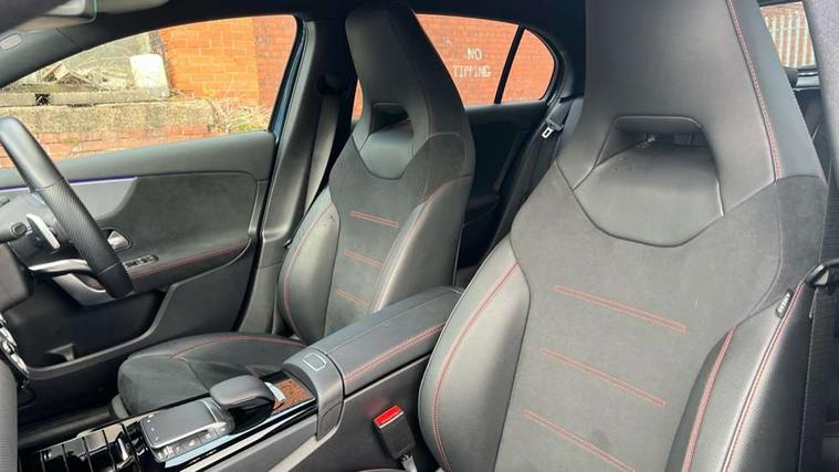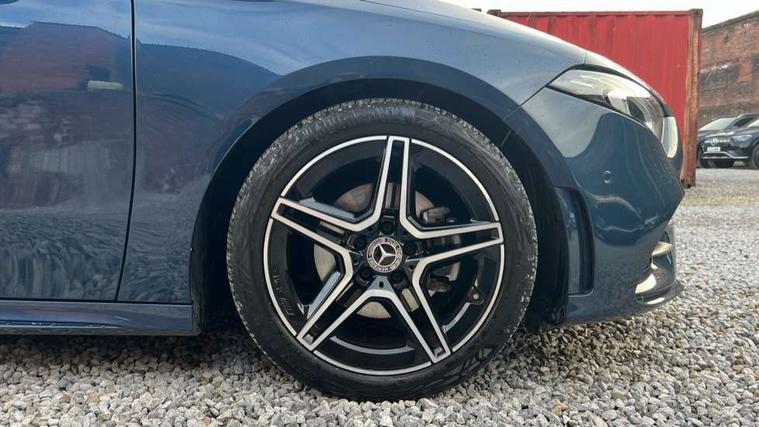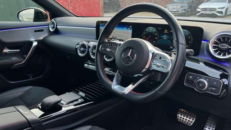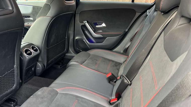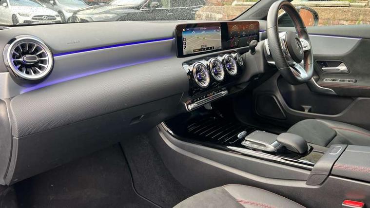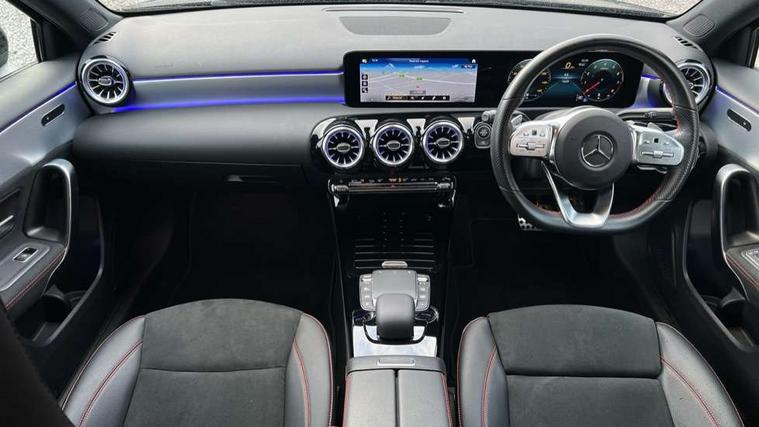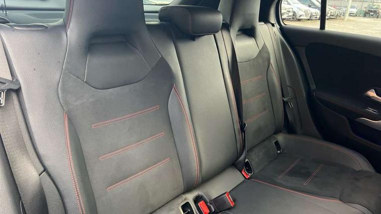 10.25" Digital instrument cluster display screen, 10.25" media display, 180 degree rear view camera with parking guidelines, Active parking assist with visual and audible warning of detected obstacles, Attention assist, Brake pad wear indicator warning light, Car wash mode, Cruise control + speed limiter, Direct steering, Dual bluetooth interfaces, DYNAMIC SELECT with a choice of driving modes (ECO, Comfort, Sport and Individual), ECO start/stop function, Fluid level warning indicator for fuel, oil, coolant and washer fluid, Hard-disk navigation, Hey Mercedes Voice activation, Lamp failure indicator, Lane keeping system, Mercedes me connect including emergency call system, accident recovery, breakdown and maintenance management, Mercedes me remote services, Outside temperature gauge, Owners manual in English, Pre-installation for private car sharing, Preinstallation for Mercedes Benz link, Service indicator (ASSYST), Smartphone integration with Apple CarPlay and Android auto, Speed limit assist, Speed sensitive power steering, Trip computer, Ultrasonic sensors positioned in the front and rear bumpers, Lowered comfort suspension, Rear axle torsion beam, 2 USB ports (type C) in rear stowage compartment and one in front of center console, 6 speakers, DAB Digital radio, MBUX multimedia system with DAB digital radio and touchpad including satellite navigation, Mercedes-Benz sound system - 100W, 4 Electric Front and Rear windows, Adaptive brake lights, AMG bodystyling - Front apron with splitter in chrome, rear apron with chrome trim and chrome visible trim elements in tailpipe, Automatic headlights, Black weather strip, Body colour bumpers, Body colour door handles with chrome inserts, Body colour side skirt, Electric adjustable and heated door mirrors with integrated LED side indicators, Exclusive diamond radiator grille, Exhaust system - Twin visible tailpipes in polished stainless steel, Headlamp assist automatic headlamp activation, Heated glass rear windscreen + timer control, LED High level third brake light, LED high performance headlamps with integrated LED daytime running lights, LED tail lamp, Privacy glass, Radio aerial, Rain sensing windscreen wipers with two sensitivity settings, Rear fog lights, Rear side wing doors, Rear wiper, 3 seat bench in 2nd row, 3 Spoke flat bottom leather multi function steering wheel with perforated leather in grip area, 40:20:40 split folding rear seats, Artico man-made leather/Microfibre Dinamica upholstery with red contrast stitching, Auto Mercedes-Benz child seat recognition sensor, Black air vents with surround in silver chrome, Black roof lining, Brushed stainless steel sports pedals with rubber studs, Controller on centre console with chrome surround, Floor mats with AMG lettering, Front centre armrest with storage compartment, Front seat backs luggage nets, Galvanished gear shift paddles on steering wheel, Heated front seats, Height/reach adjustable steering column, Illuminated Mercedes Benz lettering front door sills with changeable cover, Interior lighting - 64 colour Ambient lighting, Interior mirror with reading lamps in black and frameless, Manual height adjustable front seats, Rear head restraints, Seat occupancy sensor for front passenger seat, Single front passenger seat, Sports seats with integrated headrests, Stowage compartment in centre console with retractable cover, Sunvisors with illuminated vanity mirrors, Touchpad on center console, Twin front cupholders, Two zone thermotronic luxury automatic climate control, Light and sight pack - A Class, Mirror package - A Class, Night pack - A Class Saloon/Hatchback, Seat comfort pack - A Class, 3 rear 3 point seatbelts, ABS with Brake Assist, Active bonnet, Active brake assist includes forward collision warning system with autonomous braking, Adaptive brake assist with hold function and hill start assist, Black seatbelts, Childproof locks manually operated for rear doors and electrically operated for rear power windows, Crash responsive emergency lighting, Driver and passenger head and side airbags, Drivers knee airbag, Dual stage driver/passenger airbags, Electronic parking brake, ESP curve dynamic assist, ESP with ASR, Front and rear seatbelt reminder, Front brake callipers with Mercedes Benz lettering, ISOFIX and top tether child seat fixing points in two outer rear seats, Tyre pressure monitoring system, Warning triangle and first aid kit, Window airbags, Alarm system/interior protection/immobiliser, Keyless Go, Remote central locking and crash sensor with emergency opening function, Urban guard vehicle protection system with immobiliser and interior protection, Matrix look light longitudinal grain aluminium trim element, 18" AMG 5 twin spoke light alloy wheels aerodynamically optimised painted in black with highsheen finish, Summer tyres, Tirefit sealant kit,