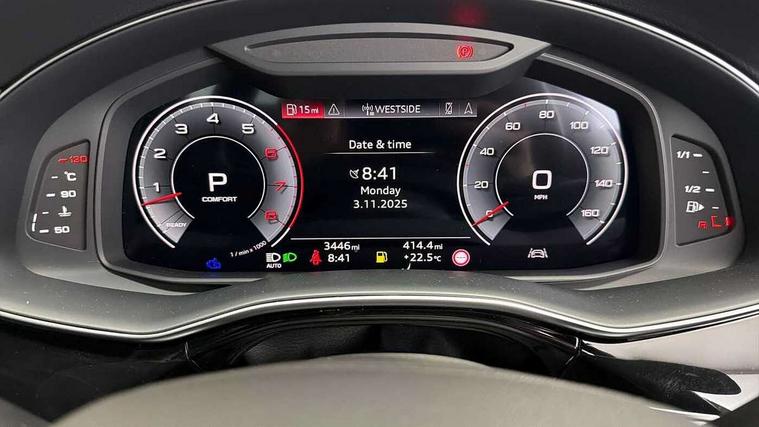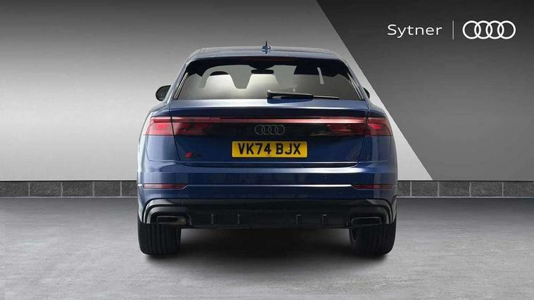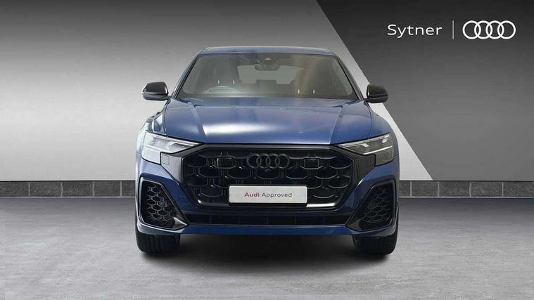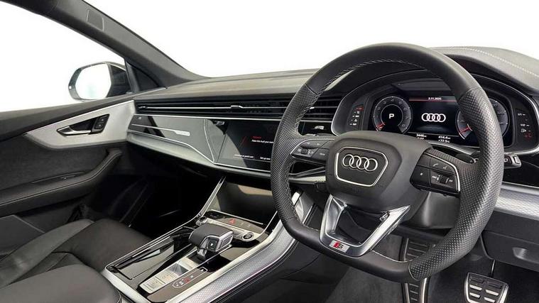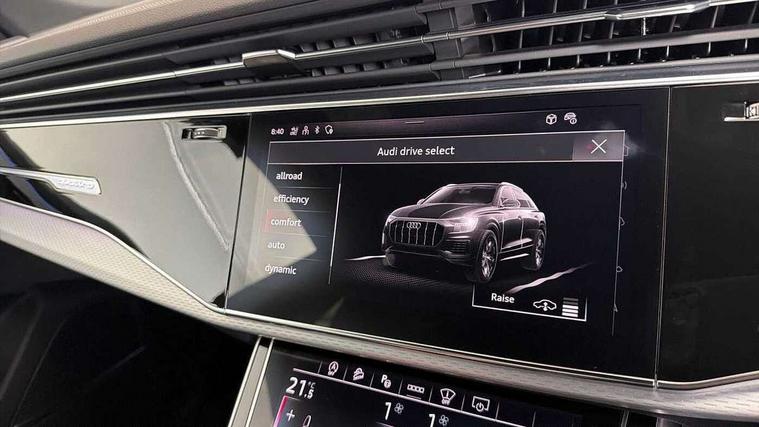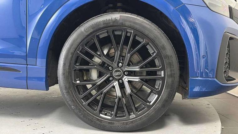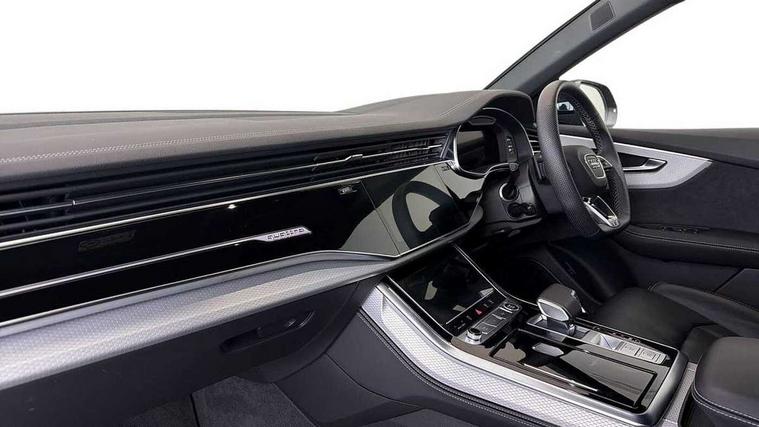 10.1" and 8.6" Dual colour touchscreens, 2 USB C ports with charging functionality in the rear, 360 degree camera with top view, Audi application store, Audi connect safety and service (e-call), Audi connect with Amazon Alexa Integration, Audi drive select, Audi phone box light with wireless charging, Audi smartphone interface includes wireless Apple carplay/Android Auto, Audi virtual cockpit plus, Automatic start/stop system, Bluetooth, Electro-mechanical PAS, Head up Display, Low washer fluid indicator, MMI navigation plus with MMI touch, Natural voice recognition, On board computer, Operating buttons in black, glass look with haptic feedback, Power operated tailgate, Remote park assist plus, Service interval indicator, 48V Mild hybrid technology, 85 litre fuel tank, Adaptive sport air suspension, Quattro all wheel drive with self locking centre differential, Audi music interface with 2 USB ports with charge and data functions, Aux-in socket, Bang + Olufsen sound system, DAB Digital radio, 3rd brake light, Anthracite black door mirrors, Audi beam, Auto dimming frameless rear view mirror, Black exhaust tailpipes, Black single frame mask, Coming/leaving home lighting function, Digital OLED rear combination lamps, Electric front+rear windows, Electrically folding auto dimming/adjustable/heated door mirrors with memory function, LED side indicators and kerb view function for passenger side, Headlight washers, Heat insulating glass in windshield, LED rear light plus, LED signature daytime running lights, Matrix LED headlights with dynamic front and rear indicators, Platinum grey front spoiler lip and diffuser insert with honeycomb grille in black, Privacy glass - dark tinted rear and rear side windows from B-pillar backwards, Rain and light sensors, Rear side wing doors, Rear wiper, Singleframe grille surround in matte platinum grey, 3 bench rear seats in 2nd row, 3 spoke flat bottomed high multi-function leather sport steering wheel with gearshift paddles, 4 zone deluxe automatic climate control, 4-way lumbar support for front seats, 40:20:40 split folding rear bench seat, Black cloth headlining, Comfort front centre armrest, Driver seat memory function, Electrically adjustable front seats, Front head restraints, Front/rear floor mats, Heated front and outer rear seats, ISOFIX child seat mounting for front passenger seat and 2 outer rear seats with top tether child seat mounting for all 3 rear seats, LED interior ambient lighting, Luggage compartment sill protection in stainless steel, Rear centre armrest with 2 cupholders, Rear headrests, Seat cushion displaceable by 100mm in the ratio 60:40, Single front passenger seat, Stainless steel pedals, Sunvisors with illuminated vanity mirrors, Upper dashboard with contrast stitching and lower dashboard in leatherette, Black styling pack plus - Q8, City assist pack - Q8, Multi coloured extended LED Interior lighting pack - Q8, 3 point seatbelts on all seats, Audi pre sense front, Driver and front passenger, front side and curtain airbags, Electromechanical parking brake, Electronic Stability Control (ESC) including ABS, ASR and EDL, Front passenger airbag deactivation, Hill descent control, Hill hold assist, Predictive pedestrian protection, Seatbelt monitoring, Traction control, Tyre pressure loss indicator, Warning triangle and first aid kit, Advanced key, Anti theft alarm with tow away protection, Anti-theft wheel bolts and wheel loosening detection, Electronically operated child lock, Immobiliser, Decorative inserts in matte brushed aluminum with linear structure in Silver, 22" x 10.0J 10 spoke Y style black metallic audi sport alloy wheels, Tool kit, Tyre repair kit,