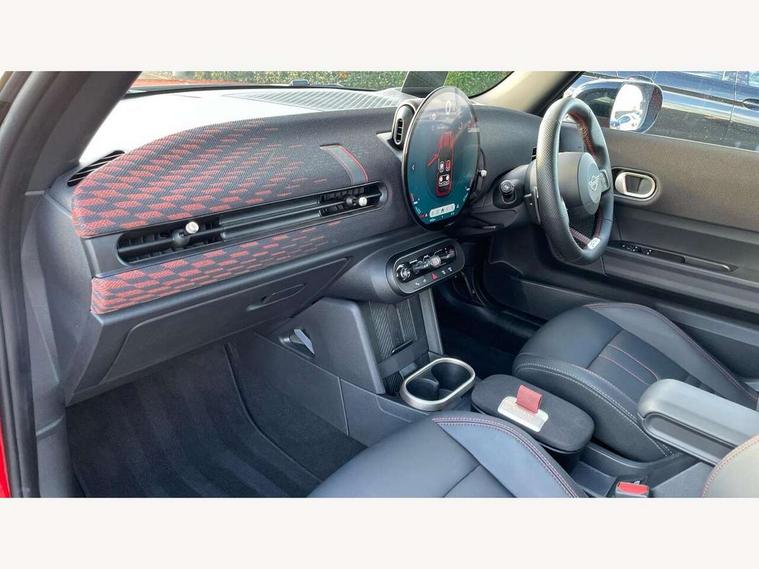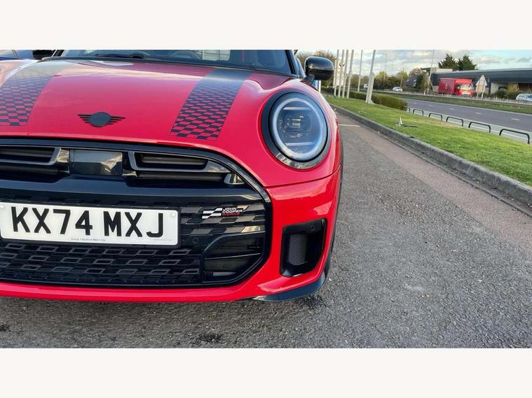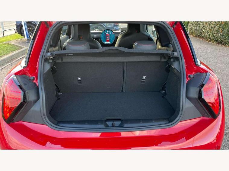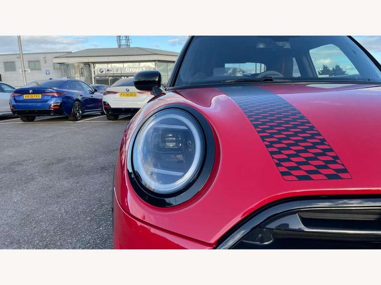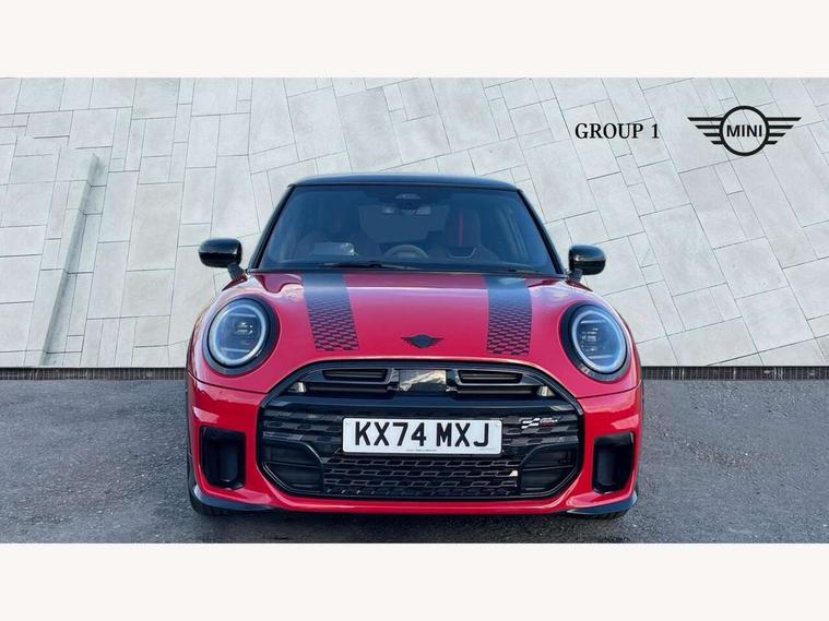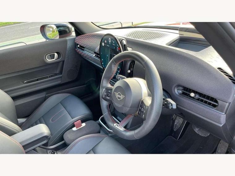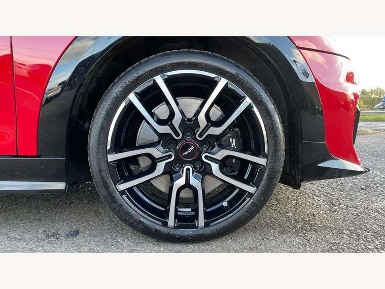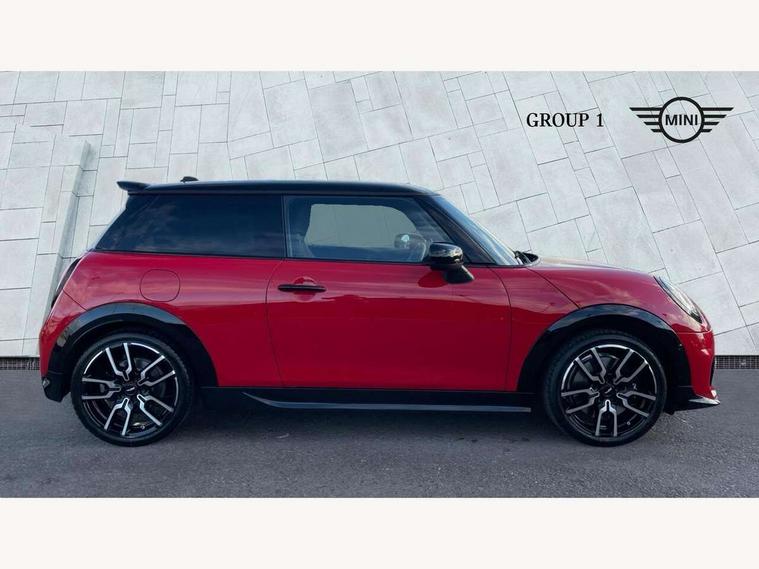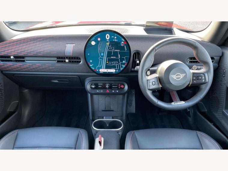 Central toggle bar, Circular OLED Screen, Compatible mobile phone bluetooth with audio streaming, Cruise control, Digital instrument cluster, Electro-mechanical speed dependant steering assistance, Emergency call service, MINI Experience Modes, Mini navigation system, On board computer, Service interval indicator, 7 speed steptronic sport transmission with double clutch, Adaptive suspension, DAB Digital radio, Personal eSim, Auto headlights, Electric adjustable heated door mirrors, Electric front windows, Front and rear apron, Heated rear window, Heated windscreen washer jets, High gloss black wheel arches, High gloss hexagonal patterned grille surround, JCW body kit, LED daytime running lights, LED indicator lights, LED rear lights, Rain sensor window wipers, Rear fog lights, Rear roof spoiler with airblades, Rear window wiper, 2 seat bench in second row, 2 zone automatic air conditioning, 60/40 rear seat bench, Ambient lighting, Cupholders, Dark headliner, Floor mats, Front and rear head restraints, Front compact armrest, Heated steering wheel, Height adjustable passenger seat, Lidded storage box in Black/Red knit, Luggage compartment lighting, Perforated Vescin steering wheel, Single front passenger seat, Steering wheel paddle shift, Sunvisors with vanity mirrors, Vescin/Cord upholstery, Driving assistant pack - Cooper Hatchback, Level 1 pack - Mini Hatchback, Park assistant pack - Cooper Hatchback, 3 point seatbelts on all four seats, 6 Airbags - front, side, head and seat belt tensioners, Acoustic pedestrian protection, Anti-lock braking system (ABS), Brake caliper in Black with JCW badge, DSC - Dynamic Stability Control, Electronic parking brake, Front and rear disc brakes, Front ISOFIX (iSize), Front passenger airbag deactivation, JCW Sport Brakes, Traction control, Tyre pressure monitoring system, Alarm, Immobiliser, Remote central locking, Black/Red decorative dash strap, JCW Black/Red dashboard knit, 18" JCW Lap spoke 2-tone alloy wheels, Tyre repair kit,