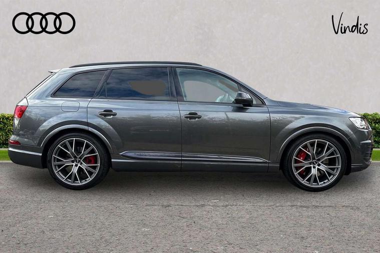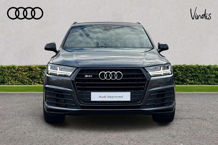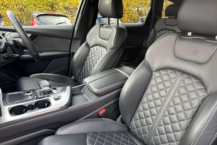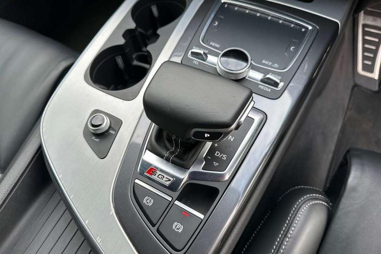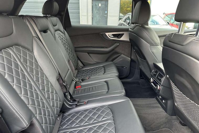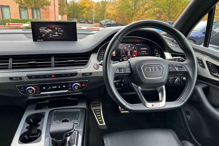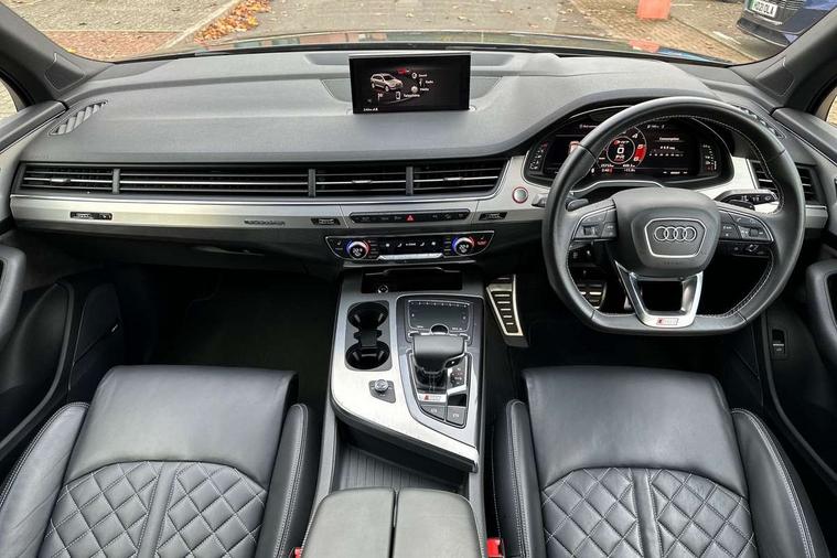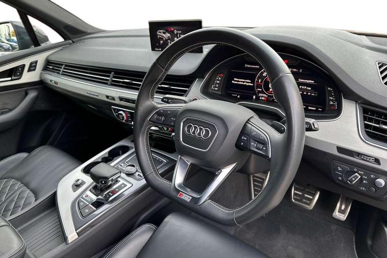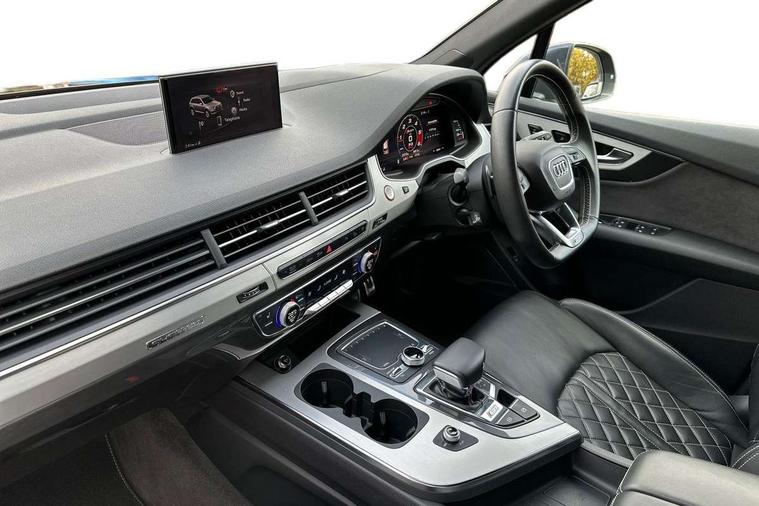Audi drive select, Audi smartphone interface, MMI - Multi Media Interface control system, MMI navigation plus with touch and 8" colour display, DVD, SD card reader, 10GB music storage, Mobile phone preparation with bluetooth interface, Remote electric boot opening/closing, Service interval indicator, Servotronic speed related PAS, Speed limiter, Voice control system, 85 litre fuel tank, Adaptive air suspension, 2 USB ports, Audi music interface, Aux-in socket, DAB digital radio module, MMI radio plus, Acoustic windscreen, Active exhaust sound system, Aluminium effect front grille, Audi Beam uses LEDs to project the Audi Sport logo, Auto dimming rear view mirror, Body coloured bumpers, Dual branch oval twin exhaust tailpipes, Dynamic rear indicators, Electric front+rear windows, Headlight washers, High beam assist, LED daytime running lights, LED tail lights, Loading sill protector in stainless steel, Platinum grey front lip spoiler, Rain and light sensors, Rear wiper, Roof spoiler, S body styling, 2 cupholders in front centre console, 35/30/35 split fold 2nd row seats, 4 way electrically adjustable lumbar support for drivers seat, 4 way electrically adjustable lumbar support for front passenger seat, Aluminium scuff plates, Door sill trims with S line logo, Electric 3rd row 50/50 split/fold, Electric adjustable front seats, Four zone electronic climate control, Front ashtray and cigar lighter, Front centre comfort armrest with storage + cupholders, Front head restraints, Front/rear floor mats, Gearshift paddles, Heated front seats, ISOFIX on front passenger and rear outer seats, Leather gear knob, Rear centre armrest with 2 cupholders, Rear headrests, Stainless steel pedals, Sunvisors with illuminated vanity mirrors, Top tether anchor plate for isofix child seat, Interior light pack - Q7, 3 point seatbelts on all seats, ABS+Electronic Brake force Distribution, Curtain airbags, Driver and passenger airbags, EDL + ASR, Electrically operated child locks on rear doors, Electromechanical parking brake, ESP, Front passenger airbag deactivation, Front side airbags, Hill descent control, Hill hold assist, Seatbelt warning, Traction control, Tyre pressure monitoring system, Warning triangle and first aid kit, Alarm with interior monitoring, Immobiliser, Keyless Go access/ignition system, Locking wheel bolts, Remote central locking, Chrome door inserts, Tool kit, Tyre repair kit,