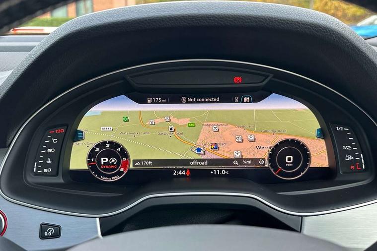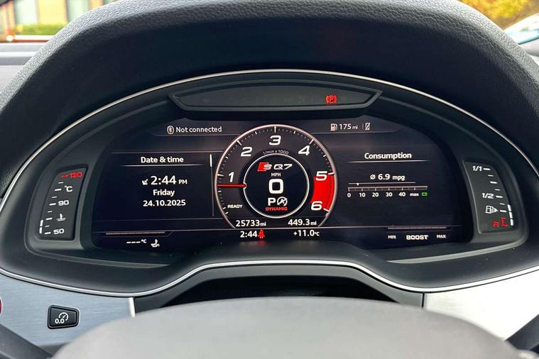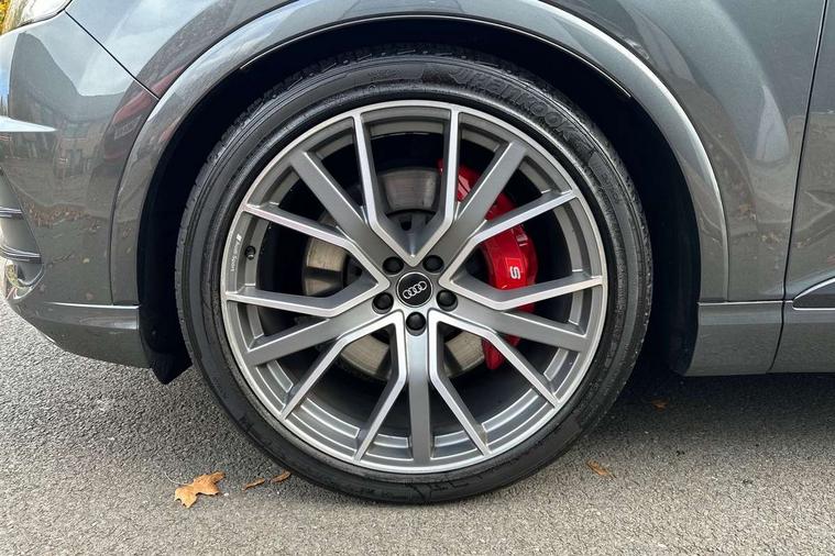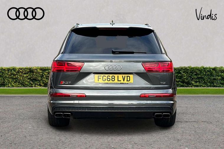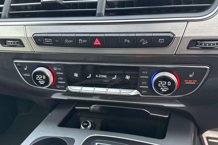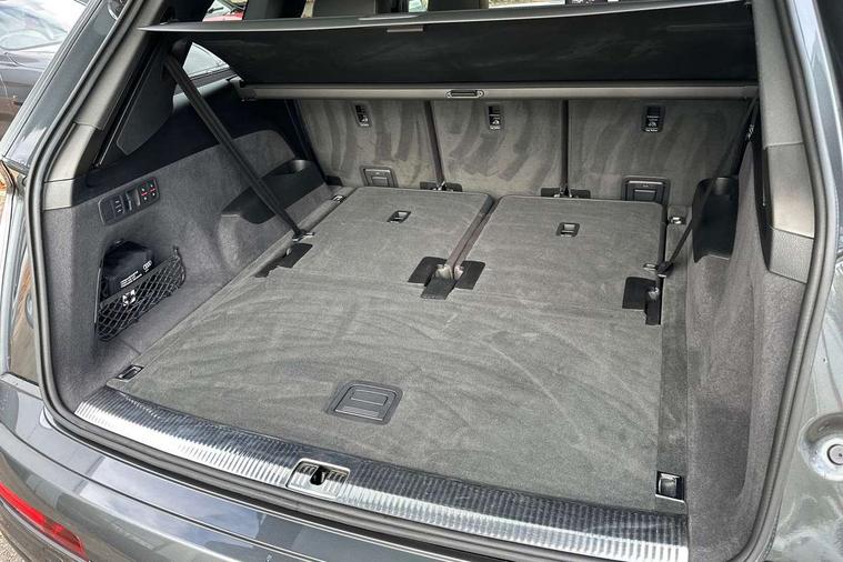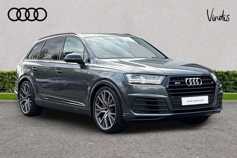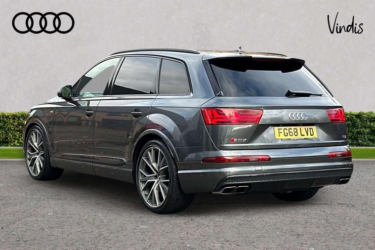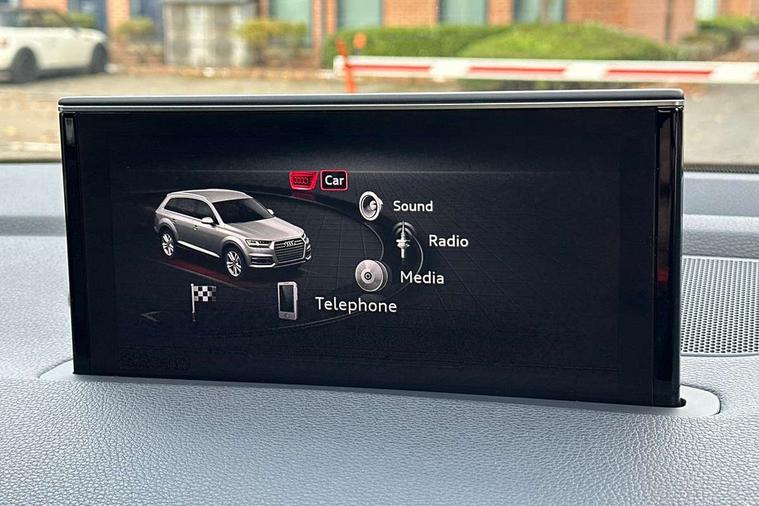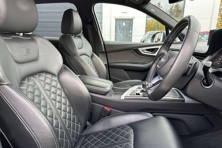 Audi drive select, Audi smartphone interface, MMI - Multi Media Interface control system, MMI navigation plus with touch and 8" colour display, DVD, SD card reader, 10GB music storage, Mobile phone preparation with bluetooth interface, Remote electric boot opening/closing, Service interval indicator, Servotronic speed related PAS, Speed limiter, Voice control system, 85 litre fuel tank, Adaptive air suspension, 2 USB ports, Audi music interface, Aux-in socket, DAB digital radio module, MMI radio plus, Acoustic windscreen, Active exhaust sound system, Aluminium effect front grille, Audi Beam uses LEDs to project the Audi Sport logo, Auto dimming rear view mirror, Body coloured bumpers, Dual branch oval twin exhaust tailpipes, Dynamic rear indicators, Electric front+rear windows, Headlight washers, High beam assist, LED daytime running lights, LED tail lights, Loading sill protector in stainless steel, Platinum grey front lip spoiler, Rain and light sensors, Rear wiper, Roof spoiler, S body styling, 2 cupholders in front centre console, 35/30/35 split fold 2nd row seats, 4 way electrically adjustable lumbar support for drivers seat, 4 way electrically adjustable lumbar support for front passenger seat, Aluminium scuff plates, Door sill trims with S line logo, Electric 3rd row 50/50 split/fold, Electric adjustable front seats, Four zone electronic climate control, Front ashtray and cigar lighter, Front centre comfort armrest with storage + cupholders, Front head restraints, Front/rear floor mats, Gearshift paddles, Heated front seats, ISOFIX on front passenger and rear outer seats, Leather gear knob, Rear centre armrest with 2 cupholders, Rear headrests, Stainless steel pedals, Sunvisors with illuminated vanity mirrors, Top tether anchor plate for isofix child seat, Interior light pack - Q7, 3 point seatbelts on all seats, ABS+Electronic Brake force Distribution, Curtain airbags, Driver and passenger airbags, EDL + ASR, Electrically operated child locks on rear doors, Electromechanical parking brake, ESP, Front passenger airbag deactivation, Front side airbags, Hill descent control, Hill hold assist, Seatbelt warning, Traction control, Tyre pressure monitoring system, Warning triangle and first aid kit, Alarm with interior monitoring, Immobiliser, Keyless Go access/ignition system, Locking wheel bolts, Remote central locking, Chrome door inserts, Tool kit, Tyre repair kit,