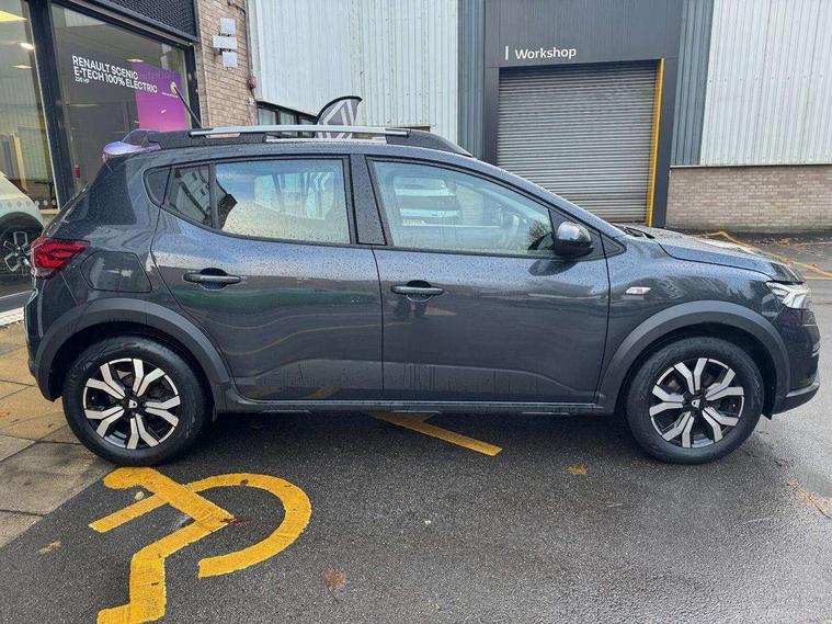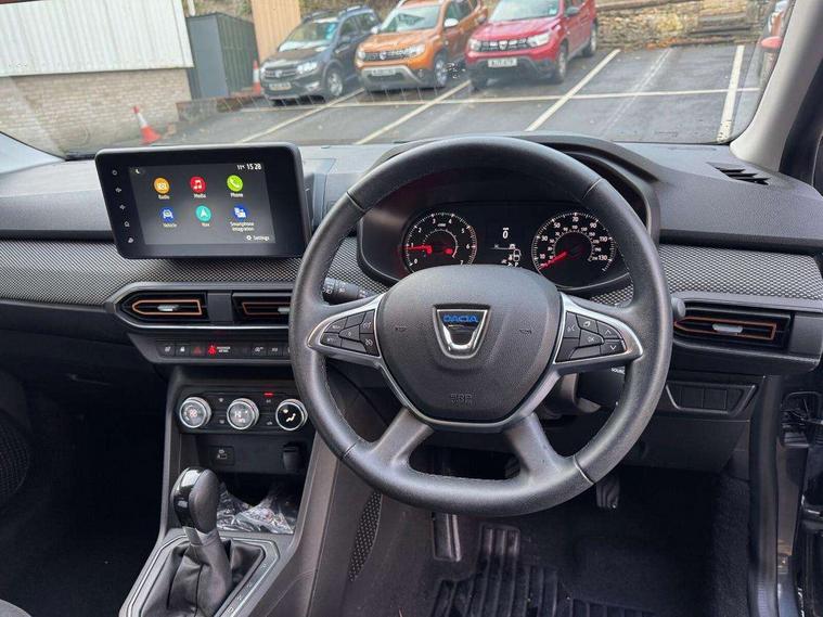 3.5" TFT instrument panel with on-board computer, Blind spot warning, Cruise control with speed limiter, eCall emergency call system, Eco mode, Electric power assisted steering, Front parking sensors, Rear parking sensors, Rev counter, Reversing camera, Stop/start system, 8" MediaNav - DAB Radio, Wifi smartphone replication, Bluetooth, 6 speakres, Apple CarPlay and Android Auto, USB connection for data transfer and charging, USB socket, 3 speed windscreen wipers, Auto lighting, Automatic wipers, Body colour door handles, Body colour door mirrors, Body coloured bumpers, Chrome longitudinal roof bars, Chrome radiator grille, Electrically adjustable and heated door mirrors, Front fog lights, Heated rear window, High level third brake light, LED automatic daytime running lights, LED Y-shape Dacia signature lighting, Modular roof bars, One touch electric front windows, Rear electric windows, Rear side wing doors, Rear wash/wipe, Stepway inscription on radiator grille and roof bars, Tinted windows, 1/3 to 2/3 split folding rear seats, 12 volt front socket, 12 volt rear socket, 3 height adjustable rear headrests, 3 seat rear bench, Automatic air conditioning, Driver + passenger vanity mirrors, Fabric upholstery, Fixed smartphone holder on dashboard, Height adjustable driver seat, Height adjustable front headrests, Height/depth adjustable steering wheel, High central armrest with console storage, Isofix points for child seats in both outer rear seats, Satin chrome interior door handles, Satin Chrome/Copper orange air vents, Single front passenger seat, Soft feel steering wheel, Steering wheel controls, 3x3 point rear seatbelts, ABS and Emergency brake assist, Automatic emergency braking system, Child locks on rear doors, Door open warning, Driver airbag, Electronic parking brake, ESC (Electronic Stability Control), ESP + Hill Start Assist, Front curtain airbags, Front seatbelt pretensioners, Front side airbags, Height adjustable front seatbelts, Passenger airbag, Seatbelt reminder for driver and front passenger, Tyre pressure monitor, Automatic central locking, Immobiliser, Keyless entry, Remote central locking, Decopart on instrument panel and door with textile, 16" Diamond-effect alloy wheels,