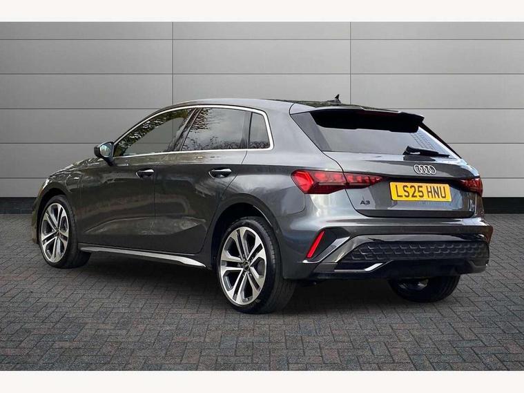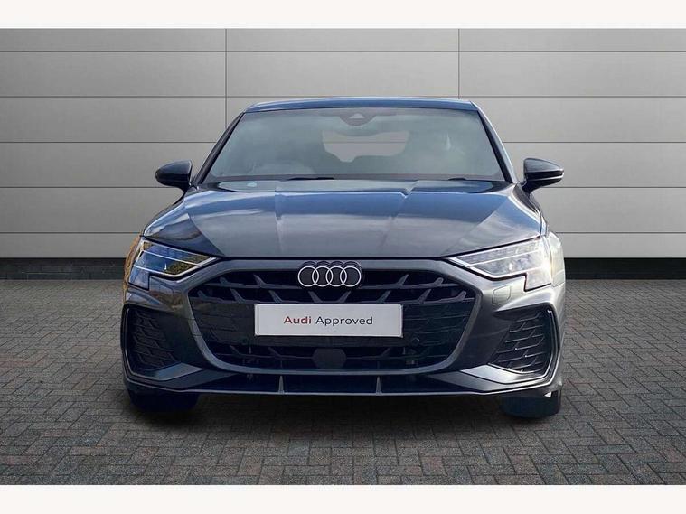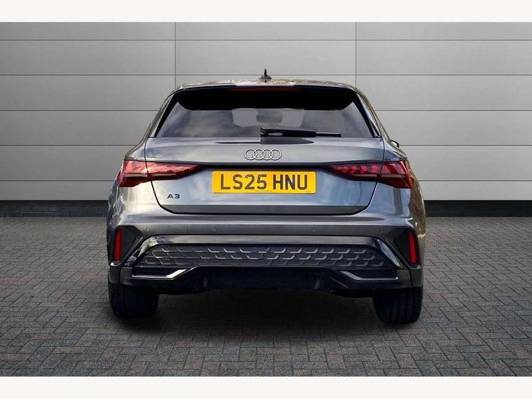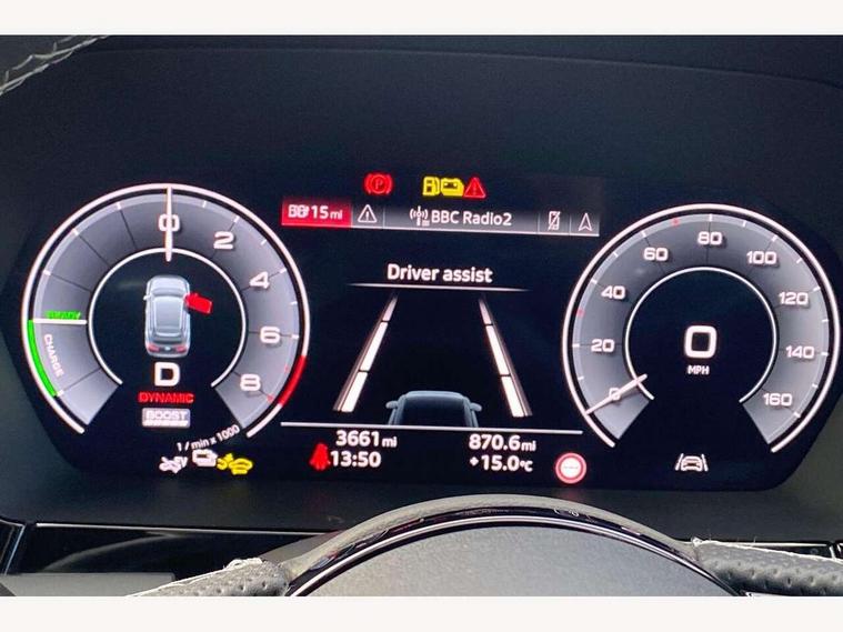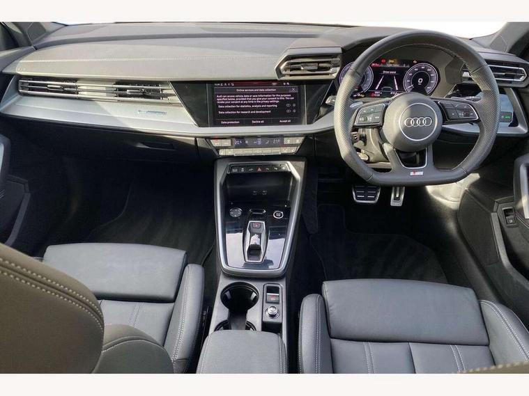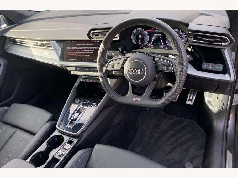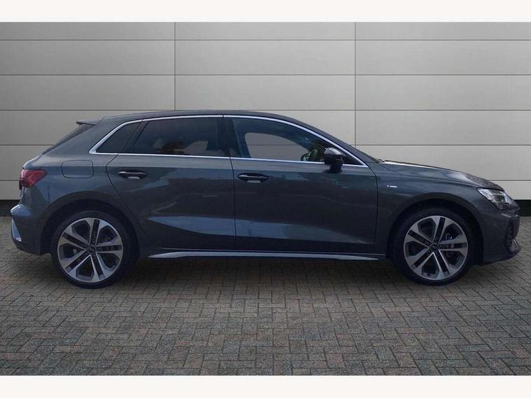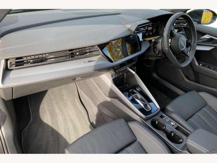 Adjustable speed limiter, Audi drive select, Audi smartphone interface with app store includes wireless Apple carplay, Android auto and Amazon alexa integration, Audi virtual cockpit plus - 12.3" full HD resolution dynamic digital instrument cluster, Automatic start/stop system with recuperation, Bluetooth interface, Camera based traffic sign recognition, Collision avoidance assistant, Cruise control, Distraction and Fatigue warning, e-Call (emergency call), Electromechanical power speed sensitive steering, Lane departure warning system, MMI Navigation Plus with high resolution 10.1" colour touch screen display, Park Assist with parking system Plus, Service indicator, Trip computer, Voice control system with natural language interaction, 3 pin 10 amp domestic charging cable, CCS socket for DC charging, Charging cable for public charging, mode 3 (type 2), up to 22 kW (AC), Compact charging system, Industrial connector CEE 32 A, 230 V, length 1.6 m, Standard suspension, Type 2 socket for AC charging, Audi Phonebox light with wireless charging, Audi sound system - 10 loudspeakers including centre loudspeaker and subwoofer, DAB Digital radio, USB ports with charging function in the rear, Acoustic glass windscreen, Aluminium window trim, Auto dimming frameless rear view mirror, Body colour exterior mirrors, Chrome exhaust tailpipes, Electrically adjustable/heated/folding/auto dimming door mirrors with integrated LED indications + kerb view function for passenger side, Exterior model badging, Front and rear side air inlets in grained matt black with dark liquid chrome frame, Front electric windows, Front radiator grill in high gloss dark chrome, Heat insulating glass windscreen, Illuminated door sills with aluminium inserts at the front with S logo, LED 3rd brake light, LED daytime running lights, LED headlights with LED rear lights and dynamic rear indicators, Light and rain sensors, Privacy glass - dark tinted rear window, rear door and side windows, Rear diffuser and grill in grained matt black with inlay in dark liquid chrome, Rear electric windows, Rear side wing doors, Rear wiper, S line bumpers, S roof spoiler, Side S line emblems on front wings, Side sill trim in dark liquid chrome, 12V socket and storage compartment in front centre console, 3 seat bench in 2nd row, 3 spoke flat bottomed leather multifunction sport steering wheel with gear shift paddles, 3-zone deluxe automatic air conditioning, 4 way electrically adjustable lumbar support for driver and front passenger, 40/20/40 split folding rear seat bench, Black cloth headlining, Convenience auxiliary air conditioning, Front and rear centre armrest in artificial leather, Front and rear centre armrest in artificial leather with contrasting stitching on armrests and instrument panel, Front and rear headrests, Front/rear floor mats, Heated front seats, Height and reach adjustable steering wheel, Manual boot compartment lid, Manually adjustable front seats, Rear cup holders, S badging on the steering wheel, Seat side bolsters, Single front passenger seat, Stainless steel pedals and front footrest in black, Twin leather upholstery with front sports seats S embossed logo, Aluminium interior elements pack - A3 Sportback, Multi-coloured LED interior lighting package - A3, 3x3 point rear seat belts, Acoustic vehicle alerting system, Driver and front passenger airbag with passenger airbag deactivation, Electronic Stabilisation Control (ESC) including ABS, ASR and EDL, First aid kit with warning triangle and 2 safety vests, Front side airbags with head airbags and interaction airbag, Hill hold assist, Pre-sense front with pedestrian and cyclist detection, Seatbelt monitoring, Tyre pressure loss indicator, Anti theft alarm, Anti-theft wheel bolts, Electronically operated child locks, Immobiliser, Remote central locking with safelock, Dash & door Inlay in dark aluminium Spectrum, Tyre repair kit,