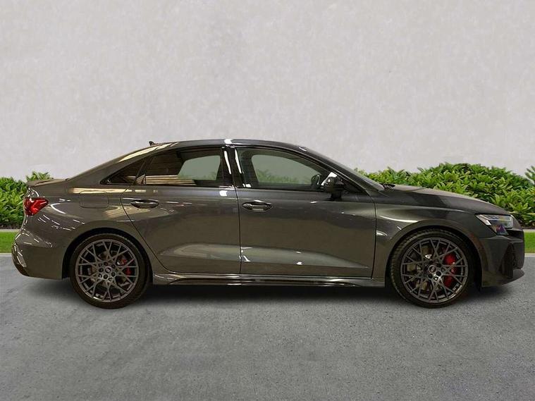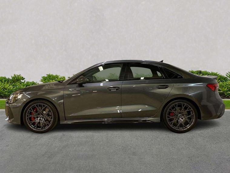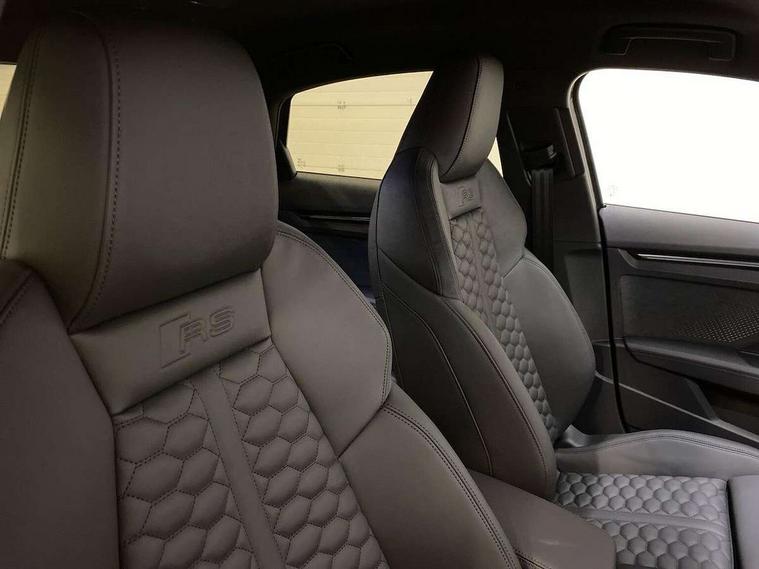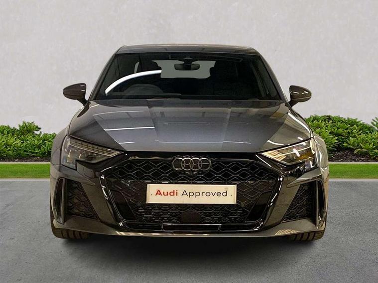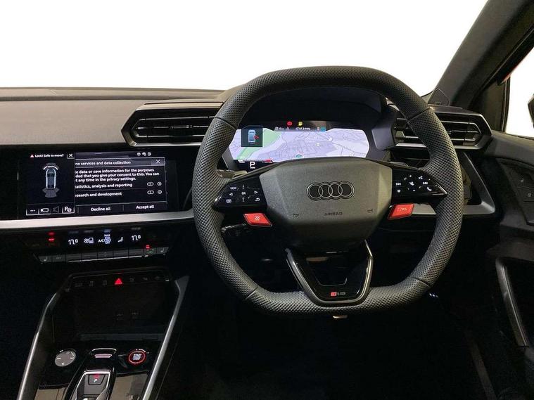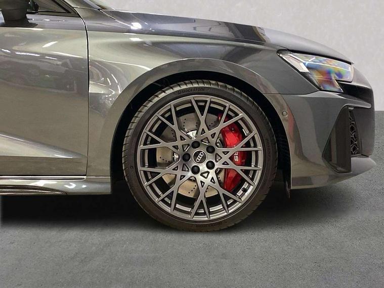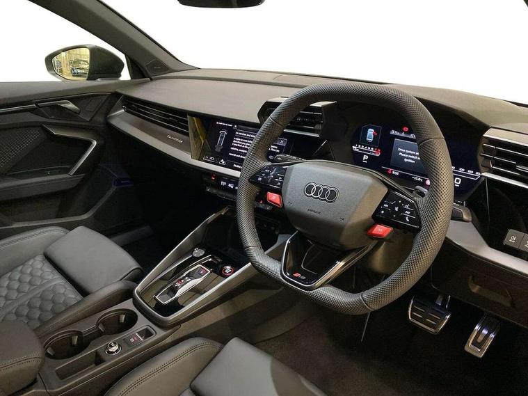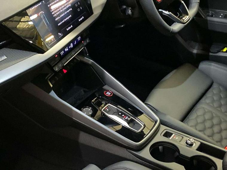 Adjustable speed limiter, Audi drive select comfort, auto, dynamic and efficiency, Audi smartphone interface with app store includes wireless Apple carplay, Android auto and Amazon alexa integration, Audi virtual cockpit plus with RS specific design and 12.3" display with additional graphic display options, Automatic start/stop system with recuperation, Bluetooth interface, Camera based traffic sign recognition, Collision avoidance assistant, Distraction and Fatigue warning, e-Call (emergency call), Lane departure warning system, MMI Navigation Plus with high resolution 10.1" colour touch screen display, Park Assist with parking system Plus, Progressive steering, RS specific driving modes - RS Individual, RS Performance and RS Torque rear, Voice control system with natural language interaction, Quattro permanent four wheel drive, Audi Phonebox light with wireless charging, DAB Digital radio, USB ports with charging function in the rear, All weather light, Audi beam LED projection of RS logo on ground as you exit, Audi darkened matrix LED headlights with dynamic light sequencing and dynamic indicator, Auto dimming frameless rear view mirror, Automatic dynamic range control, Carbon door mirror housings, Carbon fibre engine cover, Dipped beam, main beam, position light and turning light, Dynamic RS specific light sequencing of the coming home and leaving home function, Electrically adjustable/heated/folding/auto dimming door mirrors with integrated LED indications + kerb view function for passenger side, Exterior model badging, Front electric windows, Headlight cleaning system, Heat insulating glass windscreen, Intersection light, LED 3rd brake light, LED brake lights, LED rear lights with dynamic light sequencing and dynamic indicator, LED rear number plate lights, LED reverse light, LED tail lights, Light and rain sensors, Manoeuvring light, Motorway light, Privacy glass - dark tinted rear window, rear door and side windows, Rear boot, Rear electric windows, Rear side wing doors, RS dual branch exhaust system with two chrome plated oval tailpipe trims, Static Cornering lights, Tailgate spoiler in carbon, Visually upgraded RS specific daytime running light choice of 4 digital signature in chequered flag design within the headlight, 12V socket and storage compartment in front centre console, 3 seat bench in 2nd row, 3 Spoke flat top and bottomed black leather multi function steering and gear shift paddles, 3-zone deluxe automatic air conditioning, 40/20/40 split folding rear seat bench, Black cloth headlining, Black front and rear floor mats, Front and rear headrests, Front centre armrest, Front door sill trims with RS 3 logo, Front sports seats RS embossed logo, Heated front seats, Height and reach adjustable steering wheel, Manual boot compartment lid, Manually adjustable front seats, Rear centre armrest with cupholder, Seat side bolsters, Single front passenger seat, Stainless steel pedals and front footrest in black, Vanadium look - Interior door handles, Door trim, power latching, Air vents, window controls, mirror adjust, rear door lock, Selector lever in centre console, Black Styling plus package - RS3, Extended ambient lighting package Pro with Multi-coloured contour lighting of instrument panel - RS3, RS exterior features pack in carbon and gloss black - RS3, RS sport suspension pack - RS3, Storage package - RS3 Saloon, Technology package without speed limiter - RS3, 3x3 point rear seat belts, Driver and front passenger airbag with passenger airbag deactivation, Electronic Stabilisation Control (ESC) including ABS, ASR and EDL, First aid kit with warning triangle and 2 safety vests, Hill hold assist, Pre-sense front with pedestrian and cyclist detection, RS steel brakes, Seatbelt monitoring, Tyre pressure loss indicator, Anti theft alarm, Anti-theft wheel bolts, Electronically operated child locks, Immobiliser, Remote central locking with safelock, Black dashboard, Inlays in carbon atlas structure, 19" 10 cross spoke silk matt grey alloy wheels, Tyre repair kit,