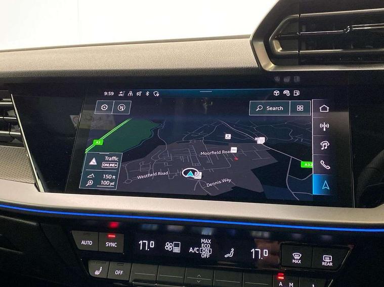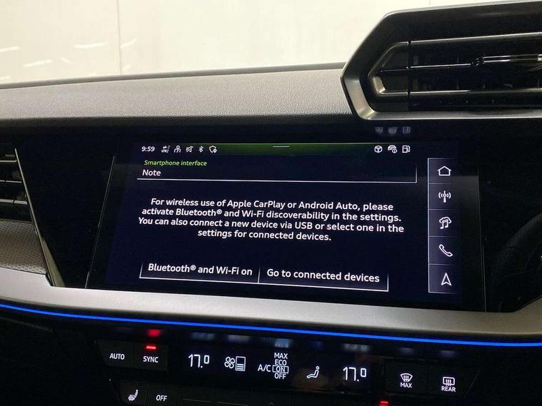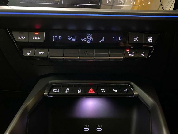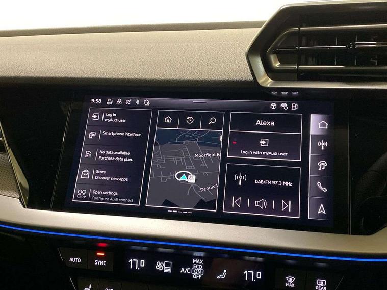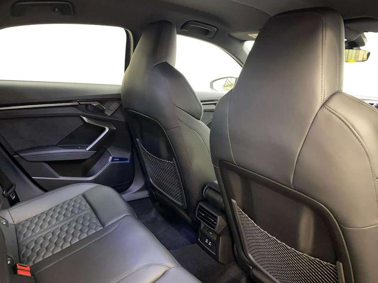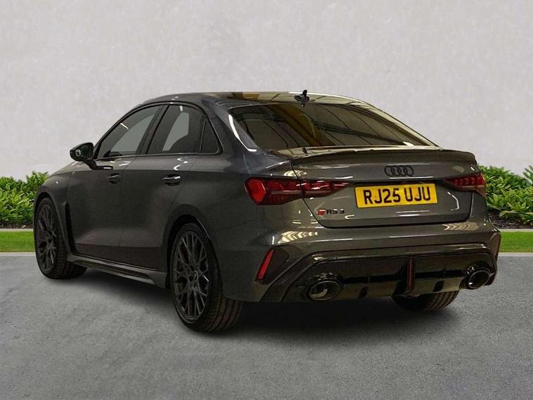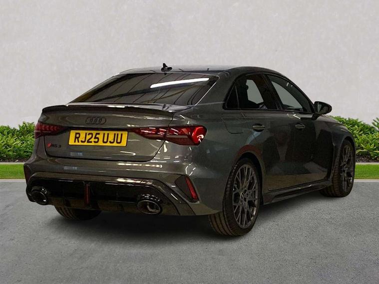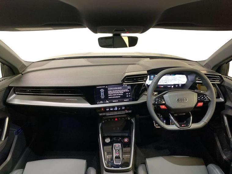 Adjustable speed limiter, Audi drive select comfort, auto, dynamic and efficiency, Audi smartphone interface with app store includes wireless Apple carplay, Android auto and Amazon alexa integration, Audi virtual cockpit plus with RS specific design and 12.3" display with additional graphic display options, Automatic start/stop system with recuperation, Bluetooth interface, Camera based traffic sign recognition, Collision avoidance assistant, Distraction and Fatigue warning, e-Call (emergency call), Lane departure warning system, MMI Navigation Plus with high resolution 10.1" colour touch screen display, Park Assist with parking system Plus, Progressive steering, RS specific driving modes - RS Individual, RS Performance and RS Torque rear, Voice control system with natural language interaction, Quattro permanent four wheel drive, Audi Phonebox light with wireless charging, DAB Digital radio, USB ports with charging function in the rear, All weather light, Audi beam LED projection of RS logo on ground as you exit, Audi darkened matrix LED headlights with dynamic light sequencing and dynamic indicator, Auto dimming frameless rear view mirror, Automatic dynamic range control, Carbon door mirror housings, Carbon fibre engine cover, Dipped beam, main beam, position light and turning light, Dynamic RS specific light sequencing of the coming home and leaving home function, Electrically adjustable/heated/folding/auto dimming door mirrors with integrated LED indications + kerb view function for passenger side, Exterior model badging, Front electric windows, Headlight cleaning system, Heat insulating glass windscreen, Intersection light, LED 3rd brake light, LED brake lights, LED rear lights with dynamic light sequencing and dynamic indicator, LED rear number plate lights, LED reverse light, LED tail lights, Light and rain sensors, Manoeuvring light, Motorway light, Privacy glass - dark tinted rear window, rear door and side windows, Rear boot, Rear electric windows, Rear side wing doors, RS dual branch exhaust system with two chrome plated oval tailpipe trims, Static Cornering lights, Tailgate spoiler in carbon, Visually upgraded RS specific daytime running light choice of 4 digital signature in chequered flag design within the headlight, 12V socket and storage compartment in front centre console, 3 seat bench in 2nd row, 3 Spoke flat top and bottomed black leather multi function steering and gear shift paddles, 3-zone deluxe automatic air conditioning, 40/20/40 split folding rear seat bench, Black cloth headlining, Black front and rear floor mats, Front and rear headrests, Front centre armrest, Front door sill trims with RS 3 logo, Front sports seats RS embossed logo, Heated front seats, Height and reach adjustable steering wheel, Manual boot compartment lid, Manually adjustable front seats, Rear centre armrest with cupholder, Seat side bolsters, Single front passenger seat, Stainless steel pedals and front footrest in black, Vanadium look - Interior door handles, Door trim, power latching, Air vents, window controls, mirror adjust, rear door lock, Selector lever in centre console, Black Styling plus package - RS3, Extended ambient lighting package Pro with Multi-coloured contour lighting of instrument panel - RS3, RS exterior features pack in carbon and gloss black - RS3, RS sport suspension pack - RS3, Storage package - RS3 Saloon, Technology package without speed limiter - RS3, 3x3 point rear seat belts, Driver and front passenger airbag with passenger airbag deactivation, Electronic Stabilisation Control (ESC) including ABS, ASR and EDL, First aid kit with warning triangle and 2 safety vests, Hill hold assist, Pre-sense front with pedestrian and cyclist detection, RS steel brakes, Seatbelt monitoring, Tyre pressure loss indicator, Anti theft alarm, Anti-theft wheel bolts, Electronically operated child locks, Immobiliser, Remote central locking with safelock, Black dashboard, Inlays in carbon atlas structure, 19" 10 cross spoke silk matt grey alloy wheels, Tyre repair kit,