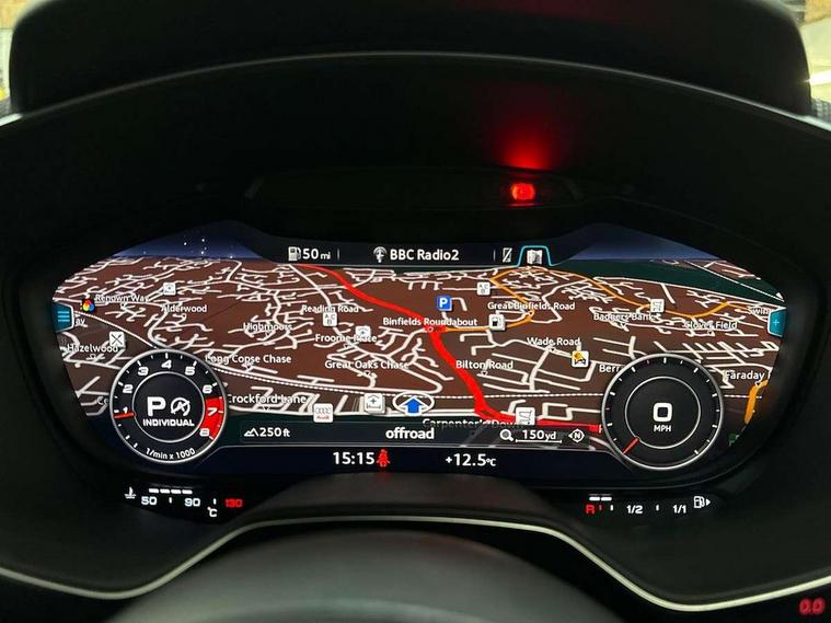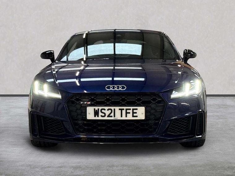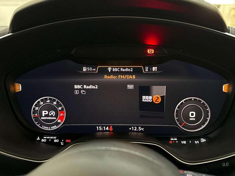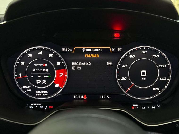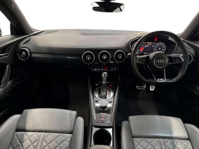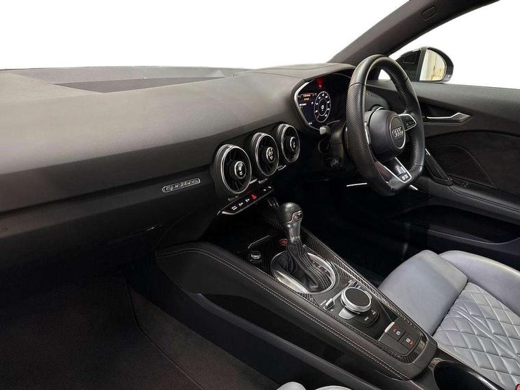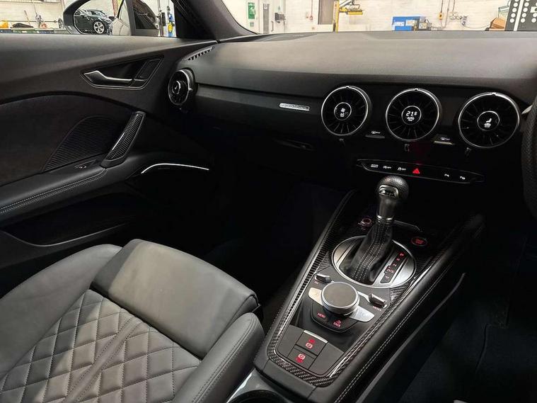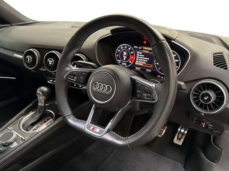 Audi drive select with 4 Pre configured modes, Audi side assist, Audi smartphone interface, Audi Virtual Cockpit with sport gauge, Camera based traffic sign recognition, Cruise control + speed limiter, MMI touch panel, Mobile phone preparation with bluetooth interface, Progressive power assisted steering, Service interval indicator, Start/Stop system with energy recuperation, TP memo, Audi magnetic ride, AM/FM radio, Bluetooth audio streaming, DAB Digital radio, MMI Radio with CD player and SD/XC card slot, Audi Beam uses LEDs to project the Audi Sport logo, Auto dimming rear view mirror, Black door mirrors, Dark privacy glass from B-pillar backwards, Electric front windows, Electrically adjustable, foldable and heated auto dimming on driver side and automatic kerb view dipping function on the passenger side, Green tinted heat insulating glass, High beam assist, Light and rain sensors, Matrix LED light+LED daytime running light, LED Indicator, Headlightclean, auto dynm headlight range+dynamic cornering light, Motorwaybeam/Manoeuvre light, Platinum grey rear diffuser, Sunband for windscreen, 12V socket, 3 spoke flat bottomed contour leather multi-function TTS sport steering wheel and TTS badging, 4 way electric lumbar support for driver and front passenger, Black headlining, Black roll bar, Deluxe auto air conditioning with integrated digital display, Door sill trims with aluminium inlay and TTS logo, Electrically adjustable front seats with pneumatic backrest side bolster adjustment, Fine Nappa leather upholstery with Super Sport seats + "S" embossing, Front centre armrest, Heated front seats, Height adjustable front head restraints, Height/reach adjust steering wheel, ISOFIX child seat mounting for front passenger seat with airbag deactivation, Perforated leather gearknob in black, Rear head restraints, Rear top tether child seat ISOFIX attachment, Split folding rear seat, Stainless steel pedals, Tool kit, Black styling pack - TT, Comfort and sound pack - TT with park assist, Driver assistance - TTS Vorsprung, Leather pack - TTS, LED interior light pack - TT/TT RS, Non smoking pack - TT/TT RS, Technology pack - TT with MMI Navigation, 3 point front seat belts, ABS, ASR traction control, Brake energy regeneration, Curtain airbags, Driver and front passenger airbag with front passenger airbag deactivation, EDL traction control, Electromechanical parking brake, ESP, First aid kit, Front side airbags, Head airbags, Hill hold assist, Seatbelt warning, Tyre pressure warning, Warning triangle, Anti theft alarm, Anti theft wheel bolts, Immobiliser, Keyless Go, Remote central locking, Carbon inlays, 20" 5 arm cutter style Audi sport in anthracite black diamond cut alloy wheels, Tyre repair kit,