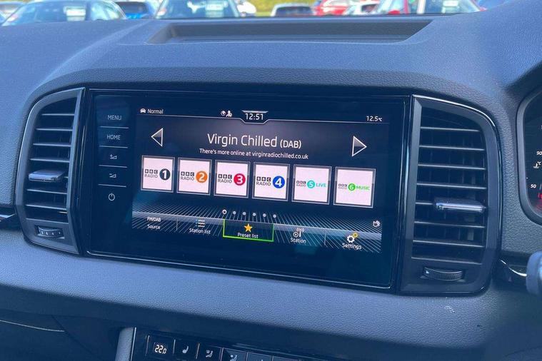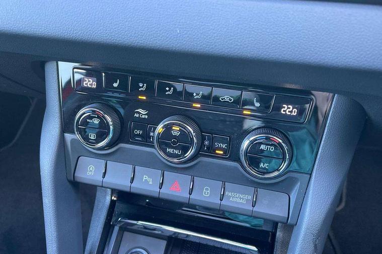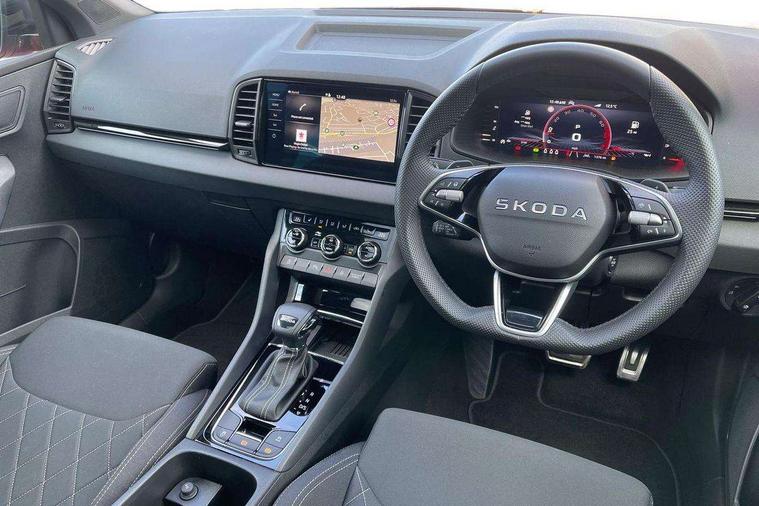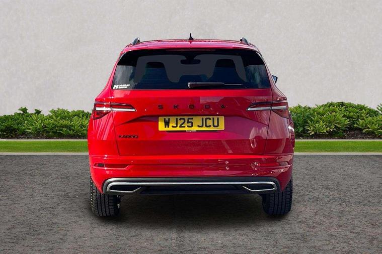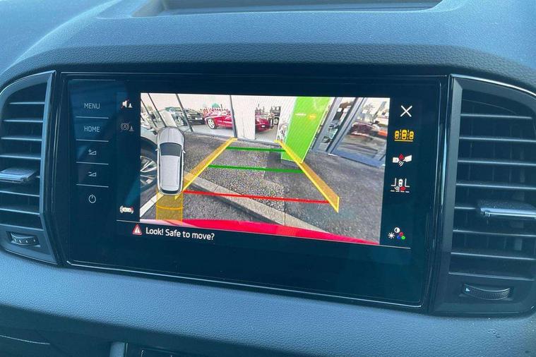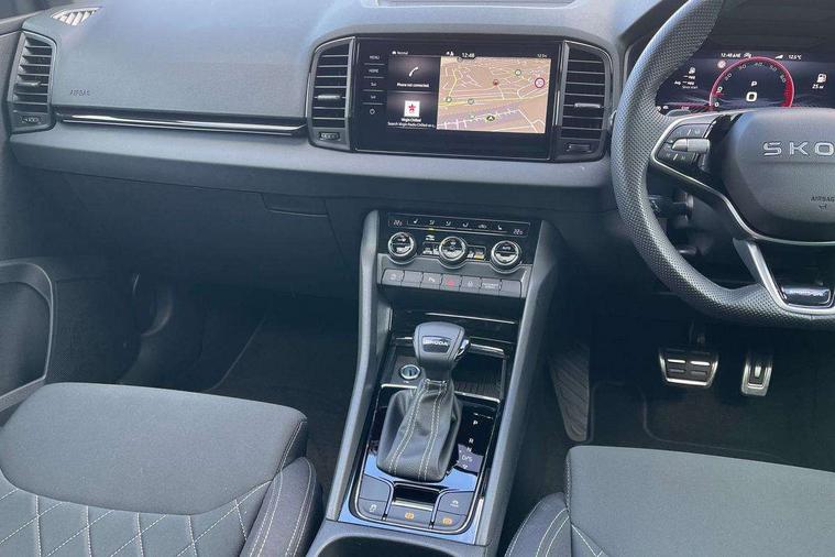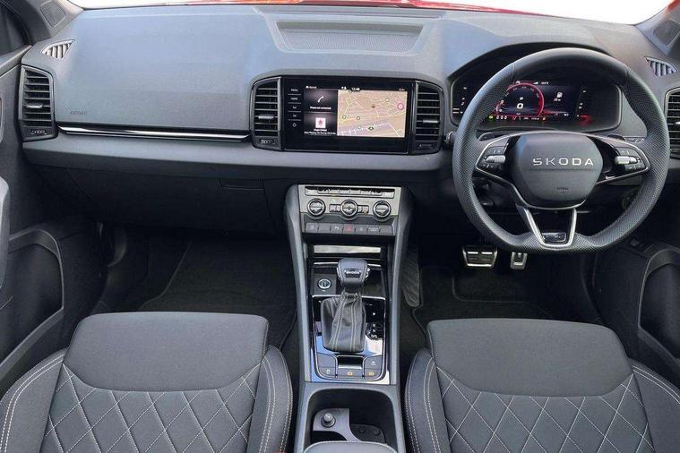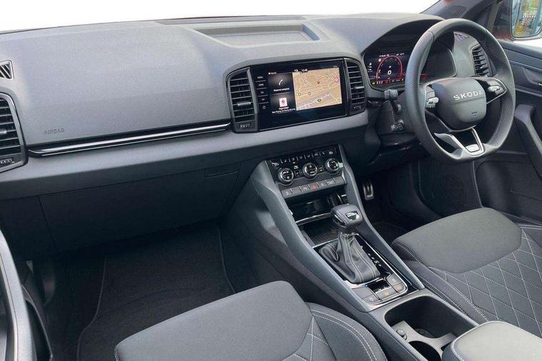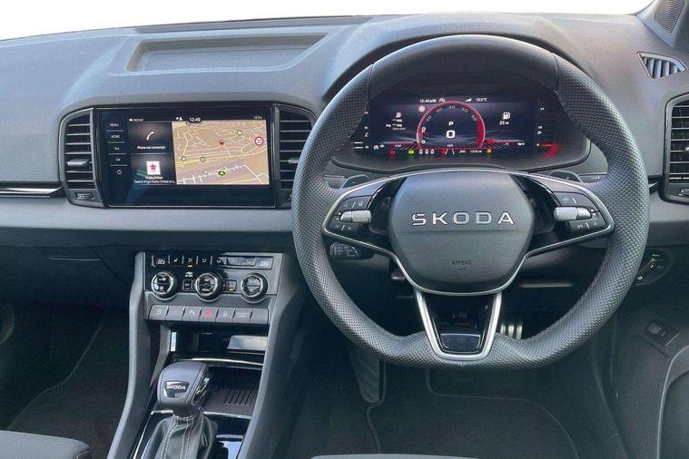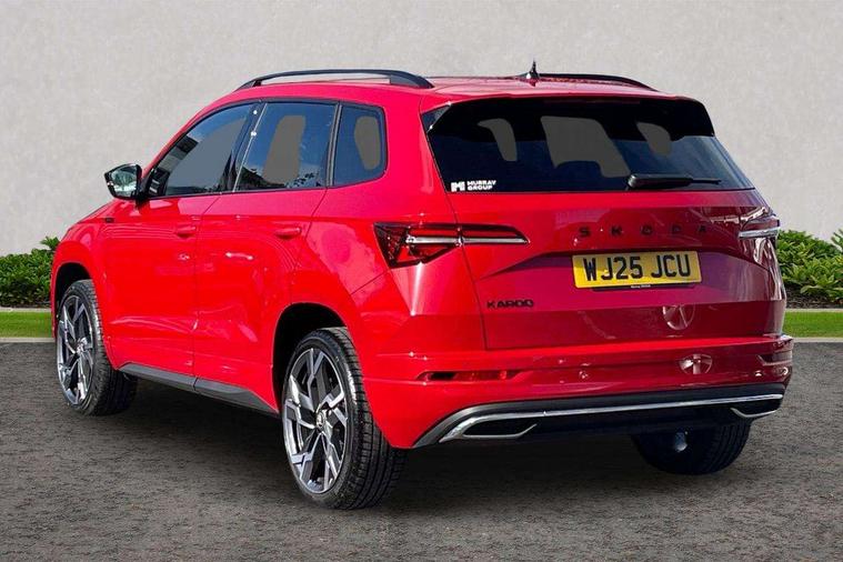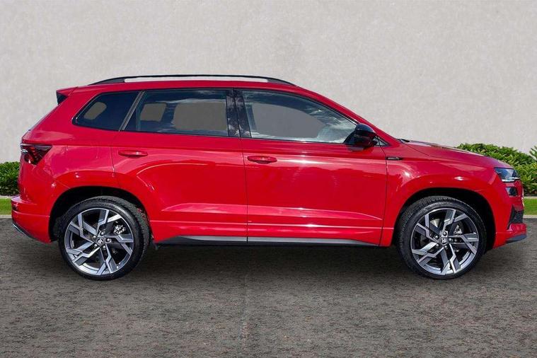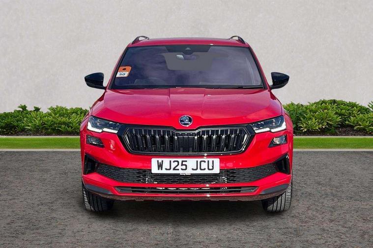 Advanced driver attention and drowsiness monitor, Emergency services call system, Outside temperature gauge, Sensor for driver assistance systems, Service interval indicator, SmartLink wireless for Apple and wired for Android, Start/stop system with regenerative braking, Traffic sign recognition, USB C Port x 2 in front centre console, Virtual Cockpit - 10.25" digital display, Virtual pedal with electrically operated boot door, Wireless smartphone charging, DAB radio with Bluetooth, USB connection, Acoustic glass, Aero front windscreen wipers with intermittent function, Auto dimming rear view mirror with light and rain sensors, Black door mirrors, Black electric window control buttons, Black radiator grille, Black roof rails, Body colour door handles, Electric front and rear windows with child proof lock, Extended rear roof spoiler, Front door steps with SportLine logo, Heated rear windscreen, LED daytime running lights, LED rear lights with high functionality welcome effect and dynamic indicators, Light assistant (coming/leaving home/tunnel light), Panoramic sliding sunroof, Plastic scuff plates in door apertures, Privacy glass, Protective door side sills in body colour, Rear diffuser, Rear side wing doors, Rear window wiper with washer system and intermittent control, Safety reflectors on front doors, Skoda lettering on tailgate in black, Sportline badge on front fender, Sports front and rear bumpers, Third brake light, Unique dark chrome design logo on alloy wheels, 1.5 litre bottle holders in driver and front passenger door panels, 12V socket in boot, 12v socket in front centre armrest with storage compartment and rear air vents, 2 x Tablet holder, 3 rear height adjustable headrests, 3 seat bench in 2nd row, 3 spoke sports leather heated multifunction steering wheel with DSG paddles, 4 foldable roof handles with rear coat hooks, Black floor carpet, Cargo elements in boot, Chrome inner door handles, Foldable hooks in the boot, Front head restraints, Height adjustable front three point seats belts with tensioners, Height/reach adjust steering wheel, Ice scraper, Illuminated glovebox, Illuminated luggage compartment, Isofix child seat preparation for front passenger seat, Isofix child seat preparation outer rear, Manual lumbar support for front seats, Pen holder, Pollen filter, Rear backrest release from boot, Rear boot cover, Rear package tray, Rear reading lights, Rear seats fixed folding and divided 60:40, Rubbish bin door, Safety vest holder, Single front passenger seat, Skoda lettering on steering wheel, Sportline decorative inserts, Storage box in upper central dashboard closed, Sunvisors with illuminated vanity mirrors, Textile floor mats, Ticket holder, Titan black interior ceiling, Umbrella under passenger seat, Under passenger seat storage compartment, Columbus pack - Karoq, LED Interior lighting pack with Skoda welcome logo - Karoq, Light Pack - Karoq, Non Smokers pack, Performance pack - Karoq, Winter plus pack with heated front and rear seats - Karoq, Automatic door unlocking in case of crash, Automatic fuel cut off in case of crash, Driver airbag, Electronic parking brake with auto hold function, Emergency rear braking signal, ESC (incl. ABS+MSR+ASR+EDS+HBA+DSR+RBS+MKB), Front side airbags, Head airbags, Hill hold control, Knee airbags, Passenger airbag with switch-off function, Pedestrian monitor, Seatbelt reminder signalisation and pretensioner for all seats, Three point seatbelts rear, Two tone horn, Tyre pressure monitor, Alarm with interior monitoring, back up horn and tilt sensor with safe function, Electronic engine immobiliser, Keyless entry and start/stop, Remote central locking with 2 remote folding keys, Black air vent surround, Black centre console, carbon door decor, Satin black dashboard, Satin black door trim, 19" Sagittarius anthracite alloy wheels, Anti-theft wheel bolts protection, Breakdown and tool kit,