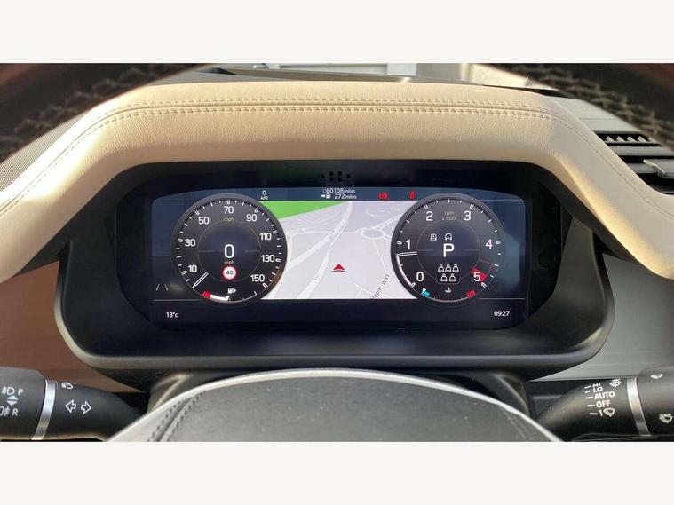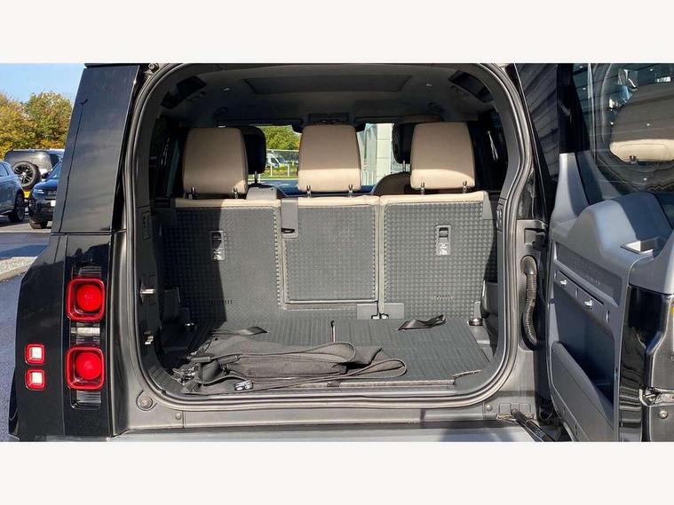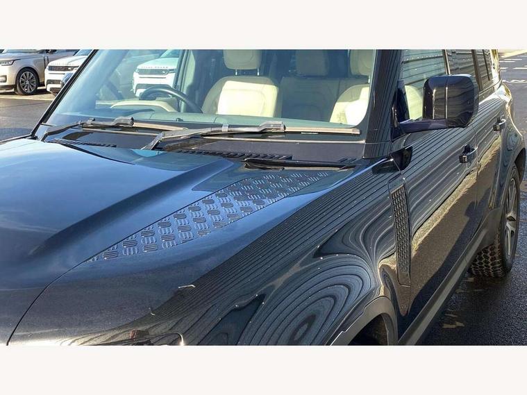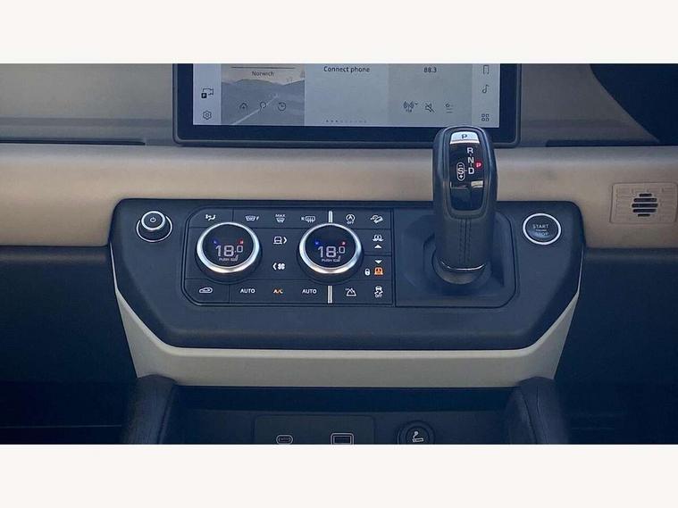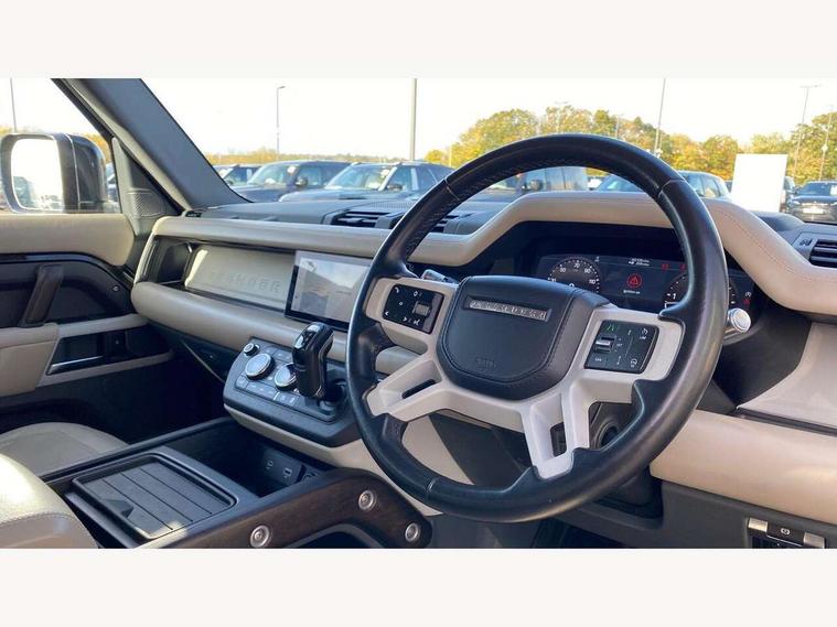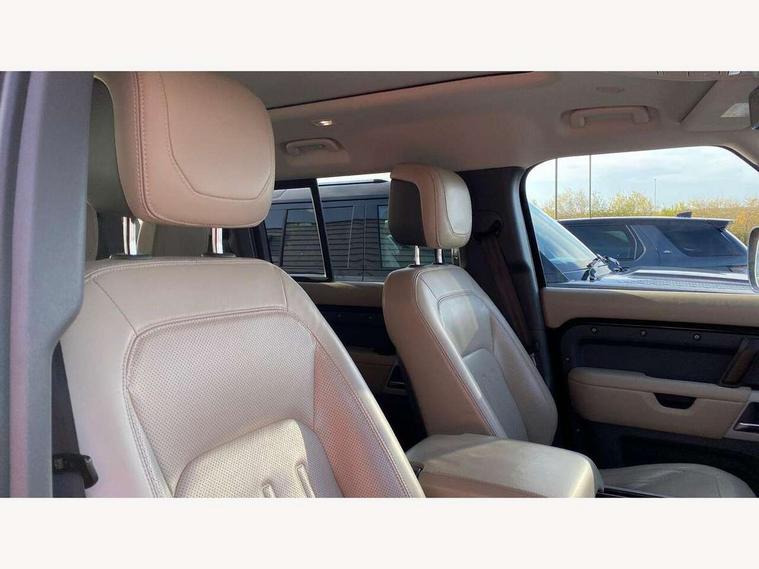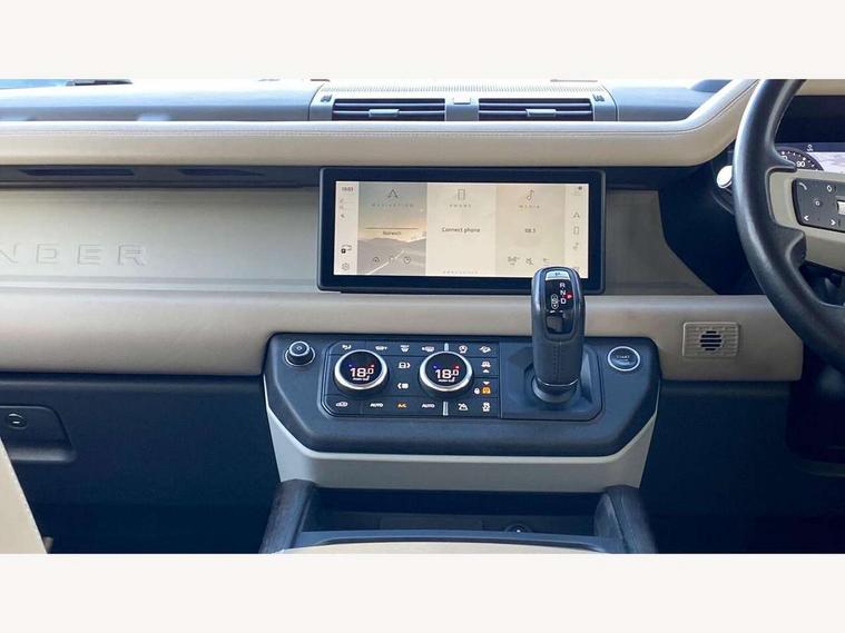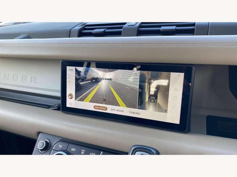 10" touch screen, 360 degree parking aid, 3D Surround Camera with 360 View, 180 Rear View, Front Traffic Detection, Forward Vehicle Guidance, Tow Hitch Assist and clear sight Ground View, Adaptive cruise control, Android Auto, Apple CarPlay, Blind spot assist, Bluetooth system, Clear exit monitor, Click and go integrated base unit, Connected navigation pro, Driver condition monitor, Interactive driver display, Lane keep assist, PAS, Pivi Pro connected navigation system with upgraded Infotainment, Rear collision monitor, Rear traffic monitor, Traffic sign recognition with adaptive speed limiter, Trip computer, Wade Sensing, Adaptive dynamics, Electronic air suspension, DAB Radio (Digital Audio Broadcasting), Automatic headlight levelling, Automatic headlights, ClearSight interior rear view mirror, Front fog lights, Heated windscreen, LED tail lights, Matrix LED headlights with signature DRL, Power fold, auto-dimming, heated door mirrors with memory and approach lights, Puddle lights, Rain sensing windscreen wipers, Signature graphic (with interior storage), Sliding panoramic roof, Standard treadplates, 14 way heated and cooled electric adjustable memory front seats with 4 way manual headrests, Air quality sensor, Cabin air ionisation, Carpet mats, Electric reach + rake adjustable steering column, Extended leather upgrade, Front passenger isofix child seat attachment, Heated steering wheel, Leather gearshift, Leather steering wheel, Loadspace cover, Morzine headlining, Multifunction steering wheel, Rear headrests, Rear ISOFIX, Sunvisors with illuminated vanity mirrors, Three-zone Climate Control with Rear Cooling Assist, Twin front cupholders with cover, Windsor leather upholstery, Online pack with data plan - Defender, 7 three point seatbelts, ABS, Driver and passenger airbags, Emergency braking, ESP + traction control, TPMS (Tyre pressure monitoring system), Alarm, Immobiliser, Intrusion sensor, Keyless entry and go, Locking wheel nuts, Remote locking,