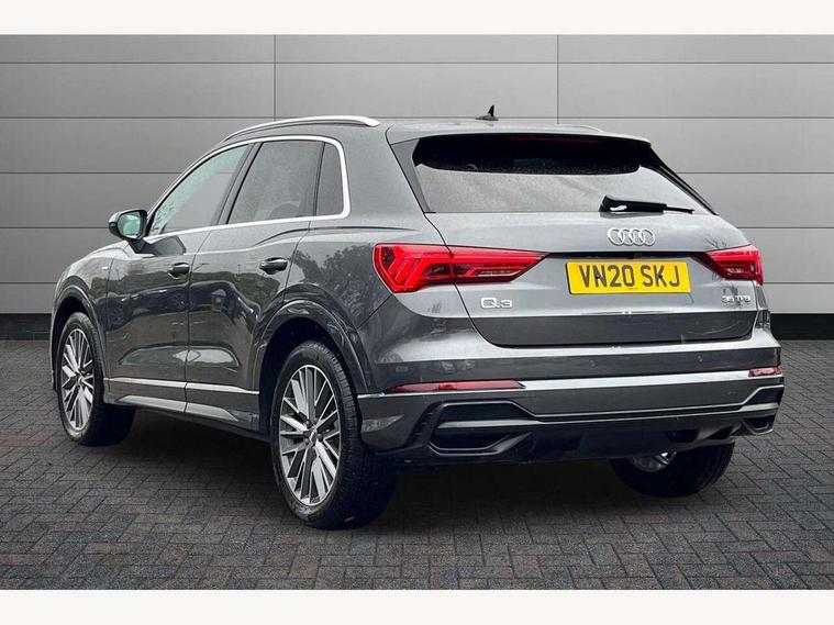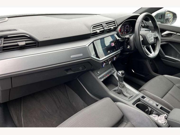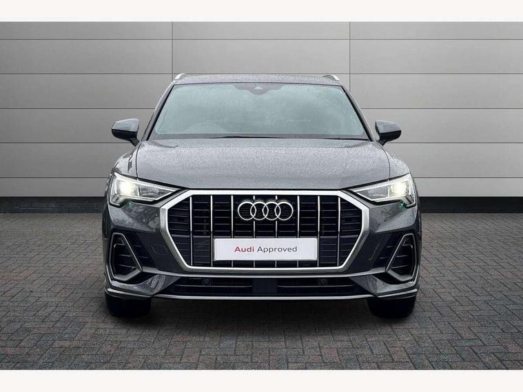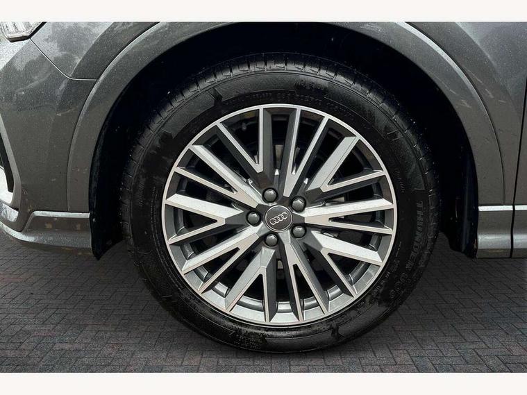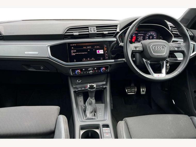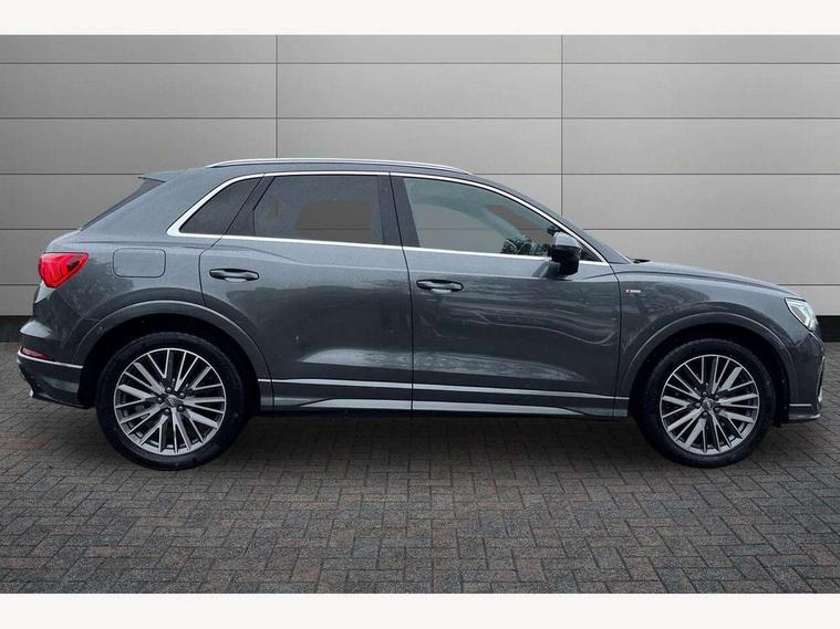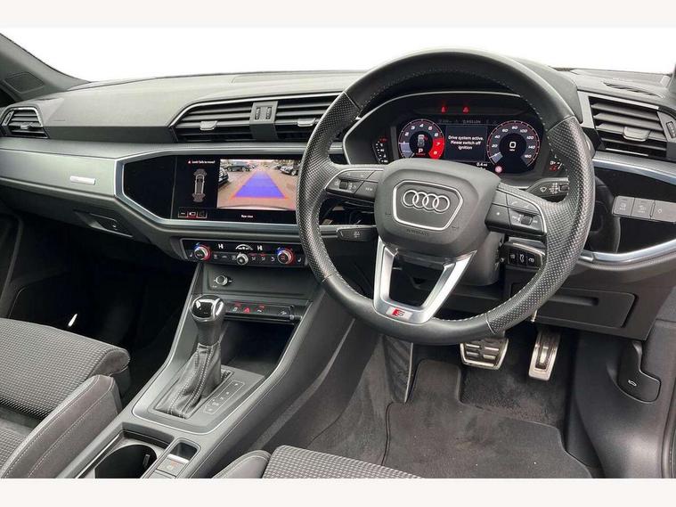 Audi connect safety and service (e-call), Audi drive select, Audi lane departure warning, Audi side assist, Audi Virtual Cockpit - 10.25" display, Bluetooth interface, Camera based traffic sign recognition, MMI Navigation Plus with high resolution 10.1 inch touchscreen colour display, Power operated tailgate, Progressive steering, Service interval indicator, Smartphone interface includes wireless Apple carplay/Android Auto, Start stop system with recuperation, Voice control system with natural language interaction, 48V Mild hybrid technology, Sports suspension, 1 x USB type C and 1 USB type A charging points, 6 passive loudspeakers, DAB digital radio module, Acoustic windscreen, Aluminium roof rails, Aluminium window trim, Auto dimming frameless rear view mirror, Body coloured bumpers, Electrically folding, adjustable and heated door mirrors with integrated LED side indicators and kerb view function for passenger side, Front and rear electric windows, Front fog lights, Front side air inlets in matt platinum grey, Front spoiler blade in matt platinum grey, Grille vertical bars in aluminium silver/Matt, High gloss black finish B and C pillars, LED headlights with LED daytime running lights and dynamic rear indicator, LED rear lights, Privacy glass dark tinted rear and rear-side windows (from B-pillar backwards), Rain and light sensors, Rear diffuser strip in matt titanium black, S line badges on front wings, S Line front and rear bumpers, Side skirt insert in matt Platinium grey, Silver chrome grille surround, Titanium black radiator grille, 12V socket in rear centre console, 40:20:40 folding with manual adjustment for 60:40 forwards/backwards position and backrest angle, Adjustable rear seat bench/backrest with centre armrest and cupholder, Black cloth headlining, Dual zone electronic climate control, Front and rear black floor mats with contrast stitching in rock grey, Front and rear headrests, Front and rear roof module including reading lights, Front centre armrest, Glove compartment lighting, Height and reach adjustable steering wheel, Illuminated door sill trims with S logo, ISOFIX child seat mounting for front passenger with airbag deactivation and outer rear seat including top tether attachment point for outer rear seats, Luggage compartment light, Manual front seats with height adjustment, Perforated leather gearknob, Stainless steel luggage compartment sill finisher, Stainless steel pedals, Non smoking pack - Q3, 3x3 point rear seatbelts, 6 airbags - Driver, front passenger, curtain and side windows, Audi pre-sense front with pedestrain and cyclist recognition, Electrically operated child locks on rear doors, Electromechanical parking brake, Electronic stabilisation control including ABS, ASR and EDL, Hill descent control, Hill hold assist, Pre sense basic, Seatbelt monitoring, Tyre pressure warning, Warning triangle and first aid kit, Anti theft alarm, Anti theft wheel bolts, Remote central locking, Dark matt brushed aluminium inlay, Detail dashboard around MMI touch colour display in glass look, black with surround in aluminium look, Leatherette door armrest, Tool kit, Tyre repair kit,
