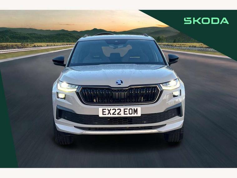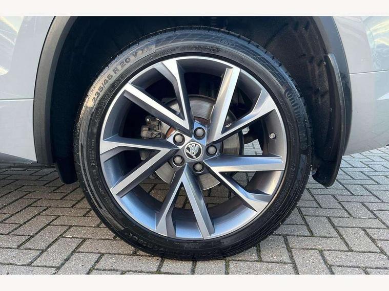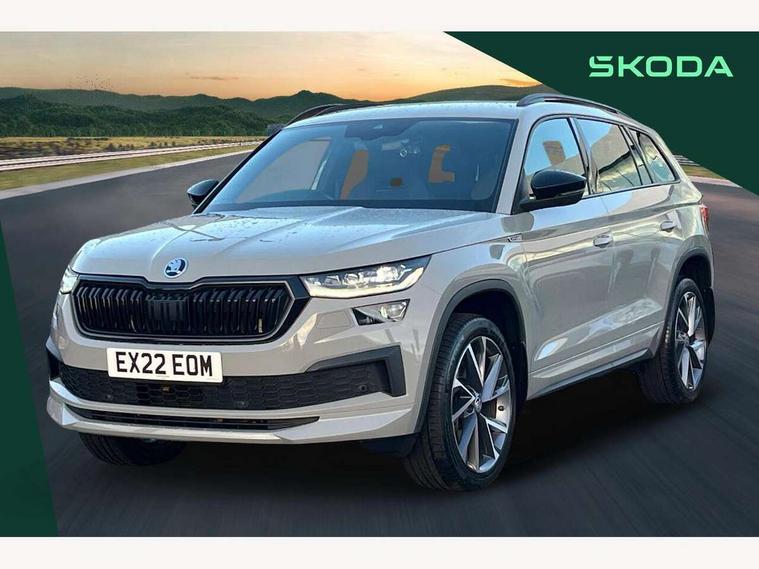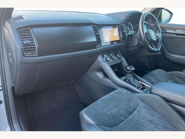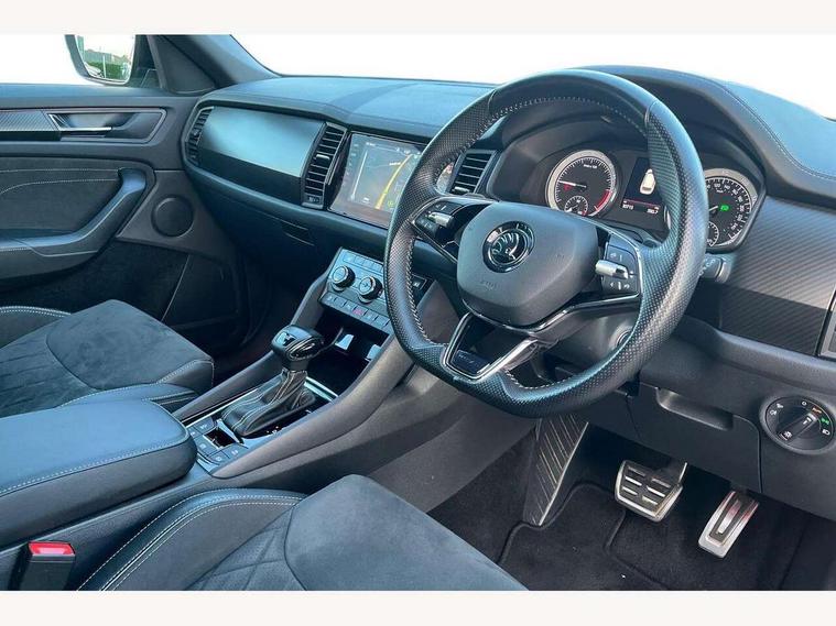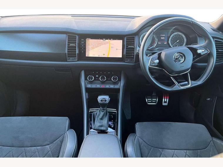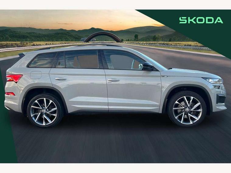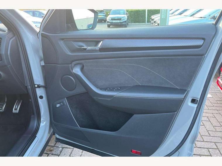Bluetooth system, Columbus satellite navigation with 9.2" touchscreen, integrated Wi-Fi, web radio, E-call, ECO Stop/start function, Exterior temperature indicator, Progressive steering, Rear view camera, Smartlink wireless for apple carplay and wired for android auto, Speed limiter, Tailgate unlocking from outside, USB C Port x 2 in front centre console, Wireless charging, 8 Speakers, DAB Digital radio, Aero front windscreen wipers with intermittent function, Aero rear window wiper, Auto dimming rear view mirror, Black roof rails, Black sports styling including front grille and window surrounds, Black wheel arch surrounds, Body colour bumpers, Body colour door handles, Electric adjustable/heated/folding door mirrors, driver side auto dimming with boarding sports and memory function, Electric front and rear windows, Extended rear spoiler with finlets in gloss black, Front fog lights, Full LED matrix headlights with AFS (adaptive front light system), cornering function and AWL (all weather lighting system), Gloss black door mirrors, Headlight washers, Heated rear window, Invisible tailpipe, LED daytime running lights, LED rear fog light, LED third brake light in rear spoiler, Light assistant (coming/leaving home/tunnel light), Off-road style lower front bumper element, Privacy glass, Rain and light sensors, Rear diffuser, Rear LED lights (high functionality) with welcome effect and dynamic indicators, Rear side wing doors, Safety reflectors on front and rear doors, Sportline badge on front fender, Sports front and rear bumpers including lower rear chrome strip, Tailgate lettering in Black, Window control switches with black trim, Without engine designation, 12V socket in boot, 2 rails with 2 hooks, 2 seat bench in 3rd row, 3 seat bench in 2nd row, 4 foldable roof handles with rear coat hooks, 60:40 foldable rear seat with sliding adjustment and backrest angle adjustment, Aluminium pedals, Black roof headlining, Bottle holders in door panel in the 1.5 litre front and 1 litre rear, Cargo storage compartments, Chrome headlight control button, Chrome interior door handles, Coat hooks on B pillar, Covered storage compartment on driver side, Decorative door sills in the front and rear, Front centre armrest with storage compartment, cup holder and 12V socket, Front courtesy lights, Gear shift lever with chrome frame and black gloss insert, Grey stitching in front and rear armrests and door armrests + door inserts, Height adjustable front headrests, Illuminated and cooled glovebox, Illuminated luggage compartment, Isofix child seat fittings in outer rear seats with top tether, Manually adjustable steering column, Microsuede door panels, Net programme in boot (1x horizontal Net, 2x vertical Nets), Overhead glasses storage compartment, Pollen filter, Rear centre armrest with cupholders, Single front passenger seat, Sliding trunk cover, Small Bags on the inner sides of the front backrests, Sports seats, Sunvisors with illuminated vanity mirrors, Three rear height adjustable headrests, Ticket holder on A Pillar, Umbrella in door panel, Variable boot floor, LED Interior light pack - Kodiaq, Auto door release and activation of warning lights in the event of an accident, Child locks on rear doors, Driver and front passenger airbag with knee airbag and front passenger airbag deactivation, Electronic parking brake with hill start assist, Emergency rear braking signal, ESC (incl. ABS+MSR+ASR+EDS+HBA+DSR+RBS+MKB), Front assist with autonomous emergency braking, Front side airbags with curtain airbags, Fuel cut off safety device, Height adjustable front 3 point seatbelts + pretensioners, Hill hold control, Rear disc brakes, Safety vest holder in door, Seat belt reminder for all seats, Three point rear seat belts, Two tone horn, Tyre pressure monitor, Alarm with interior monitoring and tilt sensor with safe function, Anti-theft wheel bolts, Immobiliser, Keyless entry and start system (KESSY), Remote central locking with 2 keys, Black air vent surround, Carbon finish dashboard and door inserts, Grey stitching in dashboard, 20" Vega Anthracite alloy wheels, Temporary spare wheel (space saver),