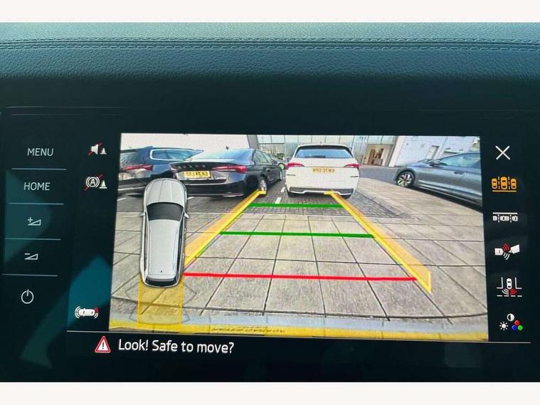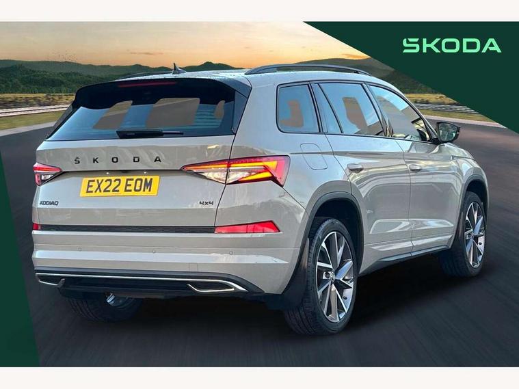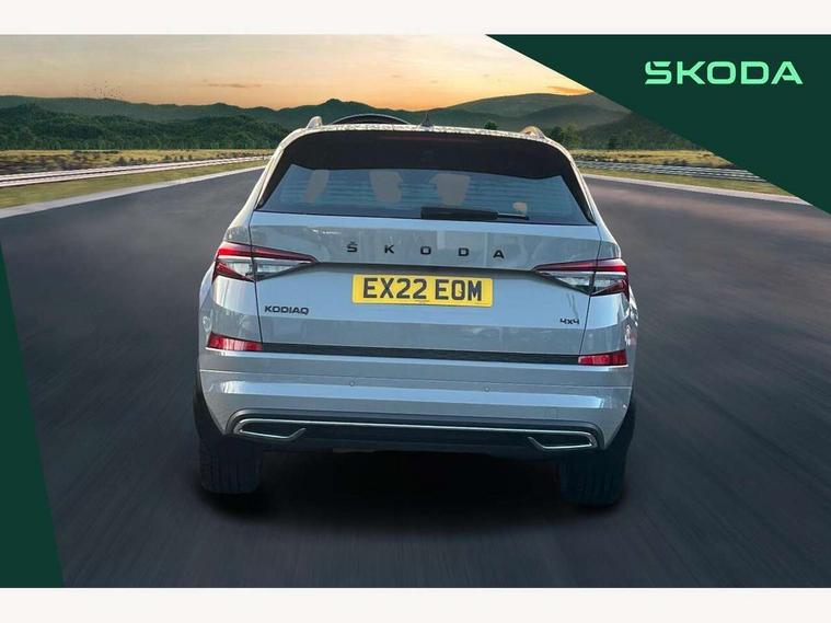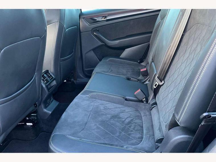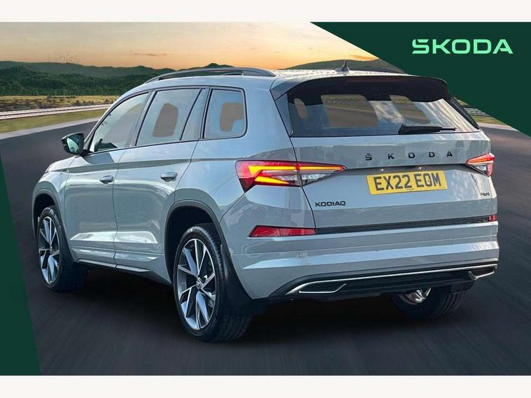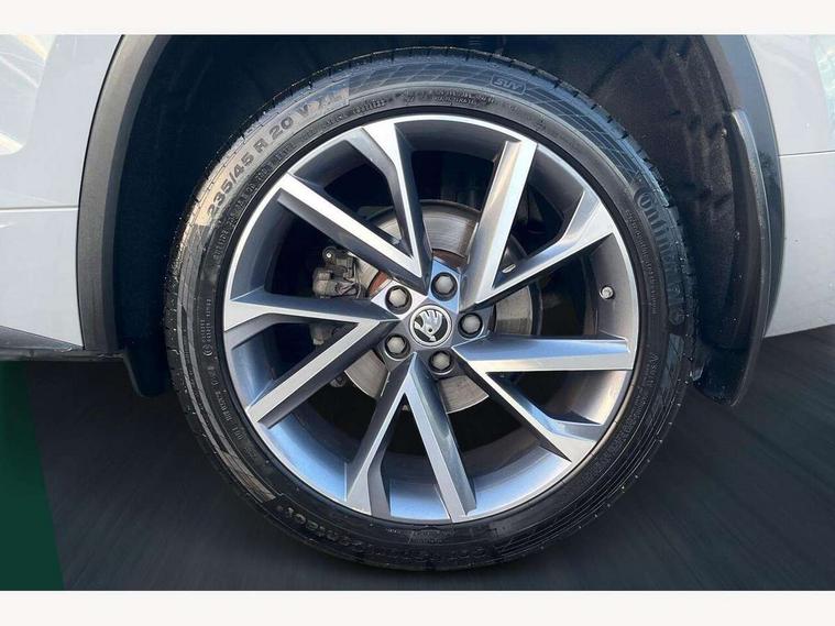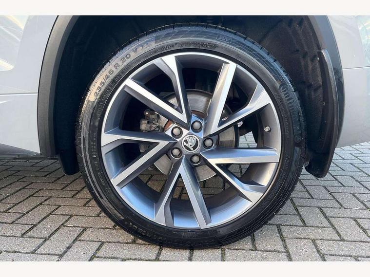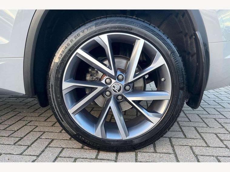 Bluetooth system, Columbus satellite navigation with 9.2" touchscreen, integrated Wi-Fi, web radio, E-call, ECO Stop/start function, Exterior temperature indicator, Progressive steering, Rear view camera, Smartlink wireless for apple carplay and wired for android auto, Speed limiter, Tailgate unlocking from outside, USB C Port x 2 in front centre console, Wireless charging, 8 Speakers, DAB Digital radio, Aero front windscreen wipers with intermittent function, Aero rear window wiper, Auto dimming rear view mirror, Black roof rails, Black sports styling including front grille and window surrounds, Black wheel arch surrounds, Body colour bumpers, Body colour door handles, Electric adjustable/heated/folding door mirrors, driver side auto dimming with boarding sports and memory function, Electric front and rear windows, Extended rear spoiler with finlets in gloss black, Front fog lights, Full LED matrix headlights with AFS (adaptive front light system), cornering function and AWL (all weather lighting system), Gloss black door mirrors, Headlight washers, Heated rear window, Invisible tailpipe, LED daytime running lights, LED rear fog light, LED third brake light in rear spoiler, Light assistant (coming/leaving home/tunnel light), Off-road style lower front bumper element, Privacy glass, Rain and light sensors, Rear diffuser, Rear LED lights (high functionality) with welcome effect and dynamic indicators, Rear side wing doors, Safety reflectors on front and rear doors, Sportline badge on front fender, Sports front and rear bumpers including lower rear chrome strip, Tailgate lettering in Black, Window control switches with black trim, Without engine designation, 12V socket in boot, 2 rails with 2 hooks, 2 seat bench in 3rd row, 3 seat bench in 2nd row, 4 foldable roof handles with rear coat hooks, 60:40 foldable rear seat with sliding adjustment and backrest angle adjustment, Aluminium pedals, Black roof headlining, Bottle holders in door panel in the 1.5 litre front and 1 litre rear, Cargo storage compartments, Chrome headlight control button, Chrome interior door handles, Coat hooks on B pillar, Covered storage compartment on driver side, Decorative door sills in the front and rear, Front centre armrest with storage compartment, cup holder and 12V socket, Front courtesy lights, Gear shift lever with chrome frame and black gloss insert, Grey stitching in front and rear armrests and door armrests + door inserts, Height adjustable front headrests, Illuminated and cooled glovebox, Illuminated luggage compartment, Isofix child seat fittings in outer rear seats with top tether, Manually adjustable steering column, Microsuede door panels, Net programme in boot (1x horizontal Net, 2x vertical Nets), Overhead glasses storage compartment, Pollen filter, Rear centre armrest with cupholders, Single front passenger seat, Sliding trunk cover, Small Bags on the inner sides of the front backrests, Sports seats, Sunvisors with illuminated vanity mirrors, Three rear height adjustable headrests, Ticket holder on A Pillar, Umbrella in door panel, Variable boot floor, LED Interior light pack - Kodiaq, Auto door release and activation of warning lights in the event of an accident, Child locks on rear doors, Driver and front passenger airbag with knee airbag and front passenger airbag deactivation, Electronic parking brake with hill start assist, Emergency rear braking signal, ESC (incl. ABS+MSR+ASR+EDS+HBA+DSR+RBS+MKB), Front assist with autonomous emergency braking, Front side airbags with curtain airbags, Fuel cut off safety device, Height adjustable front 3 point seatbelts + pretensioners, Hill hold control, Rear disc brakes, Safety vest holder in door, Seat belt reminder for all seats, Three point rear seat belts, Two tone horn, Tyre pressure monitor, Alarm with interior monitoring and tilt sensor with safe function, Anti-theft wheel bolts, Immobiliser, Keyless entry and start system (KESSY), Remote central locking with 2 keys, Black air vent surround, Carbon finish dashboard and door inserts, Grey stitching in dashboard, 20" Vega Anthracite alloy wheels, Temporary spare wheel (space saver),
