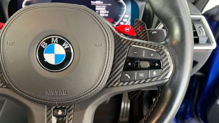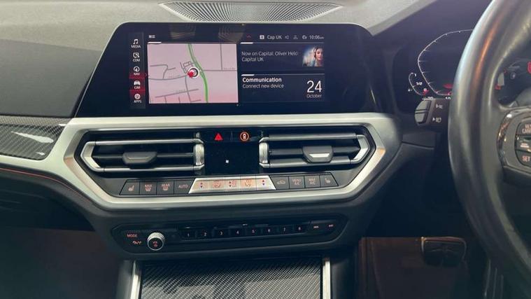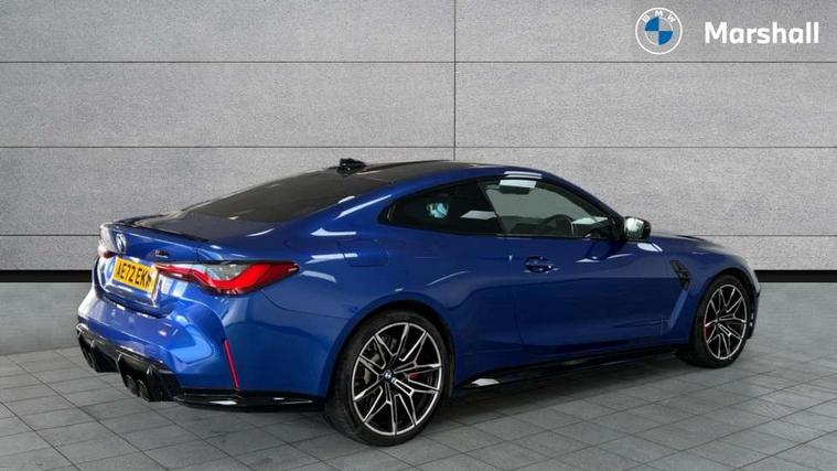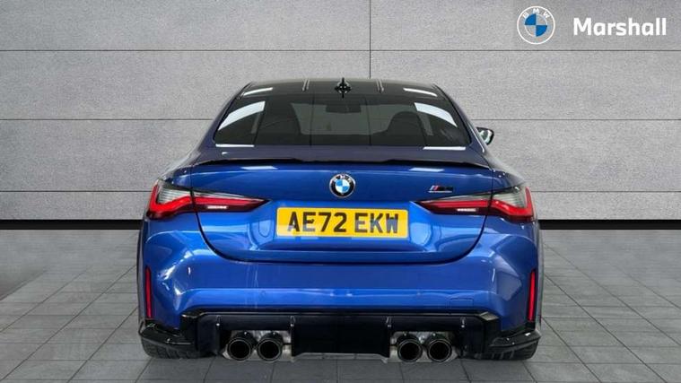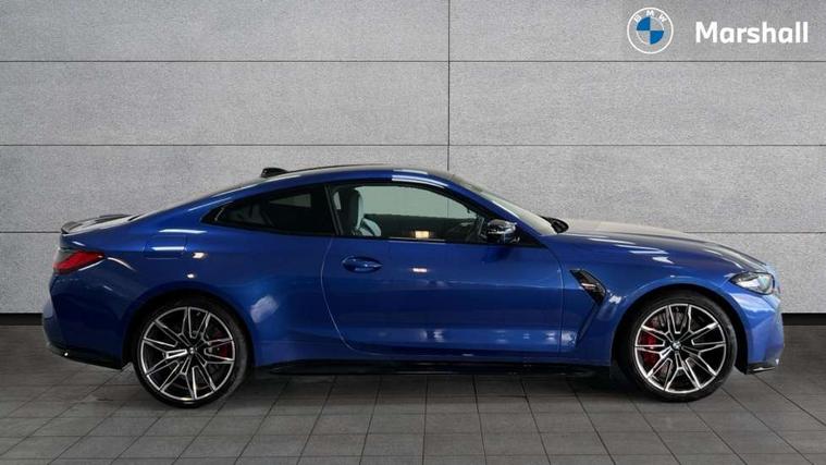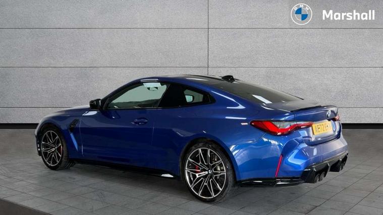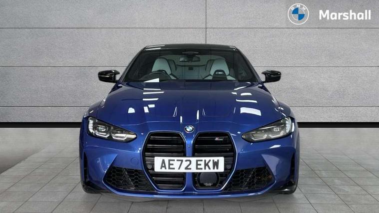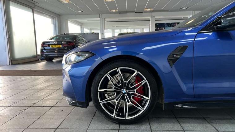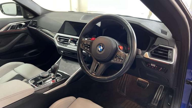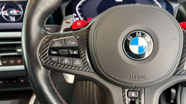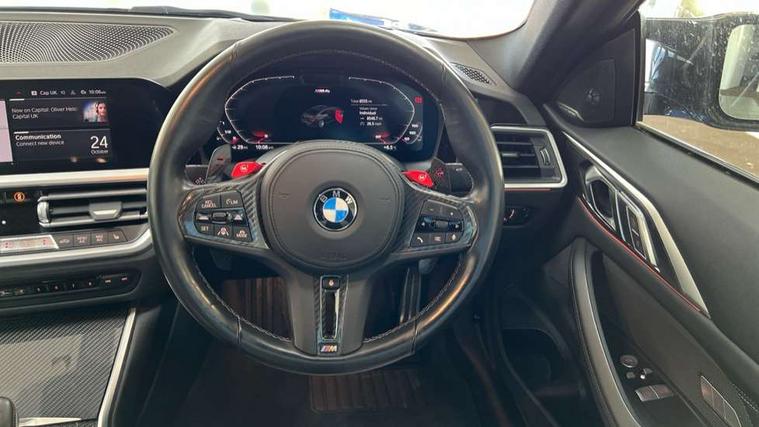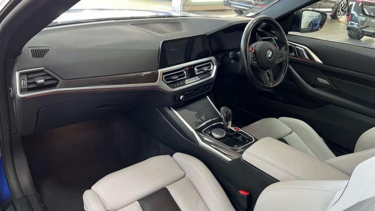 Active guard plus, Automatic start/stop system, BMW ConnectedDrive online services, BMW iDrive controller on centre console, BMW legal emergency call, BMW Live Cockpit Professional sat nav system with 12.3" instrument display and high resolution control display, BMW Teleservices, Brake pad wear indicator warning light, Condition based service, Connected drive services, Door/boot open warning light, Driving experience switch, Electric Power Steering (EPS) with Servotronic, Enhanced bluetooth with wireless charging, Head up Display, Instrument cluster with extended contents, Lights on warning, M drive buttons, Oil sensor for level and grade, warning by check control system, Oil temperature gauge, On board computer, On board diagnostics, Optimum shift indicator, Outside temperature display, Pull away assistant, Run flat indicator, Service interval indicator, Shifting point display, Speed limiter, Variable sport steering, Wi-Fi hotspot, Adaptive M Sport suspension, Double joint spring strut front axle, M Drive Professional including track mode, laptimer, traction control & Drift analyser, M Sport differential, M steptronic sport transmission with drivelogic, Safety battery terminal clamp, 8 programmable favourite buttons, Auxiliary point for auxiliary devices, BMW professional radio/CD/MP3, DAB Digital radio, Harman/Kardon loudspeaker system, Acoustic laminated side glass, Auto dimming driver's door mirror, Auto dimming rear view mirror, Automatic headlights + automatic windscreen wipers, Black chrome exhaust tailpipes, Black model designation badges, BMW high gloss shadow line with extended contents, BMW Individual shadowline lights, Body colour bumpers, Body colour door handles, Carbon fibre reinforced plastic (CFRP) roof, Day time running light, Door mirror integrated indicators, Door sill finishers with aluminium inserts, Dynamic brake lights, Electric adjustable heated door mirrors, Electric folding door mirrors, Follow me home headlights, Front and rear bumper system, Front electric windows with open and close fingertip control, anti trap facility and comfort closing, Headlight beam throw control, Heat protection, sun protection glazing, Heated washer jets, High beam assistant, High gloss black frameless kidney grille with M badge, LED number plate light, LED tail lights with 3D L-shaped LED light design, M designation, Mirror glass aspheric on driver's side, convex on passenger side, Rain sensor, Rear boot, Rear fog lights, Rear reflectors, Reversing light, Shark fin roof aerial, Third brake light, Visible VIN plate, Welcome lighting, 2 cupholders in front centre console, 2 rear head restraints, 2 x 12 V Power sockets (luggage compartment and front centre console), 2 x USB Type C ports for charging and data transmission in front centre console, 2 x USB Type C ports for charging in rear centre console, 40:20:40 split folding rear 2 seat bench with loading system, Ambient lighting, Anthracite headlining, Battery in luggage compartment, Carbon fibre centre console incl. cover for cupholders, Carbon fibre decorative steering wheel finishers, Carbon fibre shift paddles, Carbon fibre strip in instrument panel on front passenger side, Centre console armrest with storage compartment, Compartment in front of cupholder, Driver/passenger sunvisors with illuminated vanity mirrors + covers, Electric front seats + driver memory, English handbook, Floor mats in velour, Footwell lighting, Front and rear door exit lights, Front door storage bins with bottle holder, Front interior light, Front isofix attachment + airbag deactivation, Front seat backrest width adjustment, Front seats lumbar support, Front/rear door armrests, Gearshift lever with embossed M badge, Heated front seats, Height adjustable front headrests, Interior mirror lighting, Isofix on 2nd row outer seats, Lockable/illuminated glovebox, Luggage compartment lighting, Multifunction steering wheel, Rake/reach adjustable steering wheel, Single front passenger seat, Storage compartment in rear doors, Storage tray and compartment with cover in centre console, Three zone automatic air conditioning, Toolkit located in luggage compartment, Additional storage compartment pack - M4, Connected package professional - M4, High gloss shadowline exterior trim pack - M4, 4 x 3 point seatbelts, ABS/EBD, Automatic Stability Control (ASC), Brake energy regeneration, Brake fade compensation, Compound structure brake discs, Cornering brake control (CBC), Crash sensor, Curtain airbags, Driver/Front Passenger airbags, Dry braking, Dynamic brake control, Dynamic Stability Control with M Dynamic mode, Dynamic Traction Control - DTC, Electromechanical parking brake, Electronic differential lock control (EDLC), Front and rear head airbags, Front seat side impact airbags, Front seatbelt pretensioners + load limiters, Hill start assist, M Sport seat belts, Seatbelt warning, Side impact protection, Two tone horn, Tyre pressure sensor, Warning triangle and first aid kit, Centre lock switch, Closing system with central locking, Digital key, Electronic immobiliser, Remote central locking, Thatcham cat 1 remote alarm, Vehicle Key with 4 buttons including the integrated key, Galvanic finish to control surrounds, High gloss black interior trim, Tyre repair kit,