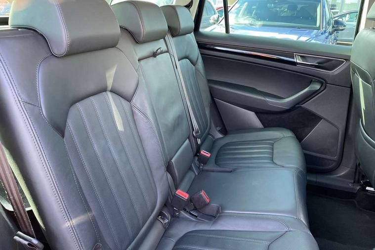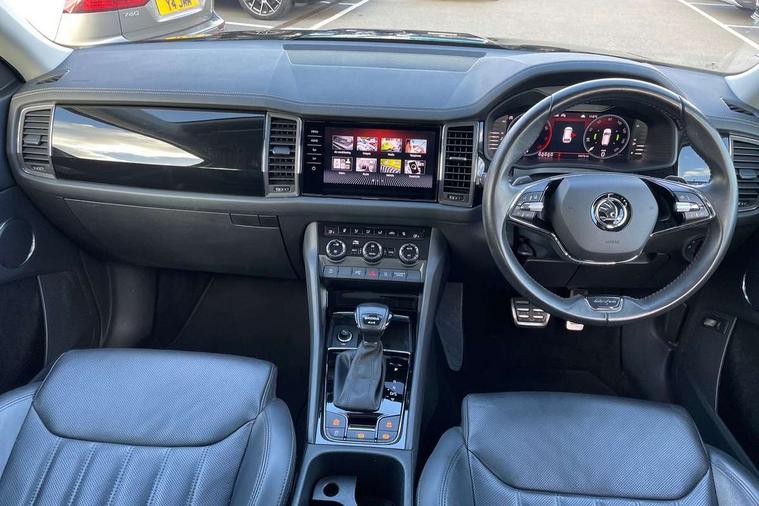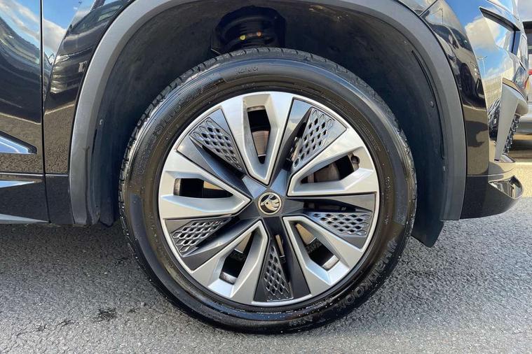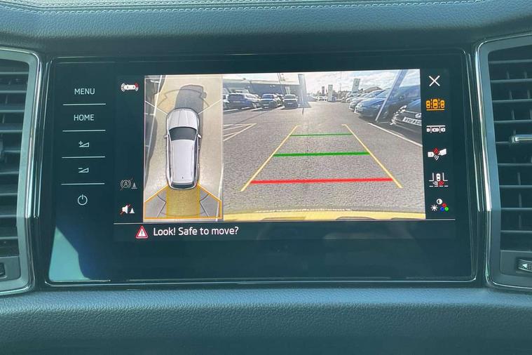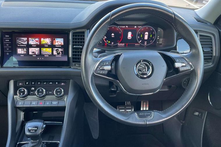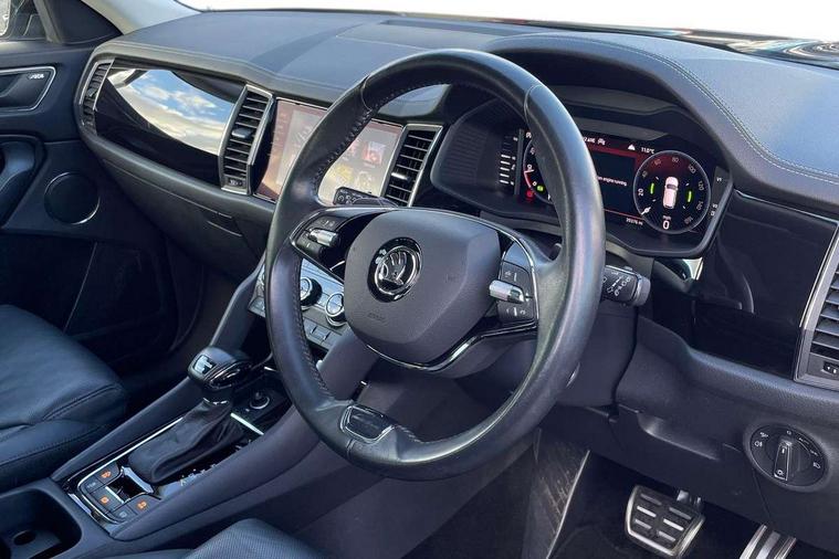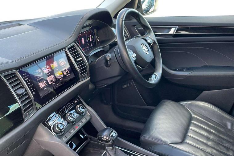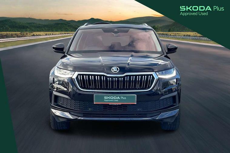 Area view, Blind spot detection system, Bluetooth system, Columbus satellite navigation with 9.2" touchscreen, integrated Wi-Fi, web radio, Digital voice enhancement, E-call, ECO Stop/start function, Exterior temperature indicator, Progressive steering, Smartlink wireless for apple carplay and wired for android auto, Speed limiter, Tailgate unlocking from outside, USB C Port x 2 in front centre console, Virtual Cockpit - 10.25" digital display, Wireless charging, Canton sound system, DAB Digital radio, Aero front windscreen wipers with intermittent function, Aero rear window wiper, Auto dimming rear view mirror, Black wheel arch surrounds, Body colour bumpers, Body colour door mirrors and handles, Body colour door panels, Chrome front grille, Chrome roof rails with chrome window surround, Electric adjustable/heated/folding door mirrors, driver side auto dimming with boarding sports and memory function, Electric front and rear windows, Extended rear spoiler with finlets in gloss black, Front fog lights, Full LED matrix headlights with AFS (adaptive front light system), cornering function and AWL (all weather lighting system), Headlight washers, Heated rear window, Invisible tailpipe, L&K front and rear bumpers including lower rear chrome strip, LED daytime running lights, LED rear fog light, LED third brake light in rear spoiler, Light assistant (coming/leaving home/tunnel light), Off-road style lower front bumper element, Panoramic sunroof, Privacy glass, Rain and light sensors, Rear LED lights (high functionality) with welcome effect and dynamic indicators, Rear side wing doors, Safety reflectors on front and rear doors, Window control switches with black trim, Without engine designation, 12V socket in boot, 2 rails with 2 hooks, 2 seat bench in 3rd row, 3 seat bench in 2nd row, 4 foldable roof handles with rear coat hooks, 60:40 foldable rear seat with sliding adjustment and backrest angle adjustment, Aluminium pedals, Bottle holders in door panel in the 1.5 litre front and 1 litre rear, Cargo storage compartments, Chrome headlight control button, Chrome interior door handles, Coat hooks on B pillar, Covered storage compartment on driver side, Front centre armrest with storage compartment, cup holder and 12V socket, Front courtesy lights, Gear shift lever with chrome frame and black gloss insert, Grey stitching in front and rear armrests and door armrests + door inserts, Height adjustable front headrests, Illuminated and cooled glovebox, Illuminated luggage compartment, Isofix child seat fittings in outer rear seats with top tether, Manually adjustable steering column, Net programme in boot (1x horizontal Net, 2x vertical Nets), Overhead glasses storage compartment, Pollen filter, Rear centre armrest with cupholders, Single front passenger seat, Sliding trunk cover, Small Bags on the inner sides of the front backrests, Sunvisors with illuminated vanity mirrors, Three rear height adjustable headrests, Ticket holder on A Pillar, Umbrella in door panel, Variable boot floor, LED Interior light pack - Kodiaq, Auto door release and activation of warning lights in the event of an accident, Child locks on rear doors, Driver and front passenger airbag with knee airbag and front passenger airbag deactivation, Electronic parking brake with hill start assist, Emergency rear braking signal, ESC (incl. ABS+MSR+ASR+EDS+HBA+DSR+RBS+MKB), Front assist with autonomous emergency braking, Front side airbags with curtain airbags, Fuel cut off safety device, Height adjustable front 3 point seatbelts + pretensioners, Hill hold control, Rear disc brakes, Safety vest holder in door, Seat belt reminder for all seats, Three point rear seat belts, Two tone horn, Tyre pressure monitor, Alarm with interior monitoring and tilt sensor with safe function, Anti-theft wheel bolts, Immobiliser, Keyless entry and start system (KESSY), Remote central locking with 2 keys, Grey stitching in dashboard, Piano black decorative inserts, Plaquette L&K front fenders, Temporary spare wheel (space saver),