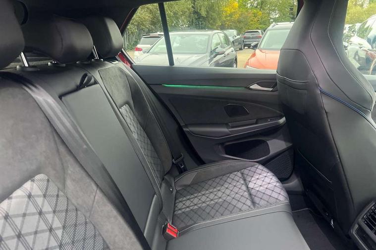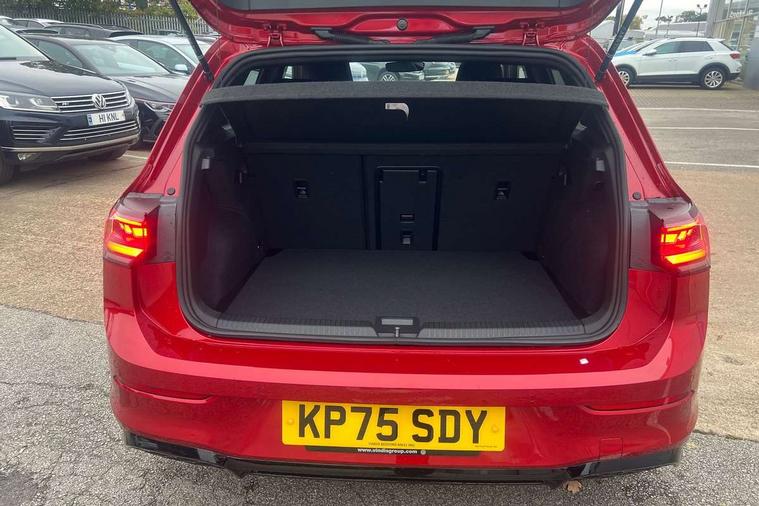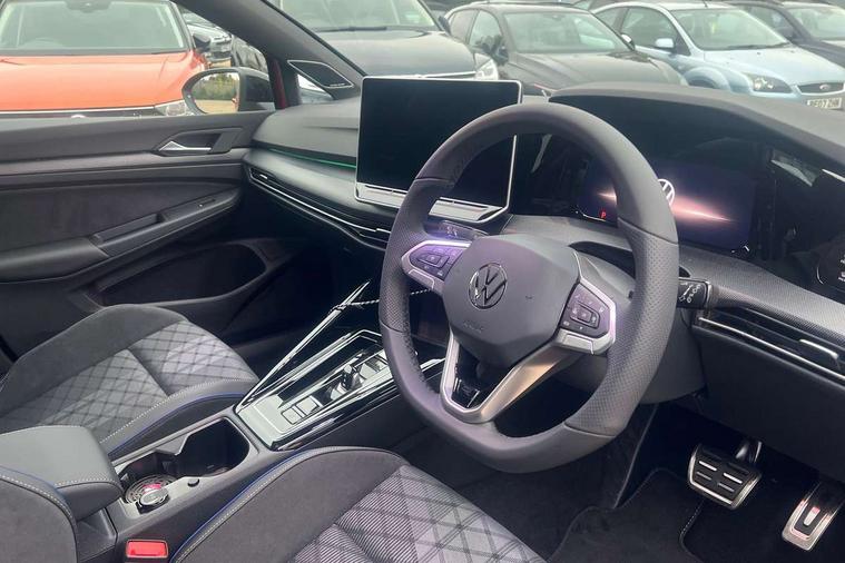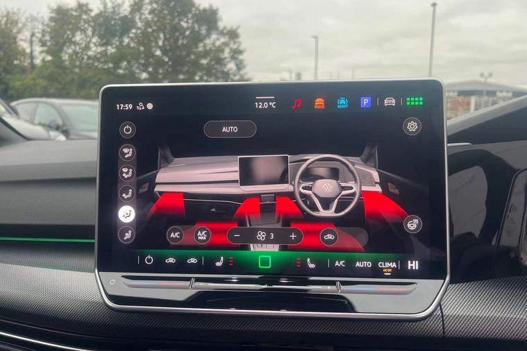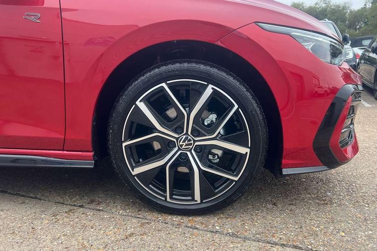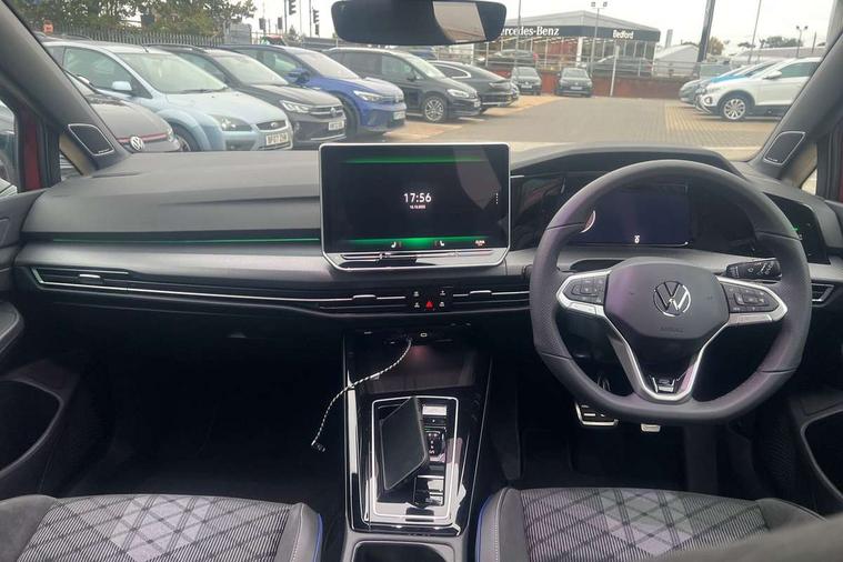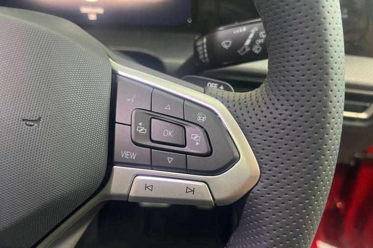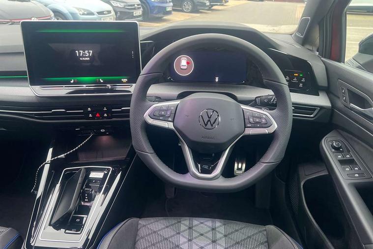 Activated carbon canister, Adaptive cruise control (ACC), Advanced driver attention and drowsiness monitor, Dynamic road sign display, Dynamic steering, E-Sim card for online connectivity, eCall emergency call system, Multi-color Digital cockpit pro, selection of different info profile possible, Multifunction front facing camera for distance control, Navigation system, Oncoming vehicle braking when turning including swerve support, Speed limiter, Speedo, rev counter, electronic odometer, trip, service interval display, exterior temperature and fuel gauge, Traffic jam assist, Voice enhancer and voice control, Warning signal and warning light for front and rear seatbelts not fastened, We connect plus preparation, We connect preparation, Wireless app connect, Hybrid propulsion system, Petrol Particulate Filter, Start-stop system with battery regeneration (recuperation - energy recovery during braking), XDS electronic differential lock for improved traction and handling, 2 USB C ports in front, 2 USB charging sockets on the centre console in the rear charging capacity upto 45W, Digital radio reception (DAB), Diversity antenna for FM reception, Gaming platform via car app, Infotainment system with 12.9" display, Mobile phone interface with inductive charging feature, 3rd brake light, Auto dimming rear view mirror, Automatic headlamp activation with Coming home and Leaving home feature, Body colored bumpers in R-Line style, Body colour door handles, Exterior ambient lighting, Exterior mirrors convex on the left and aspherical on the right, Front and rear electric windows, Heat insulating windshield made of laminated glass, LED separate daytime running light, Rain sensor, Rear exhaust tailpipe, Rear fog light on one side and reversing lights on both sides, Rear side wing doors, Rear windscreen washer and wiper with interval delay, Remote electrically foldable door mirrors, puddle lights and reverse activated passenger's door mirror, Volkswagen logo in front, illuminated lighting animation with wake up/goodbye scenario and illuminated door handles, Welcome light with surround lighting, 12V socket in front centre console, 12V socket in luggage compartment, 3 rear head restraints, 3 seat bench in 2nd row, Ambient lighting with 30 colour including LED light unit in front footwell with selectable light colour, Black roof lining, Brushed stainless steel pedals, Chrome plated radiator grille inserts, air vent surrounds and light switch surrounds, Door insert, side trim panel and arm support in leatherette, Front + rear black carpet mats, Front centre armrest, Front seat lumbar support adjuster, Integrated front head restraints, ISOFIX anchors for child seats on outer rear bench seats and on front passanger seat compatible for i-Size, Luggage compartment lighting, Manual height adjustable front passenger seat, Manually height adjustable driver seat, Plastic gear knob, Premium sports seats in front, Rear cupholder and loadthough, Sardegna cloth upholstery with front and outer rear seats Art Velour inner sides of bolsters, Single front passenger seat, Split folding backrest with centre armrest and unsplit rear seat bench, Sun visors with illuminated vanity mirrors, Titanium black instrument panel, Black exterior Styling package with Matrix LED headlights - Golf, Winter package - Golf DSG Estate/Hatchback, 3 point height adj front seatbelts + pretensioners, 3 rear three point seatbelts, ABS, Autonomous emergency braking front assist with pedestrian and cyclist monitoring, Child locks on rear doors, Driver and front passenger airbag with front passenger airbag deactivation, Electronic parking brake with auto hold, ESC (Electronic Stability Control), Extended pedestrian protection measures, Hill start assist, Rear disc brakes, Two tone horn, Tyre pressure loss indicator, Volkswagen roadside assistance, Anti theft wheel bolts, Preparation for alcohol interlock, Decorative inserts carbon grey for dashboard and front door trim panels, 18" Leeds alloy wheels, Tool kit for tyre mobility set, Tyre mobility kit Includes 12V compressor and tyre sealant,