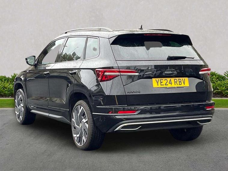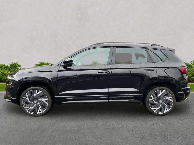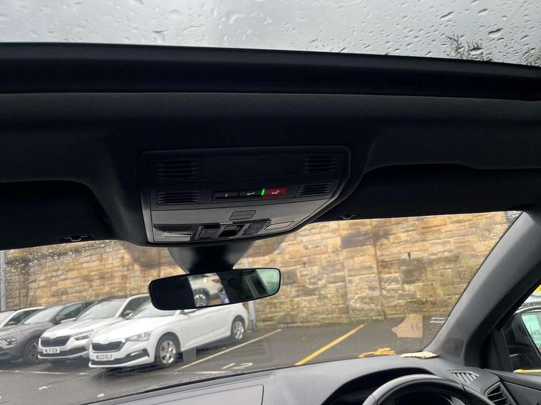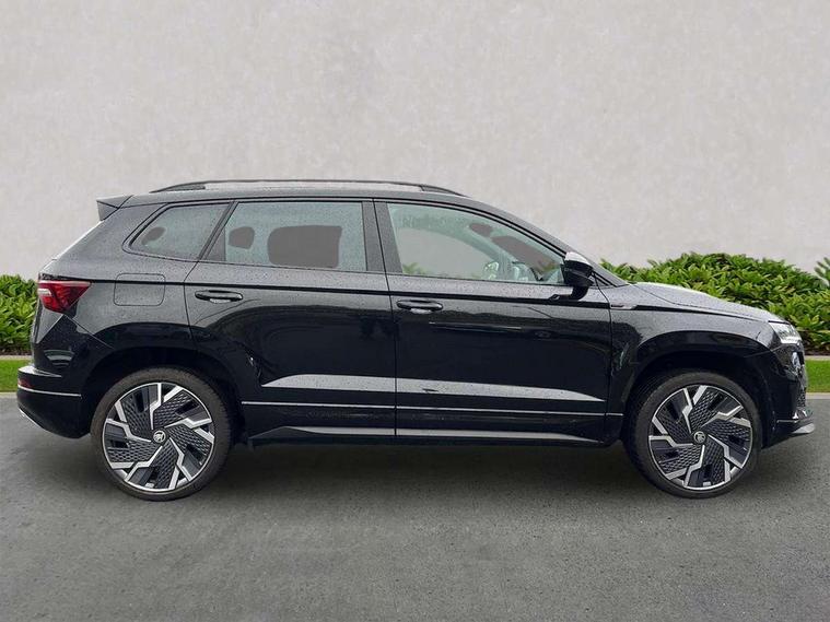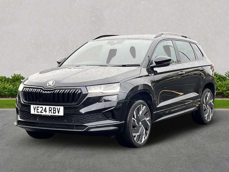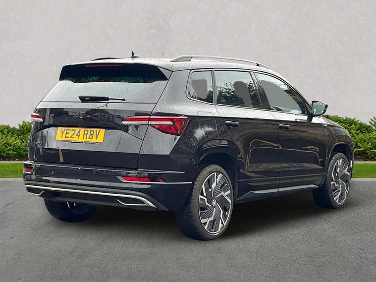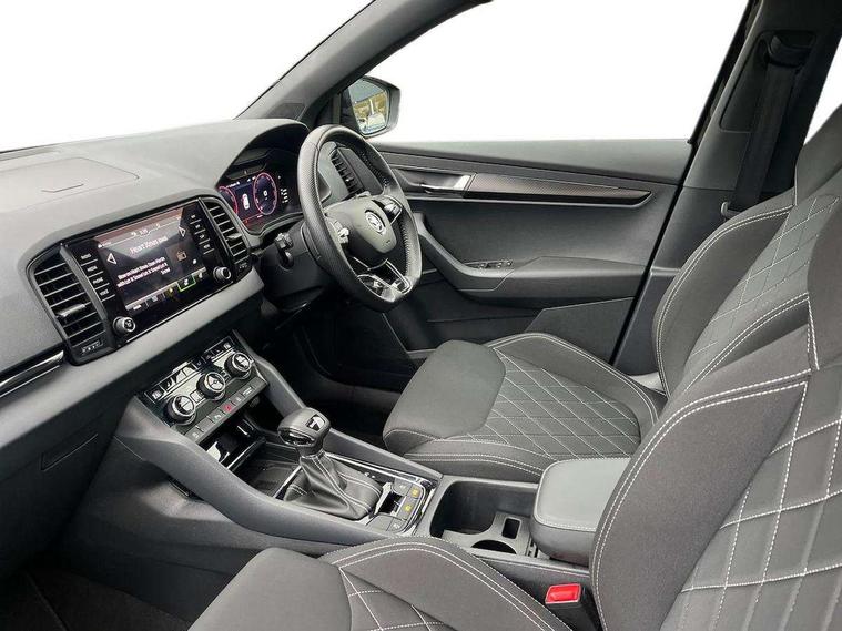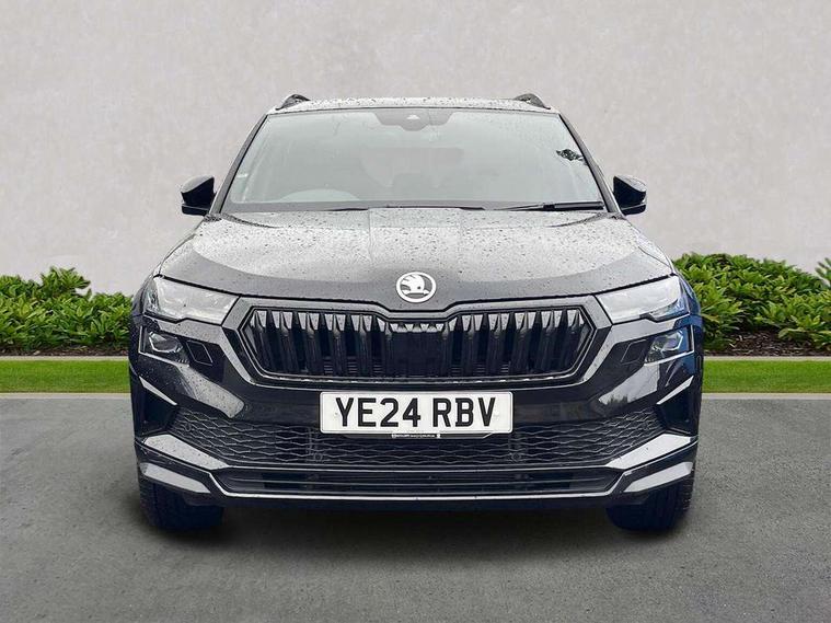 8" Digital display, Advanced driver attention and drowsiness monitor, Emergency services call system, Outside temperature gauge, Sensor for driver assistance systems, Service interval indicator, SmartLink wireless for Apple and wired for Android, Start/stop system with regenerative braking, USB C Port x 2 in front centre console, Virtual Cockpit - 10.25" digital display, Virtual pedal with electrically operated boot door, Wireless smartphone charging, Canton sound system, DAB radio with Bluetooth, USB connection, Acoustic glass, Aero front windscreen wipers with intermittent function, Auto dimming rear view mirror with light and rain sensors, Black door mirrors, Black electric window control buttons, Black radiator grille, Black roof rails, Body colour door handles, Electric front and rear windows with child proof lock, Front door steps with SportLine logo, Heated rear windscreen, LED 3rd brake light, LED daytime running lights, LED rear lights with high functionality welcome effect and dynamic indicators, Light assistant (coming/leaving home/tunnel light), Panoramic sliding sunroof, Plastic scuff plates in door apertures, Privacy glass, Protective door side sills in body colour, Rear diffuser, Rear side wing doors, Rear spoiler, Rear window wiper with washer system and intermittent control, Safety reflectors on front doors, Skoda lettering on tailgate in black, Sportline badge on front fender, Sportline decorative inserts with badging, Sports front and rear bumpers, 1.5 litre bottle holders in driver and front passenger door panels, 12V socket in boot, 12v socket in front centre armrest with storage compartment and rear air vents, 2 x Tablet holder, 3 rear height adjustable headrests, 3 seat bench in 2nd row, 3 spoke leather sports multifunction steering wheel and silver stitching with gear shift paddles, 4 foldable roof handles with rear coat hooks, Black floor carpet, Chrome inner door handles, Double sided boot floor, Foldable hooks in the boot, Front head restraints, Height adjustable front three point seats belts with tensioners, Height/reach adjust steering wheel, Ice scraper, Illuminated glovebox, Illuminated luggage compartment, Isofix child seat preparation for front passenger seat, Isofix child seat preparation outer rear, Manual lumbar support for front seats, Pen holder, Pollen filter, Rear boot cover, Rear reading lights, Rear seats fixed folding and divided 60:40, Rubbish bin door, Safety vest holder, Single front passenger seat, Storage box in upper central dashboard closed, Sunvisors with illuminated vanity mirrors, Textile floor mats, Ticket holder, Titan black interior ceiling, Umbrella under passenger seat, Under passenger seat storage compartment, Welcome animation with sportline logo, Light Pack - Karoq, Non Smokers pack, Automatic door unlocking in case of crash, Automatic fuel cut off in case of crash, Driver airbag, Electronic parking brake with auto hold function, Emergency rear braking signal, ESC including ABS, MSR, ASR, EDS, HBA, DSR, RBS, MKB and traction control, Front side airbags, Head airbags, Hill hold control, Knee airbags, Passenger airbag with switch-off function, Pedestrian monitor, Seatbelt reminder signalisation and pretensioner for all seats, Three point seatbelts rear, Two tone horn, Tyre pressure monitor, Alarm with interior monitoring, back up horn and tilt sensor with safe function, Electronic engine immobiliser, Keyless entry and start/stop, Remote central locking with 2 remote folding keys, Black air vent surround, Black centre console, carbon door decor, Satin black dashboard, Satin black door trim, 19" Sagittarius anthracite alloy wheels, Anti-theft wheel bolts protection, Breakdown and tool kit,