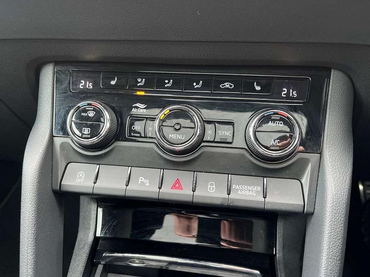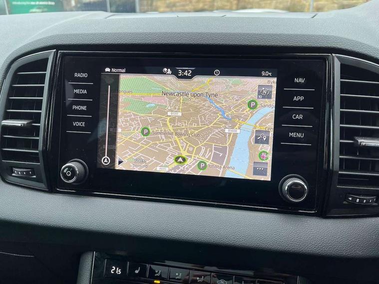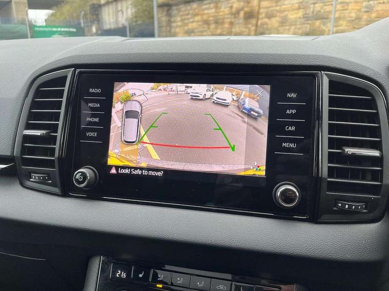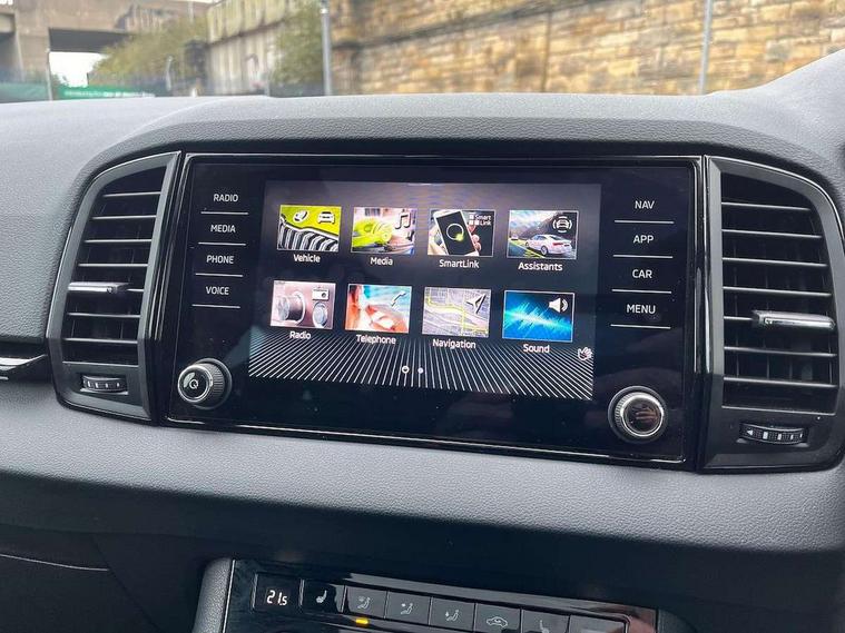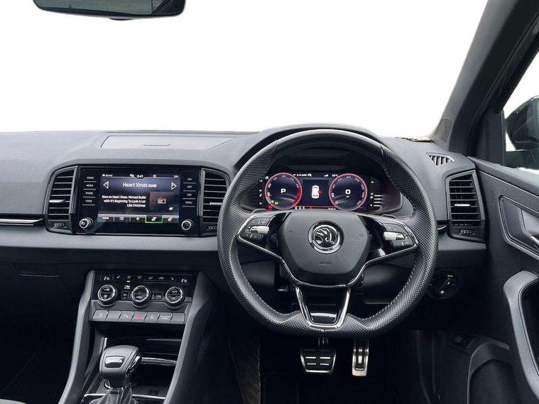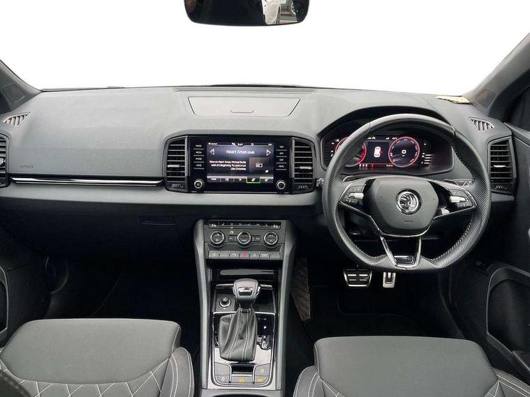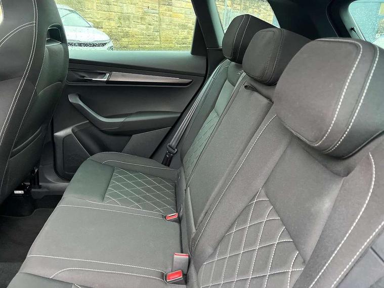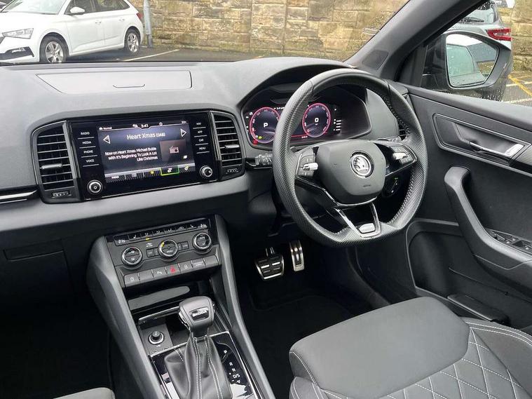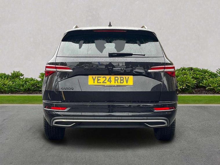 8" Digital display, Advanced driver attention and drowsiness monitor, Emergency services call system, Outside temperature gauge, Sensor for driver assistance systems, Service interval indicator, SmartLink wireless for Apple and wired for Android, Start/stop system with regenerative braking, USB C Port x 2 in front centre console, Virtual Cockpit - 10.25" digital display, Virtual pedal with electrically operated boot door, Wireless smartphone charging, Canton sound system, DAB radio with Bluetooth, USB connection, Acoustic glass, Aero front windscreen wipers with intermittent function, Auto dimming rear view mirror with light and rain sensors, Black door mirrors, Black electric window control buttons, Black radiator grille, Black roof rails, Body colour door handles, Electric front and rear windows with child proof lock, Front door steps with SportLine logo, Heated rear windscreen, LED 3rd brake light, LED daytime running lights, LED rear lights with high functionality welcome effect and dynamic indicators, Light assistant (coming/leaving home/tunnel light), Panoramic sliding sunroof, Plastic scuff plates in door apertures, Privacy glass, Protective door side sills in body colour, Rear diffuser, Rear side wing doors, Rear spoiler, Rear window wiper with washer system and intermittent control, Safety reflectors on front doors, Skoda lettering on tailgate in black, Sportline badge on front fender, Sportline decorative inserts with badging, Sports front and rear bumpers, 1.5 litre bottle holders in driver and front passenger door panels, 12V socket in boot, 12v socket in front centre armrest with storage compartment and rear air vents, 2 x Tablet holder, 3 rear height adjustable headrests, 3 seat bench in 2nd row, 3 spoke leather sports multifunction steering wheel and silver stitching with gear shift paddles, 4 foldable roof handles with rear coat hooks, Black floor carpet, Chrome inner door handles, Double sided boot floor, Foldable hooks in the boot, Front head restraints, Height adjustable front three point seats belts with tensioners, Height/reach adjust steering wheel, Ice scraper, Illuminated glovebox, Illuminated luggage compartment, Isofix child seat preparation for front passenger seat, Isofix child seat preparation outer rear, Manual lumbar support for front seats, Pen holder, Pollen filter, Rear boot cover, Rear reading lights, Rear seats fixed folding and divided 60:40, Rubbish bin door, Safety vest holder, Single front passenger seat, Storage box in upper central dashboard closed, Sunvisors with illuminated vanity mirrors, Textile floor mats, Ticket holder, Titan black interior ceiling, Umbrella under passenger seat, Under passenger seat storage compartment, Welcome animation with sportline logo, Light Pack - Karoq, Non Smokers pack, Automatic door unlocking in case of crash, Automatic fuel cut off in case of crash, Driver airbag, Electronic parking brake with auto hold function, Emergency rear braking signal, ESC including ABS, MSR, ASR, EDS, HBA, DSR, RBS, MKB and traction control, Front side airbags, Head airbags, Hill hold control, Knee airbags, Passenger airbag with switch-off function, Pedestrian monitor, Seatbelt reminder signalisation and pretensioner for all seats, Three point seatbelts rear, Two tone horn, Tyre pressure monitor, Alarm with interior monitoring, back up horn and tilt sensor with safe function, Electronic engine immobiliser, Keyless entry and start/stop, Remote central locking with 2 remote folding keys, Black air vent surround, Black centre console, carbon door decor, Satin black dashboard, Satin black door trim, 19" Sagittarius anthracite alloy wheels, Anti-theft wheel bolts protection, Breakdown and tool kit,