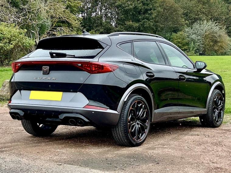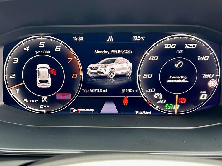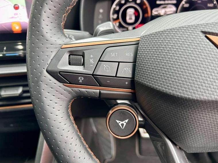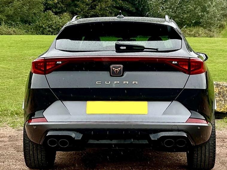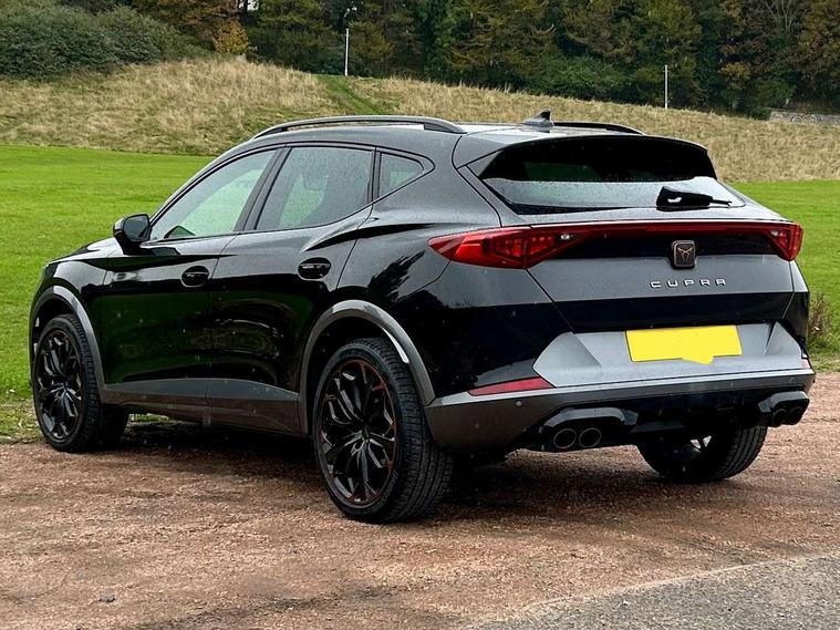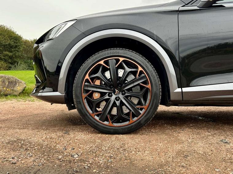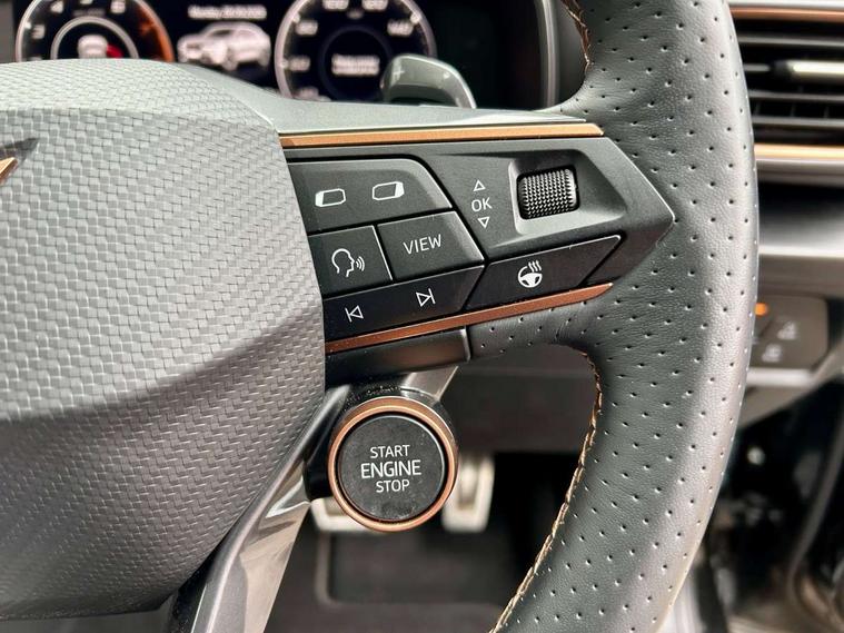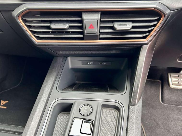 Digital cockpit and configurable dashboard, Driver alert system, Dynamic chassis control with driving profile selection (Comfort, Sport, CUPRA, Individual), Forward collision warning with automatic braking, Lane assist, Park assist (inc front/rear parking sensors), Predictive adaptive cruise control with speed limiter, RPM, trip computer, outside temp gauge, instrument light brightness, low fuel warning light, lights on reminder, gearshift indicator, Service interval indicator, Speed sensitive power steering, Start/stop system with regenerative braking, Virtual pedal and electric tailgate, Wireless apple carplay, Wireless phone charger, Electronic locking differential and dynamic traction support, Sports suspension with front shock absoption, 2 front and 2 rear USB type C sockets, Auxiliary input socket, DAB radio, Auto dimming rear view mirror, Body colour door handles, Body coloured bumpers, Dark grey wing mirror, Daytime running light with automatic headlight control and coming home feature, Dynamic headlight range control, Electric front/rear windows, Electrically adjustable heated and folding door mirrors with memory function, Front fog lamps with cornering function, Gloss black roof rails and window surrounds, LED Headlights, LED Taillights with dynamic indicator, Rain sensing wipers, Rear diffuser with twin exhaust pipe on each side, Rear wash/wipe, Sports bumpers, Tinted rear windows, VZ logo rear badging, Welcome lights, 12v power supply in centre console, 12V socket, 12v socket in loadspace, 2 front and 2 rear reading lights, 230V socket, 60/40 split rear bench seat with armrest and mechanical seat release, Black headlining, Cupra sports pedals, Dust/pollen filter, Front and rear head restraints, Front centre armrest, Height/reach adjust steering wheel, Illuminated interior front door sills, Illuminated sunvisor with mirror, Isofix, Leather heated multi-function sports steering wheel with start stop, CUPRA mode button and gear shift paddles, Luggage tie-down hooks, Three zone climate control with control panel in rear, Variable luggage/load compartment floor, Wraparound lighting, Genuine Nappa leather Pack - Cupra, Navigation system pack - Formentor, Safety and driving pack (XL) - Formentor, 3 point seatbelts on all rear seats, ABS, Brake control system - ESC and brake booster, Brembo brakes, Child proof door locks, Driver and front passenger airbags with front passenger airbag de-activation, Electronic parking brake, Front and rear disc brakes, Front side curtain airbags, Hill hold control, Seat belt reminder for front and rear seats, Tyre pressure monitoring system, Anti theft alarm system, Keyless entry and start system (KESSY), Locking wheel bolts, Copper and aluminium interior detailing, 19" 'Exclusive' copper and black alloy wheels, Tyre repair kit,