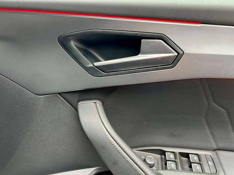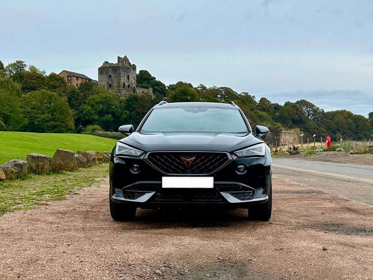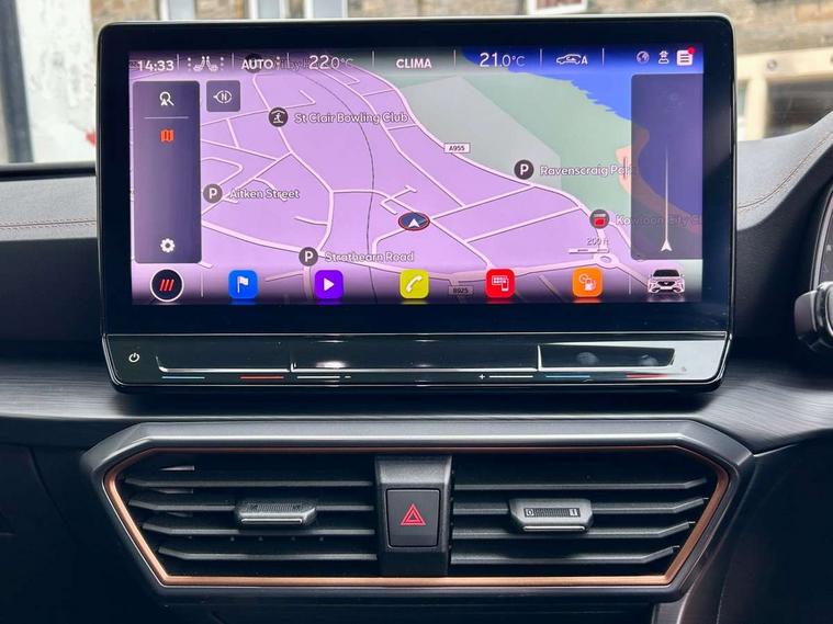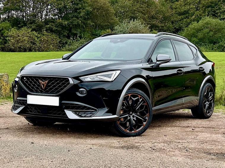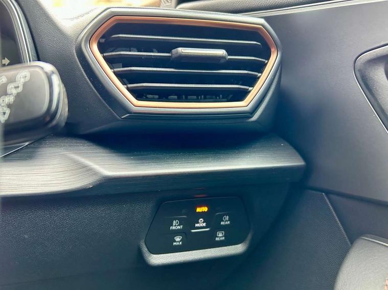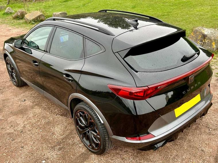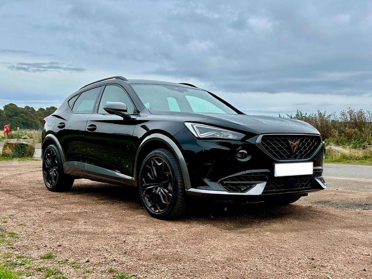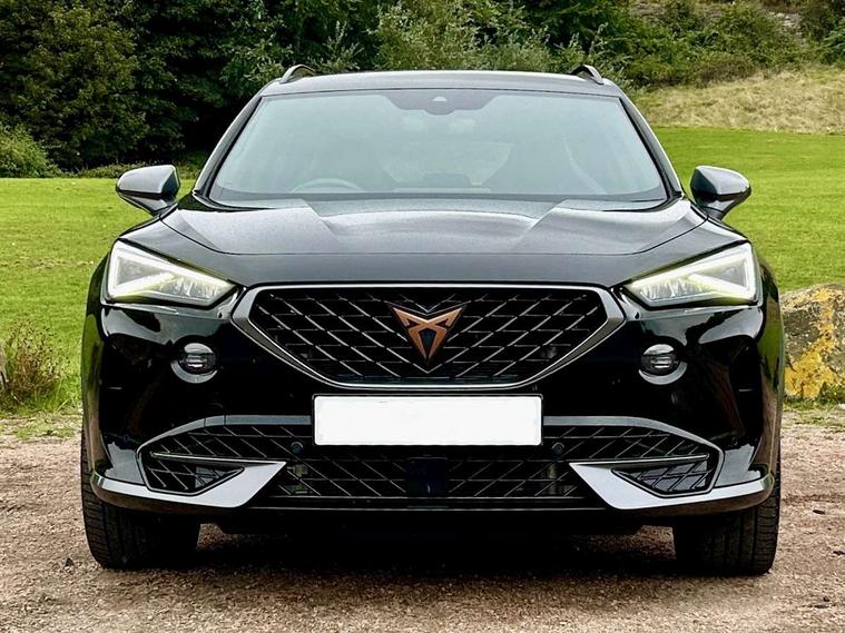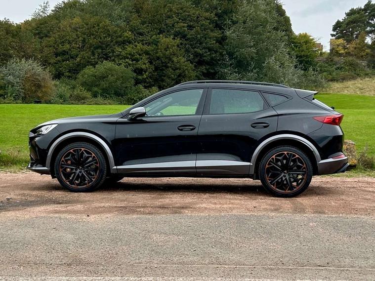 Digital cockpit and configurable dashboard, Driver alert system, Dynamic chassis control with driving profile selection (Comfort, Sport, CUPRA, Individual), Forward collision warning with automatic braking, Lane assist, Park assist (inc front/rear parking sensors), Predictive adaptive cruise control with speed limiter, RPM, trip computer, outside temp gauge, instrument light brightness, low fuel warning light, lights on reminder, gearshift indicator, Service interval indicator, Speed sensitive power steering, Start/stop system with regenerative braking, Virtual pedal and electric tailgate, Wireless apple carplay, Wireless phone charger, Electronic locking differential and dynamic traction support, Sports suspension with front shock absoption, 2 front and 2 rear USB type C sockets, Auxiliary input socket, DAB radio, Auto dimming rear view mirror, Body colour door handles, Body coloured bumpers, Dark grey wing mirror, Daytime running light with automatic headlight control and coming home feature, Dynamic headlight range control, Electric front/rear windows, Electrically adjustable heated and folding door mirrors with memory function, Front fog lamps with cornering function, Gloss black roof rails and window surrounds, LED Headlights, LED Taillights with dynamic indicator, Rain sensing wipers, Rear diffuser with twin exhaust pipe on each side, Rear wash/wipe, Sports bumpers, Tinted rear windows, VZ logo rear badging, Welcome lights, 12v power supply in centre console, 12V socket, 12v socket in loadspace, 2 front and 2 rear reading lights, 230V socket, 60/40 split rear bench seat with armrest and mechanical seat release, Black headlining, Cupra sports pedals, Dust/pollen filter, Front and rear head restraints, Front centre armrest, Height/reach adjust steering wheel, Illuminated interior front door sills, Illuminated sunvisor with mirror, Isofix, Leather heated multi-function sports steering wheel with start stop, CUPRA mode button and gear shift paddles, Luggage tie-down hooks, Three zone climate control with control panel in rear, Variable luggage/load compartment floor, Wraparound lighting, Genuine Nappa leather Pack - Cupra, Navigation system pack - Formentor, Safety and driving pack (XL) - Formentor, 3 point seatbelts on all rear seats, ABS, Brake control system - ESC and brake booster, Brembo brakes, Child proof door locks, Driver and front passenger airbags with front passenger airbag de-activation, Electronic parking brake, Front and rear disc brakes, Front side curtain airbags, Hill hold control, Seat belt reminder for front and rear seats, Tyre pressure monitoring system, Anti theft alarm system, Keyless entry and start system (KESSY), Locking wheel bolts, Copper and aluminium interior detailing, 19" 'Exclusive' copper and black alloy wheels, Tyre repair kit,