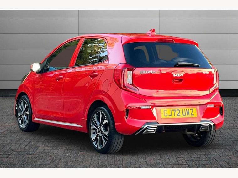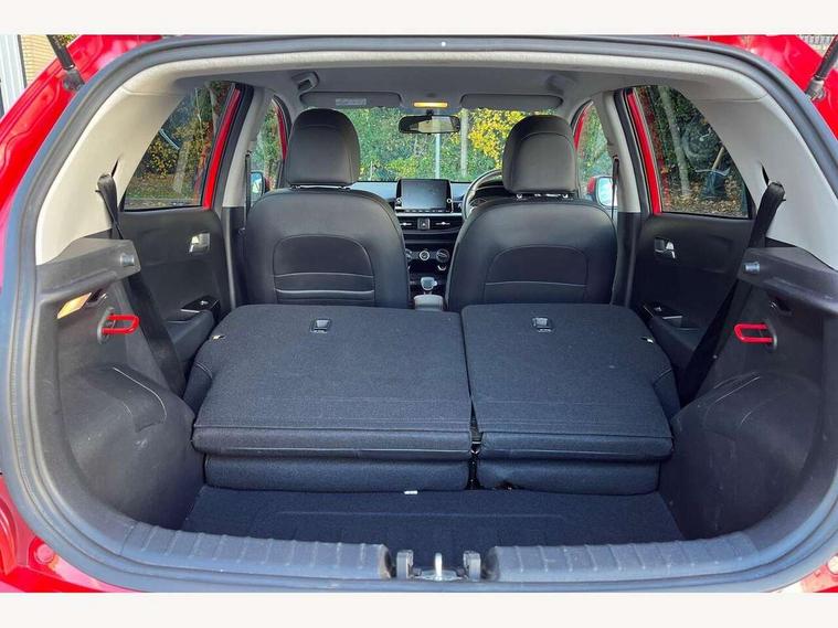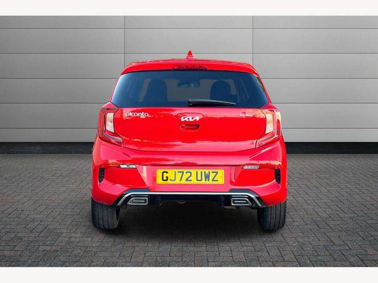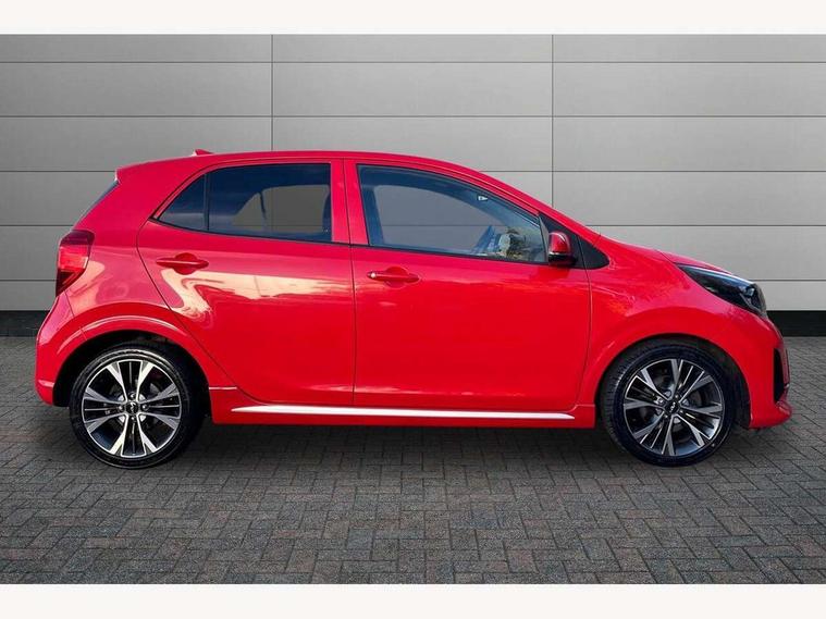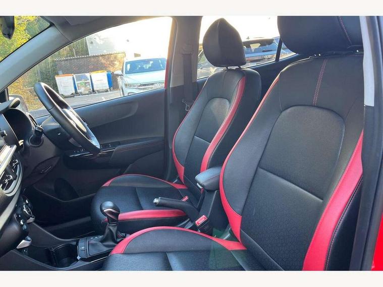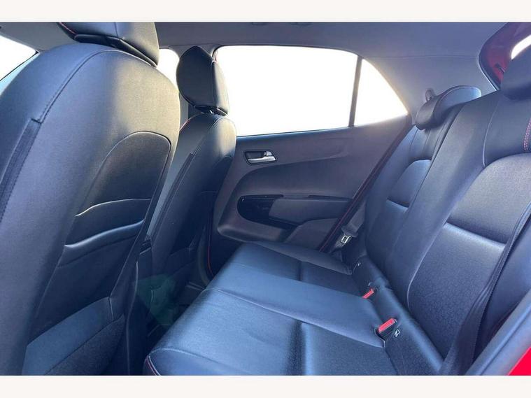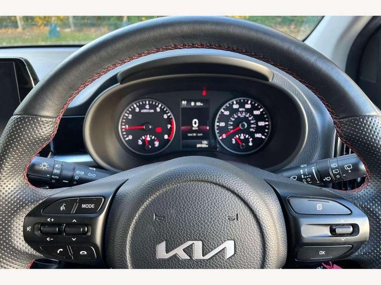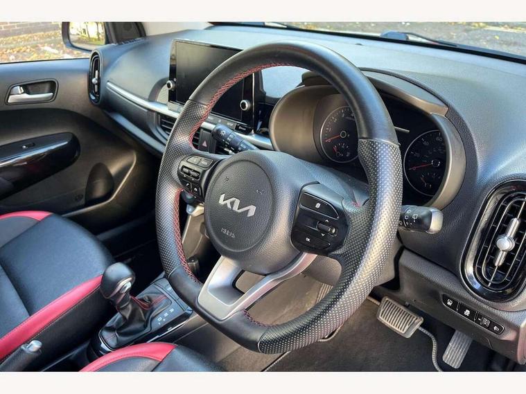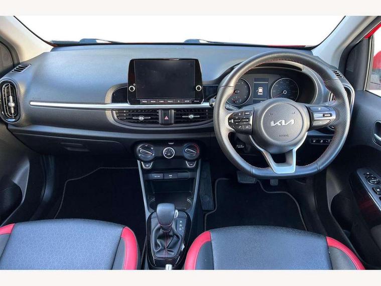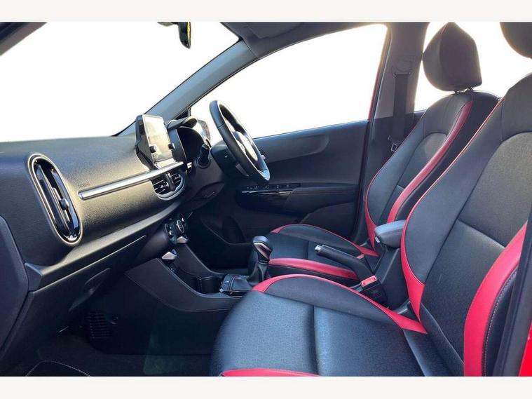 8" touchscreen display with RDS and DAB, Apple car play/Android Auto with voice control, Emergency call service, Emergency stop signalling system, External temperature gauge, Motor driven power steering, Reversing camera system with dynamic guidelines (Integrated into centre fascia screen), Tachometer, Trip computer, 6 speaker audio system, Bluetooth with music streaming, Steering wheel mounted controls, USB ports for connection of a media device, Automatic headlight control system, Bi-function projection headlights, Black beltline mouldings, Black grille with silver surround, Body colour B pillars, Body colour bumpers, Body colour mirrors and door handles, Body colour side sill mouldings, Day/night rear view mirror, Electric adjustable/heated/folding door mirrors with LED indicators lights, Front and rear electric windows with drivers's auto up/down function, Front fog lights, Headlamp levelling, Heated rear window, High mount brake light, LED daytime running lights, LED rear fog lights, Privacy glass - Rear windows and tailgate, Rain sensor, Rear side wing doors, Rear wash/wipe, Speed variable front wipers, Sports front and rear bumpers with gloss black skid plates twin exhaust, Tinted glass, Visible VIN plate, Welcome and follow-me home light functionality, 1 x rear coat hook, 12V power point front, 2 seat bench in 2nd row, 3 x passenger assist grips, 60/40 split/folding 2nd row of seats, All round height adjustable headrests, Black and red accents front door armrest, Centre Console with Storage Box and Sliding Armrest, Cupholders in centre console, D-cut steering wheel with red stitching, Driver and front passenger sunvisor with vanity mirror, Driver seat height adjust, Faux leather upholstery, Front cabin lights, Glovebox, High gloss lower centre fascia trim, door armrest and air vents, ISOFIX Child seat top tethers and anchor fixings, Leather trimmed steering wheel and gearshift, Luggage area light, Luggage area parcel shelf, Manual air conditioning, Passenger front seatback pockets, Satin chrome interior door handles, Single front passenger seat, Slide/reclining front seats, Tilt adjustable steering wheel, Advanced Driver Assistance Pack - Picanto, 2 x 3-point rear seatbelts, ABS/EBD, Automatic unlocking of doors in case of impact, Dual front airbags, ESC + BAS + VSM + HAC, Front passenger airbag cut-off switch, Front seatbelt height adjusters, Front seatbelt pretensioners + load limiters, Hill hold control, Knee airbags, Rear child proof door locks, Seatbelt warning, Side impact protection, Torque vectoring brake based and straight line stability (SLS), Traction control, Twin curtain airbags, Twin front side airbags, Tyre pressure monitoring system, Anti theft alarm, Engine immobiliser, Folding key, Locking wheel nuts, Remote central door locking, 16" alloy GT-Line wheels, Tyre mobility kit,