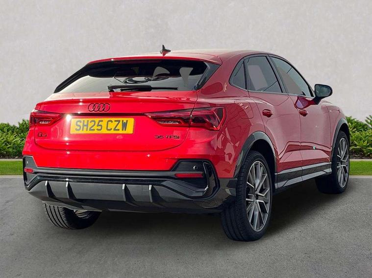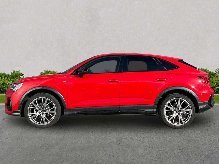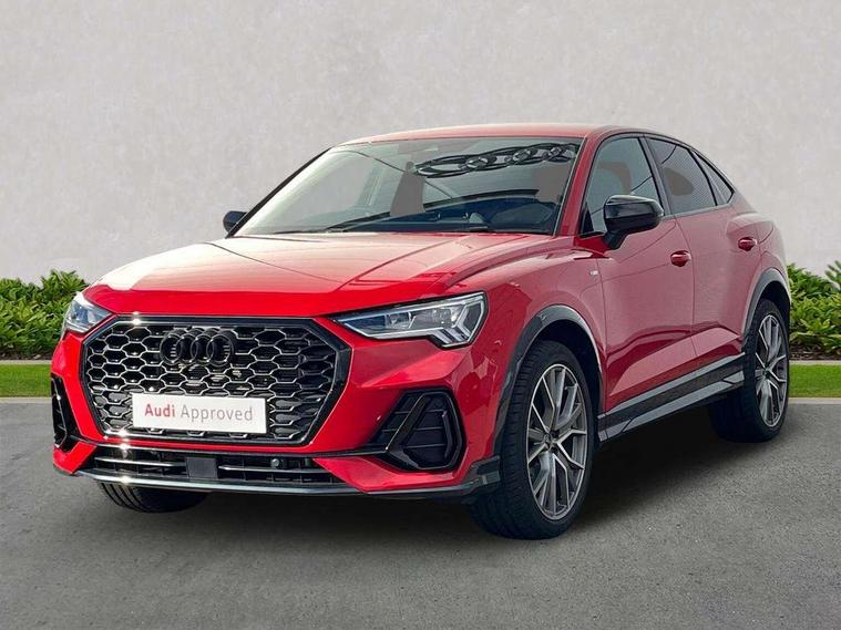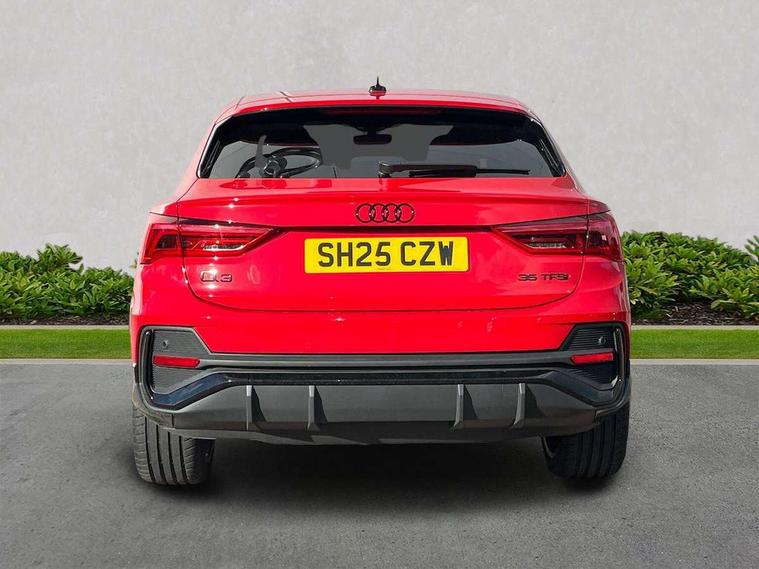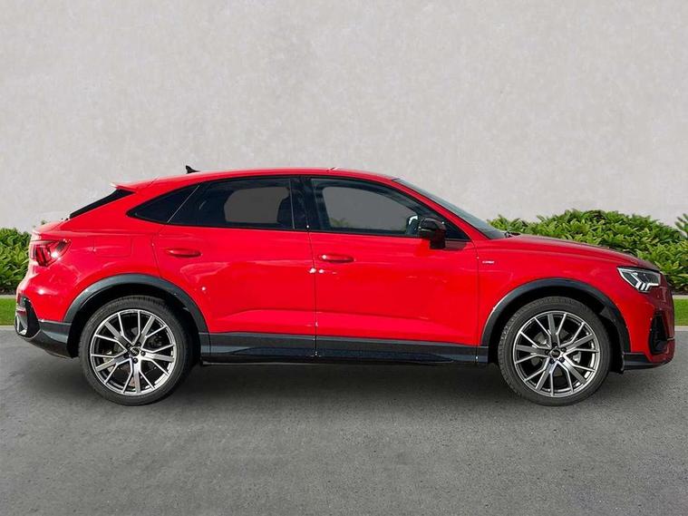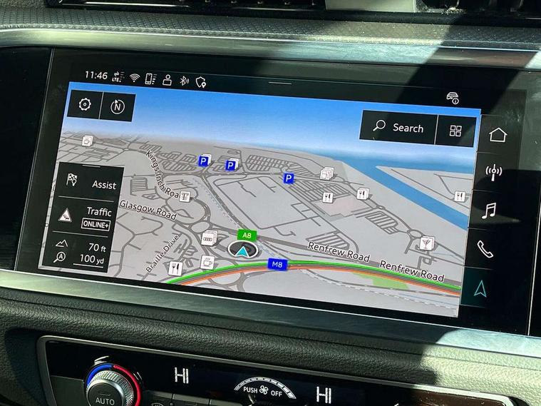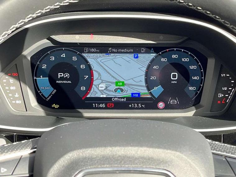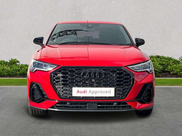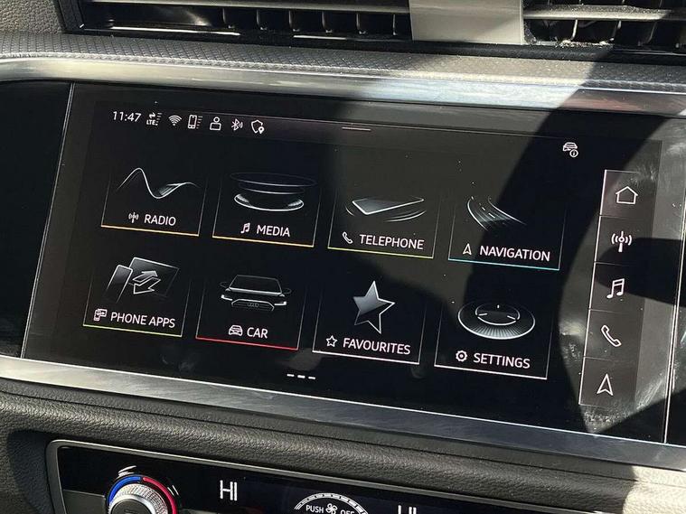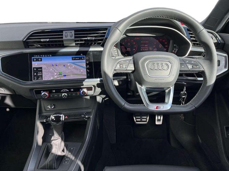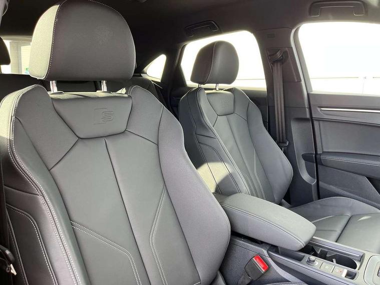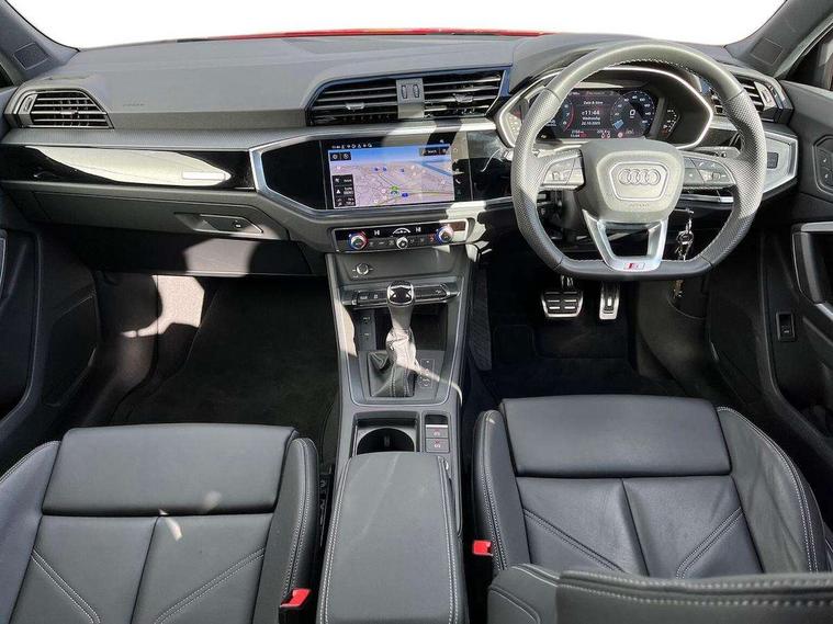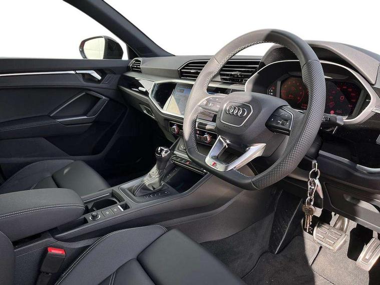 Audi connect safety and service, Audi drive select, Audi lane departure warning, Audi Virtual Cockpit - 10.25" display, Bluetooth interface, Camera based traffic sign recognition, Distraction and Fatigue warning, Legal emergency call, MMI Navigation Plus with high resolution 10.1 inch touchscreen colour display, Power operated tailgate, Progressive steering, Service interval indicator, Smartphone interface includes wireless Apple carplay/Android Auto, Start stop system with recuperation, Voice control system with natural language interaction, Sports suspension, 2 USB-C ports with charge and data functions, 6 passive loudspeakers, DAB digital radio module, Acoustic windscreen, Audi Beam uses LEDs to project the Audi logo onto the ground as you exit your Q3, Auto dimming door mirrors, Auto dimming frameless rear view mirror, Electrically folding, adjustable and heated door mirrors with integrated LED side indicators and kerb view function for passenger side, Front and rear electric windows, Front fog lights, Front underbody protection in manhattan grey paint finish, High gloss black finish B and C pillars, Honeycomb design radiator grille in matt anthracite black, LED Dynamic rear indicators, LED headlights with LED daytime running lights, LED rear lights, LED third brake light, Privacy glass dark tinted rear and rear-side windows (from B-pillar backwards), Rain and light sensors, Rear diffuser grille in grained matt black, Rear diffuser strip in matt anthracite black, Rear side wing doors, Rear underbody protection in matt black, Rear wiper, S line front and rear bumpers and side skirts in contrasting Manhattan grey paint finish, Variable front intermittent wipers, 12V socket in rear centre console, 3 seat bench in 2nd row, 40:20:40 folding with manual adjustment for 60:40 forwards/backwards position and backrest angle, Adjustable rear seat bench/backrest with centre armrest and cupholder, Black carpet mats, Black cloth headlining, Dual zone electronic climate control, Electric lumbar support, Front and rear black floor mats with contrast stitching in rock grey, Front and rear headrests, Front centre armrest, Height and reach adjustable steering wheel, Illuminated door sill trims with S logo, ISOFIX child seat mounting for front passenger with airbag deactivation and outer rear seat including top tether attachment point for outer rear seats, Luggage compartment sill protection in stainless steel, Manual front seats with height adjustment, Perforated leather gearknob, Single front passenger seat, Stainless steel pedals, Twin leather upholstery with front sport seats + S embossing, Black styling pack - Q3, Non smoking pack - Q3, 3x3 point rear seatbelts, 6 airbags - Driver, front passenger, curtain and side windows, Audi pre-sense front with pedestrain and cyclist recognition, Electrically operated child locks on rear doors, Electromechanical parking brake, Electronic stabilisation control including ABS, ASR and EDL, Front seatbelt reminder, Hill descent control, Hill hold assist, Pre sense basic, Seatbelt monitoring, Tyre pressure warning, Warning triangle and first aid kit, Anti theft wheel bolts, Immobiliser, Remote central locking, Thatcham approved category 1 anti theft alarm, Aluminium look interior elements, Detail dashboard around MMI touch colour display in glass look, black with surround in aluminium look, Leatherette door armrest, Piano black inlay,