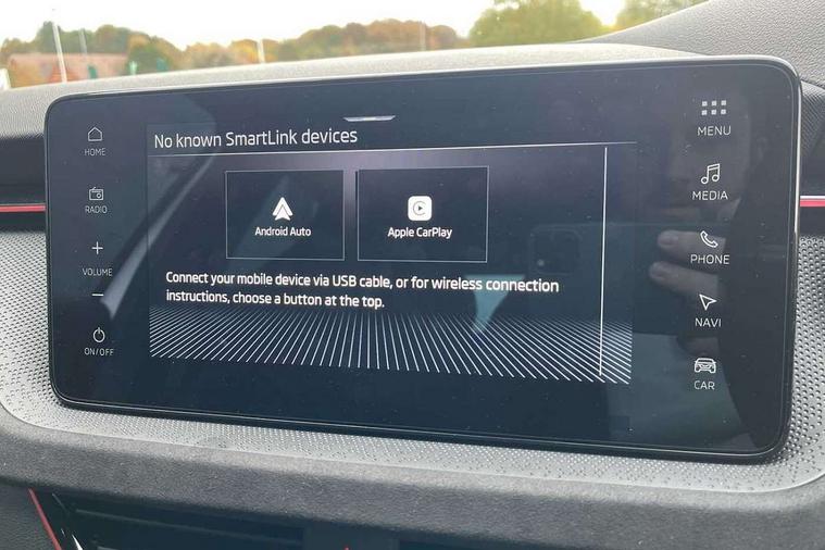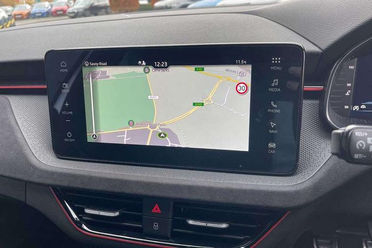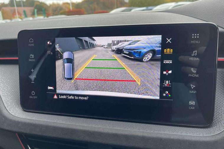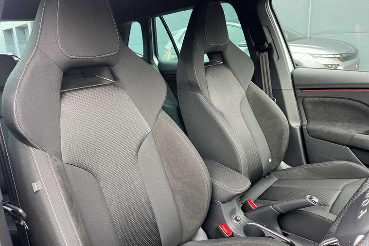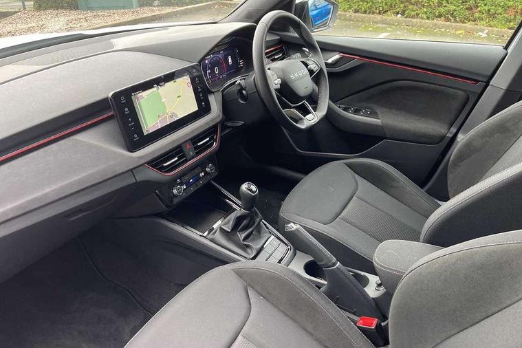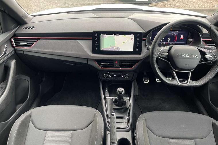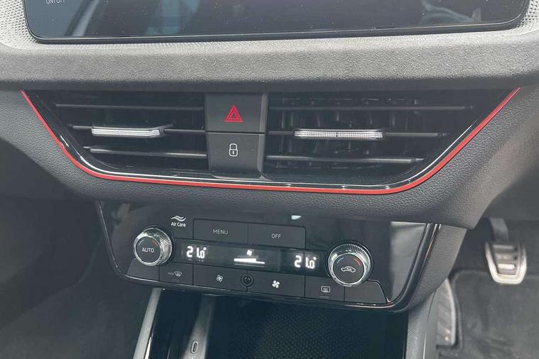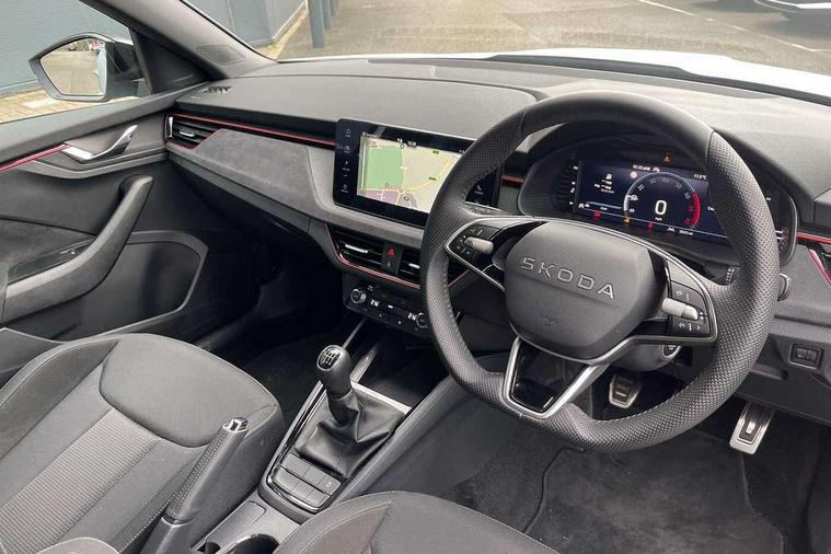 Advanced driver attention and drowsiness monitor, Bluetooth system, E-call, Front assist system, PAS, Rear parking sensors, Rear view camera, Service indicator, Speed limiter, Traffic sign recognition, Virtual cockpit with 10.25" display, Voice control system, Wireless smartlink, 4 USB C ports, 8 Speakers, 9.2" Skoda navigation display, DAB Digital radio, Auto dimming rear view mirror, Automatic headlight control with coming home and leaving home feature, Black door mirrors, Black roof, Black roof rails, Body colour bumpers, Body colour door handles, Chrome grille surround, Front and rear electric windows, Full LED headlights, Heated rear window, LED brake lights, LED daytime running lights, LED front turning lights, LED high beam, LED low beam, LED third brake light, Privacy glass, Rear LED fog light, Rear side wing doors, Rear wiper, Ticket holder inside windscreen, 12V socket in luggage compartment, 3 seat bench in 2nd row, 3 spoke leather sports multi-function steering wheel, Aluminium pedals, Ambient lighting in white/red, Black roof lining, Black suedia decor inserts, Black suedia door inserts, Cargo elements, Chrome inner door handles, Driver and passenger sun visors with vanity mirror, Dual zone climate control, Dynamic cloth upholstery, Front and rear roof lights, Front centre armrest, Front head restraints, Glove compartment with illumination, Height adjustable driver seat, Height adjustable front passenger seat, Ice scraper, Inner circulation control with pollen filter, ISOFIX on front passenger seat, Isofix preparation for back seats, Leather gearknob and handbrake lever, Manual lumbar support for front seats, Net package and top tether hooks in boot space, Net under rear shelf, Overhead glasses storage compartment, Pocket on the back of both front seats include mobile phone pockets, Rake/reach adjustable steering wheel, Reading lights, Rear centre armrests, Red hotstamping, Single front passenger seat, Sports seats, Textile floor mats, Third rear headrest, Top tether for front passenger seat, Umbrella in driver's door, 3x3 point rear seatbelts, Airbags - driver and front passenger, Disc brakes, ESP, Extended and predictive pedestrian/cyclist protection, Front passenger airbag deactivation switch, Front side airbags with curtain airbags, Hill hold control, Manual leather parking brake, Manual rear child locks, One tone horn, Seatbelt reminder for driver an co-driver, Traction control, Tyre pressure monitor, Anti-theft alarm system with interior monitoring, backup horn, towing protection and remote central locking with SAFE system, Anti-theft wheel bolts, Electronic engine immobilizer, Tyre repair kit,