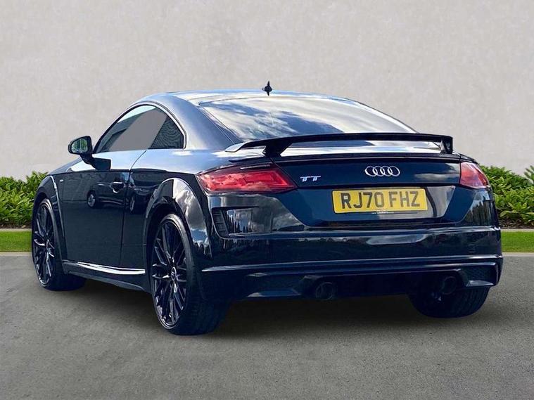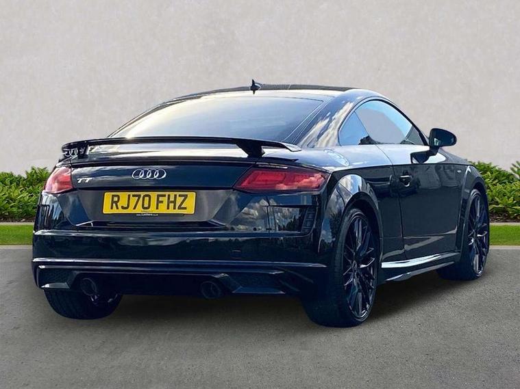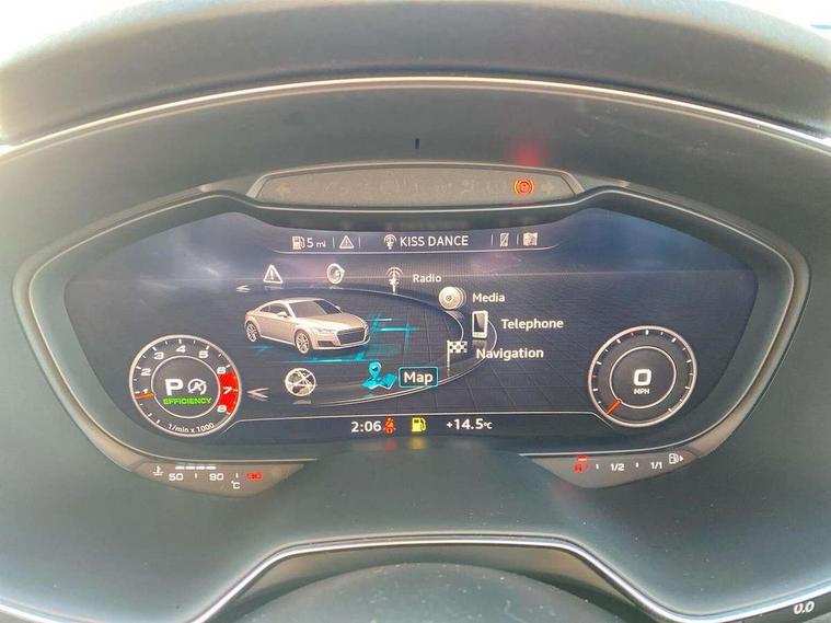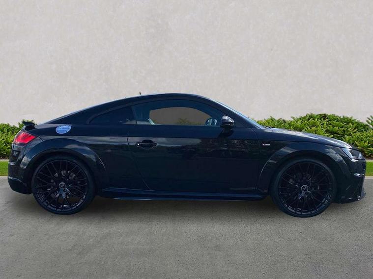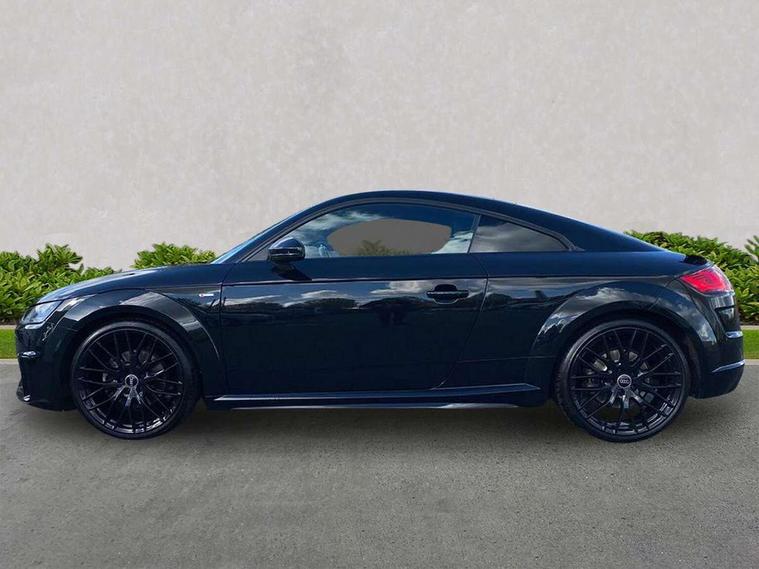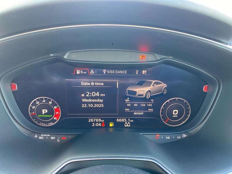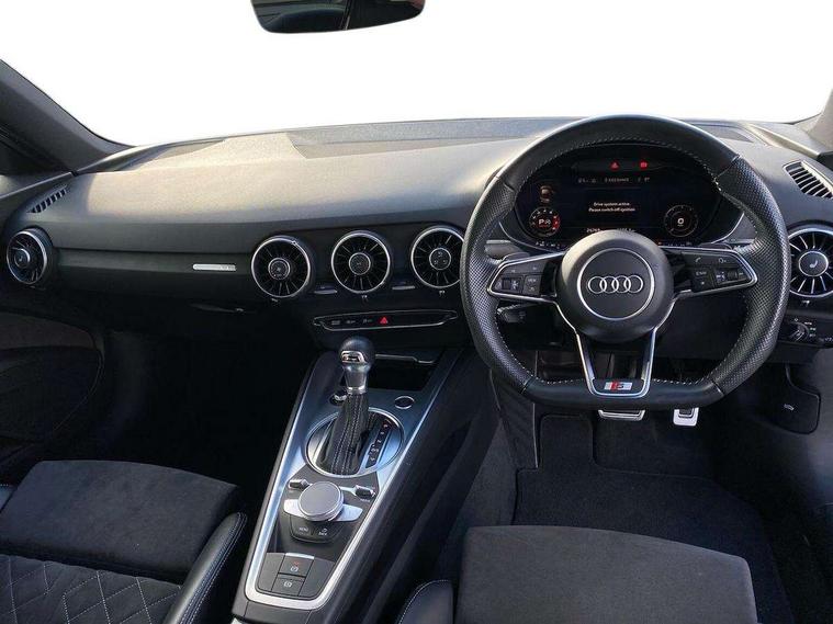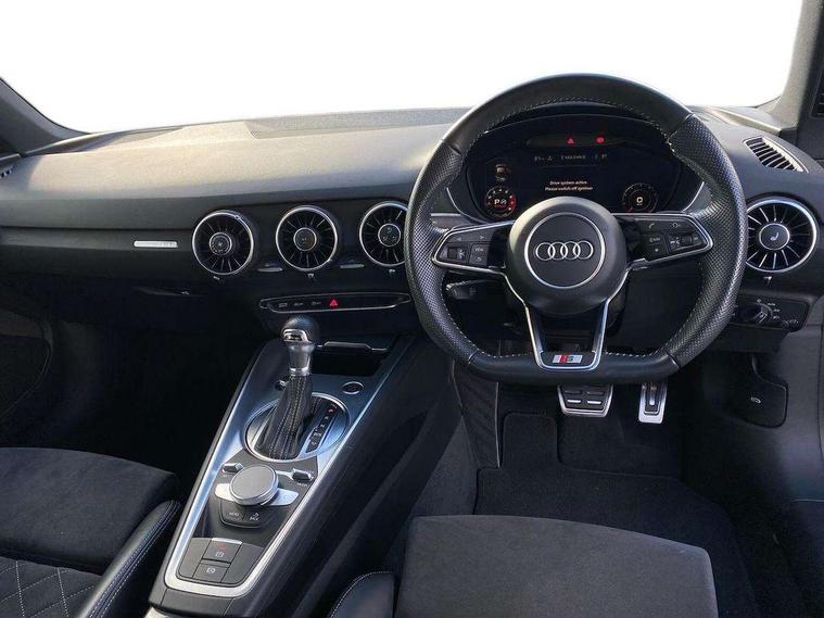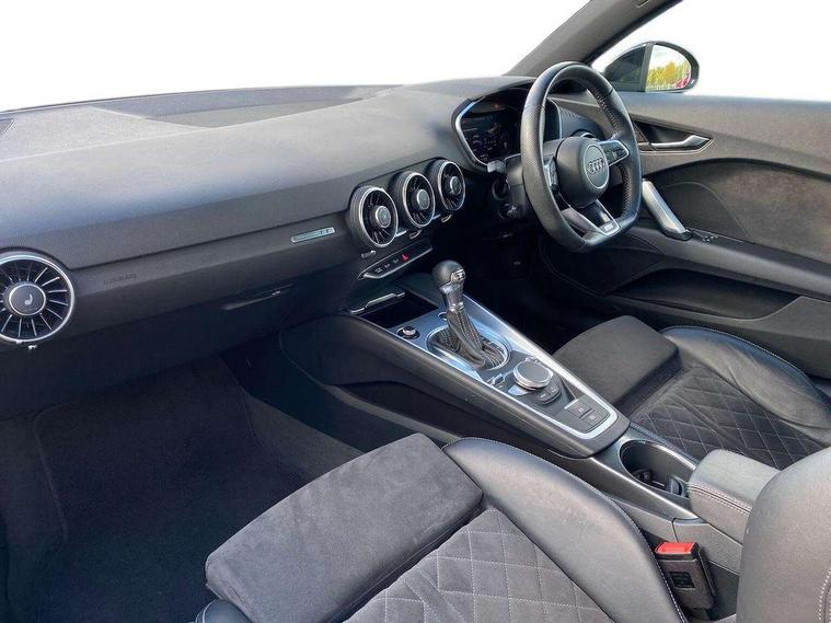 Matt brushed aluminium inlays, Black styling pack - TT, Non smoking pack - TT/TT RS, Tyre repair kit, Anti theft alarm, Anti theft wheel bolts, Immobiliser, Keyless Go, Remote central locking, AM/FM radio, Bluetooth audio streaming, DAB Digital radio, MMI Radio with CD player and SD/XC card slot, 3 point front seat belts, ABS, ASR traction control, Brake energy regeneration, Curtain airbags, Driver and front passenger airbag with front passenger airbag deactivation, EDL traction control, Electromechanical parking brake, ESP, First aid kit, Front side airbags, Head airbags, Hill hold assist, Seatbelt warning, Tyre pressure warning, Warning triangle, Auto dimming rear view mirror, Auto headlight range control, Black chrome tailpipe, Black door mirrors, Dark privacy glass from B-pillar backwards, Electric folding door mirrors, Electric front windows, Front fog lights, Green tinted heat insulating glass, LED daytime running lights, LED headlights with LED rear lights + dynamic rear indicators, Light and rain sensors, Sunband for windscreen, 12V socket, 3 spoke flat bottomed high multi-function leather sport steering wheel with gearshift paddles, 4 way electric lumbar support for driver and front passenger, Black headlining, Extended aluminium look with stainless steel pedals, Front centre armrest, Front super sports seats, Heated front seats, Height adjustable driver's seat, Height adjustable front head restraints, Height/reach adjust steering wheel, ISOFIX child seat mounting for front passenger seat with airbag deactivation, Perforated leather gearknob in black, Rear head restraints, Rear top tether child seat ISOFIX attachment, Split folding rear seat, Tool kit, Audi drive select with 4 Pre configured modes, Audi smartphone interface, Audi virtual cockpit - 12.3" high-resolution LCD display with fully customisable instrument cluster, Cruise control + speed limiter, MMI touch panel, Mobile phone preparation with bluetooth interface, Progressive power assisted steering, Service interval indicator, Start/Stop system with energy recuperation, TP memo, S line sports suspension,