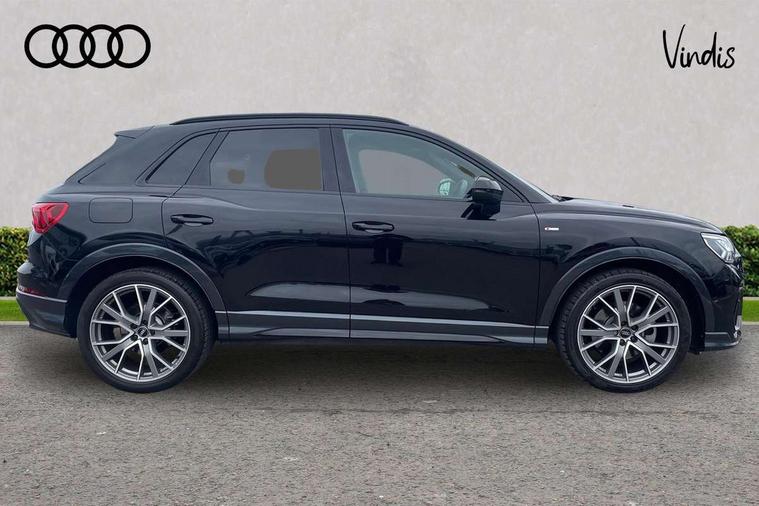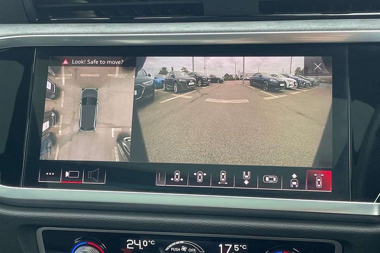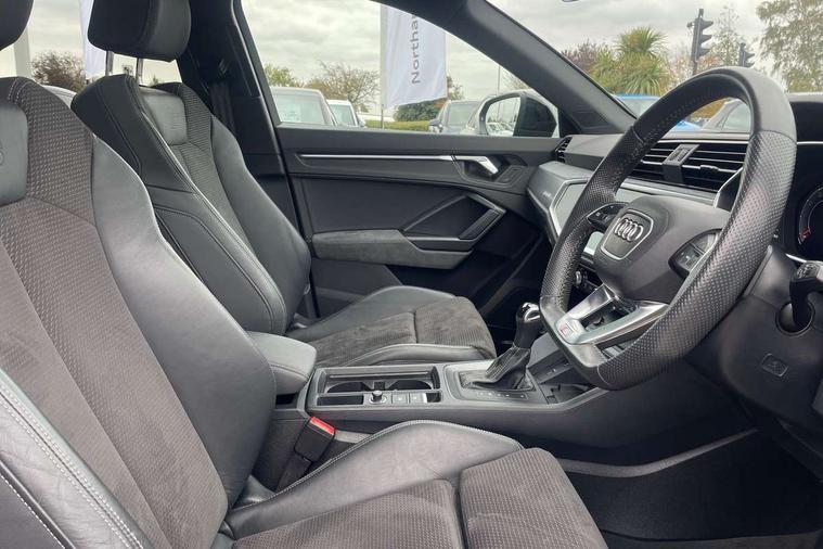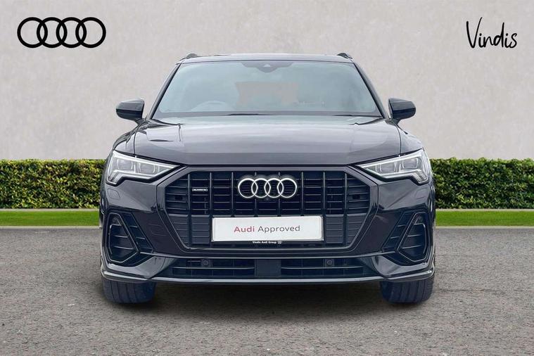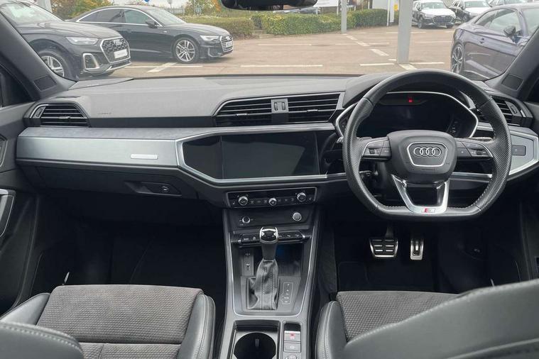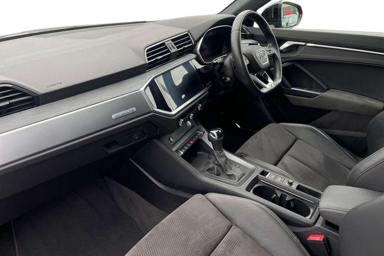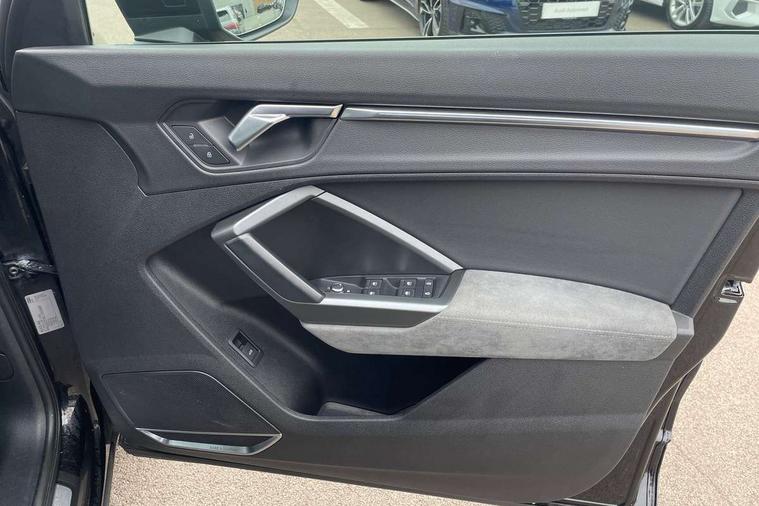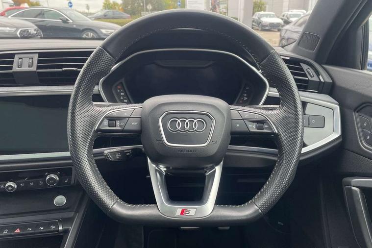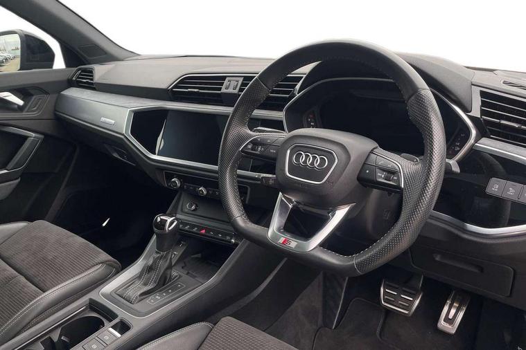 Dark matt brushed aluminium inlay, MMI touch colour display in gloss black with aluminium surround, Black styling pack - Q3, Driver Assistance Pack - Q3, Multi coloured extended ambient interior lighting pack - Q3, Non smoking pack - Q3, Advanced key, Anti theft alarm, Anti theft wheel bolts, Audi pre-sense front with pedestrain and cyclist recognition, Remote central locking, 1 x USB type C and 1 USB type A charging points, Bang & Olufsen 3D Premium Sound System, DAB digital radio module, 3x3 point rear seatbelts, 6 airbags - Driver, front passenger, curtain and side windows, Electrically operated child locks on rear doors, Electromechanical parking brake, Electronic stabilisation control including ABS, ASR and EDL, Hill descent control, Hill hold assist, Pre sense basic, Seatbelt monitoring, Tyre pressure warning, Warning triangle and first aid kit, Acoustic windscreen, Audi Beam uses LEDs to project the Audi Sport logo, Auto dimming and folding door mirrors, Auto dimming rear view mirror, Black roof rails, Contrast bumpers in Manhattan grey paint finish, Diffuser in matt Platinum grey, Electrically adjustable and heated door mirrors with integrated LED side indicators, Front and rear electric windows, Front fog lights, Front spoiler blade in matt platinum grey, Headlight washers, High gloss black finish B and C pillars, Matrix LED headlights with LED rear lights and dynamic front and rear indicator, Panoramic opening glass sunroof, Privacy glass, Rain and light sensors, Rear diffuser strip in matt titanium black, S line bumpers in contrasting Manhattan grey, 12V socket in rear centre console, 3 spoke flat bottomed high multi-function leather sport steering wheel with gearshift paddles, 4 way electric lumbar support for driver and front passenger, 40:20:40 split folding rear bench seat, Adjustable rear seat bench/backrest with centre armrest and cupholder, Aluminium door sill trims, Black cloth headlining, Dual zone climate control, Electrically adjustable front seats, Front and rear black floor mats with contrast stitching in rock grey, Front and rear headrests, Front and rear roof module including reading lights, Front centre armrest with storage compartment and angle adjustment, Glove compartment lighting, Heated front seats, Height and reach adjustable steering wheel, ISOFIX child seat mounting and Top Tether with front passenger airbag deactivation, Luggage compartment light, Perforated leather gearknob, Stainless steel luggage compartment sill finisher, Stainless steel pedals, 360 degree parking camera, Audi connect safety and service (e-call), Audi drive select, Audi lane departure warning, Audi phone box with wireless charging, Audi side assist, Audi smartphone interface, Audi virtual cockpit plus, Bluetooth interface, MMI navigation plus with MMI touch, Power opening/closing tailgate, Progressive steering, Rear cross traffic alert, Service interval indicator, Stop/start system, Voice control system, Adaptive suspension with damping control,