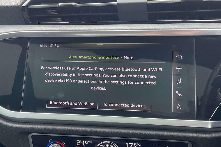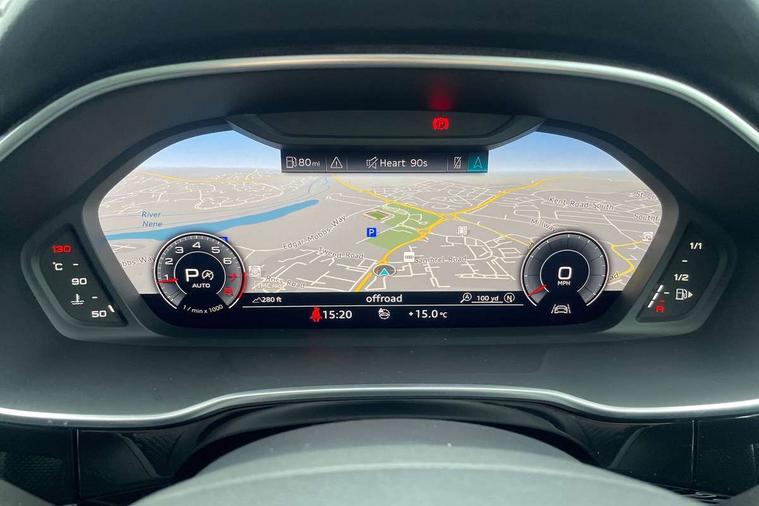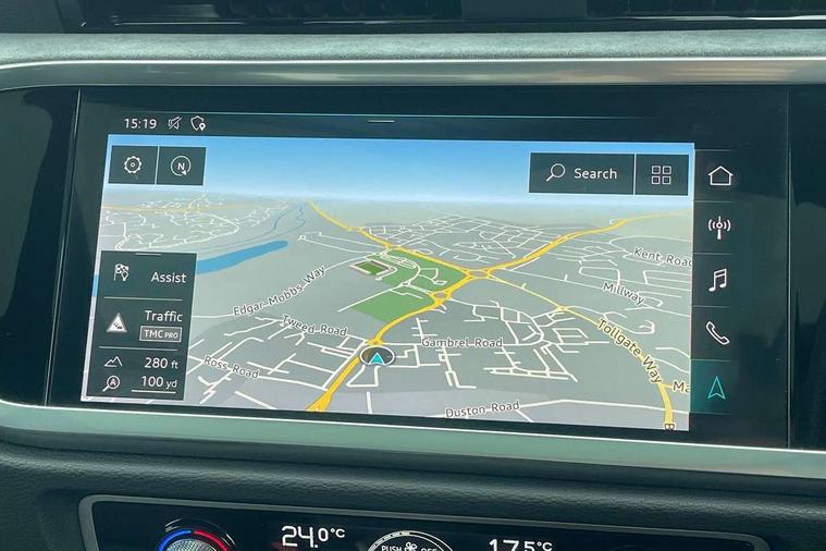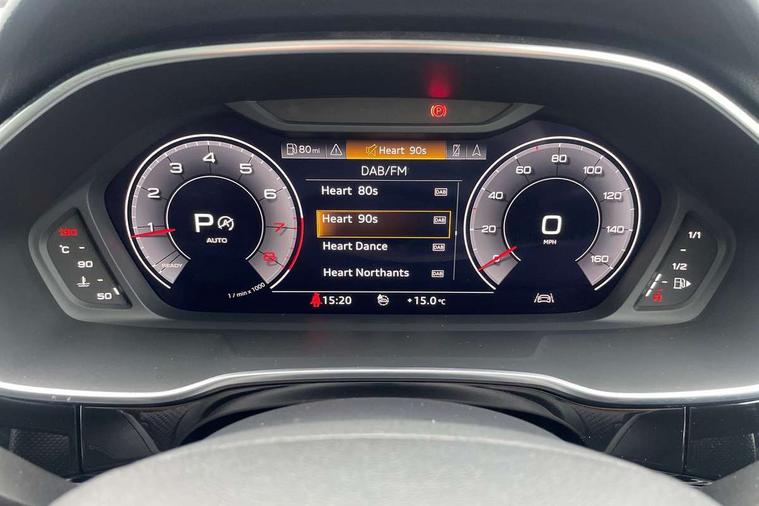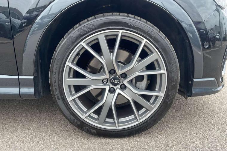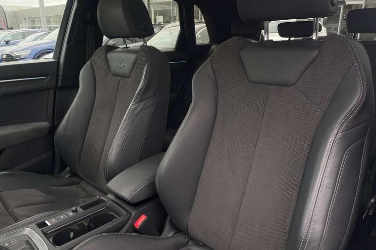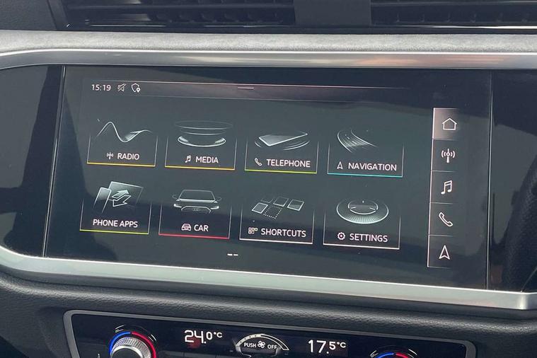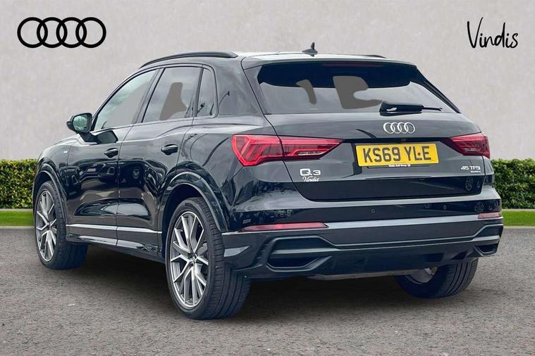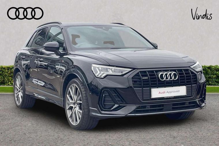 Dark matt brushed aluminium inlay, MMI touch colour display in gloss black with aluminium surround, Black styling pack - Q3, Driver Assistance Pack - Q3, Multi coloured extended ambient interior lighting pack - Q3, Non smoking pack - Q3, Advanced key, Anti theft alarm, Anti theft wheel bolts, Audi pre-sense front with pedestrain and cyclist recognition, Remote central locking, 1 x USB type C and 1 USB type A charging points, Bang & Olufsen 3D Premium Sound System, DAB digital radio module, 3x3 point rear seatbelts, 6 airbags - Driver, front passenger, curtain and side windows, Electrically operated child locks on rear doors, Electromechanical parking brake, Electronic stabilisation control including ABS, ASR and EDL, Hill descent control, Hill hold assist, Pre sense basic, Seatbelt monitoring, Tyre pressure warning, Warning triangle and first aid kit, Acoustic windscreen, Audi Beam uses LEDs to project the Audi Sport logo, Auto dimming and folding door mirrors, Auto dimming rear view mirror, Black roof rails, Contrast bumpers in Manhattan grey paint finish, Diffuser in matt Platinum grey, Electrically adjustable and heated door mirrors with integrated LED side indicators, Front and rear electric windows, Front fog lights, Front spoiler blade in matt platinum grey, Headlight washers, High gloss black finish B and C pillars, Matrix LED headlights with LED rear lights and dynamic front and rear indicator, Panoramic opening glass sunroof, Privacy glass, Rain and light sensors, Rear diffuser strip in matt titanium black, S line bumpers in contrasting Manhattan grey, 12V socket in rear centre console, 3 spoke flat bottomed high multi-function leather sport steering wheel with gearshift paddles, 4 way electric lumbar support for driver and front passenger, 40:20:40 split folding rear bench seat, Adjustable rear seat bench/backrest with centre armrest and cupholder, Aluminium door sill trims, Black cloth headlining, Dual zone climate control, Electrically adjustable front seats, Front and rear black floor mats with contrast stitching in rock grey, Front and rear headrests, Front and rear roof module including reading lights, Front centre armrest with storage compartment and angle adjustment, Glove compartment lighting, Heated front seats, Height and reach adjustable steering wheel, ISOFIX child seat mounting and Top Tether with front passenger airbag deactivation, Luggage compartment light, Perforated leather gearknob, Stainless steel luggage compartment sill finisher, Stainless steel pedals, 360 degree parking camera, Audi connect safety and service (e-call), Audi drive select, Audi lane departure warning, Audi phone box with wireless charging, Audi side assist, Audi smartphone interface, Audi virtual cockpit plus, Bluetooth interface, MMI navigation plus with MMI touch, Power opening/closing tailgate, Progressive steering, Rear cross traffic alert, Service interval indicator, Stop/start system, Voice control system, Adaptive suspension with damping control,